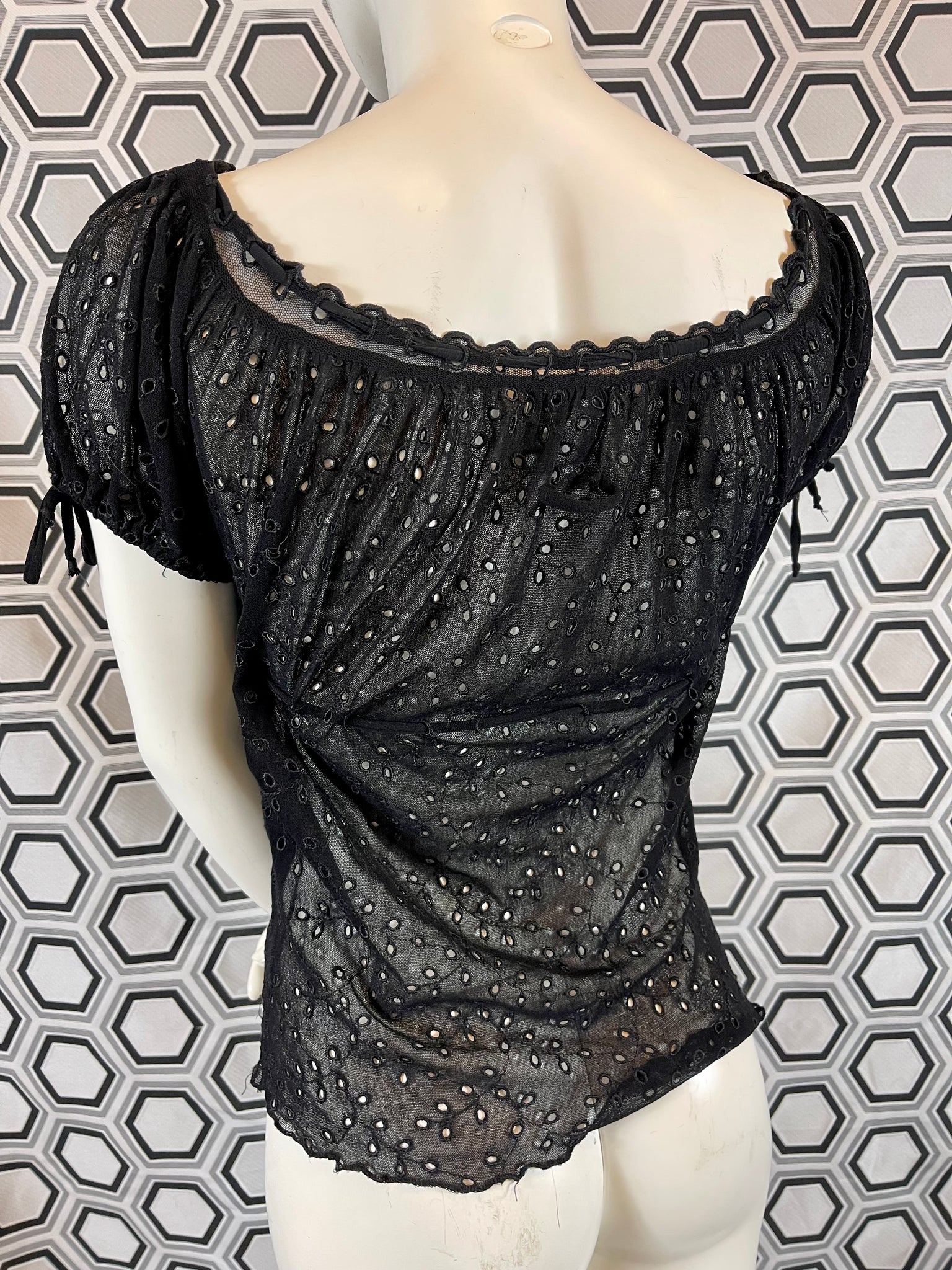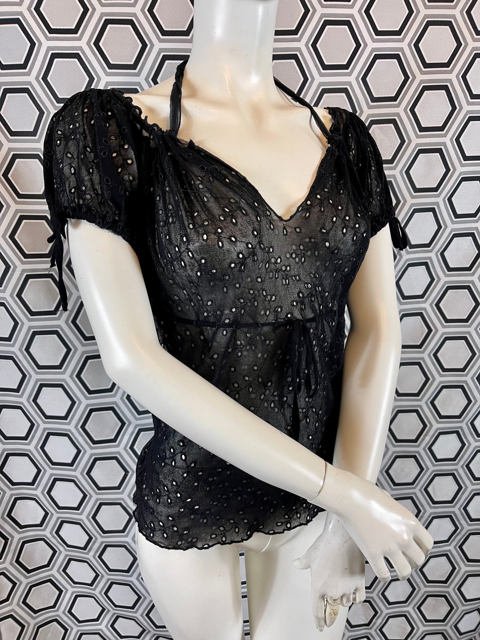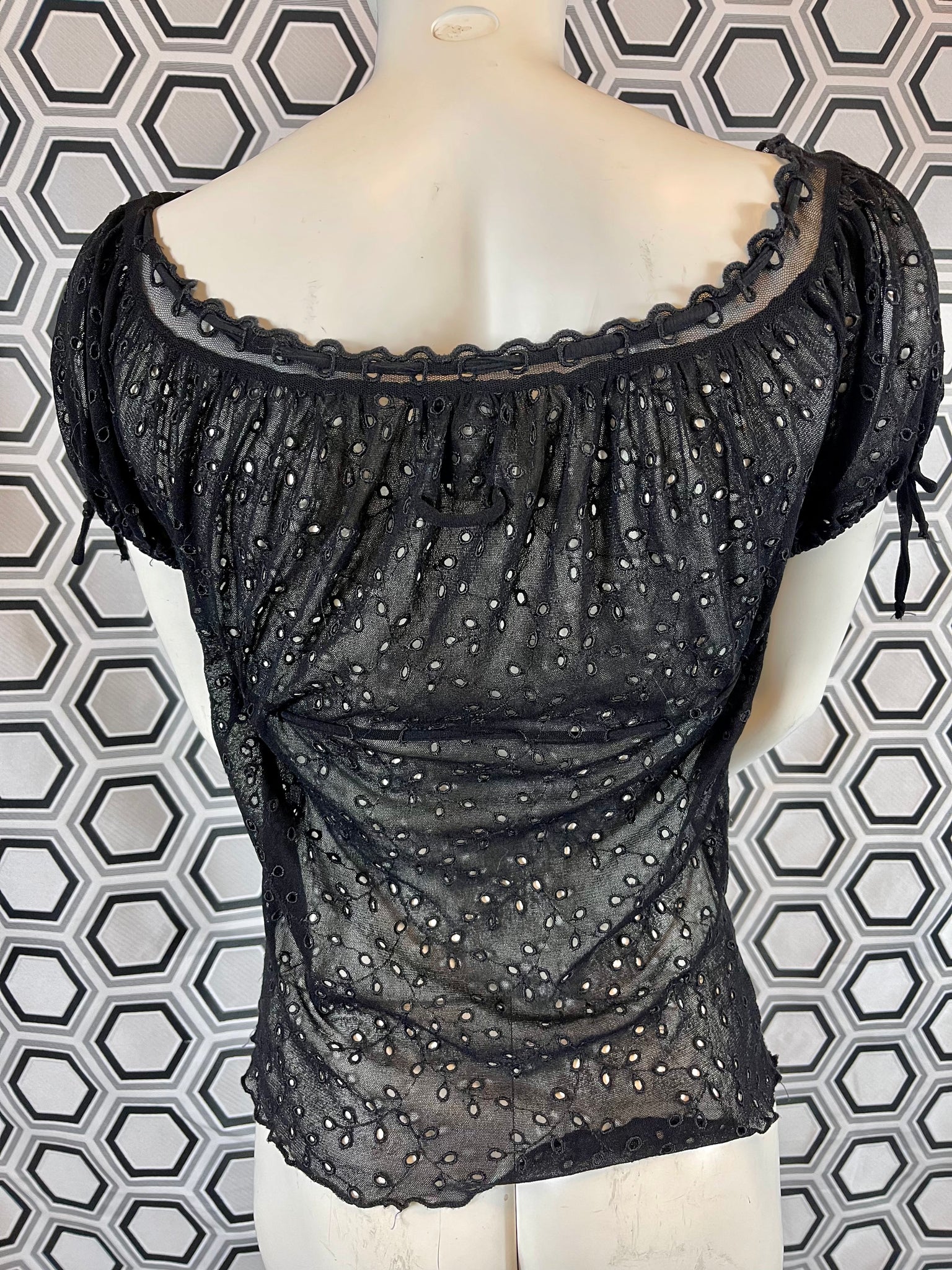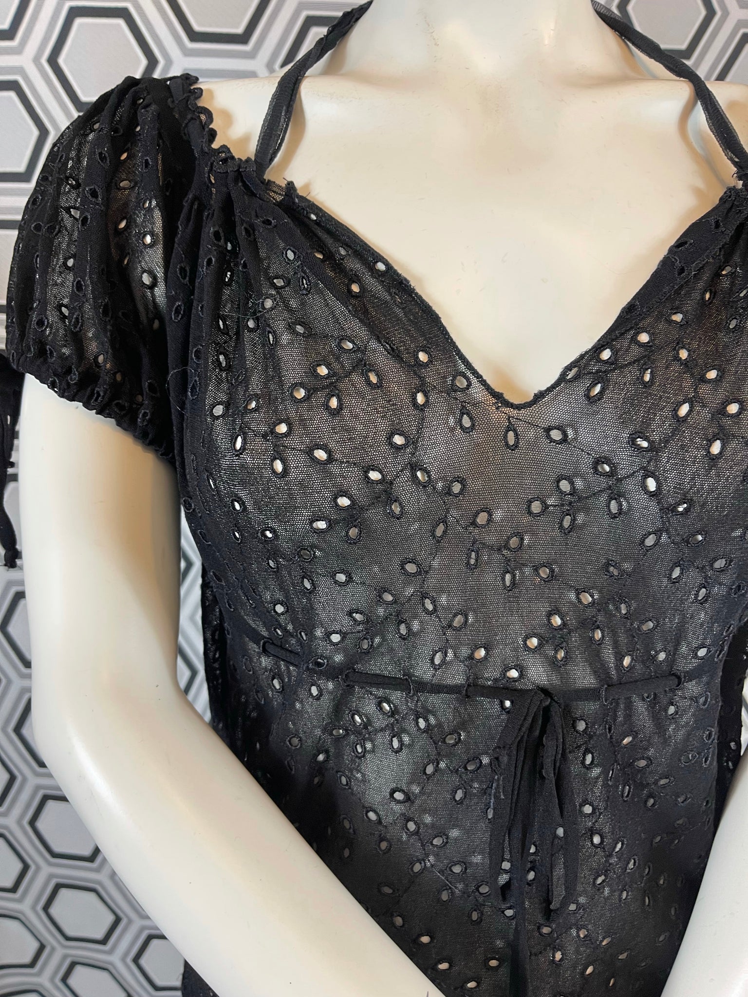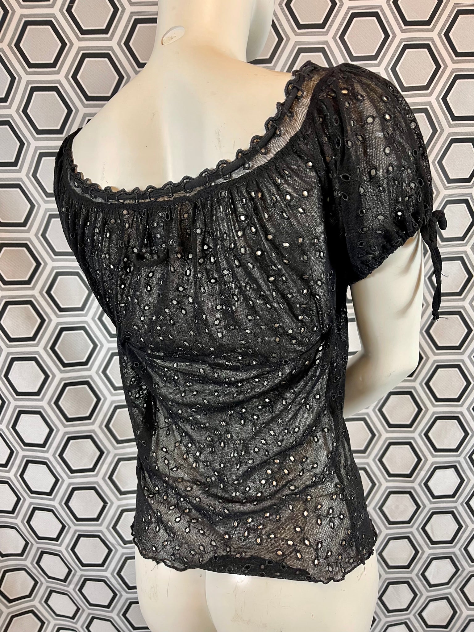 Tissu mesh traité façon broderies anglaises, 100% polyamide. Matière hyper extensible.