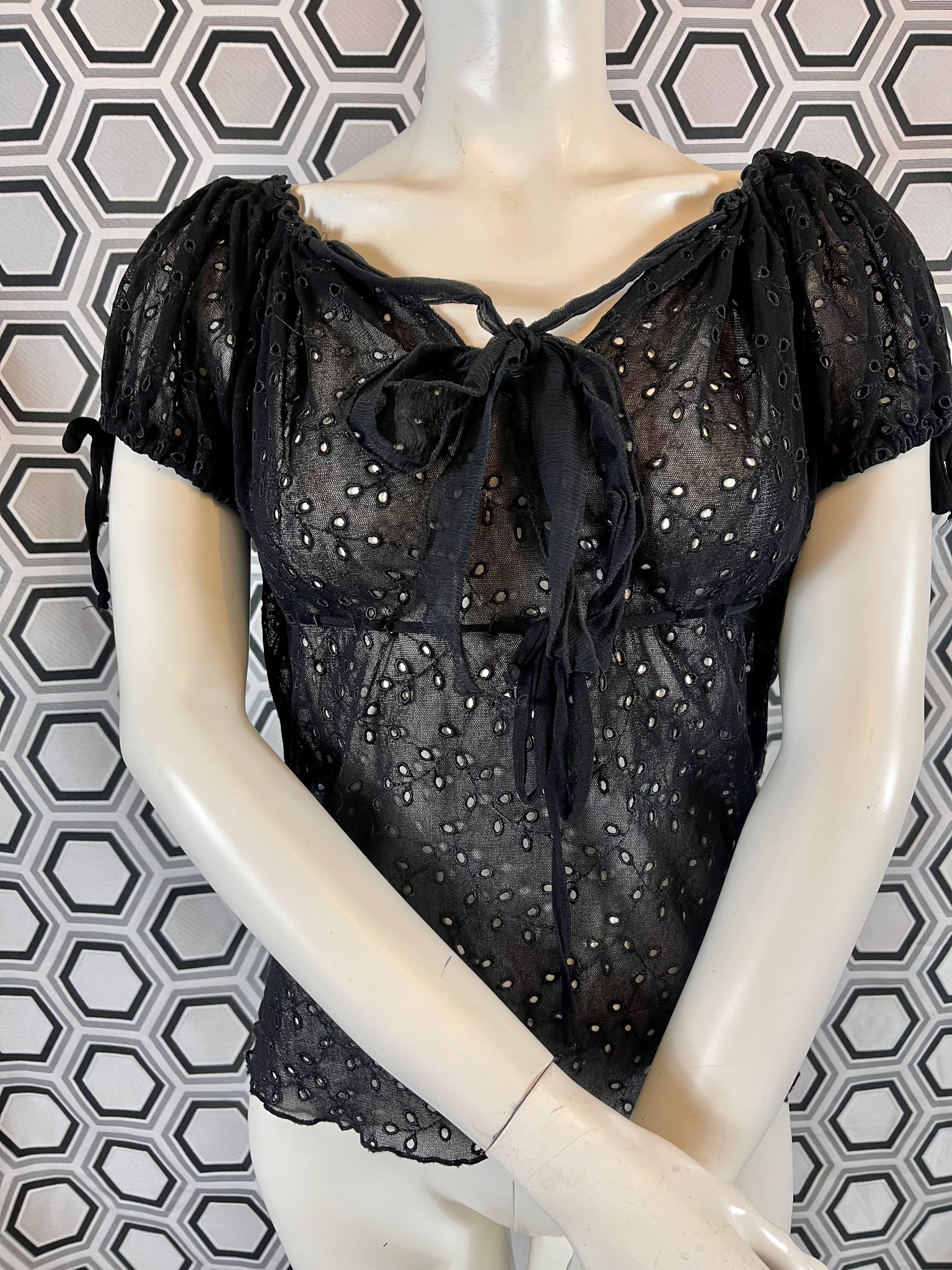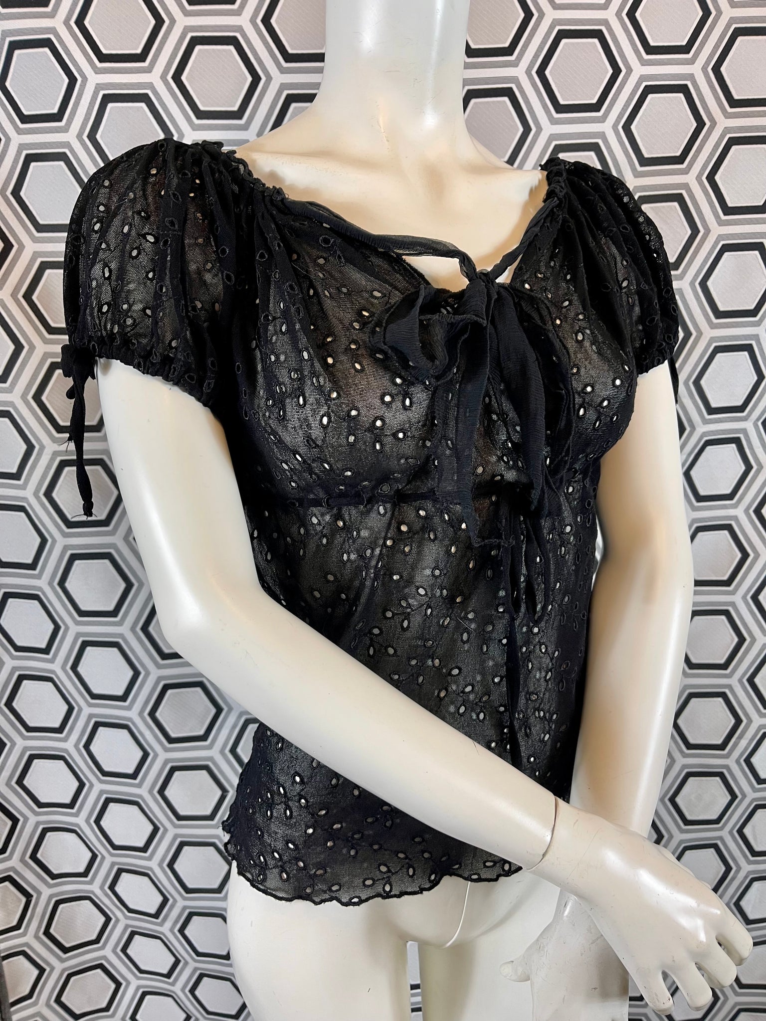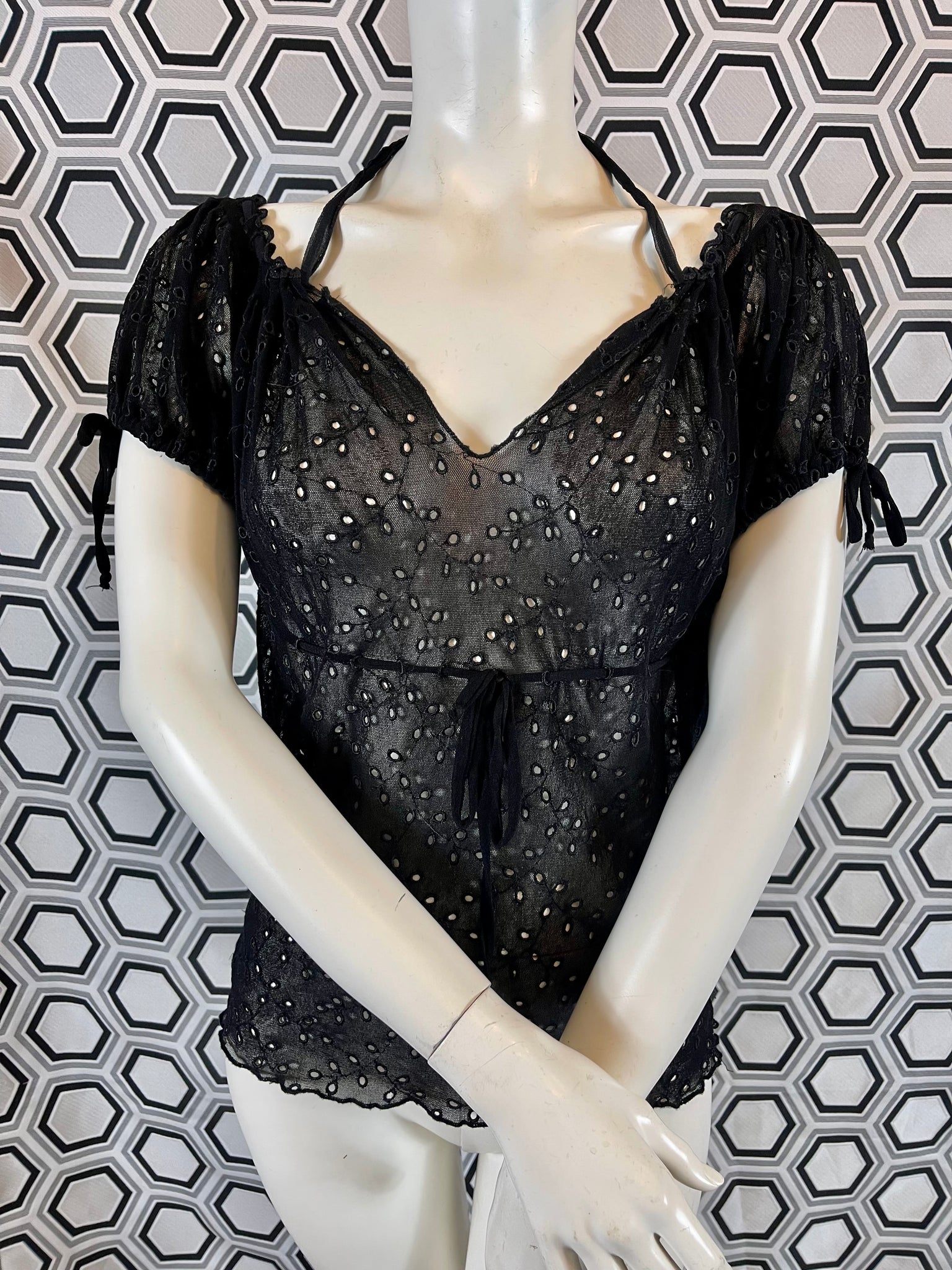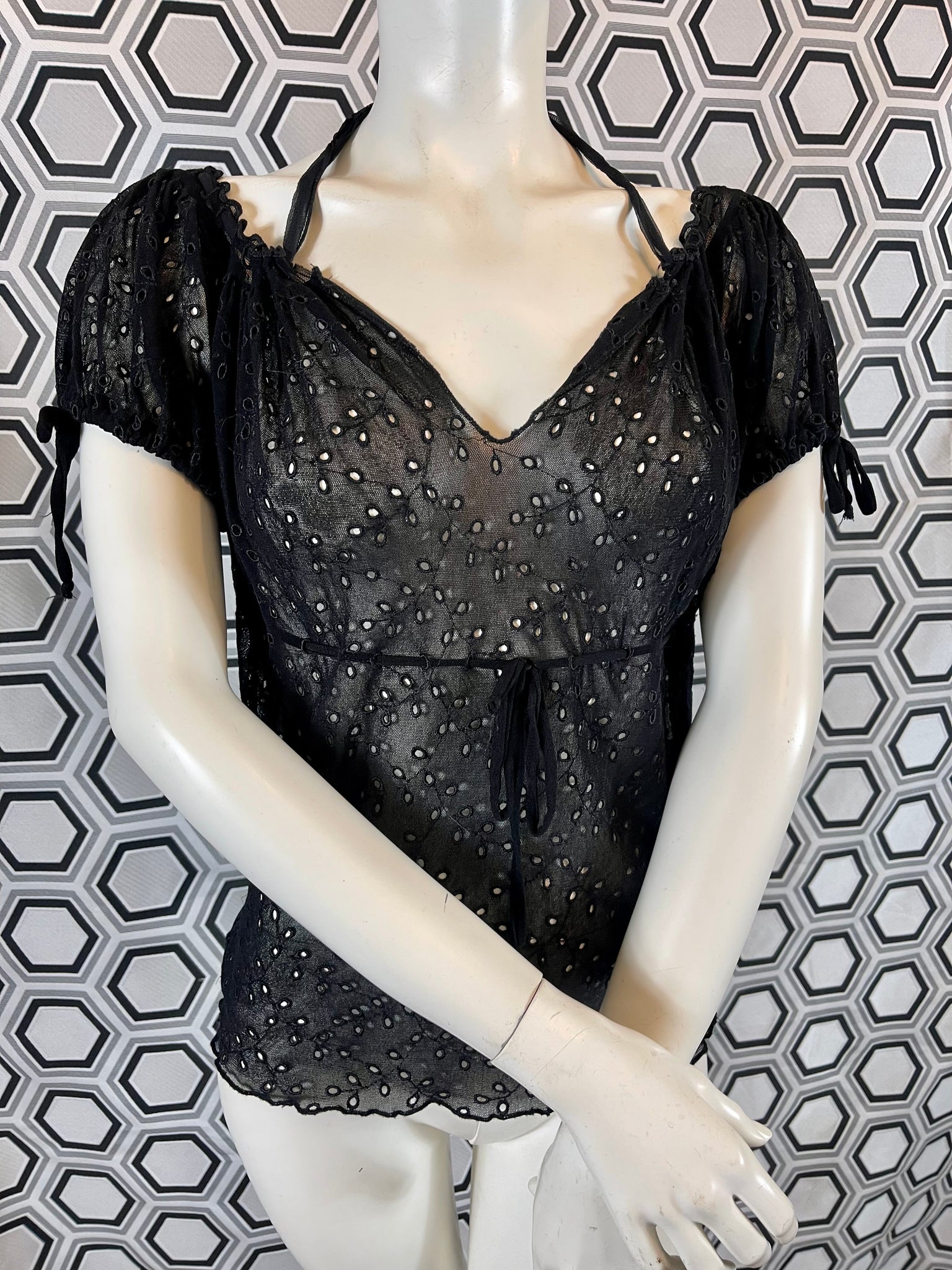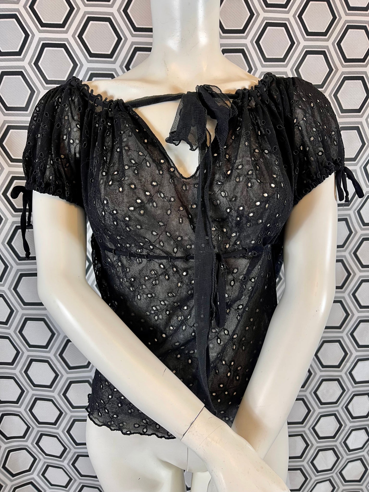 Tissu mesh traité façon broderies anglaises, 100% polyamide. Matière hyper extensible.