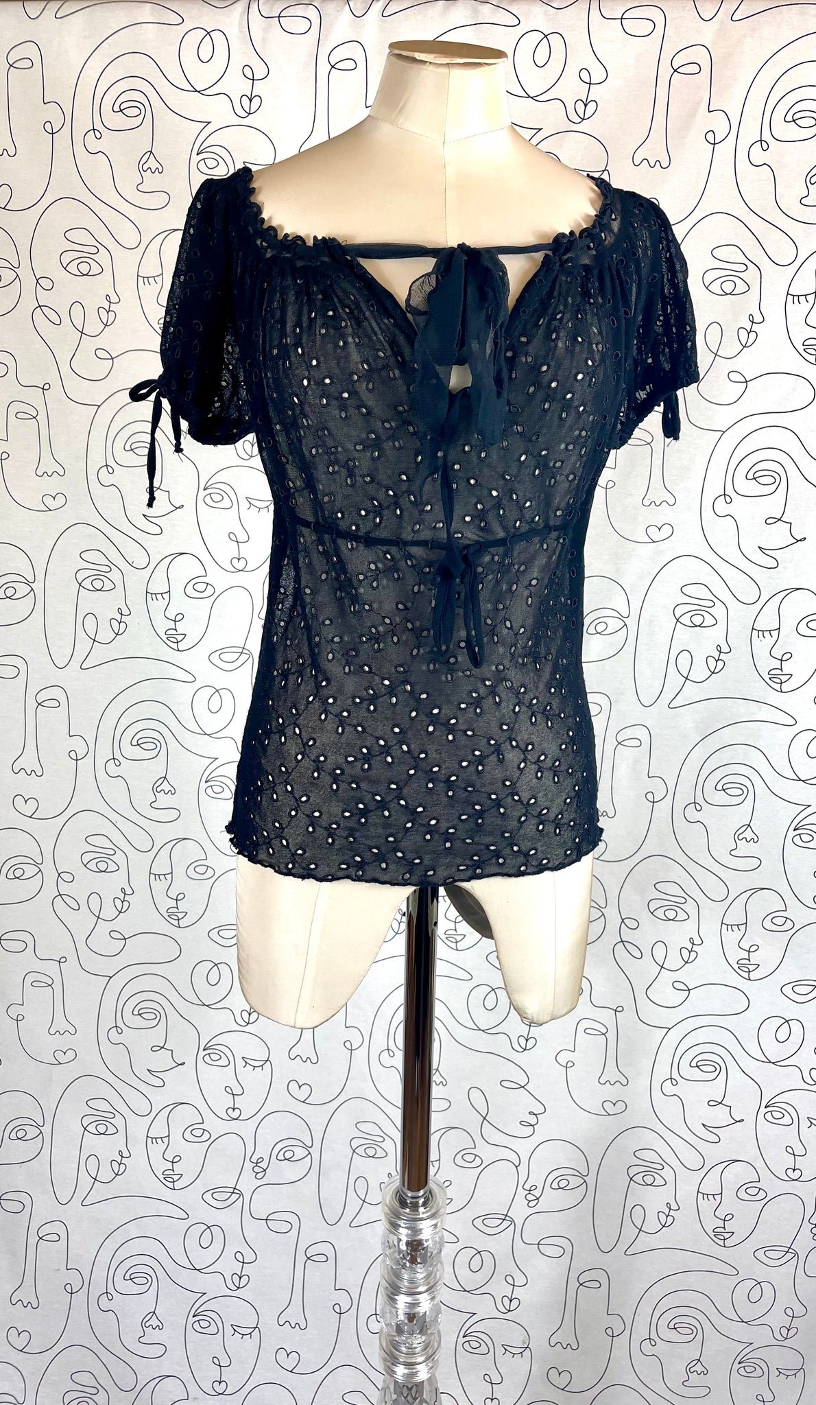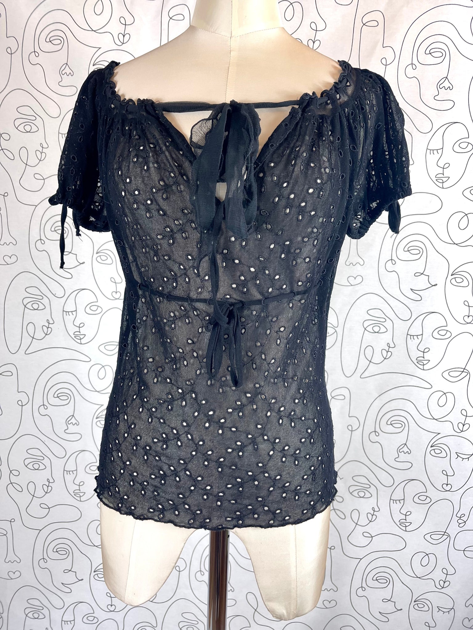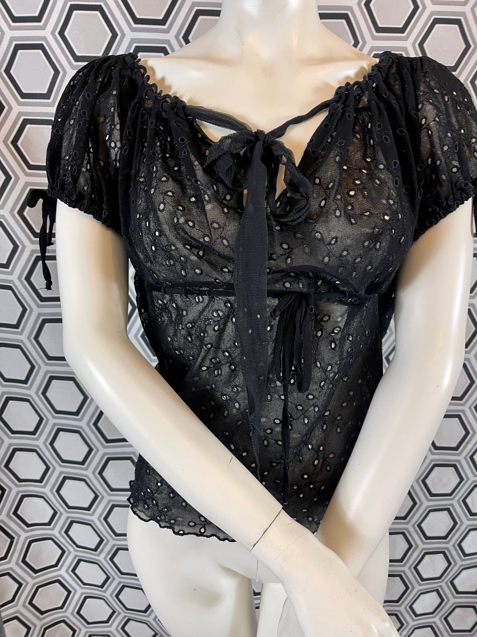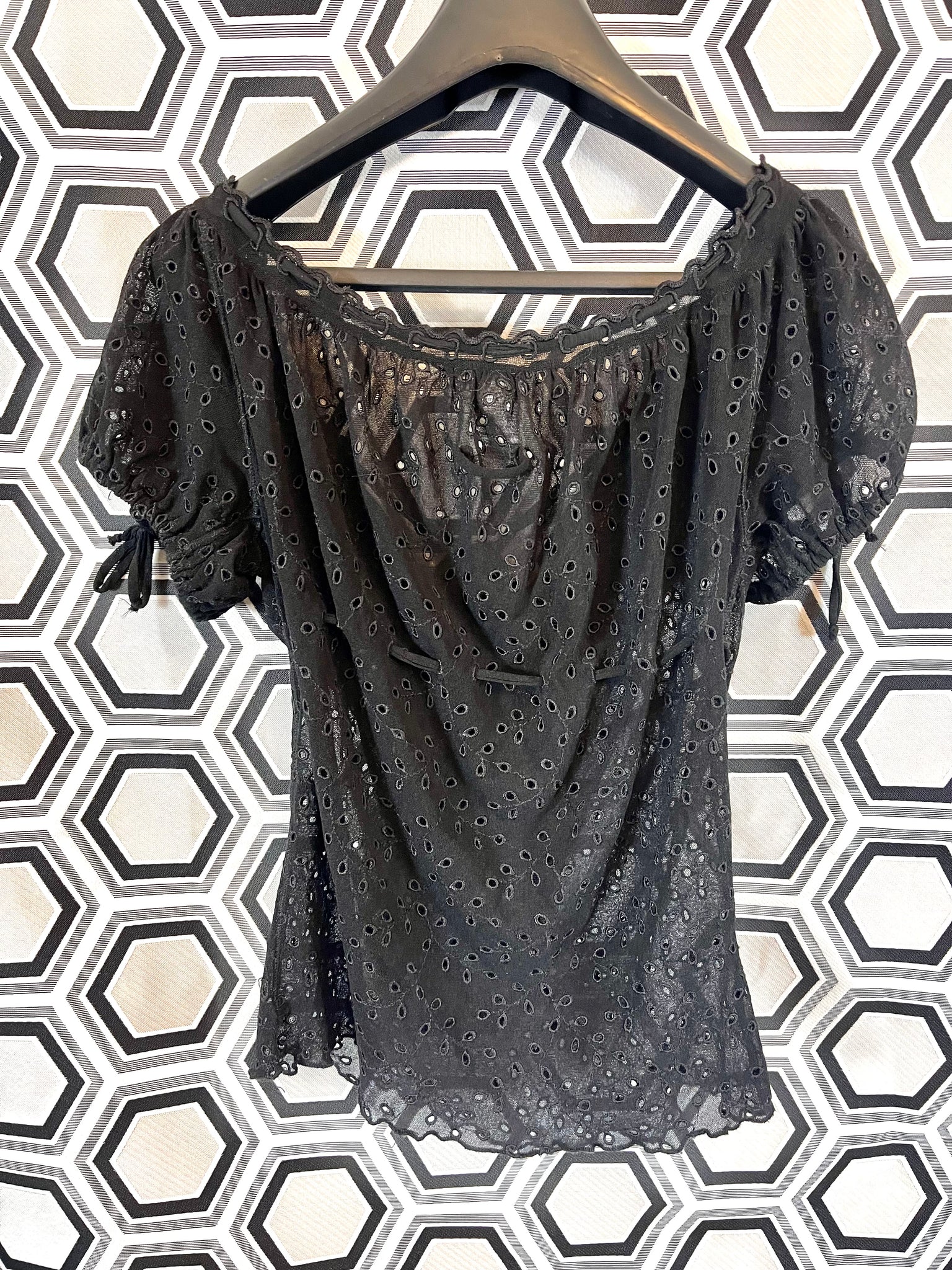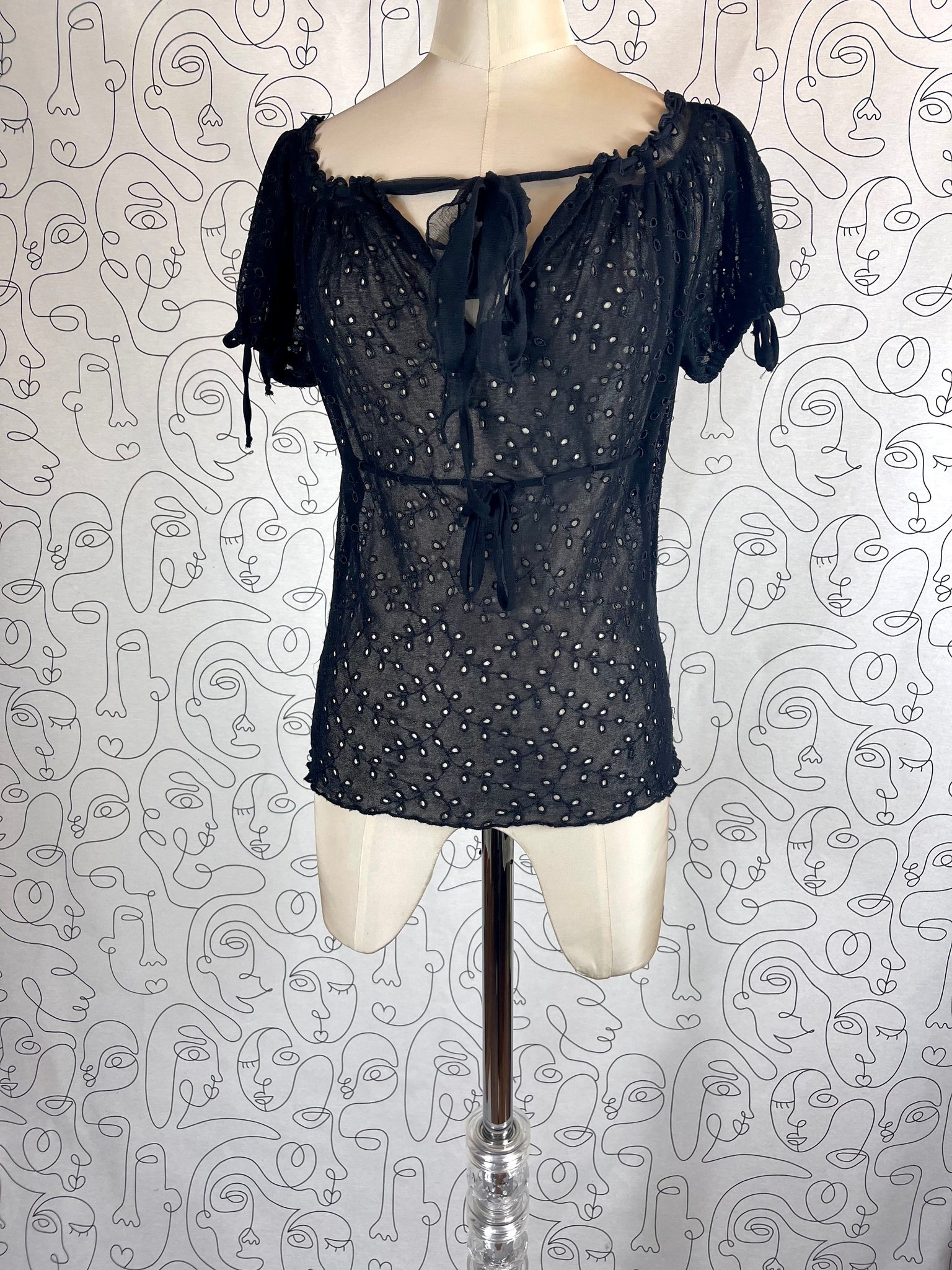 Tissu mesh traité façon broderies anglaises, 100% polyamide. Matière hyper extensible.