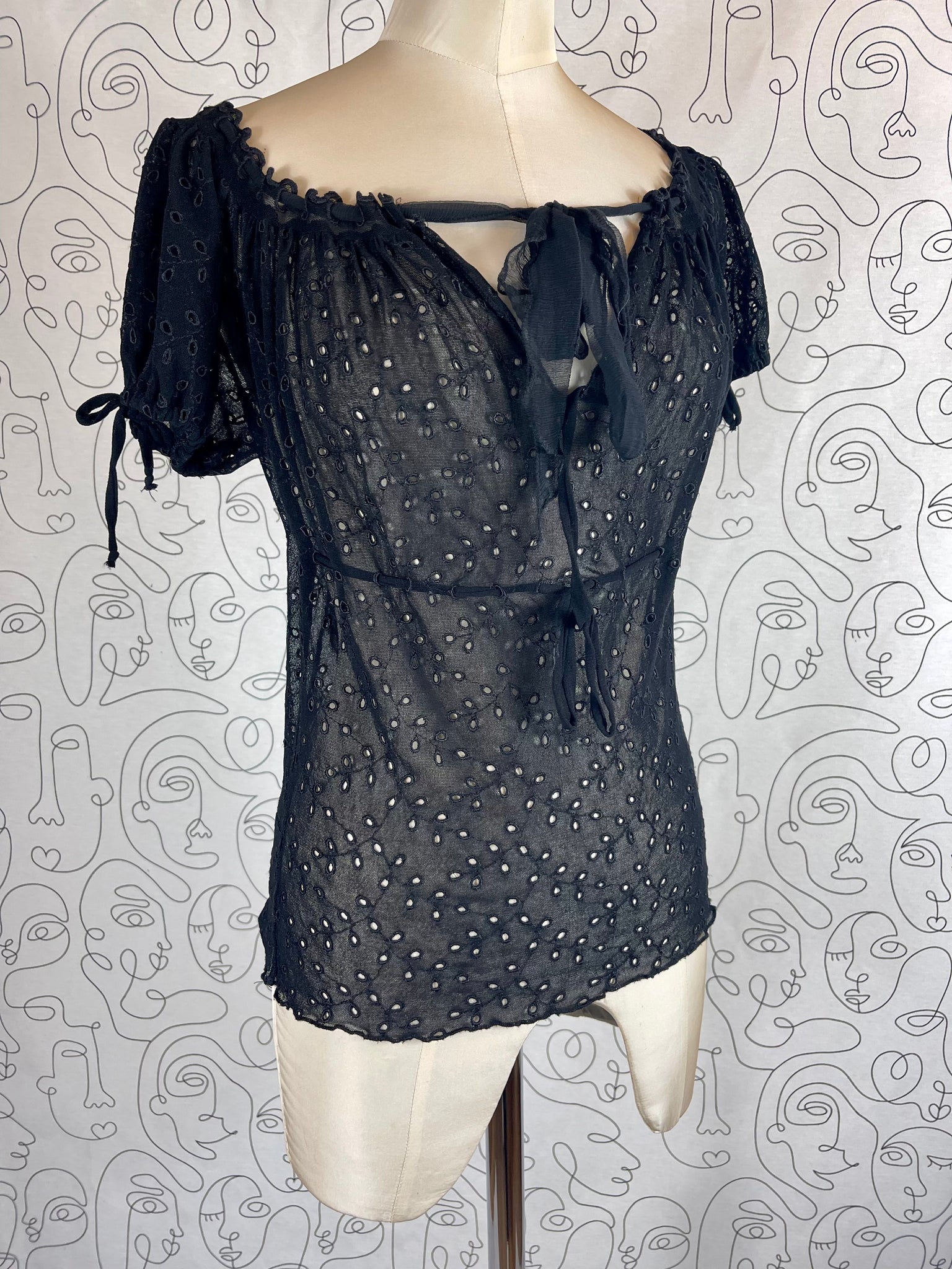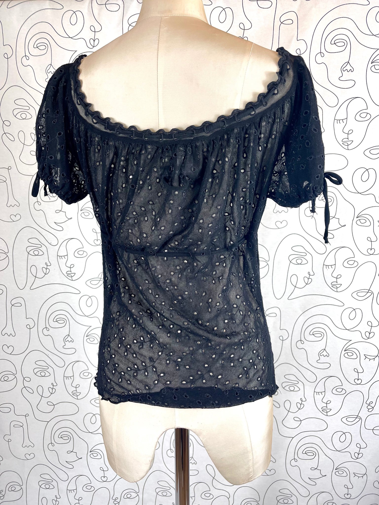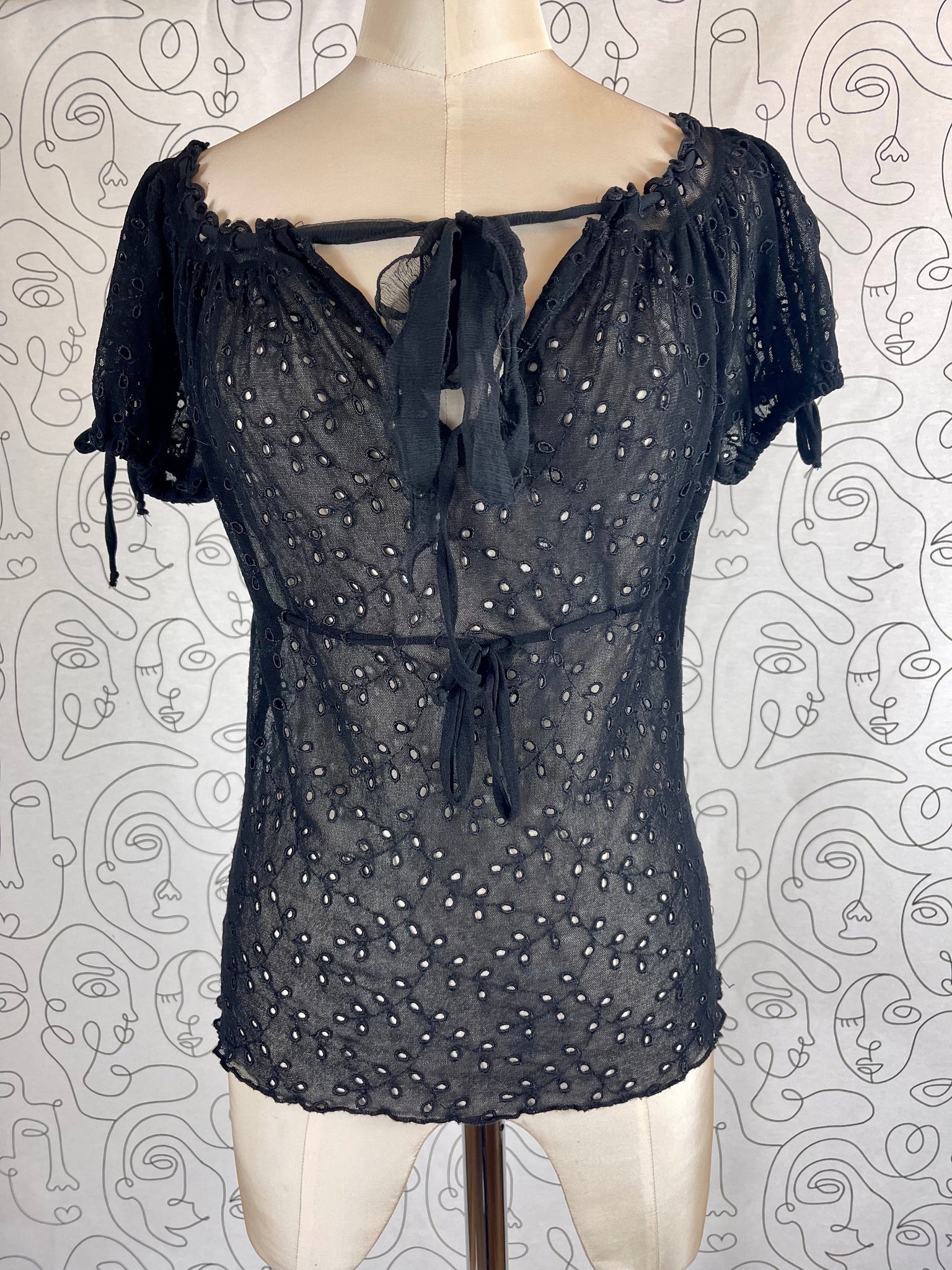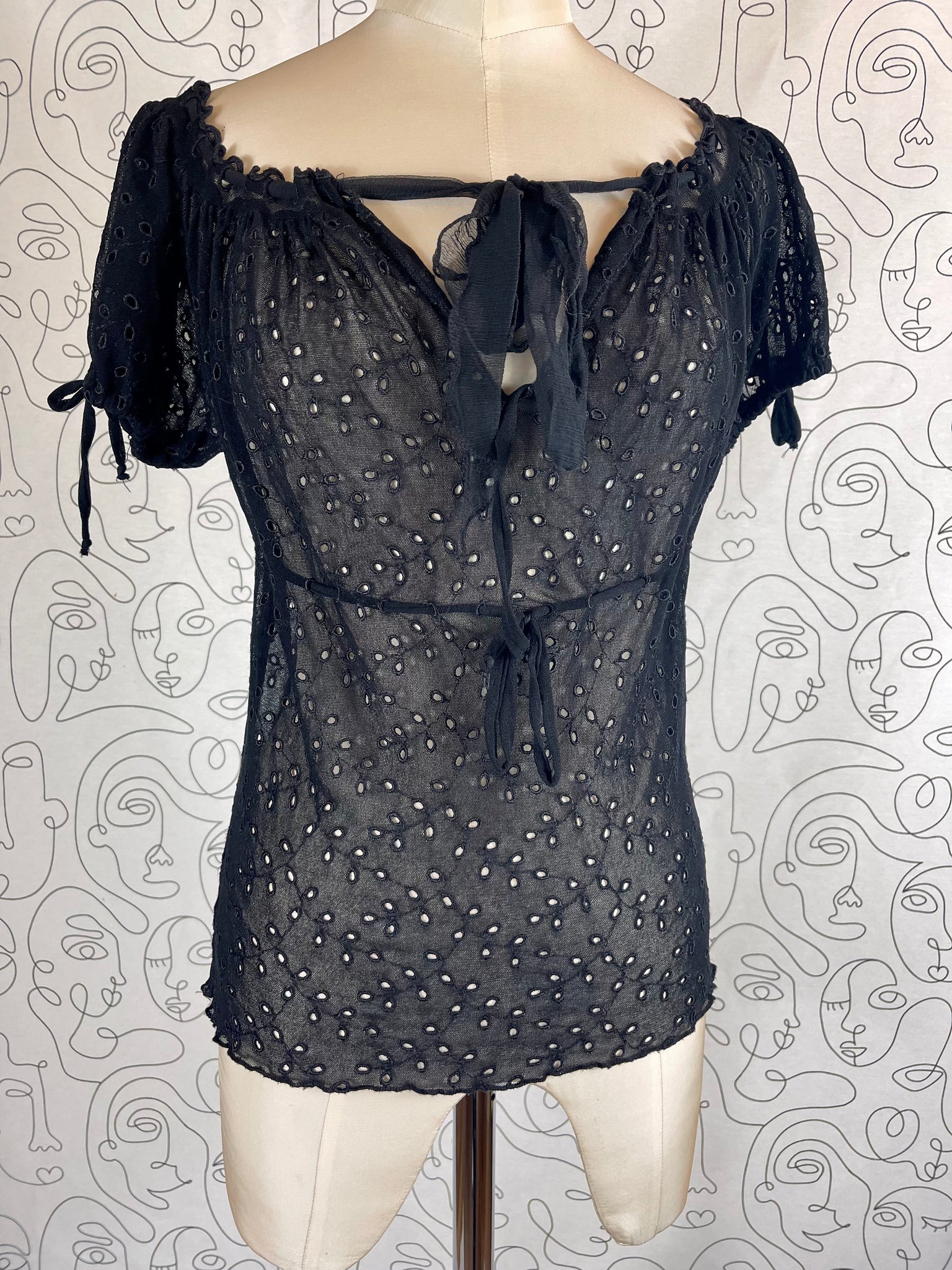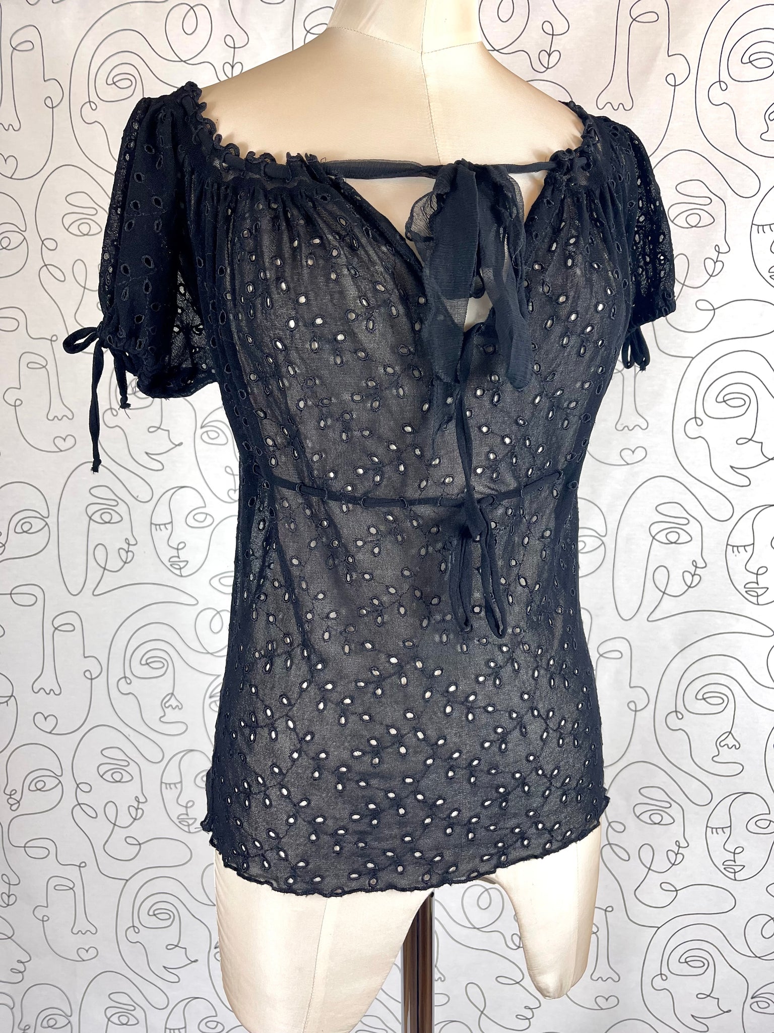 Tissu mesh traité façon broderies anglaises, 100% polyamide. Matière hyper extensible.