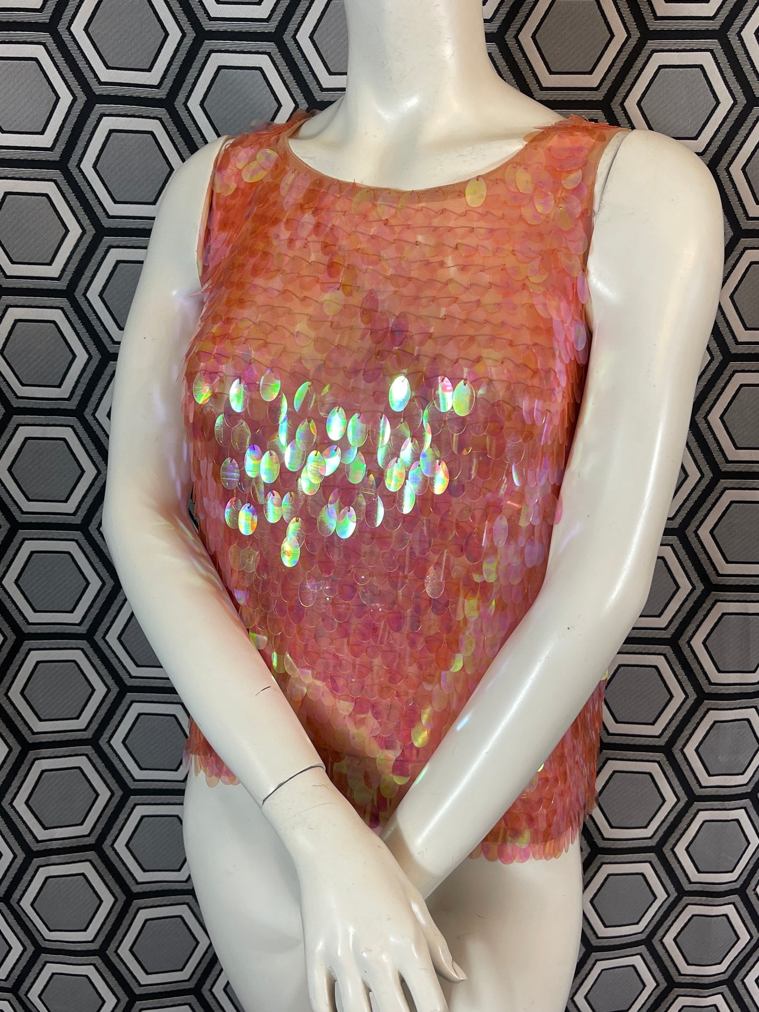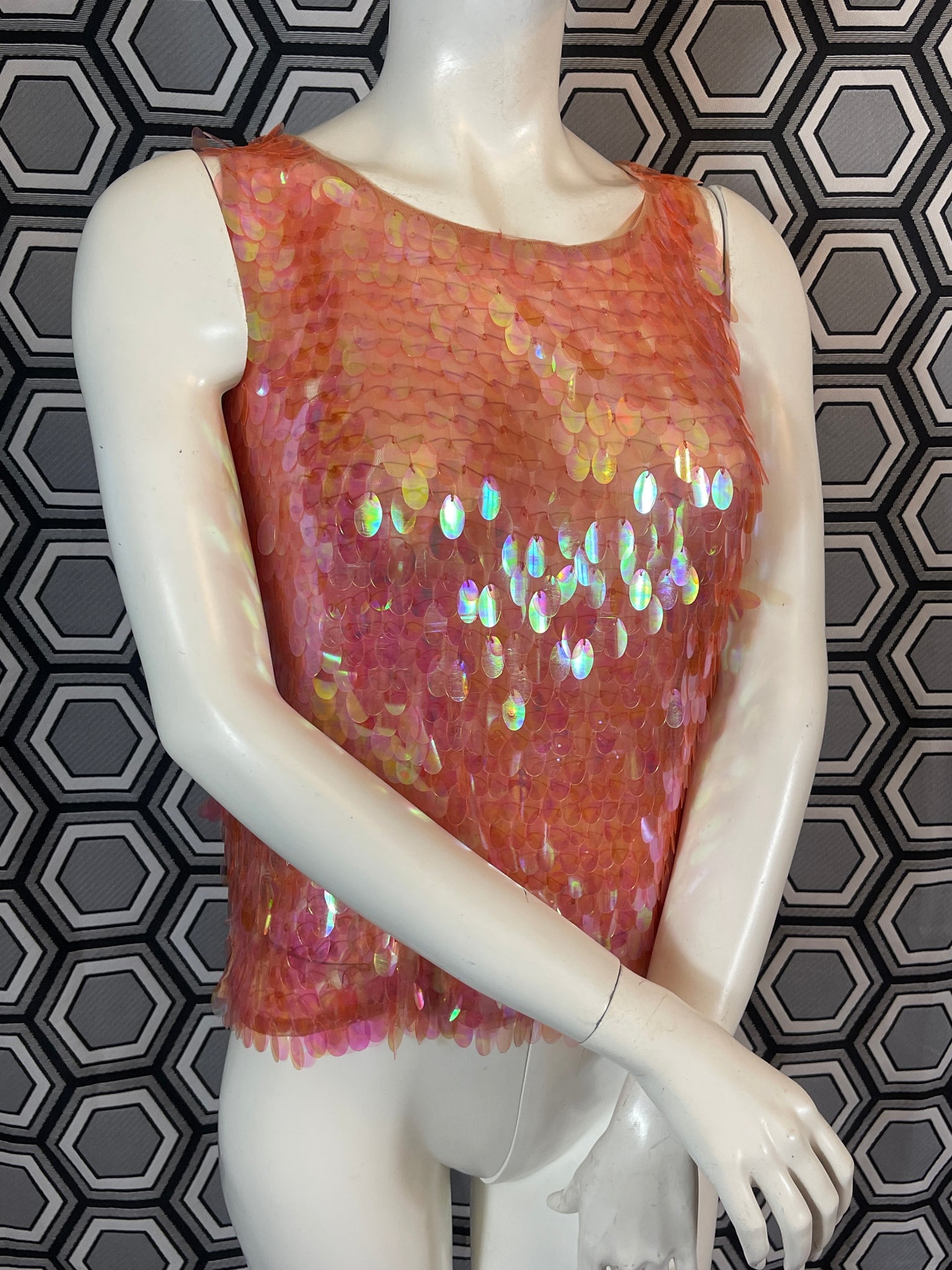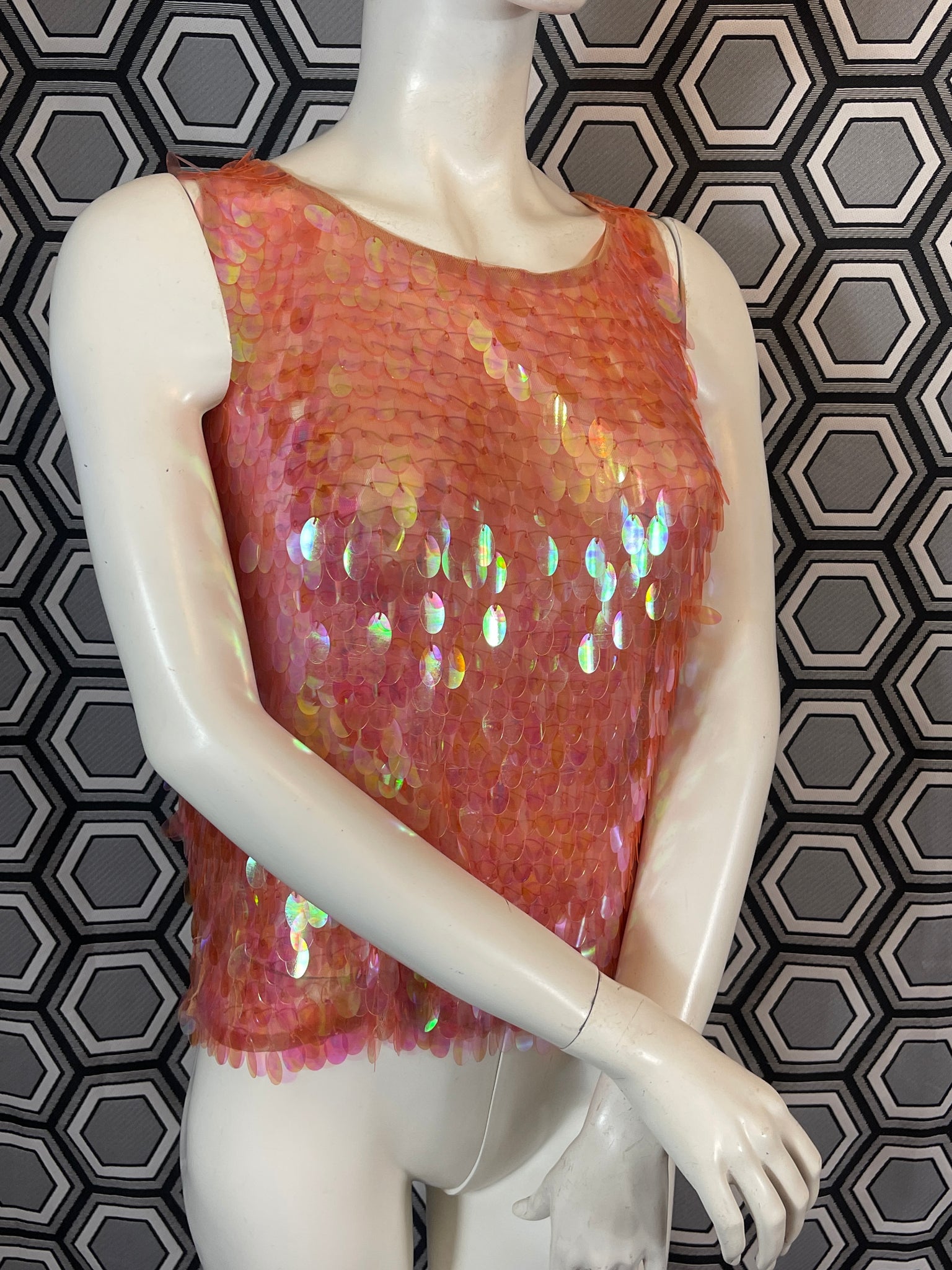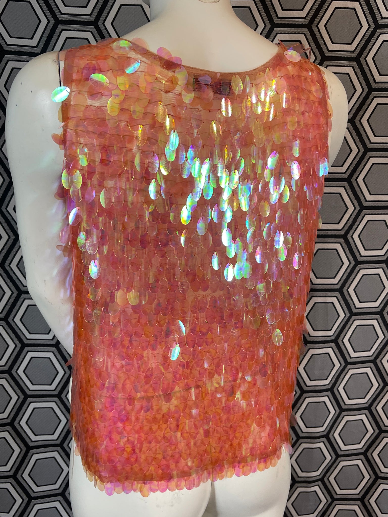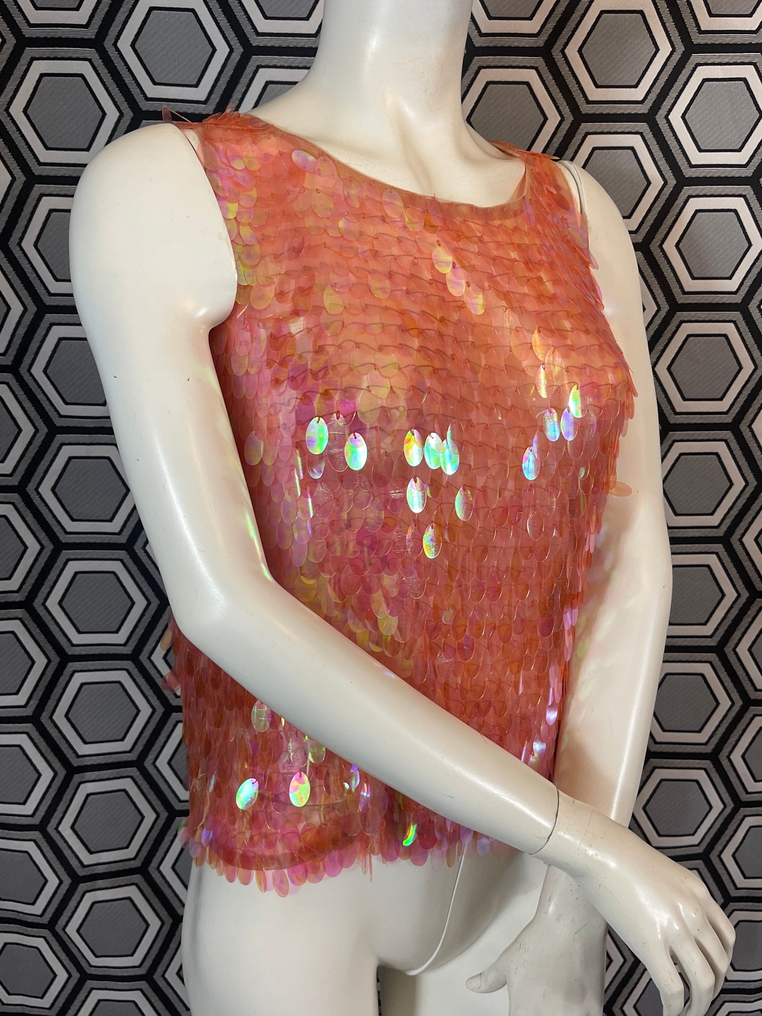 Superbe haut Murek Fashion en mesh recouvert de pastilles irisées en plastique.