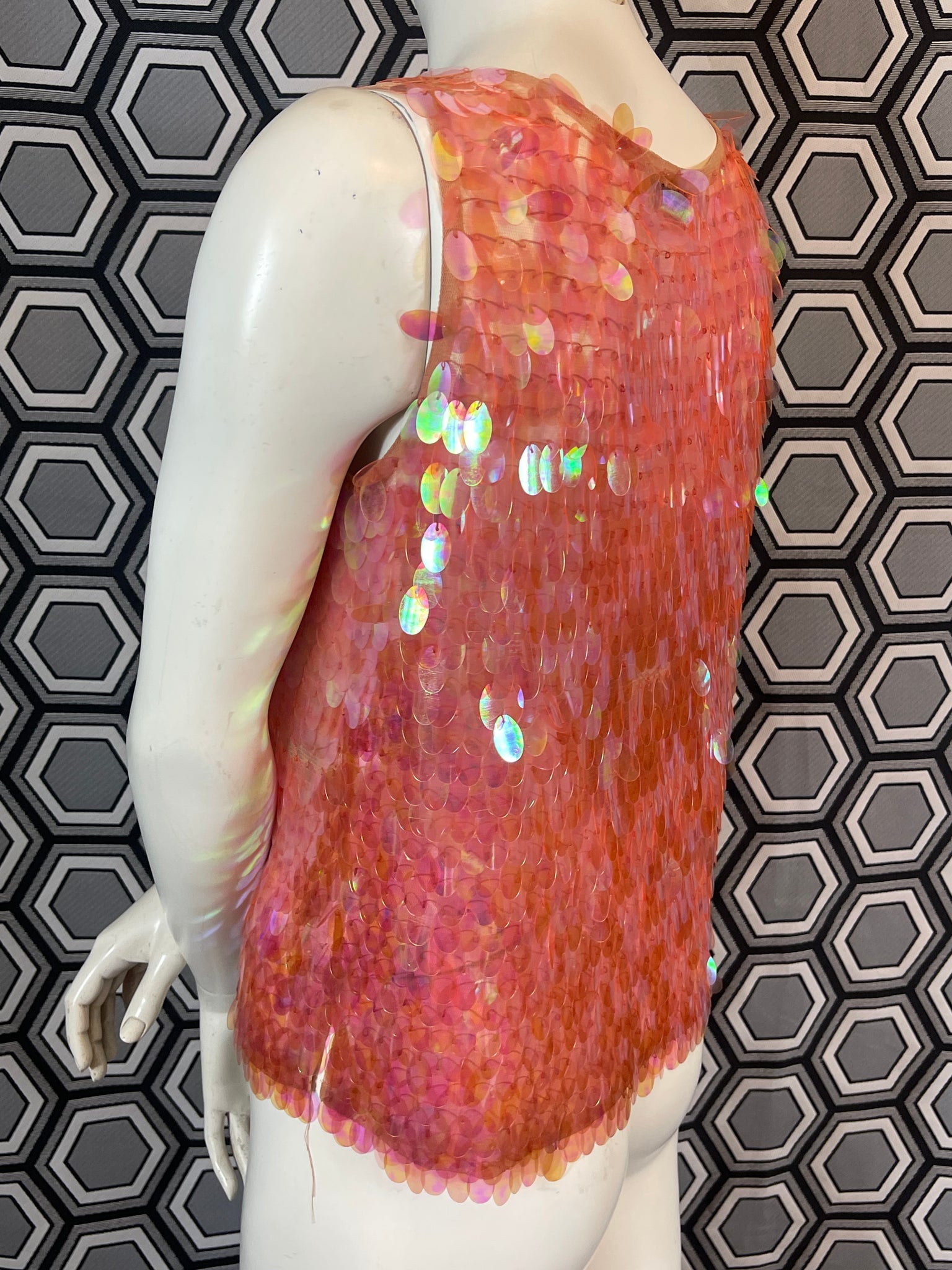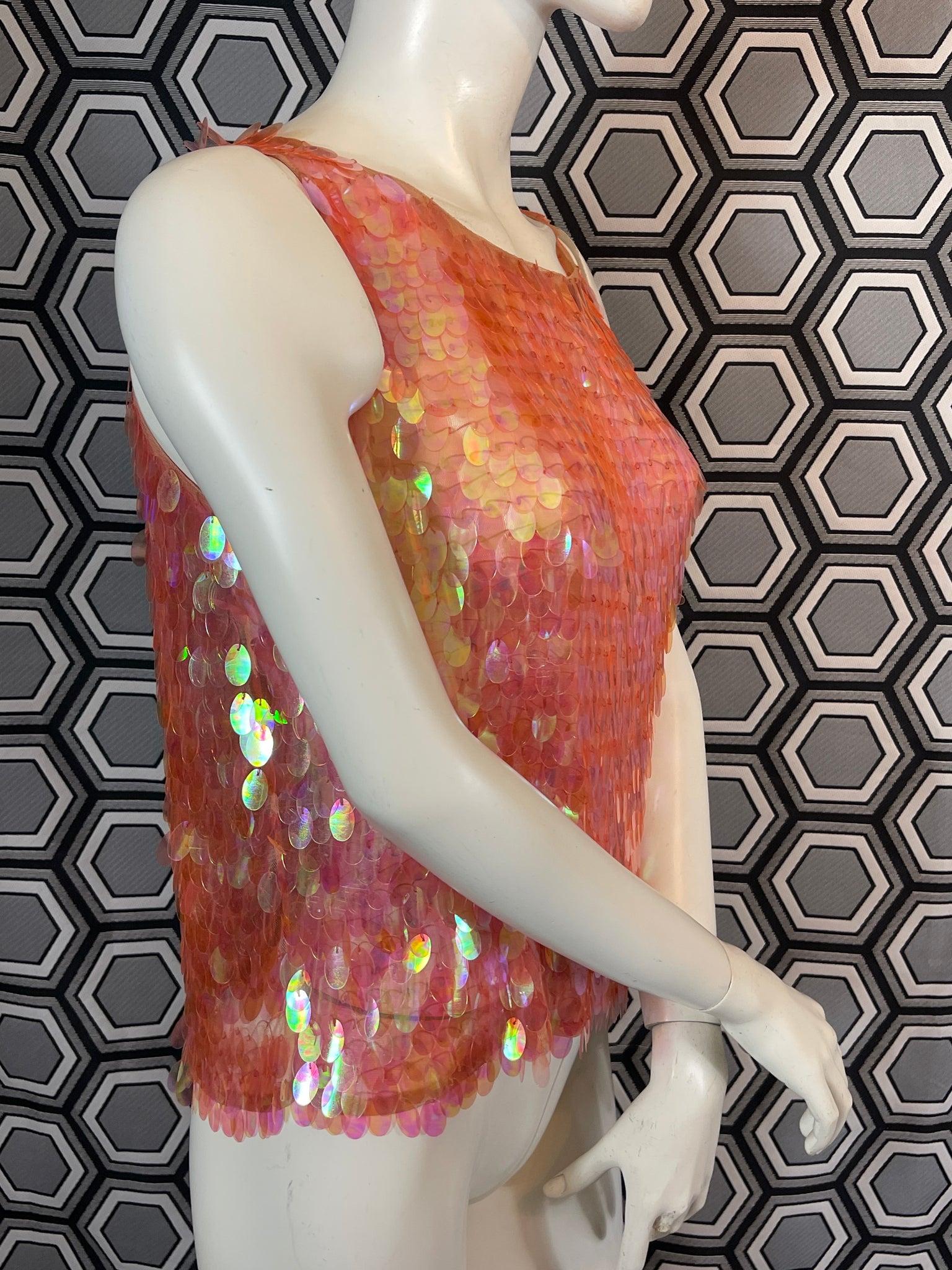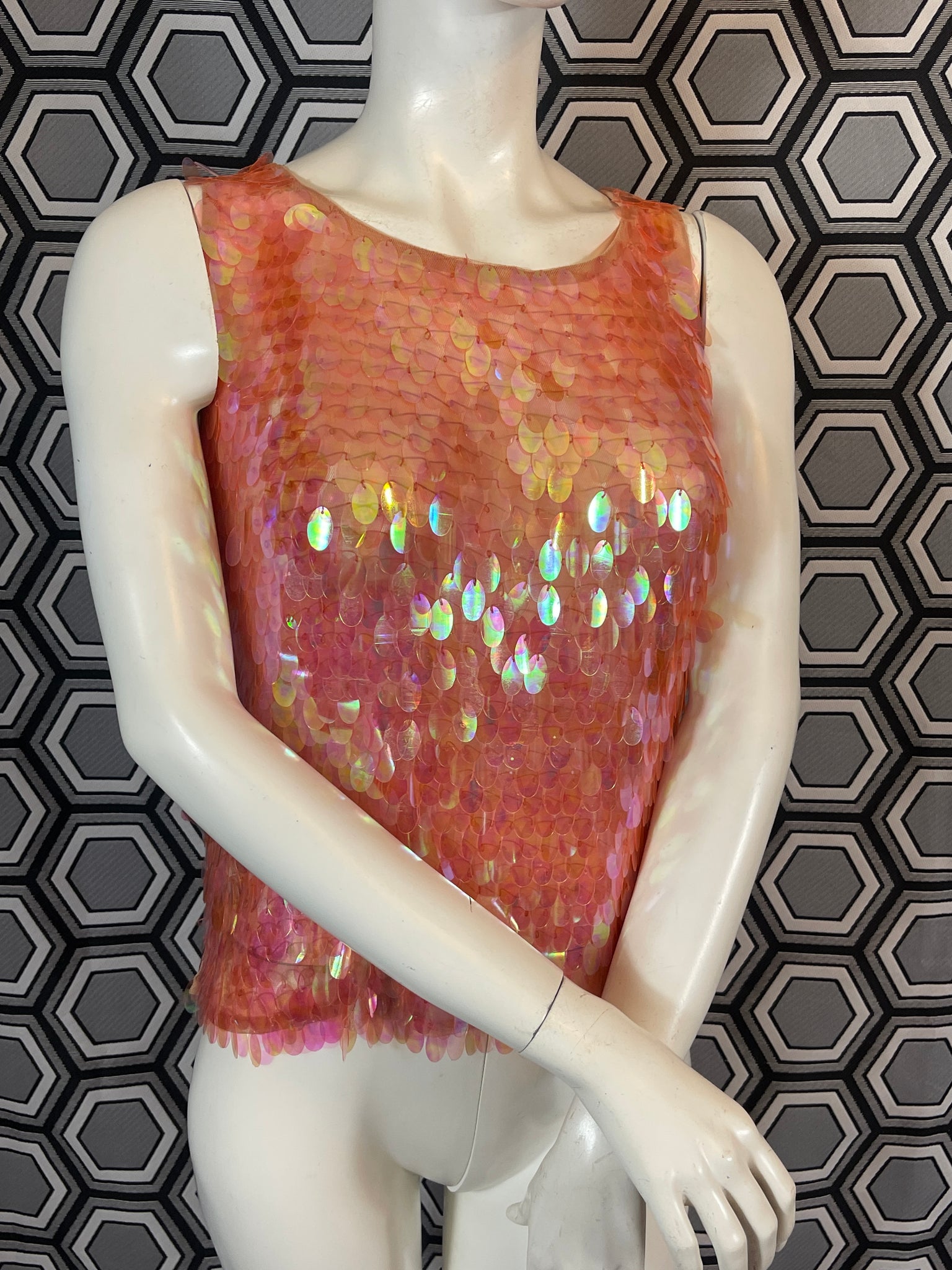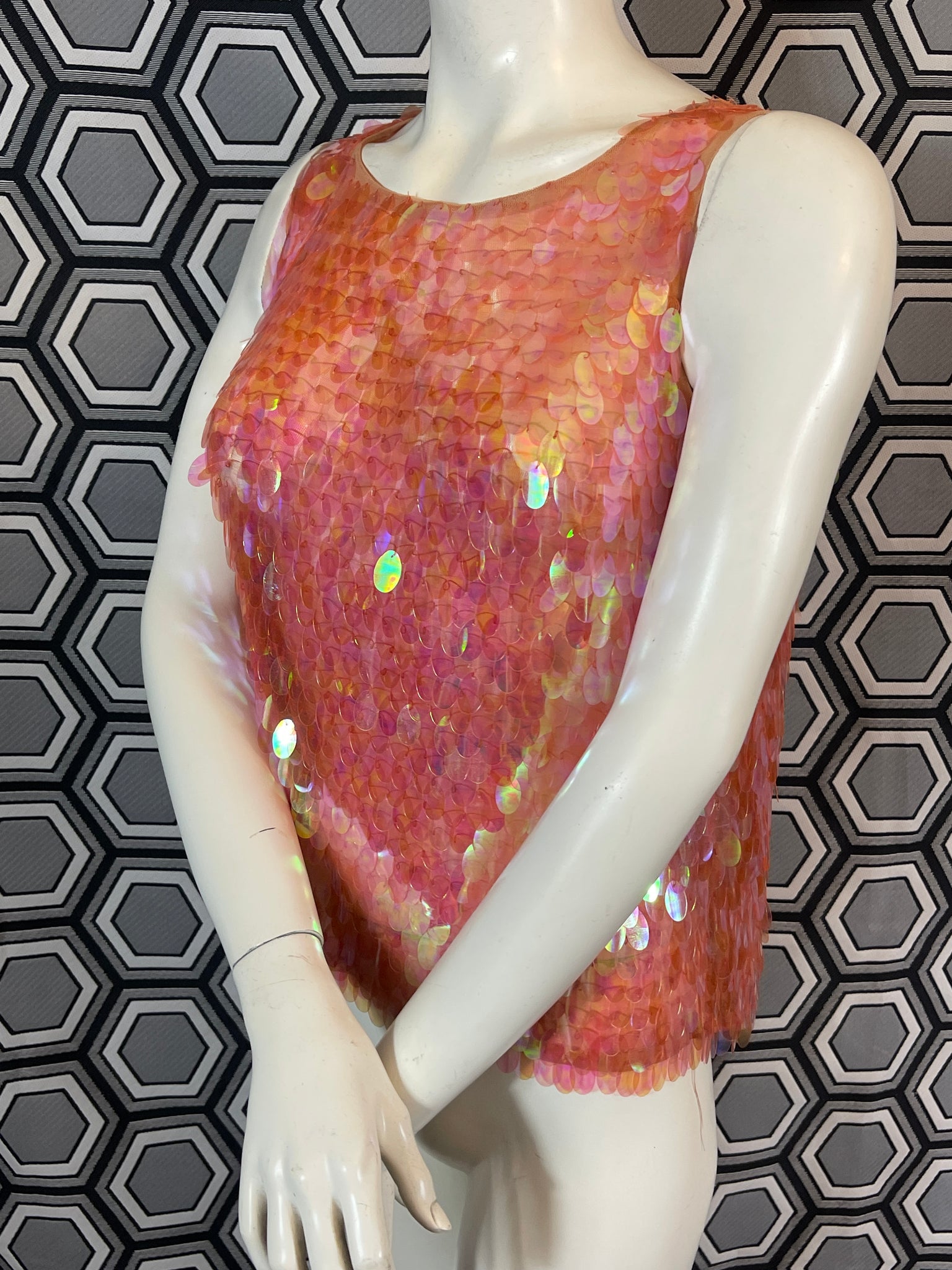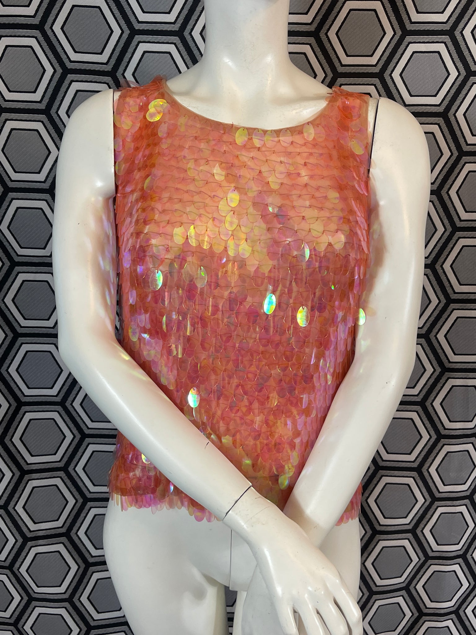 Superbe haut Murek Fashion en mesh recouvert de pastilles irisées en plastique.