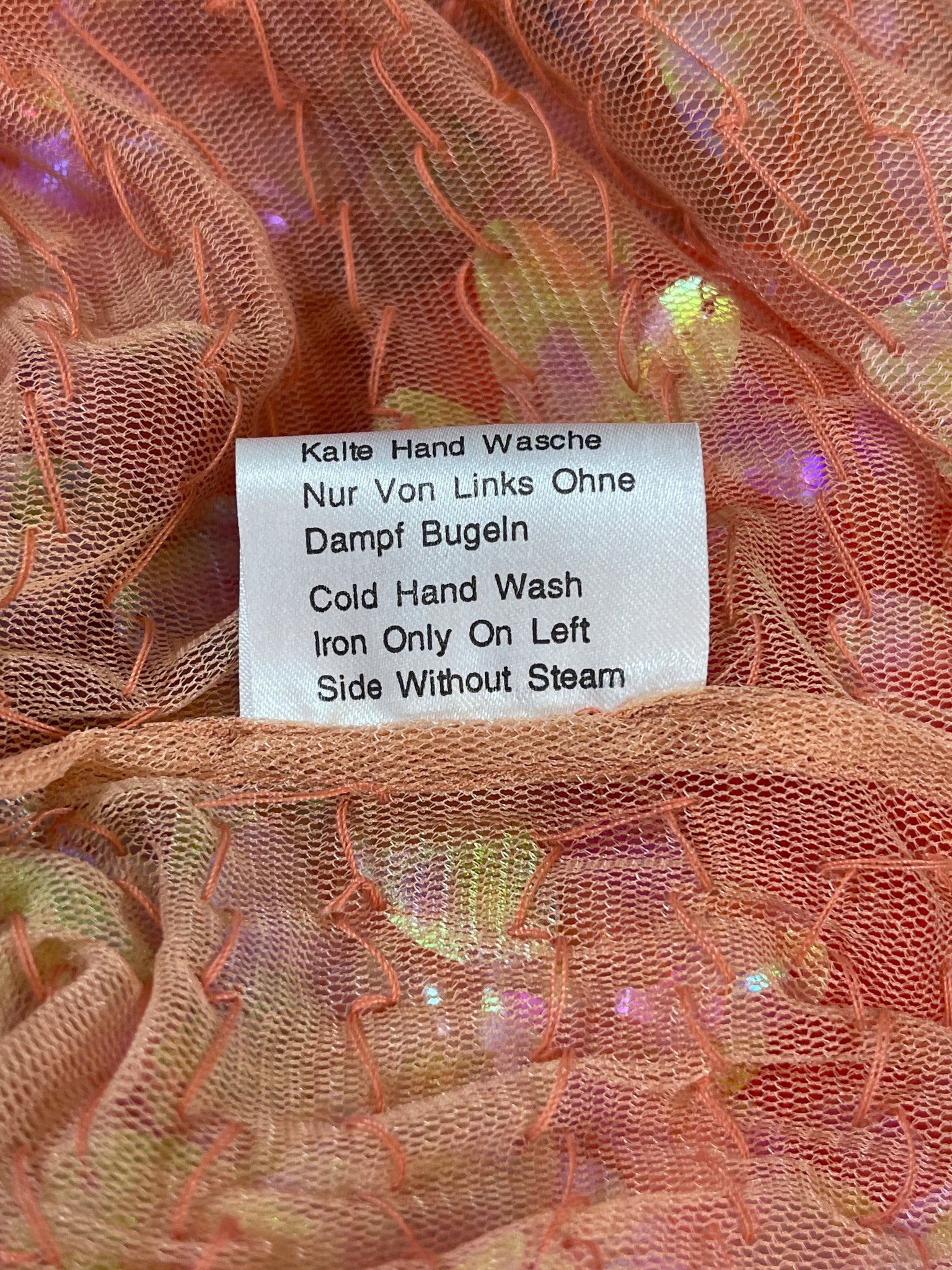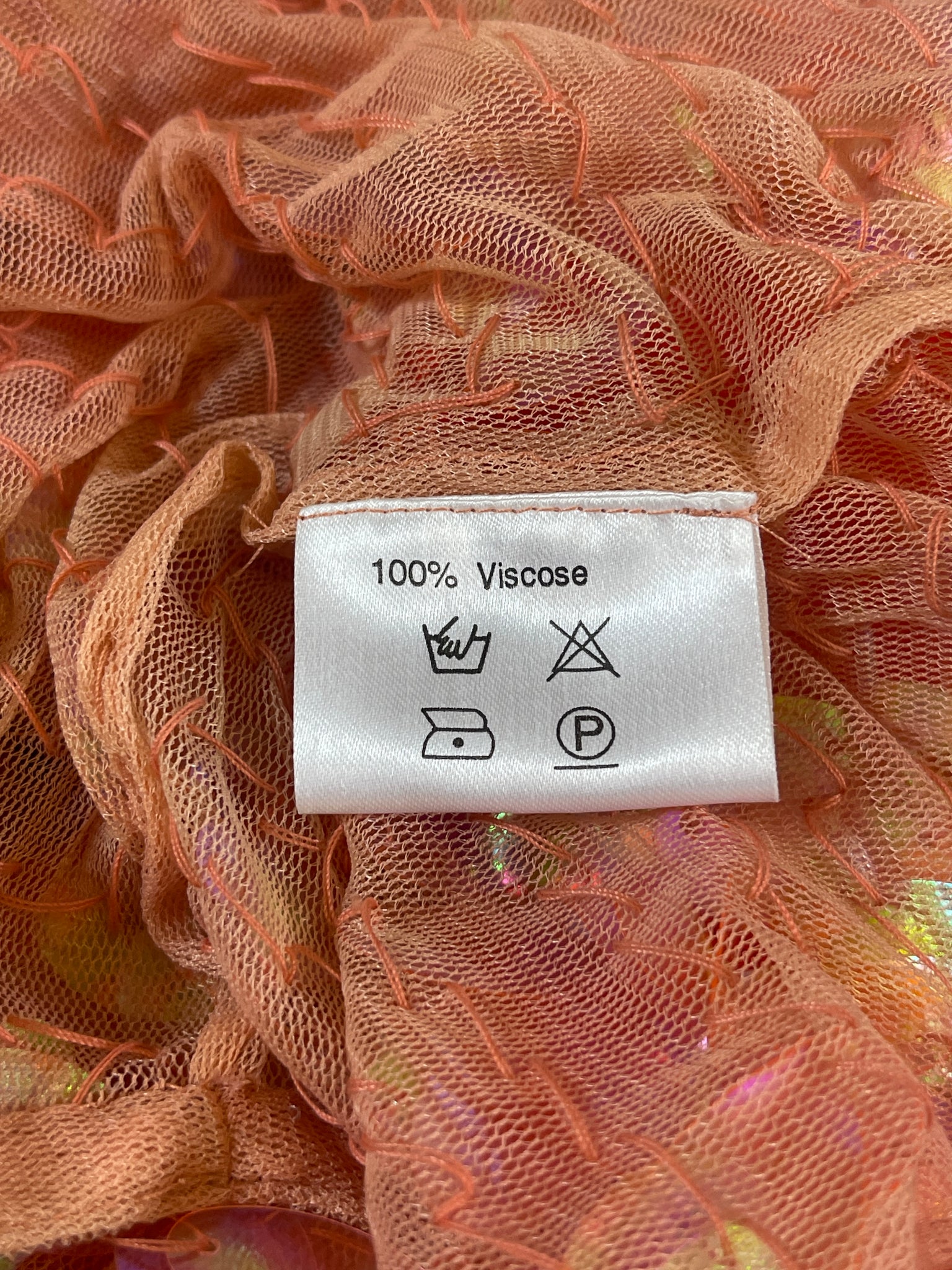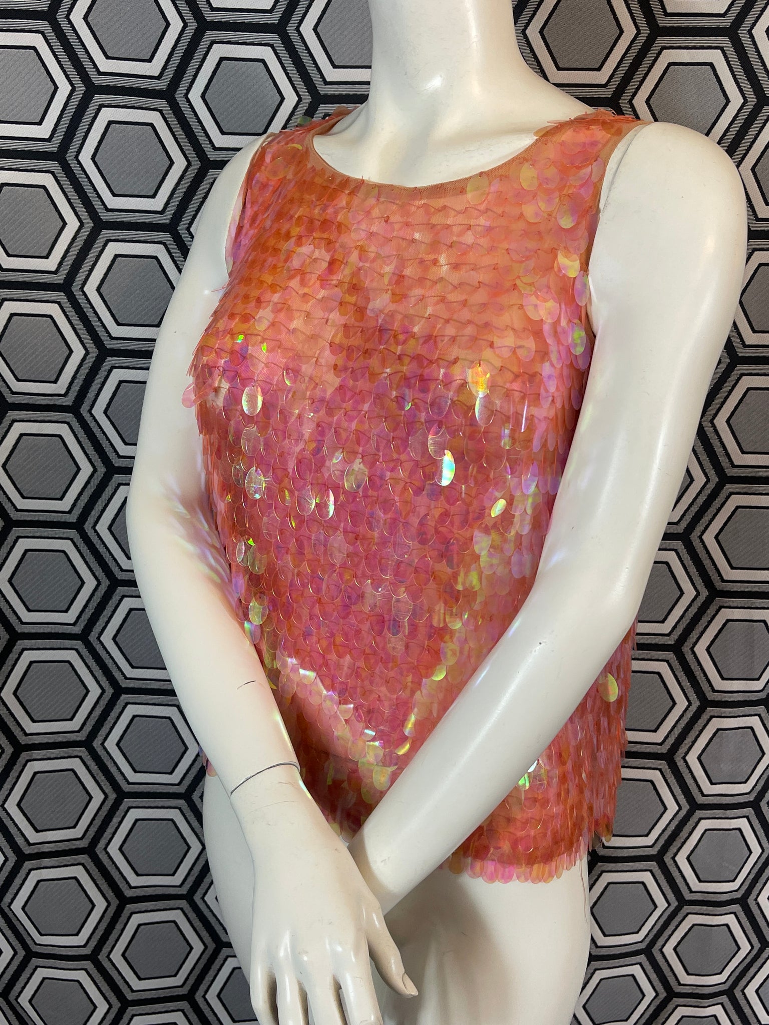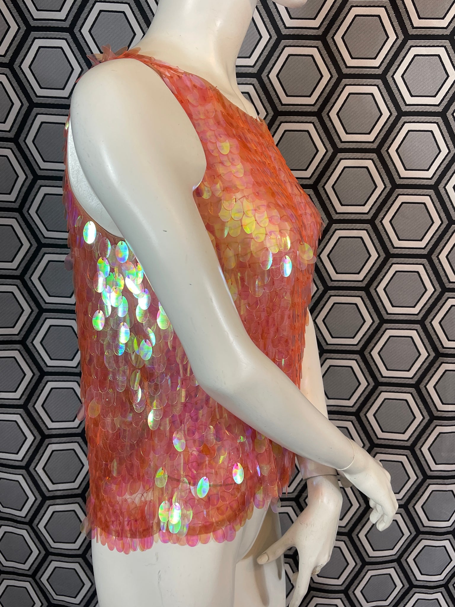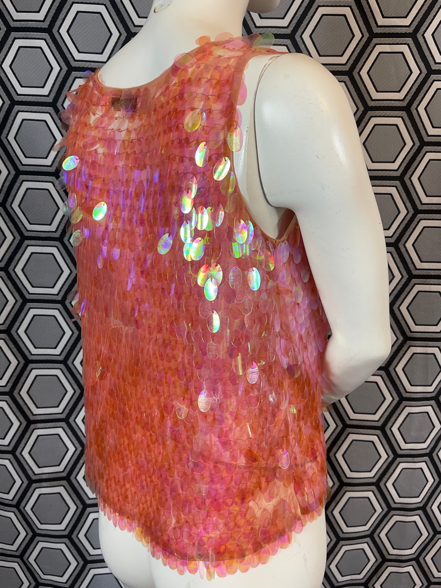 Superbe haut Murek Fashion en mesh recouvert de pastilles irisées en plastique.