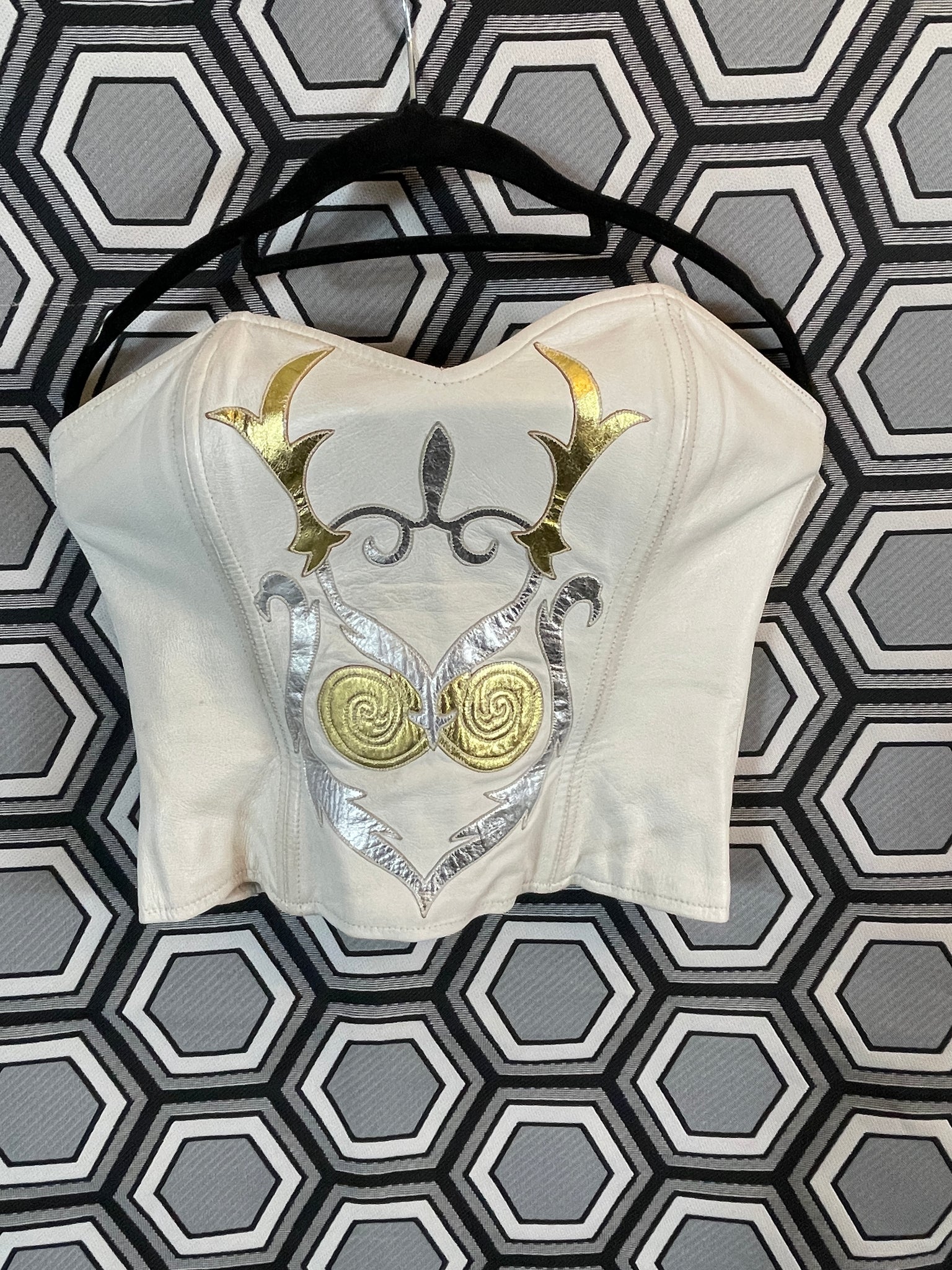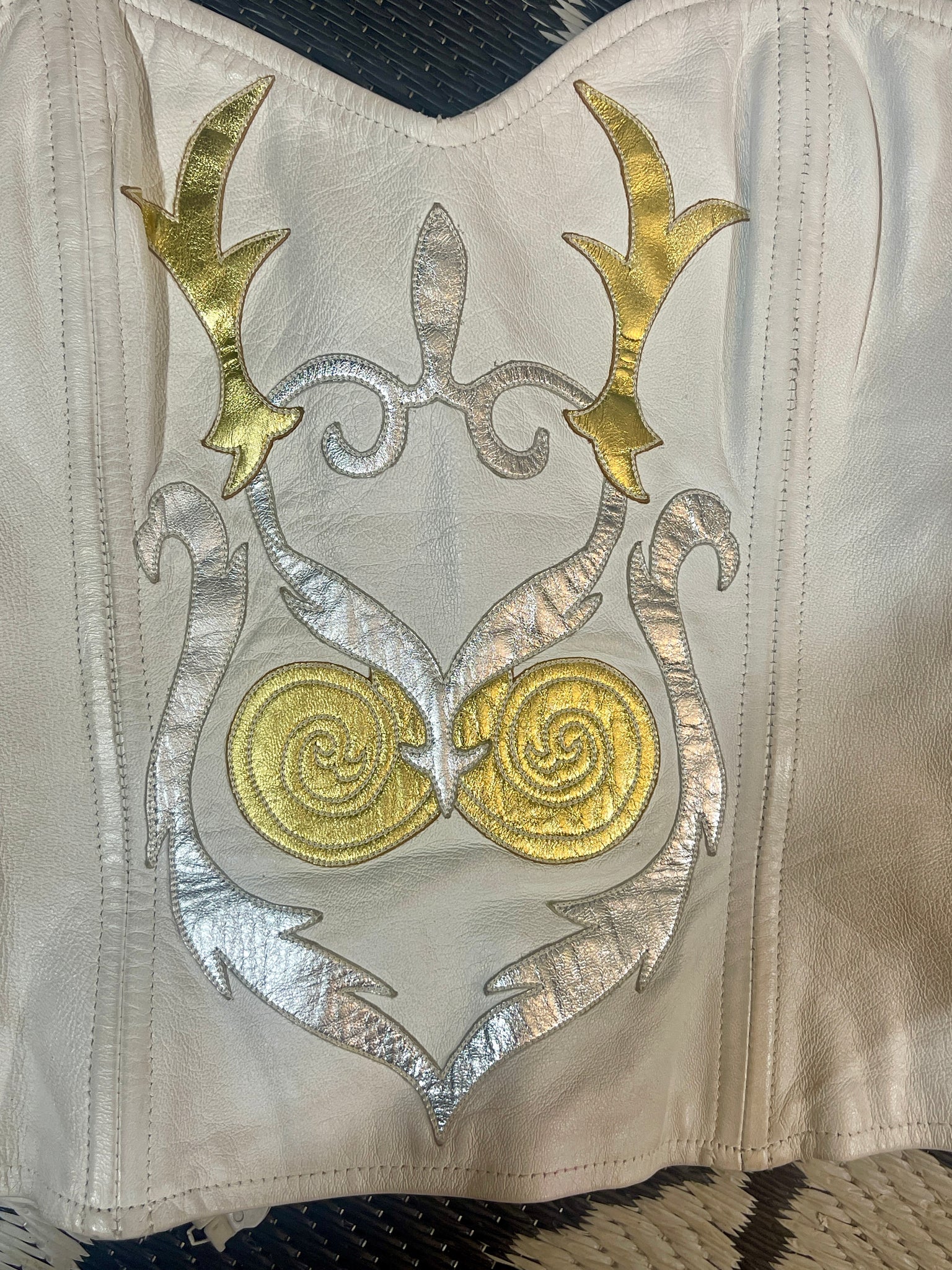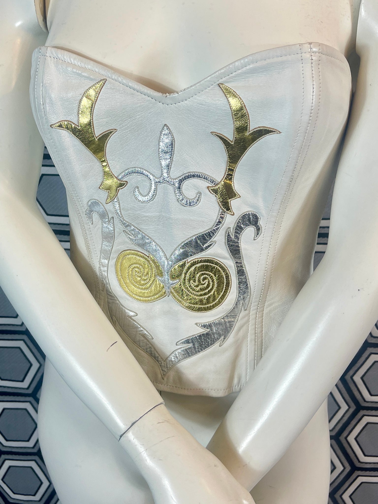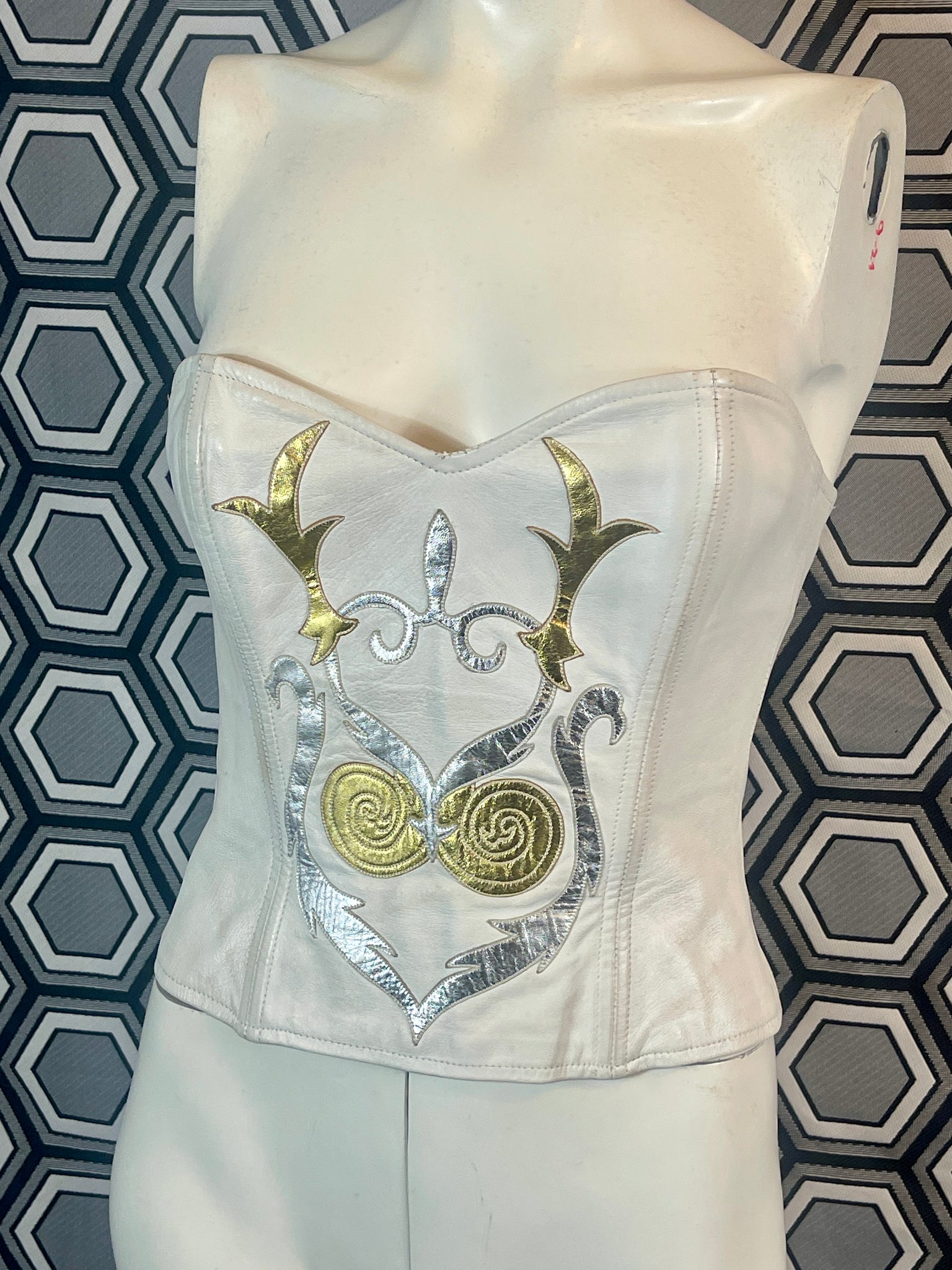 Superbe bustier en cuir Jean Claude Jitrois blanc avec des empiècements argentés et dorés.