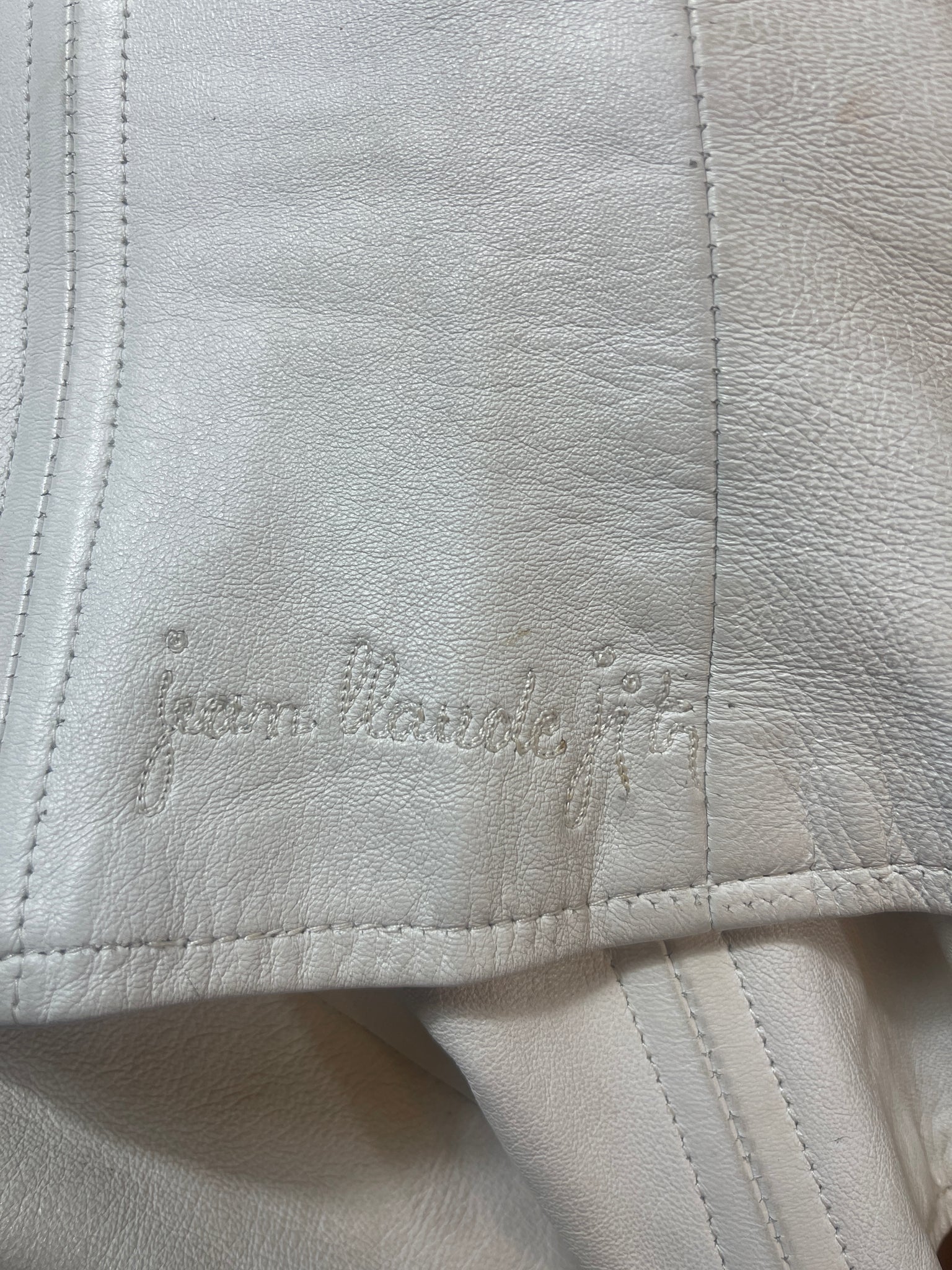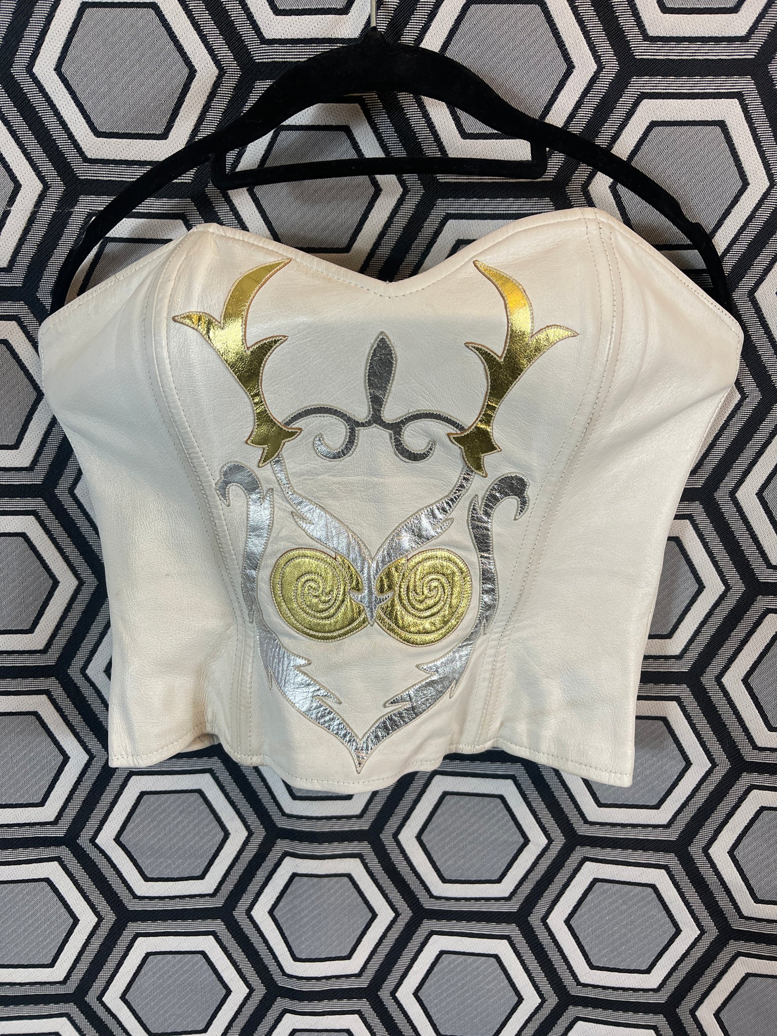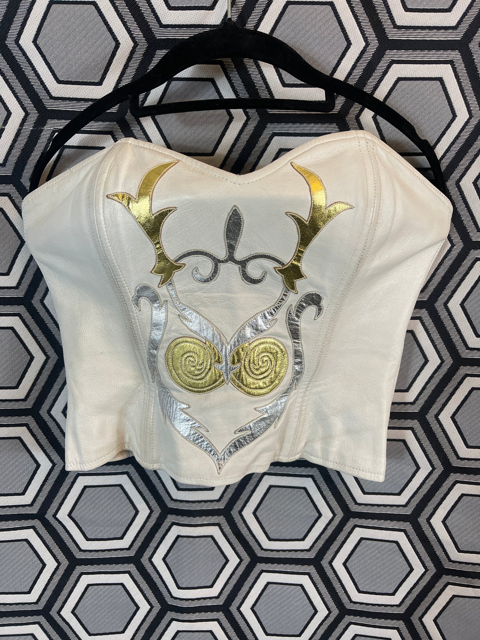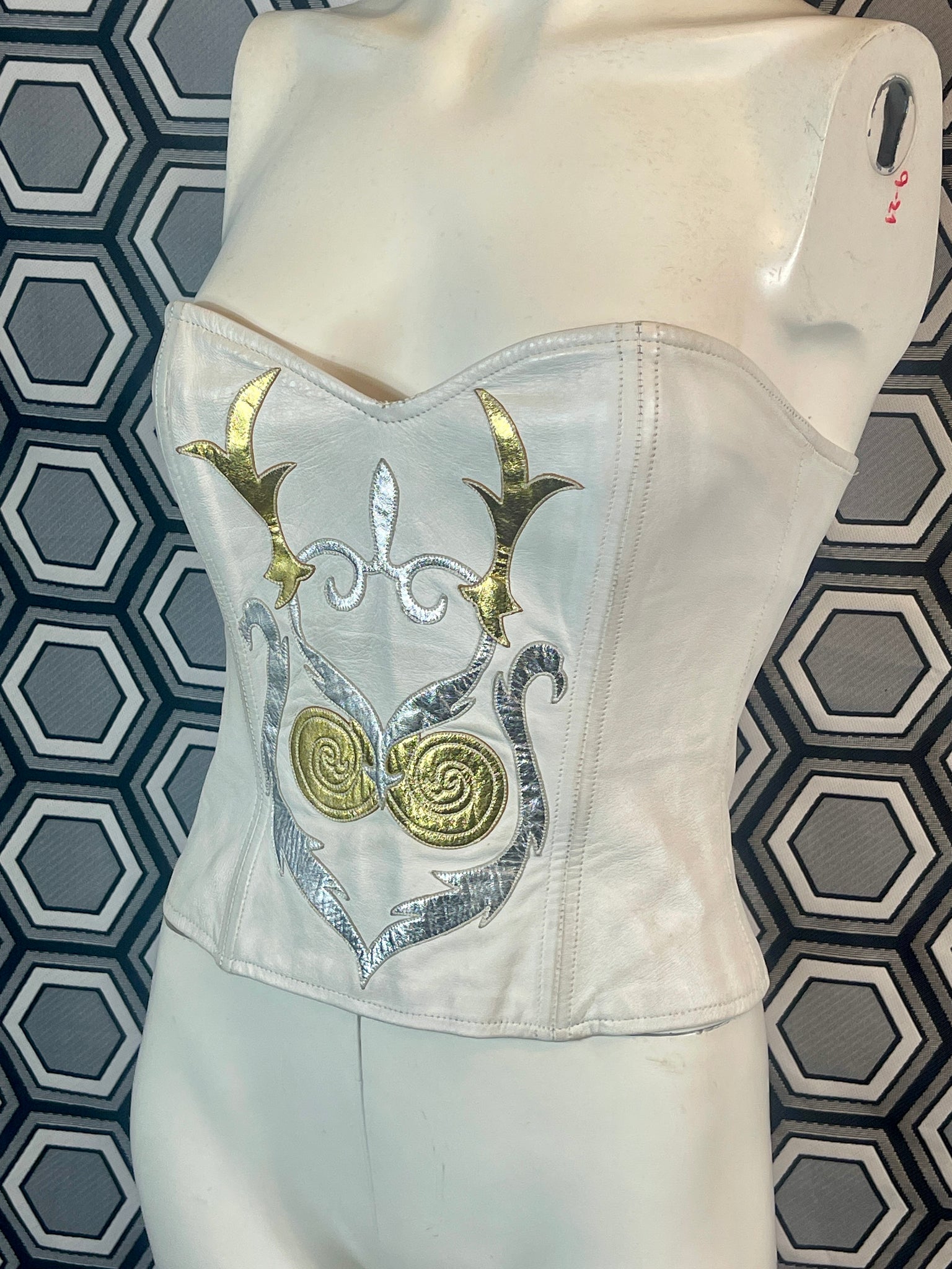 Superbe bustier en cuir Jean Claude Jitrois blanc avec des empiècements argentés et dorés.