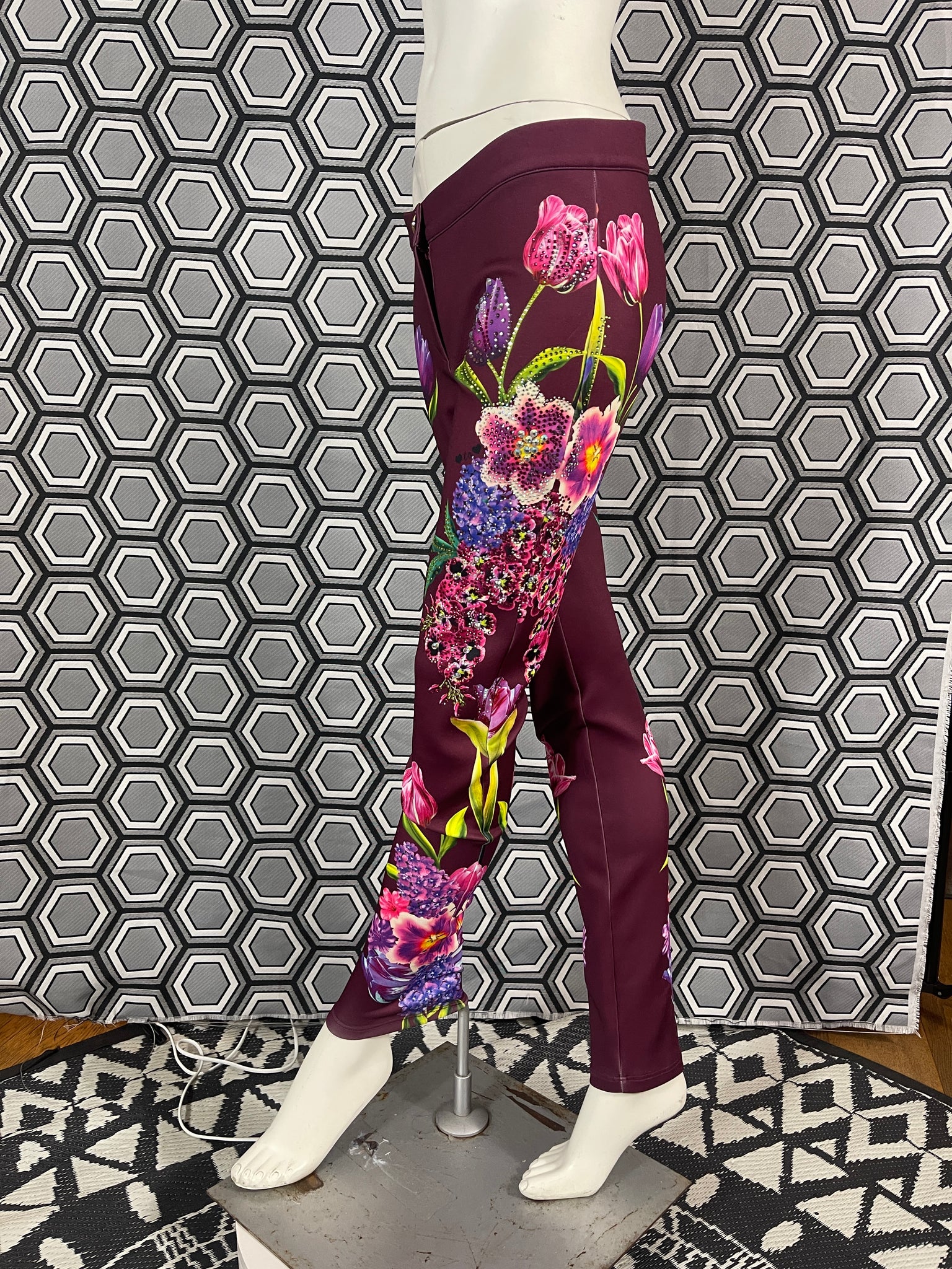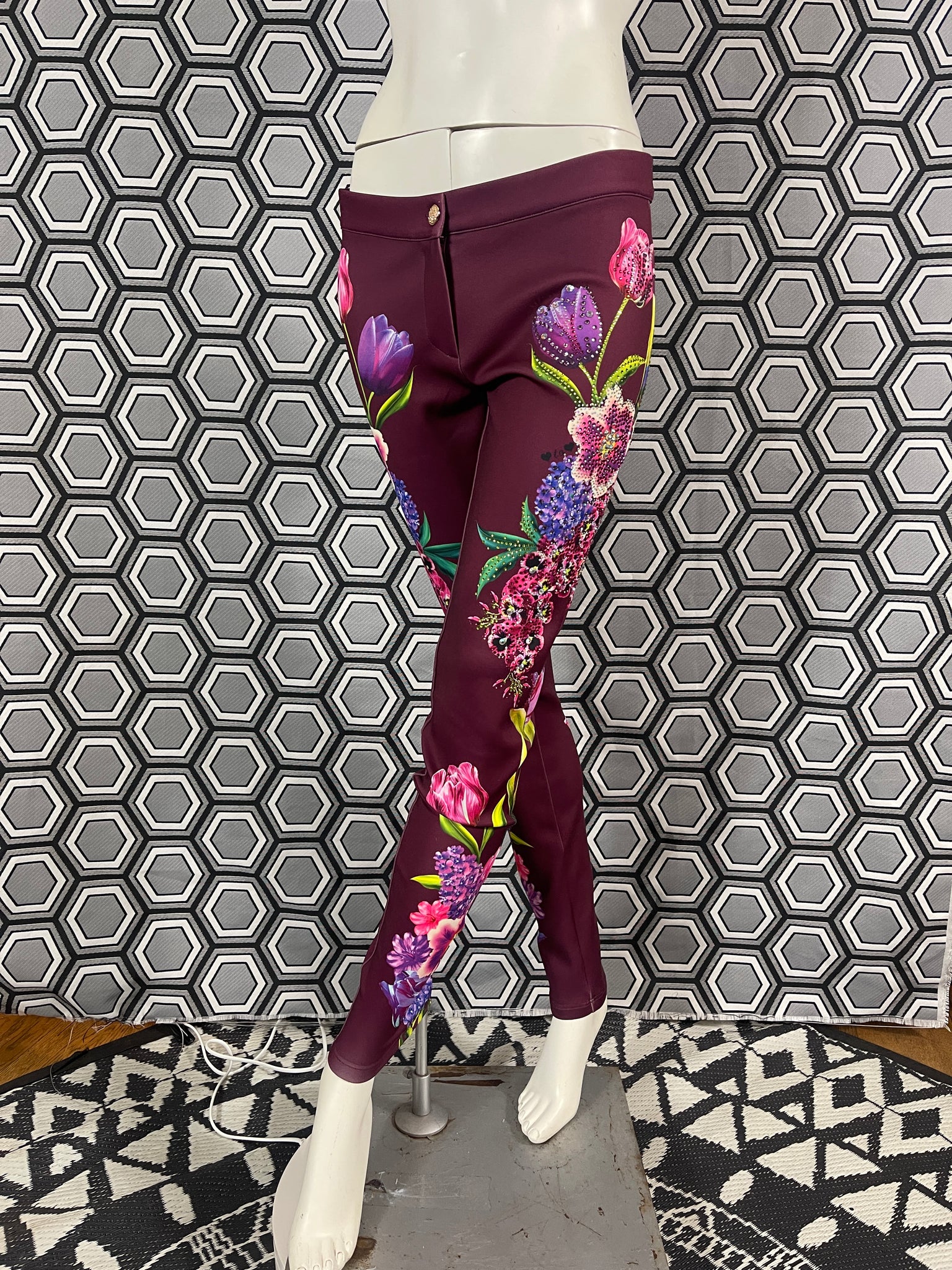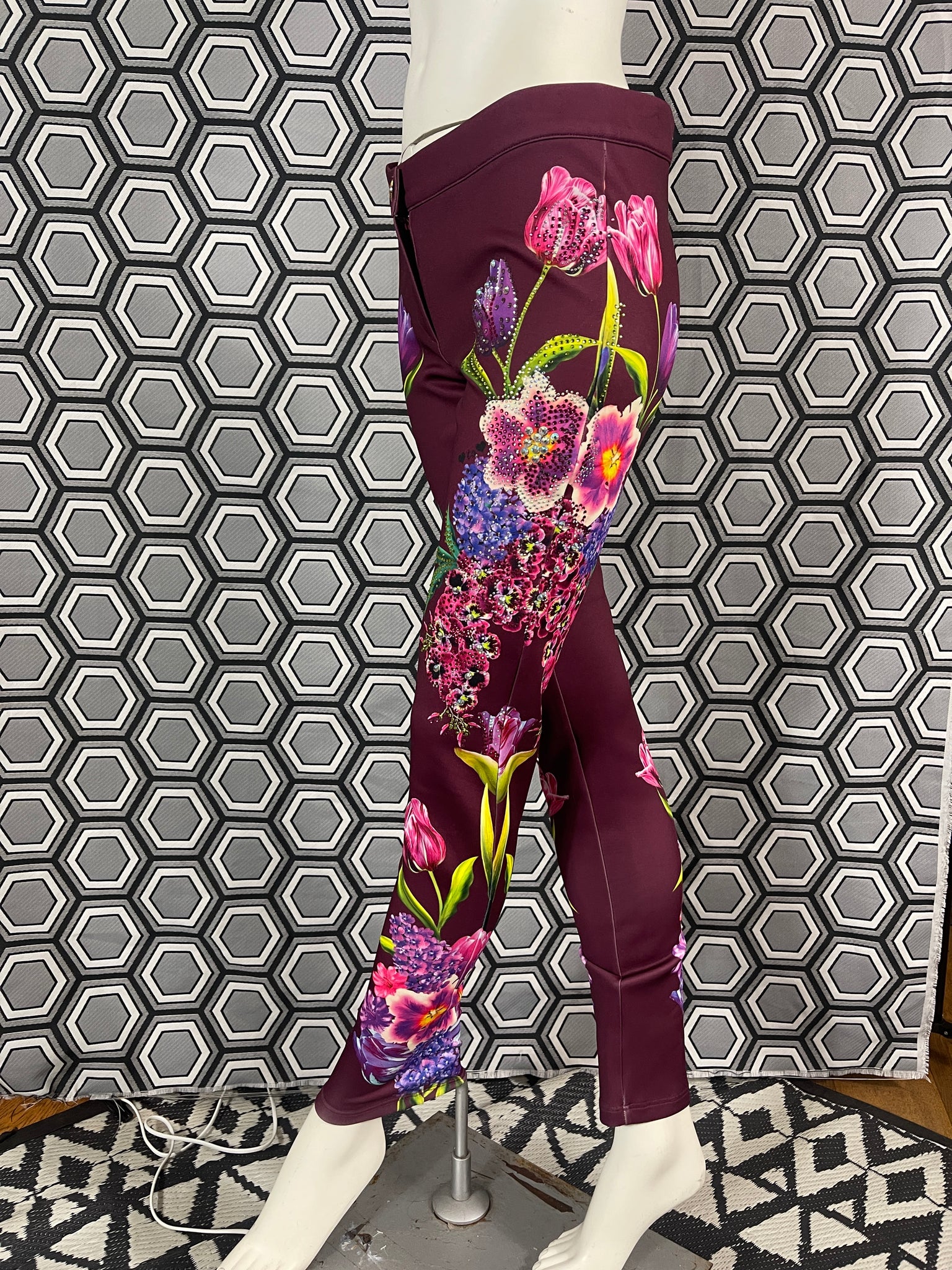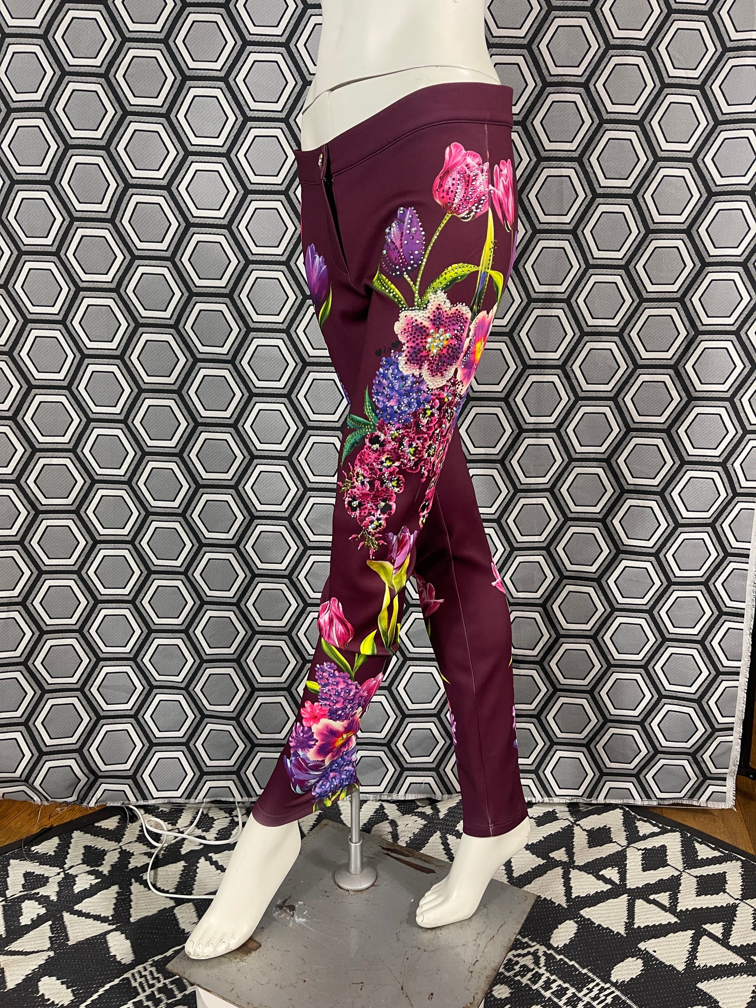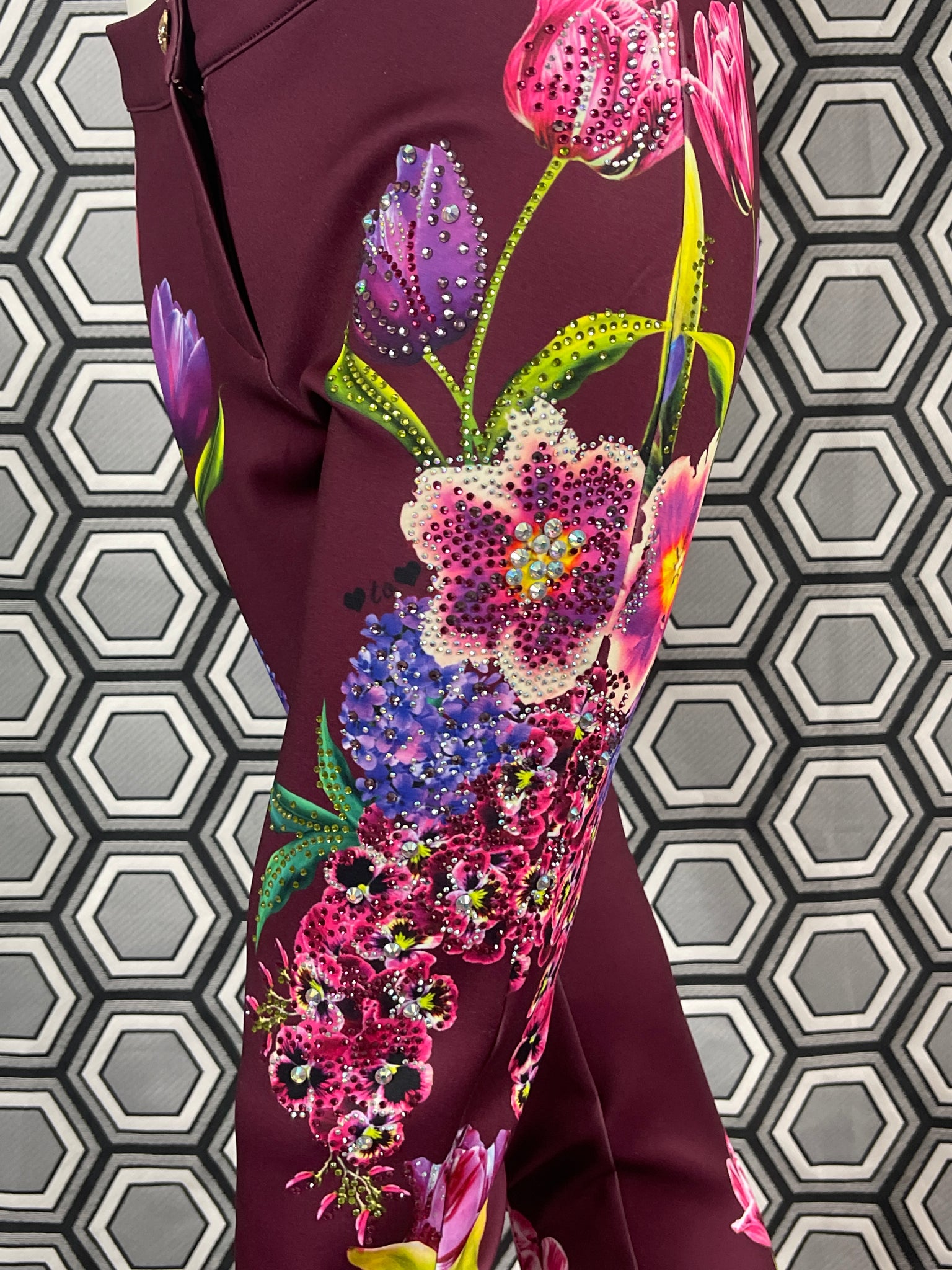 Magnifique pantalon Gai Mattiolo à décors de fleurs et de strass.