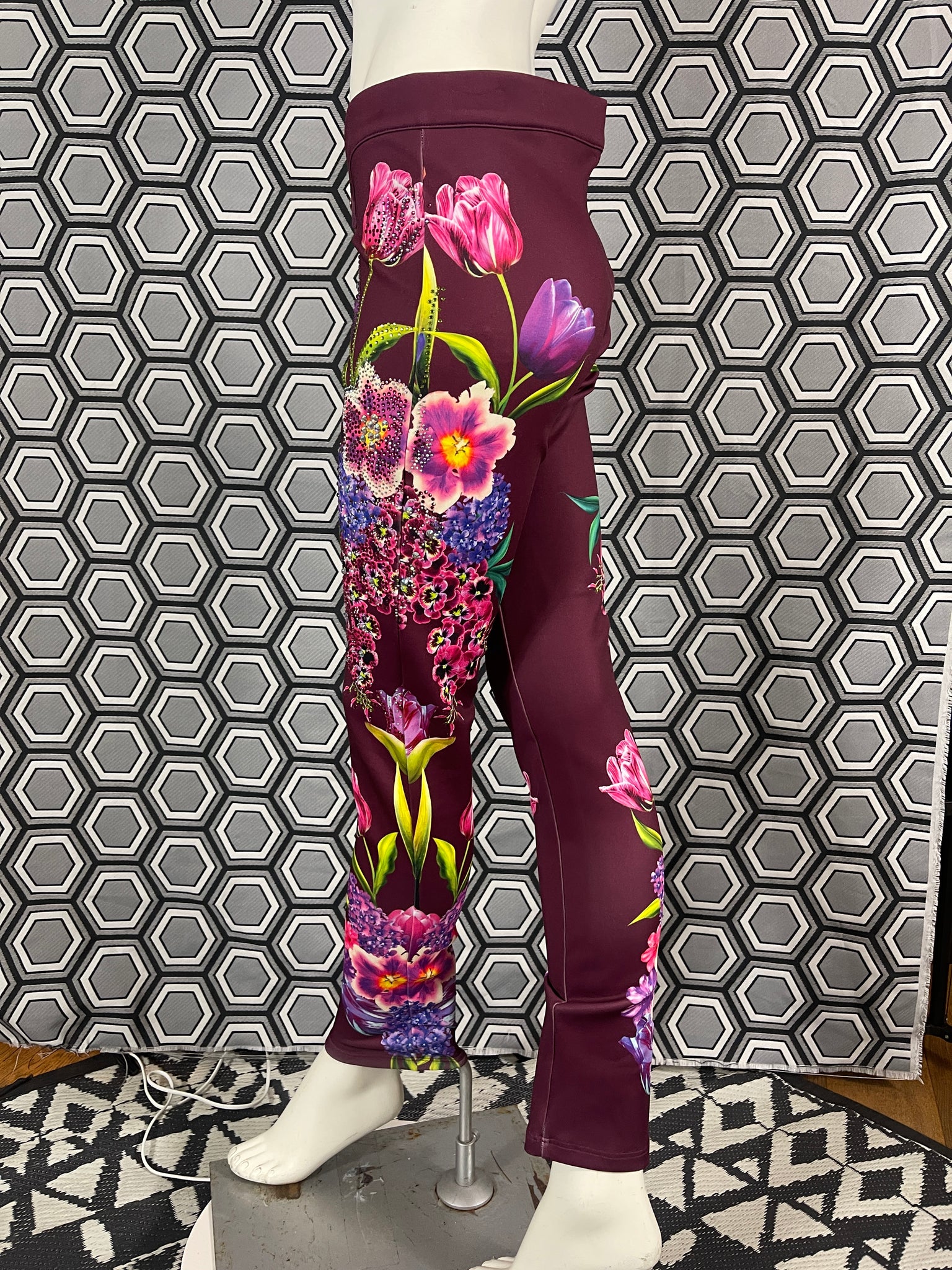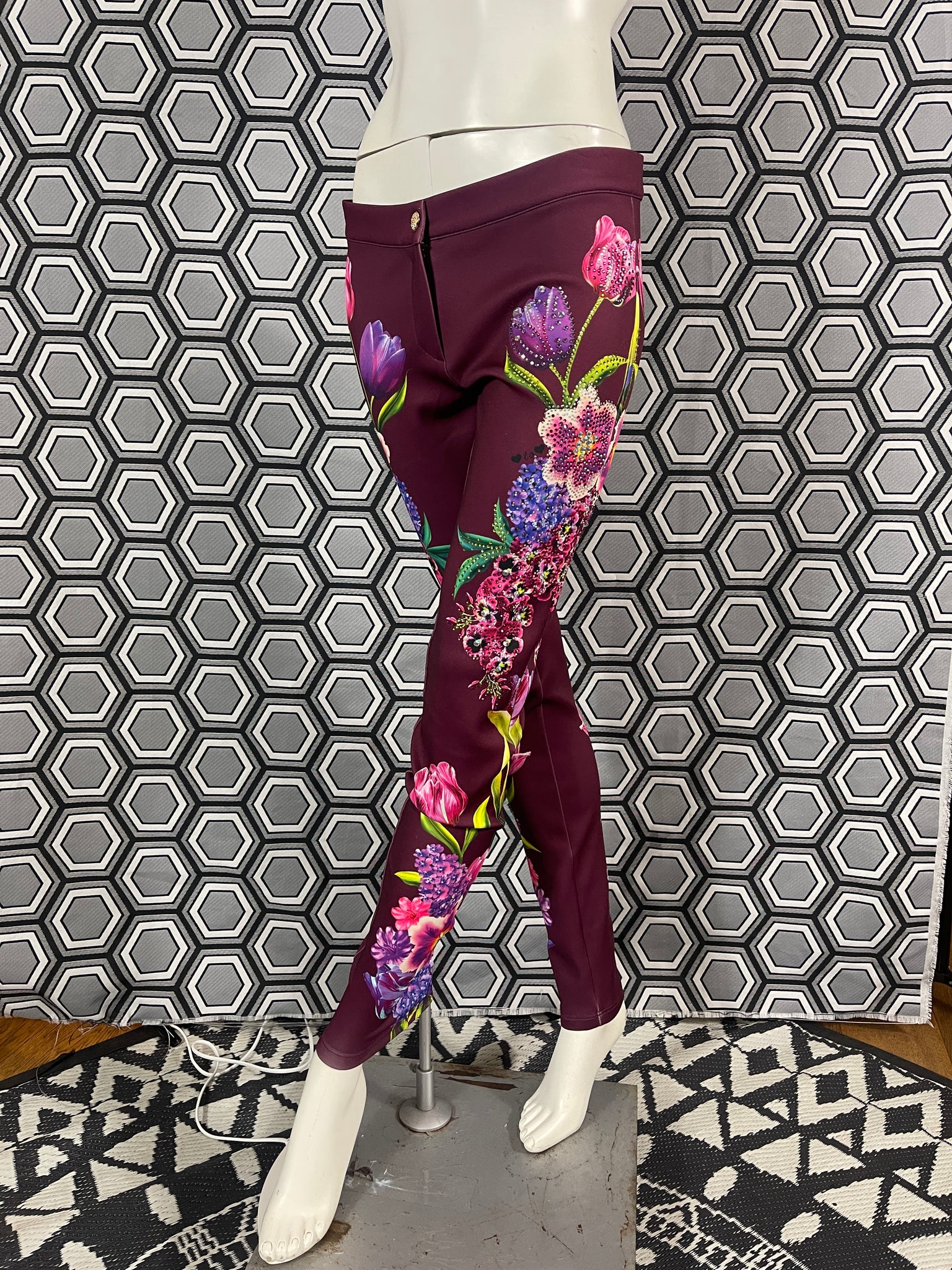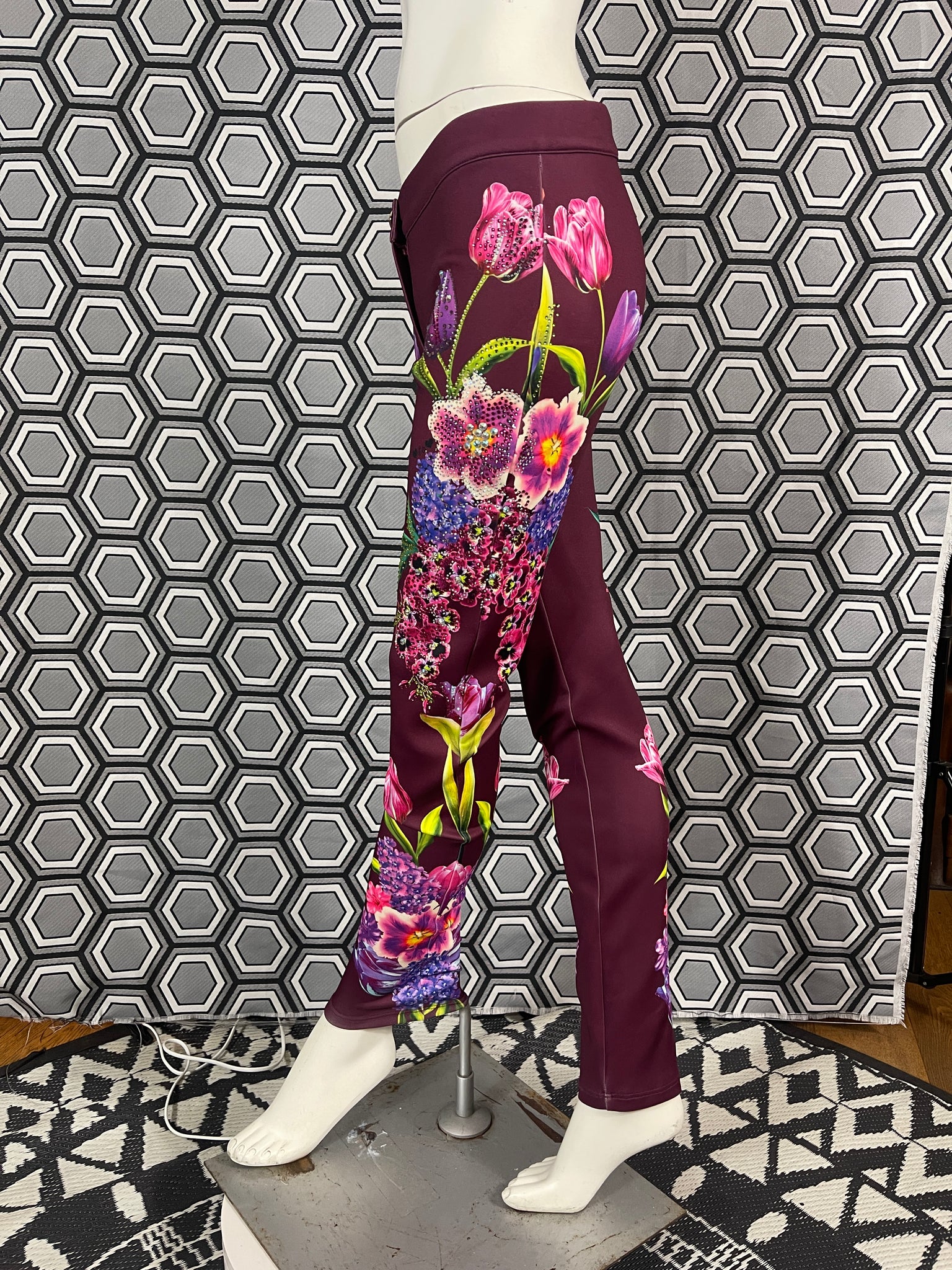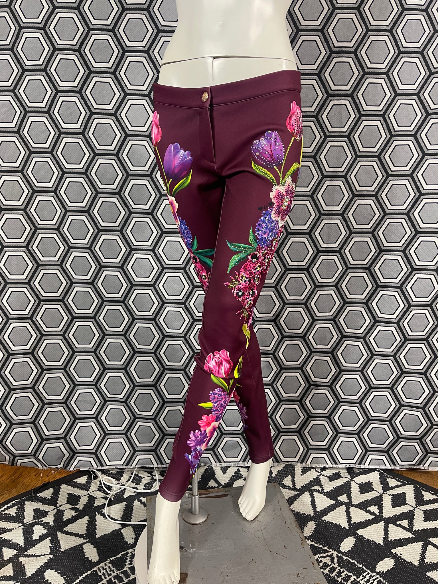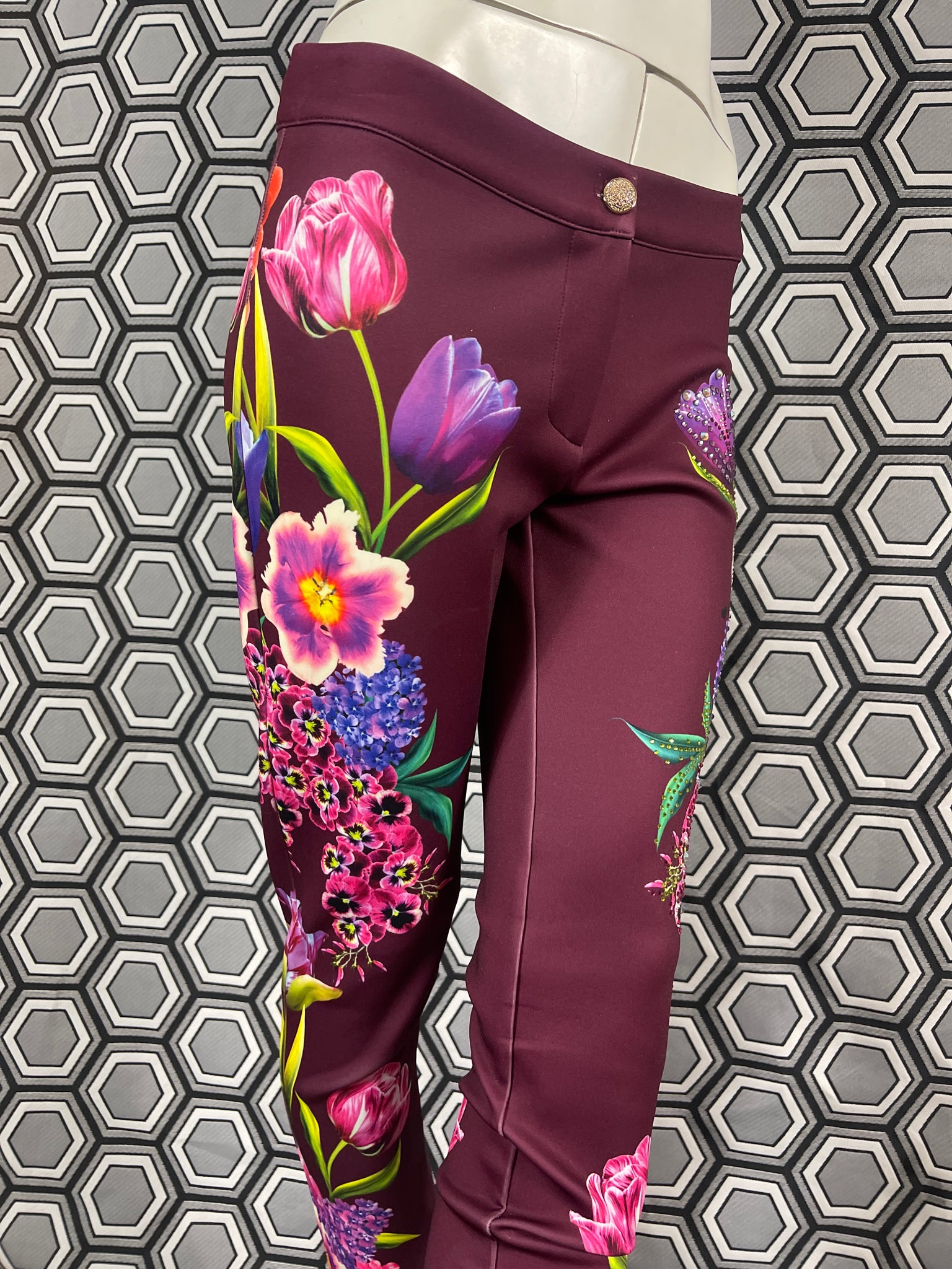 Magnifique pantalon Gai Mattiolo à décors de fleurs et de strass.