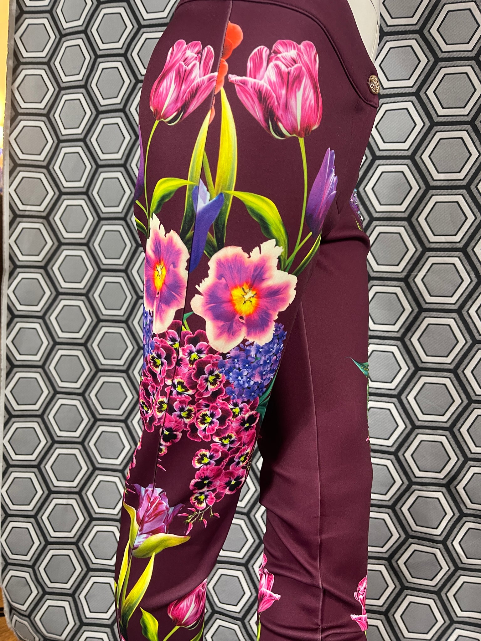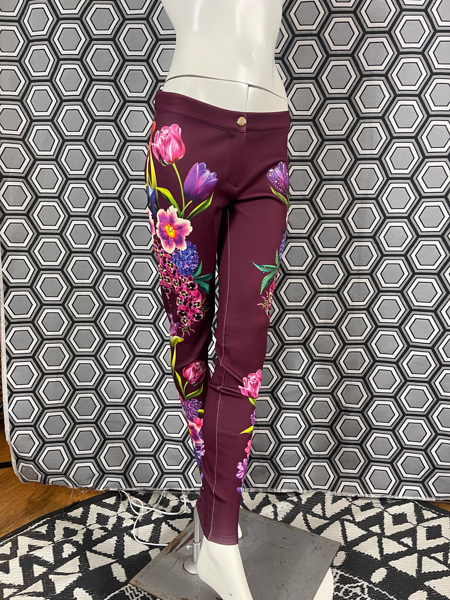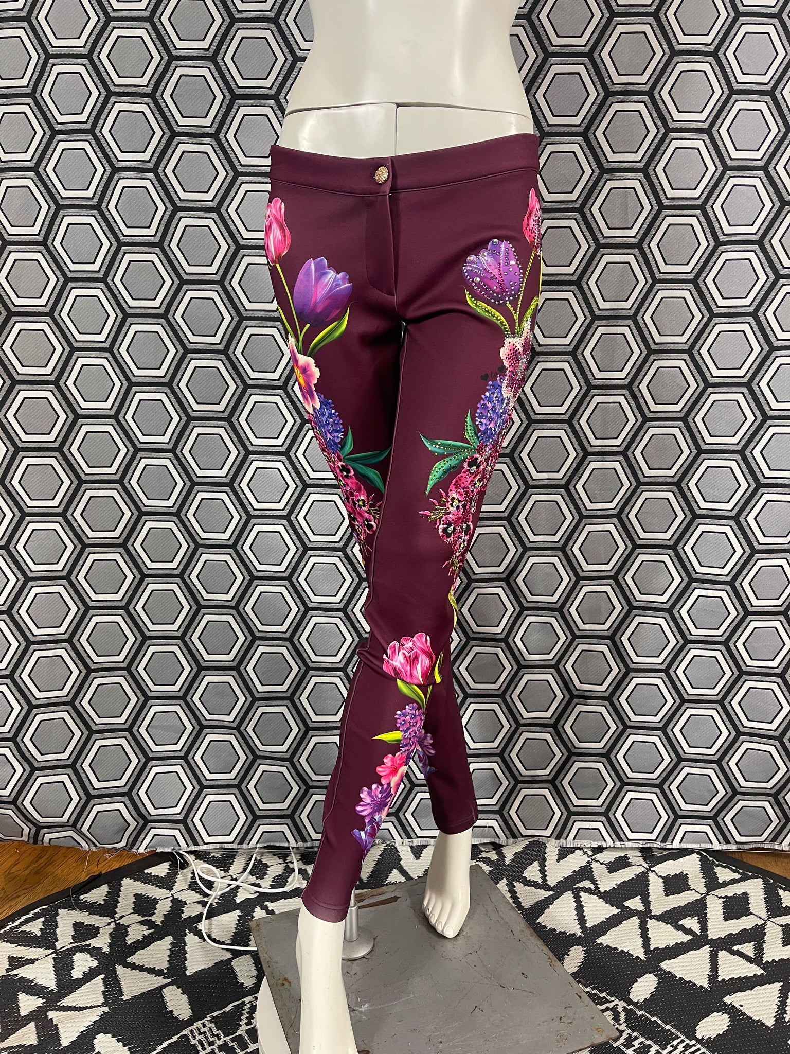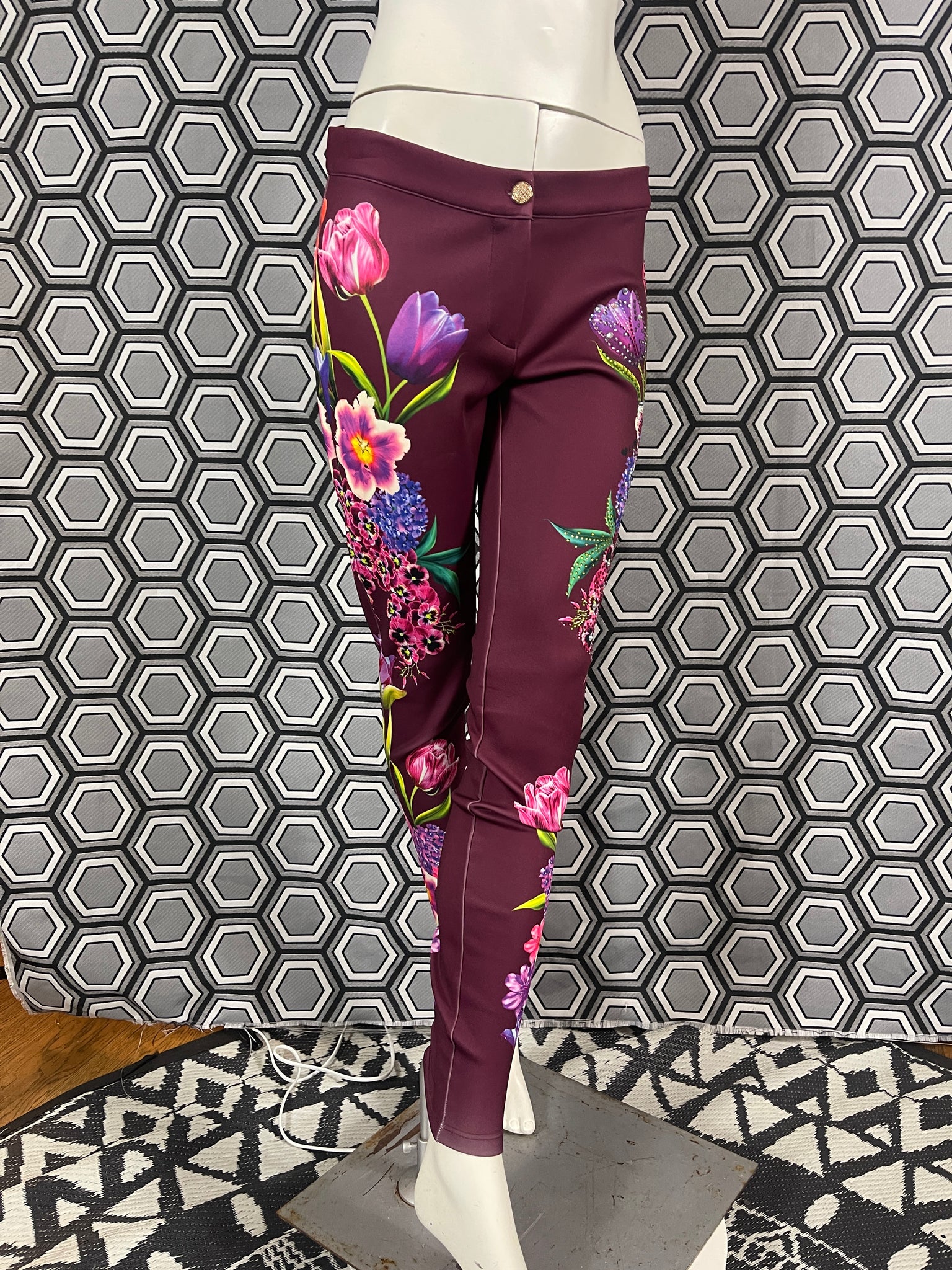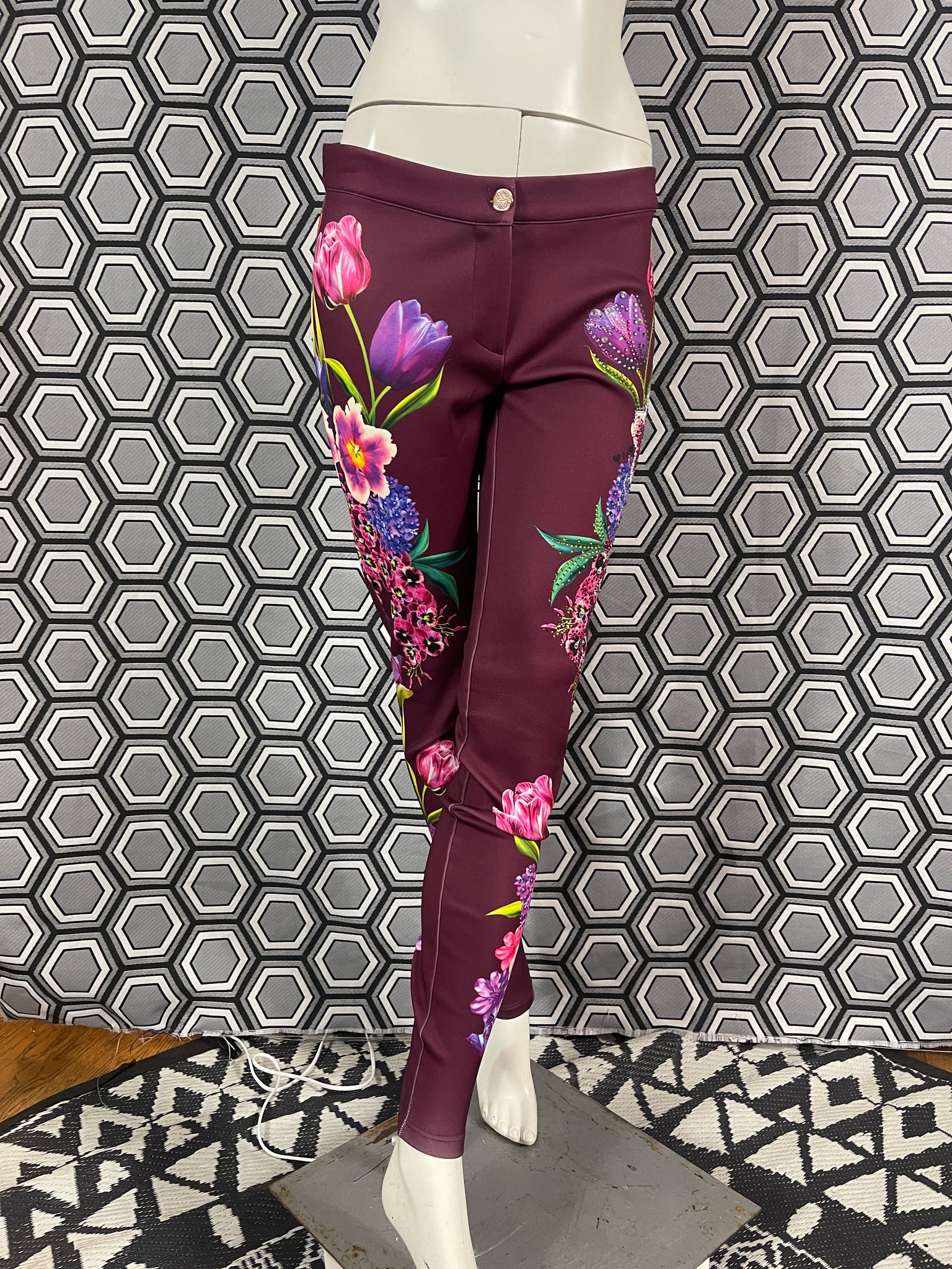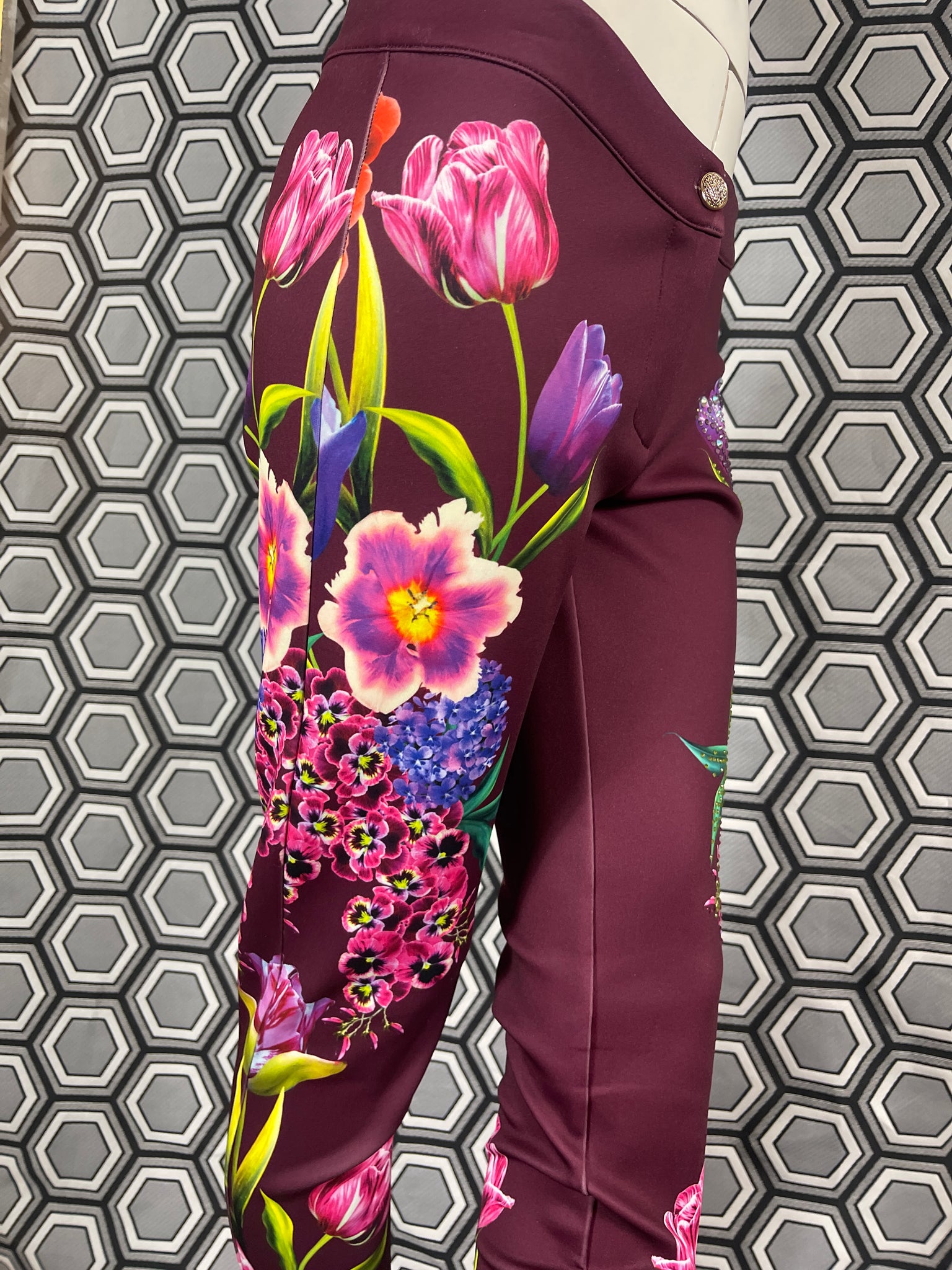 Magnifique pantalon Gai Mattiolo à décors de fleurs et de strass.