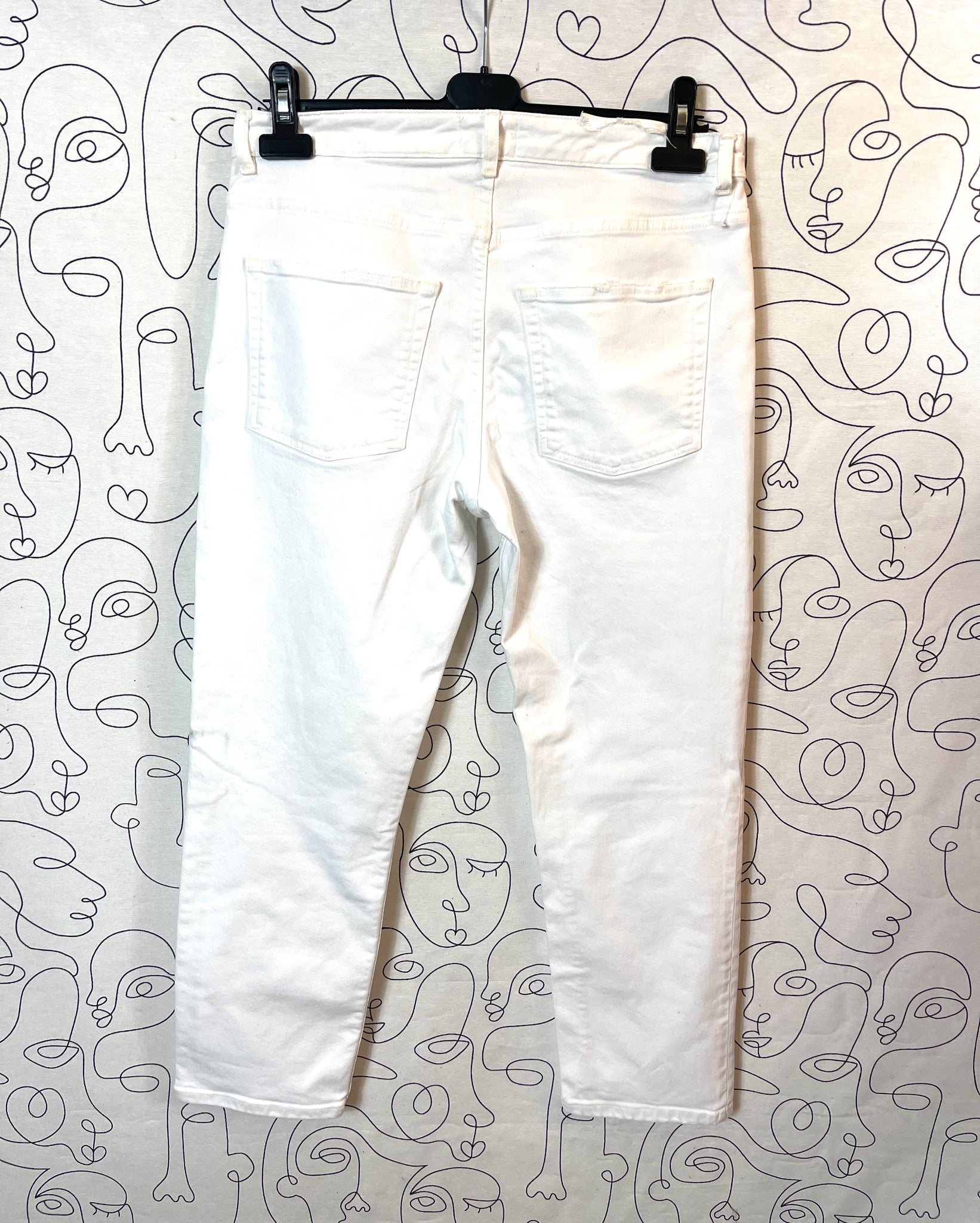 Mesures à plat : largeur taille 39 cms, largeur hanches 47 cms, hauteur fourche (de l’entrejambe à la taille à l’avant) 26 cms, longueur 88 cms et largeur bas de jambes 17 cms.