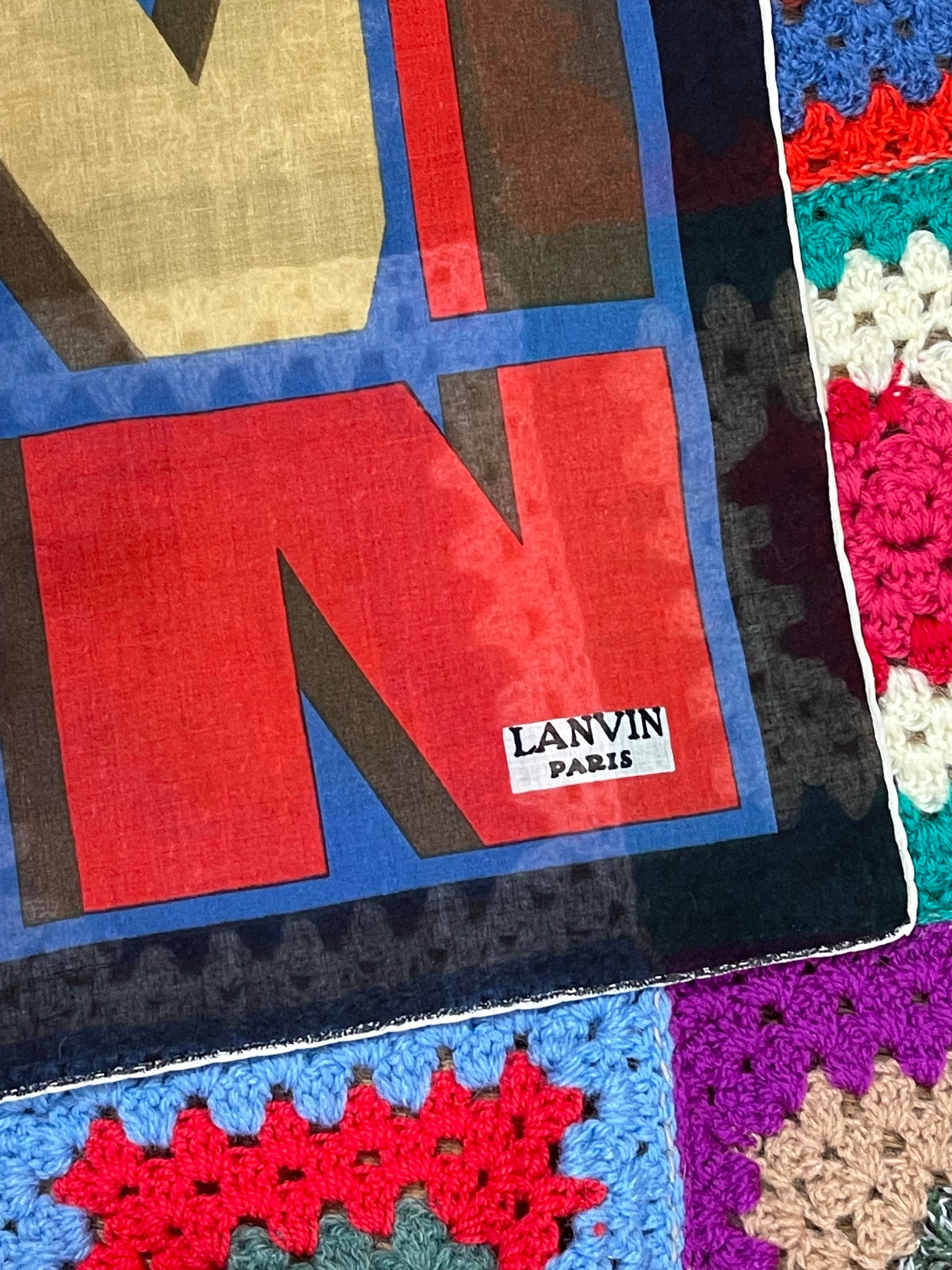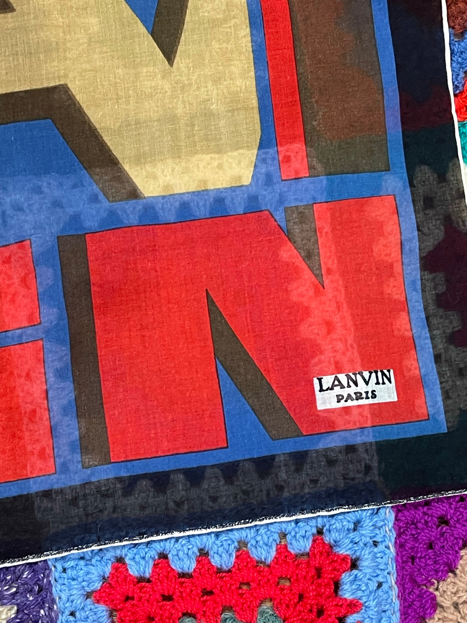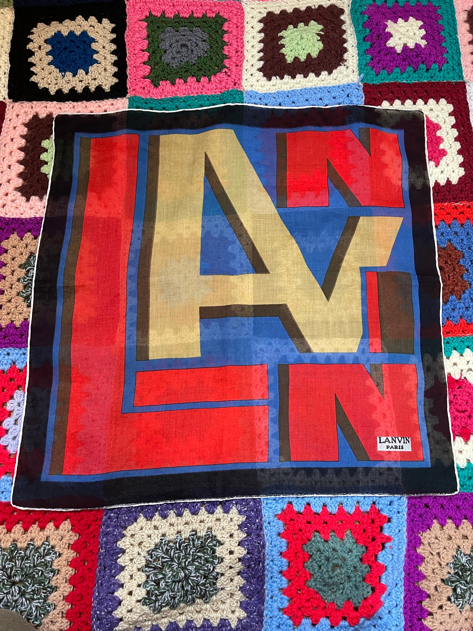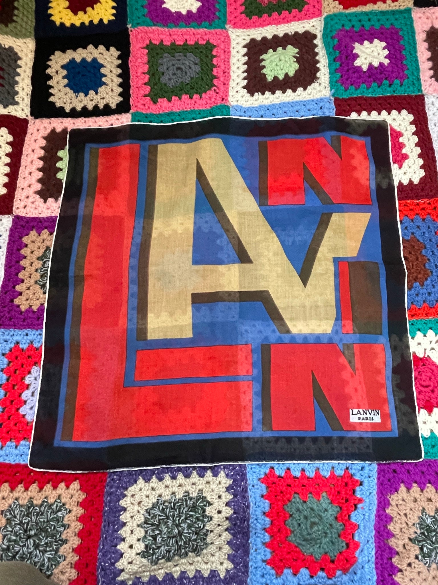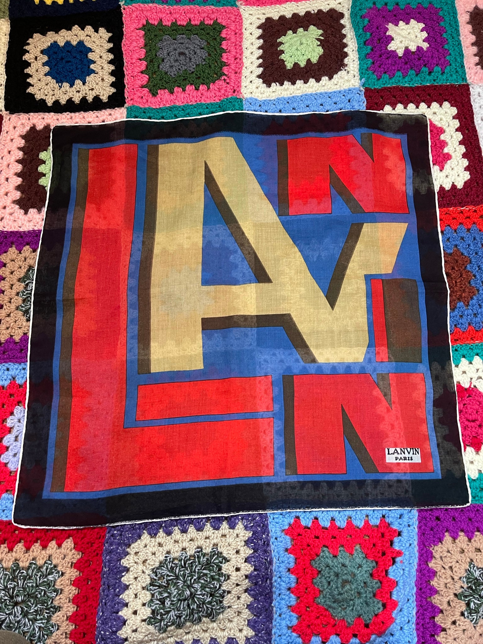 Joli petit carré Lanvin : largeur 50 cms. Pas d’étiquette de composition mais à priori coton.