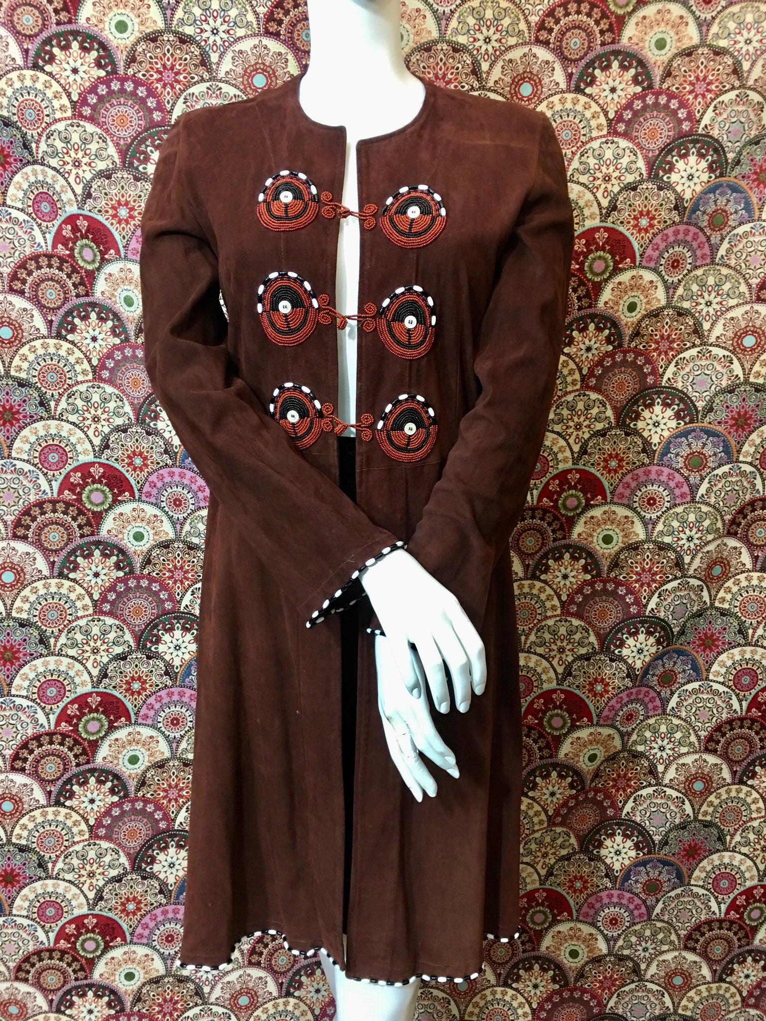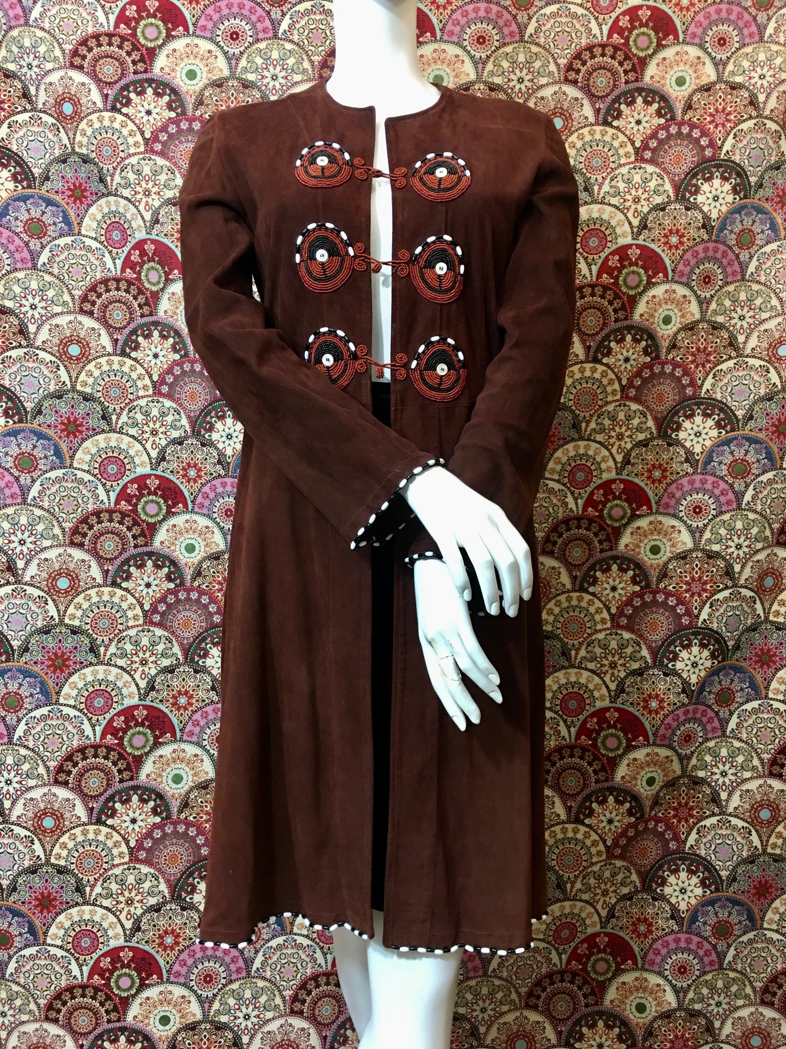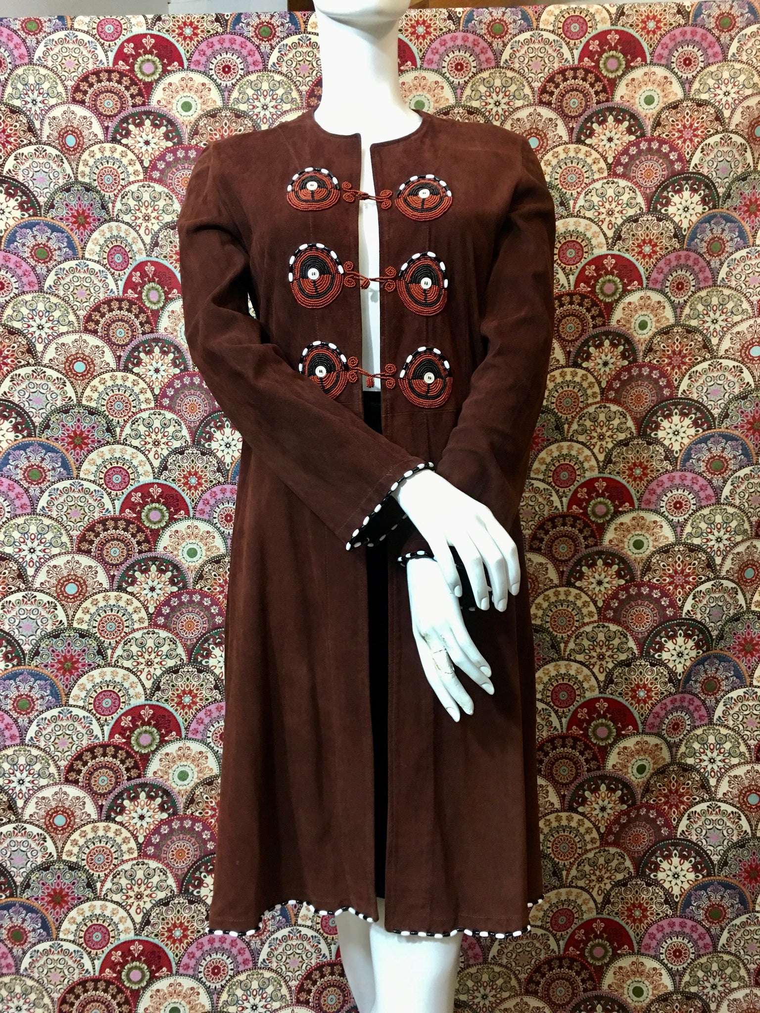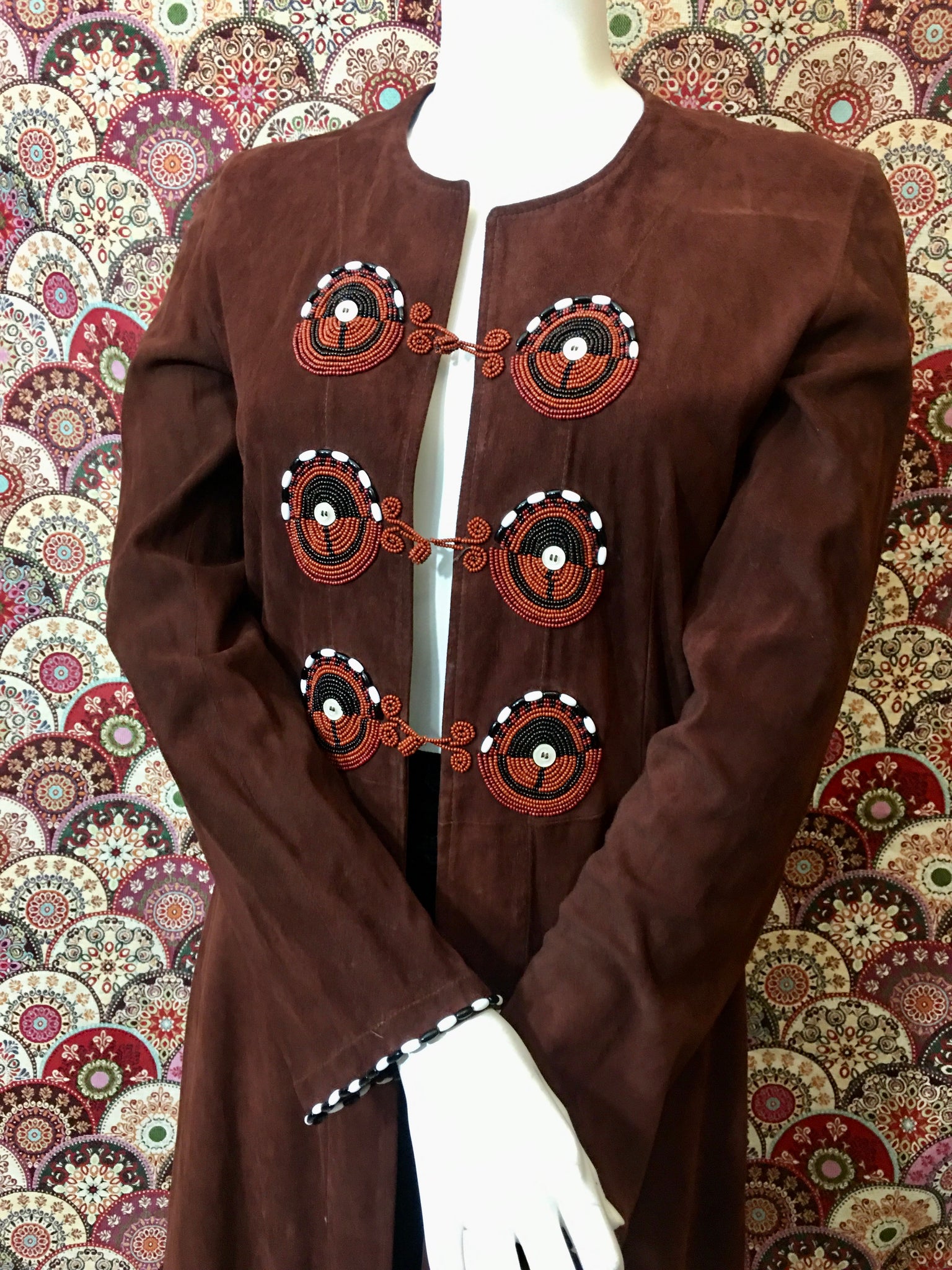 Introuvable !! Manteau de la créatrice Allemande Anna Trzebinski. Installée en Afrique à Nairobi, elle a crée sa marque il y a 30 ans. Elle privilégie l’artisanat Africain faisant de ses vêtements des pièces d’exception. Après avoir vendu ses vêtements chez Barneys et Colette, elle refusera d’augmenter le volume de ses collections au détriment de la qualité. Désormais, elle ne vend plus ses vêtements que lors de ventes privées auprès d’une clientèle privilégiée en France et aux Etats-Unis. Le manteau est en daim et en très bon état. Il manque juste deux perles. Mesures à plat : largeur épaules 39 cms, largeur sous aisselles 48 cms, largeur taille 42 cms et longueur 97 cms.
