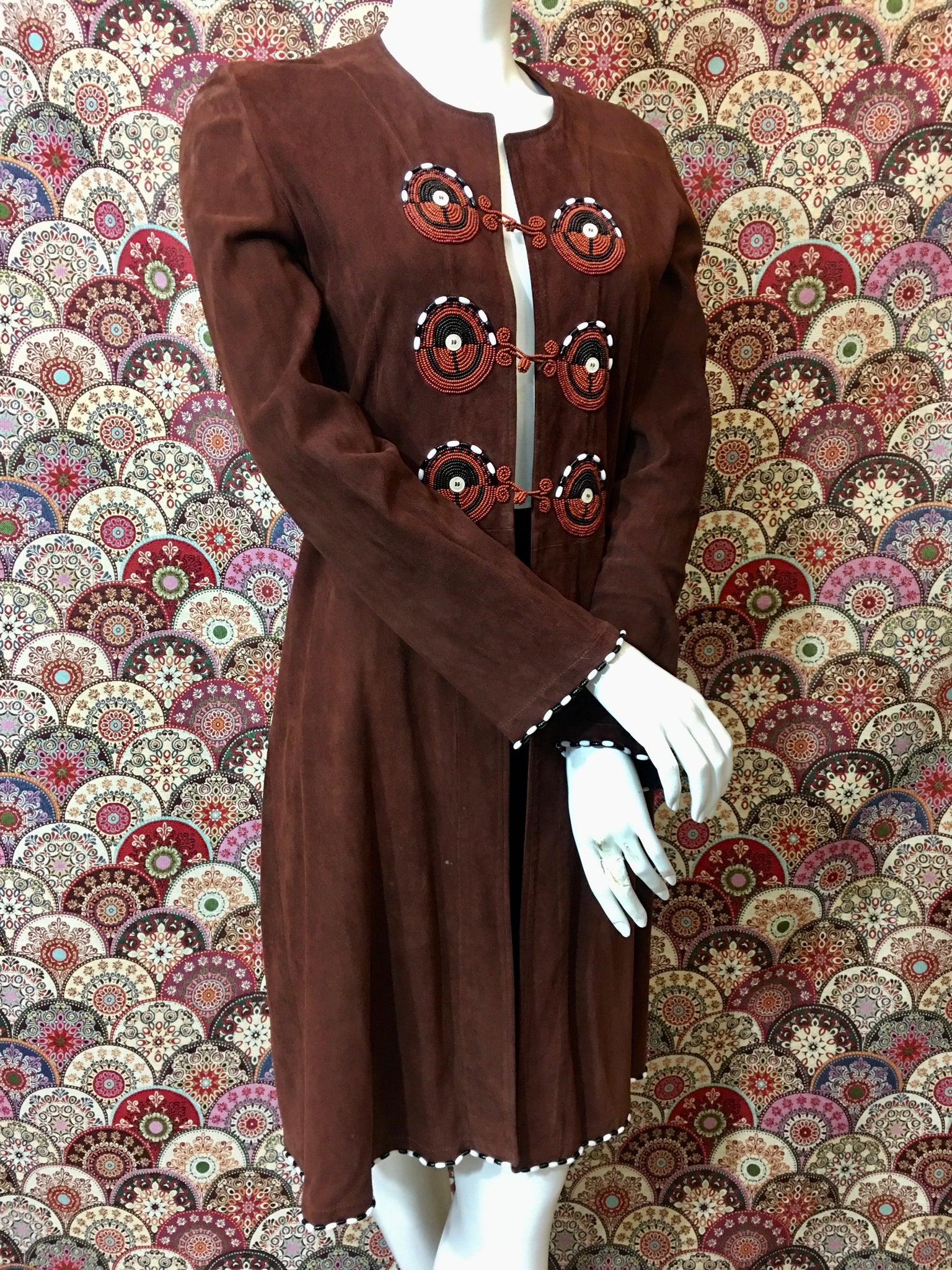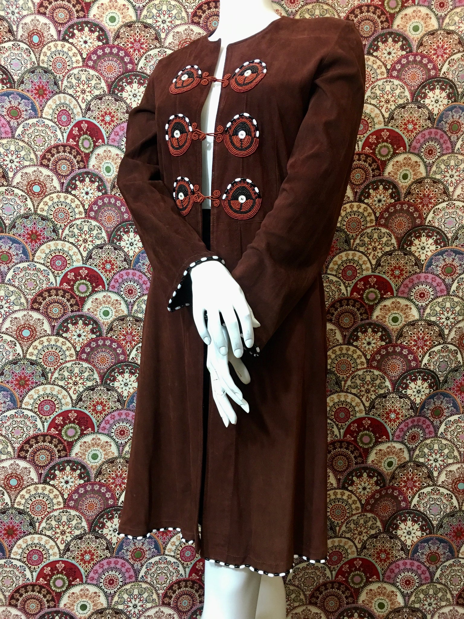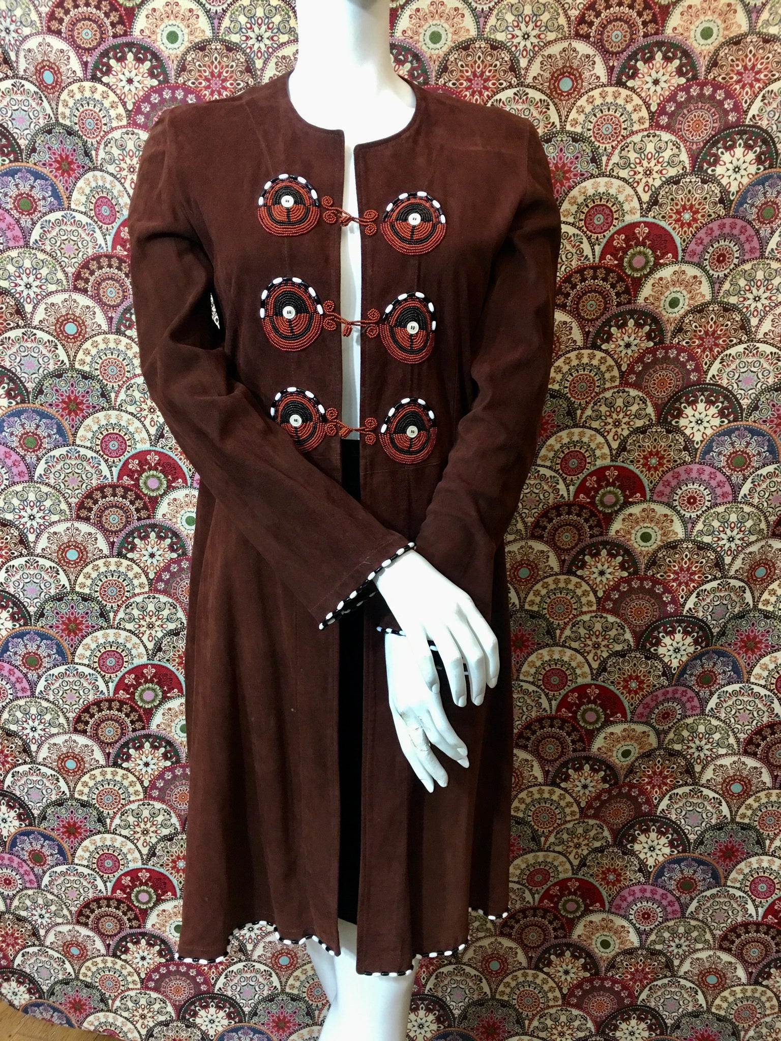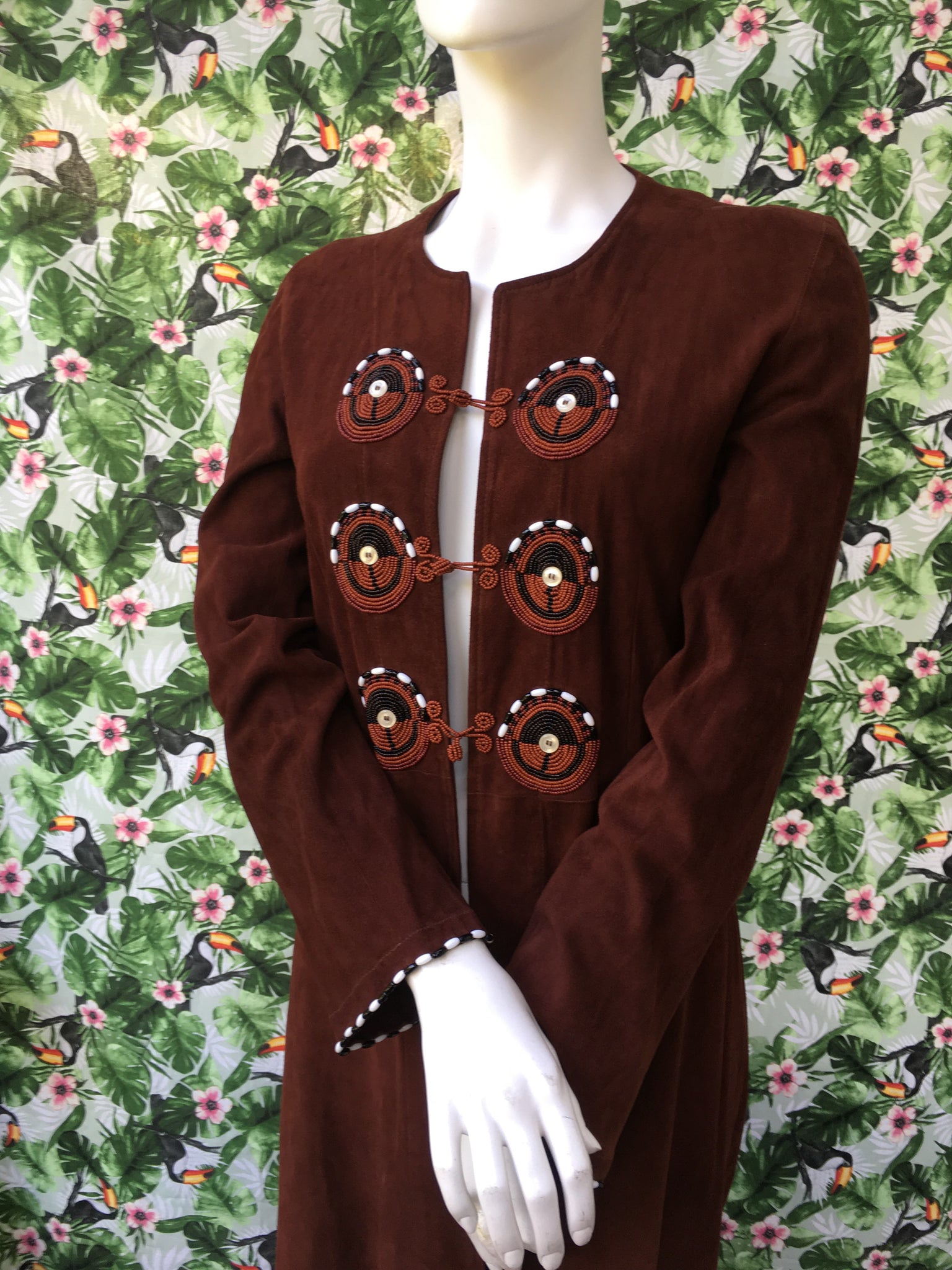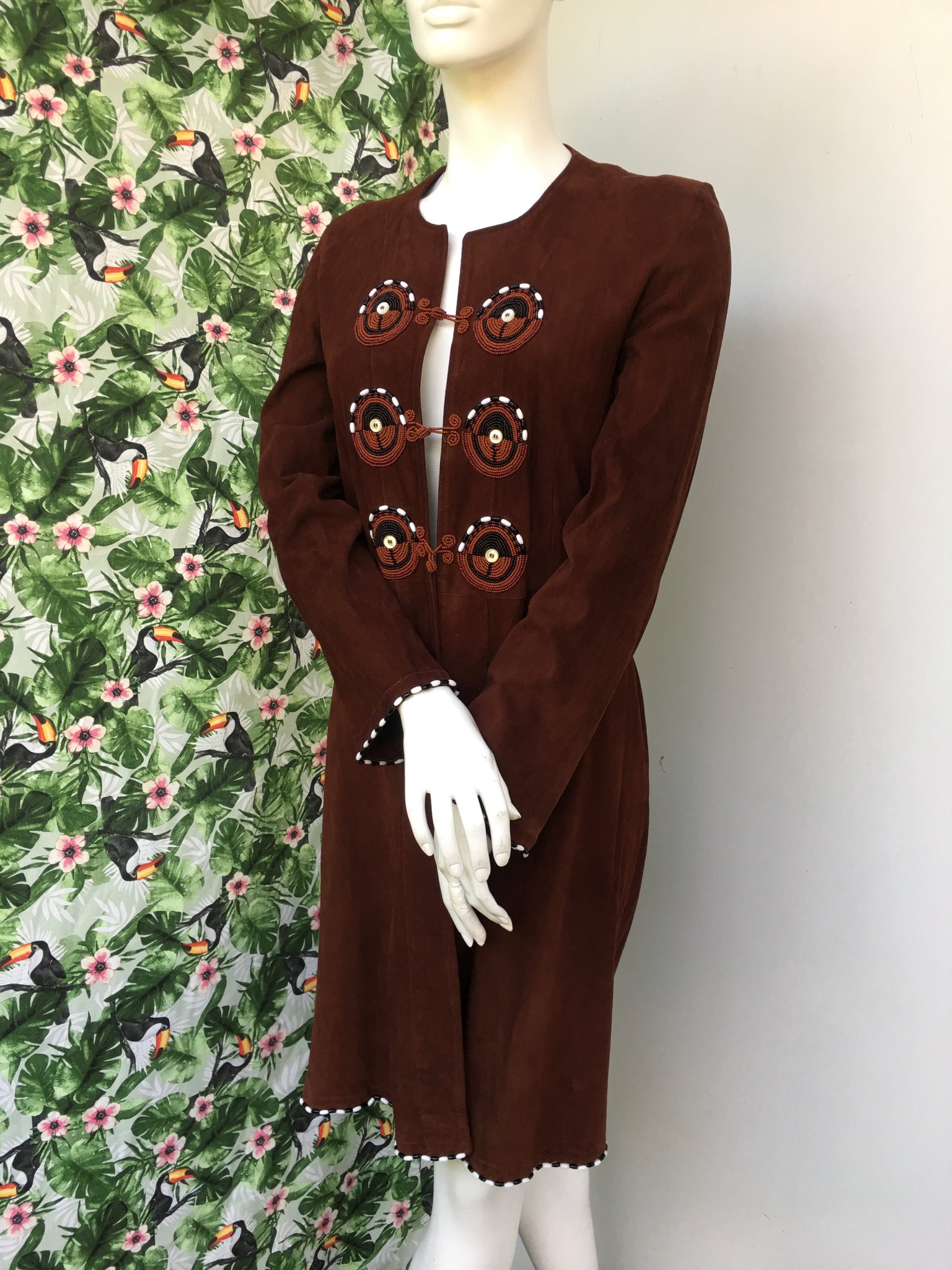 Introuvable !! Manteau de la créatrice Allemande Anna Trzebinski. Installée en Afrique à Nairobi, elle a crée sa marque il y a 30 ans. Elle privilégie l’artisanat Africain faisant de ses vêtements des pièces d’exception. Après avoir vendu ses vêtements chez Barneys et Colette, elle refusera d’augmenter le volume de ses collections au détriment de la qualité. Désormais, elle ne vend plus ses vêtements que lors de ventes privées auprès d’une clientèle privilégiée en France et aux Etats-Unis. Le manteau est en daim et en très bon état. Il manque juste deux perles. Mesures à plat : largeur épaules 39 cms, largeur sous aisselles 48 cms, largeur taille 42 cms et longueur 97 cms.