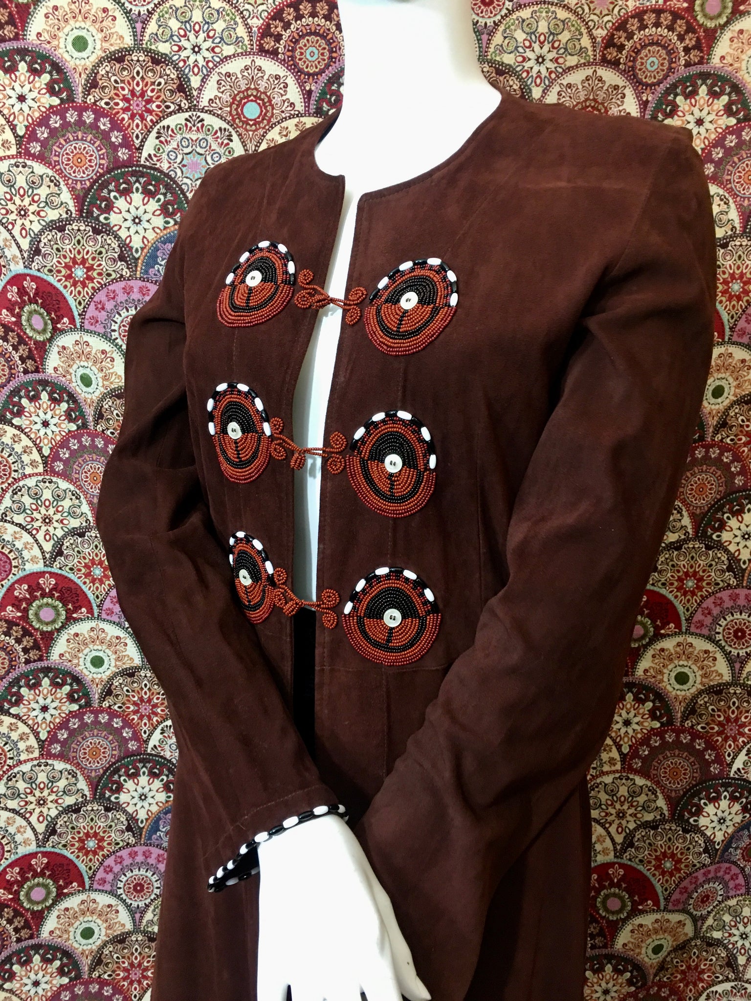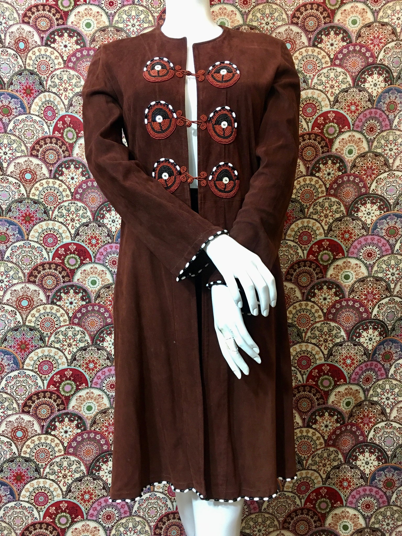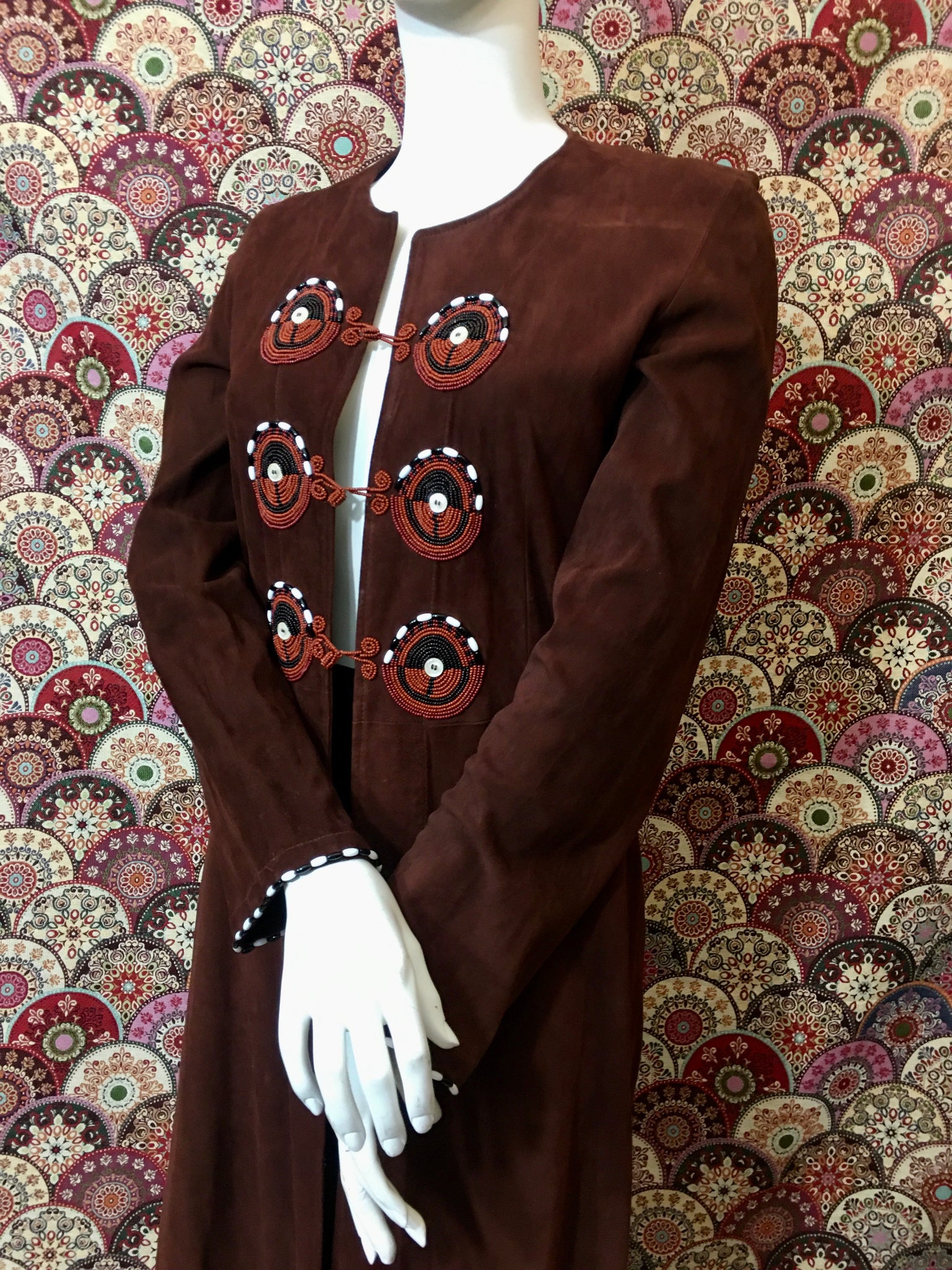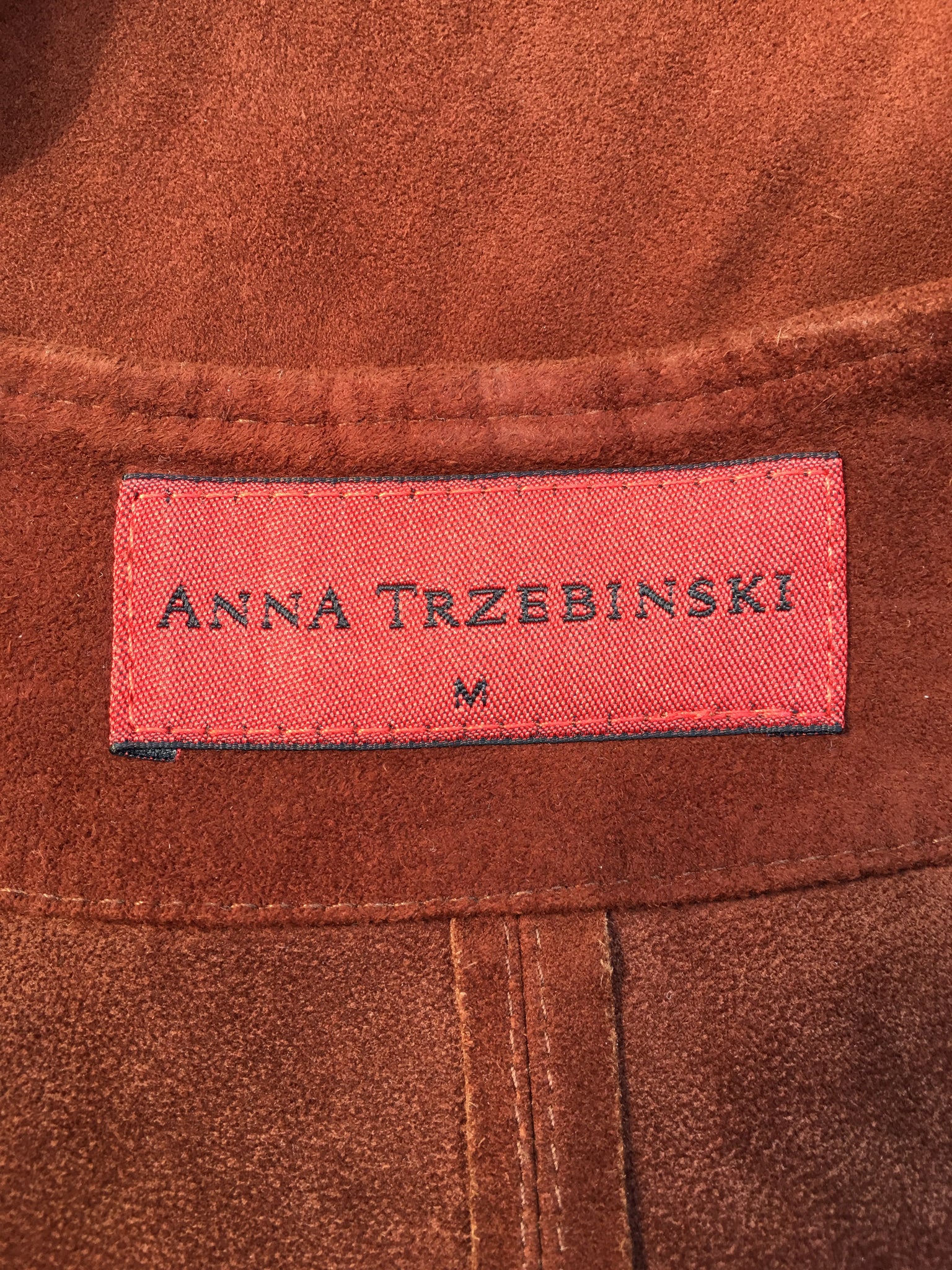 Introuvable !! Manteau de la créatrice Allemande Anna Trzebinski. Installée en Afrique à Nairobi, elle a crée sa marque il y a 30 ans. Elle privilégie l’artisanat Africain faisant de ses vêtements des pièces d’exception. Après avoir vendu ses vêtements chez Barneys et Colette, elle refusera d’augmenter le volume de ses collections au détriment de la qualité. Désormais, elle ne vend plus ses vêtements que lors de ventes privées auprès d’une clientèle privilégiée en France et aux Etats-Unis. Le manteau est en daim et en très bon état. Il manque juste deux perles. Mesures à plat : largeur épaules 39 cms, largeur sous aisselles 48 cms, largeur taille 42 cms et longueur 97 cms.