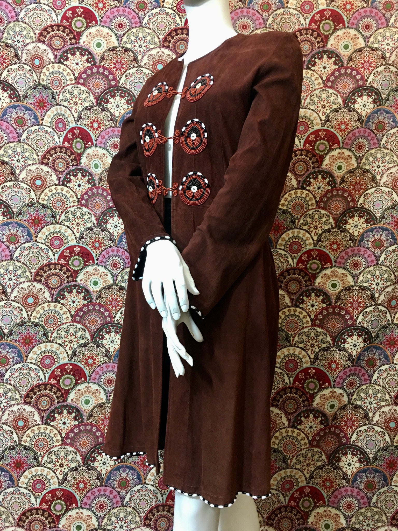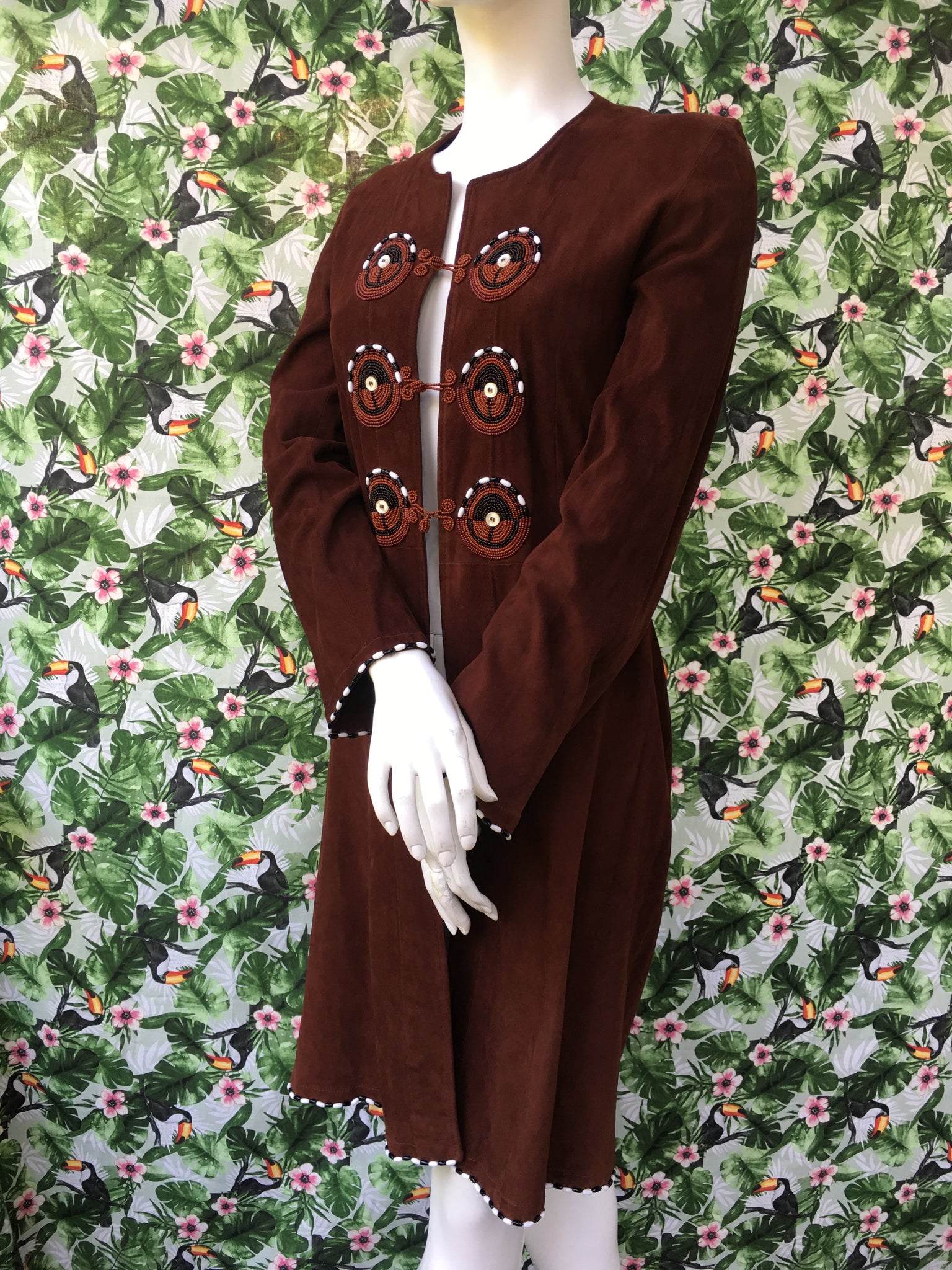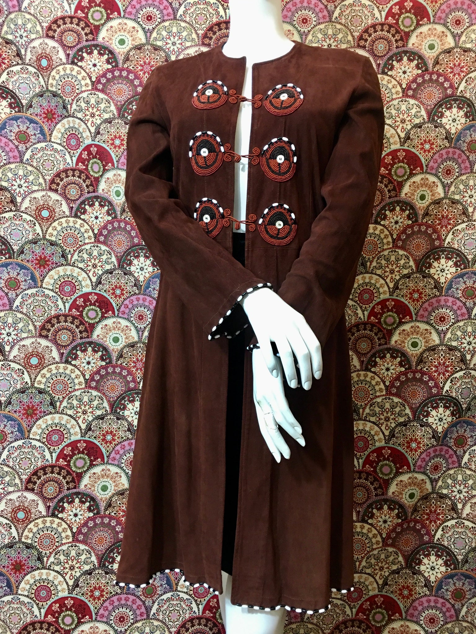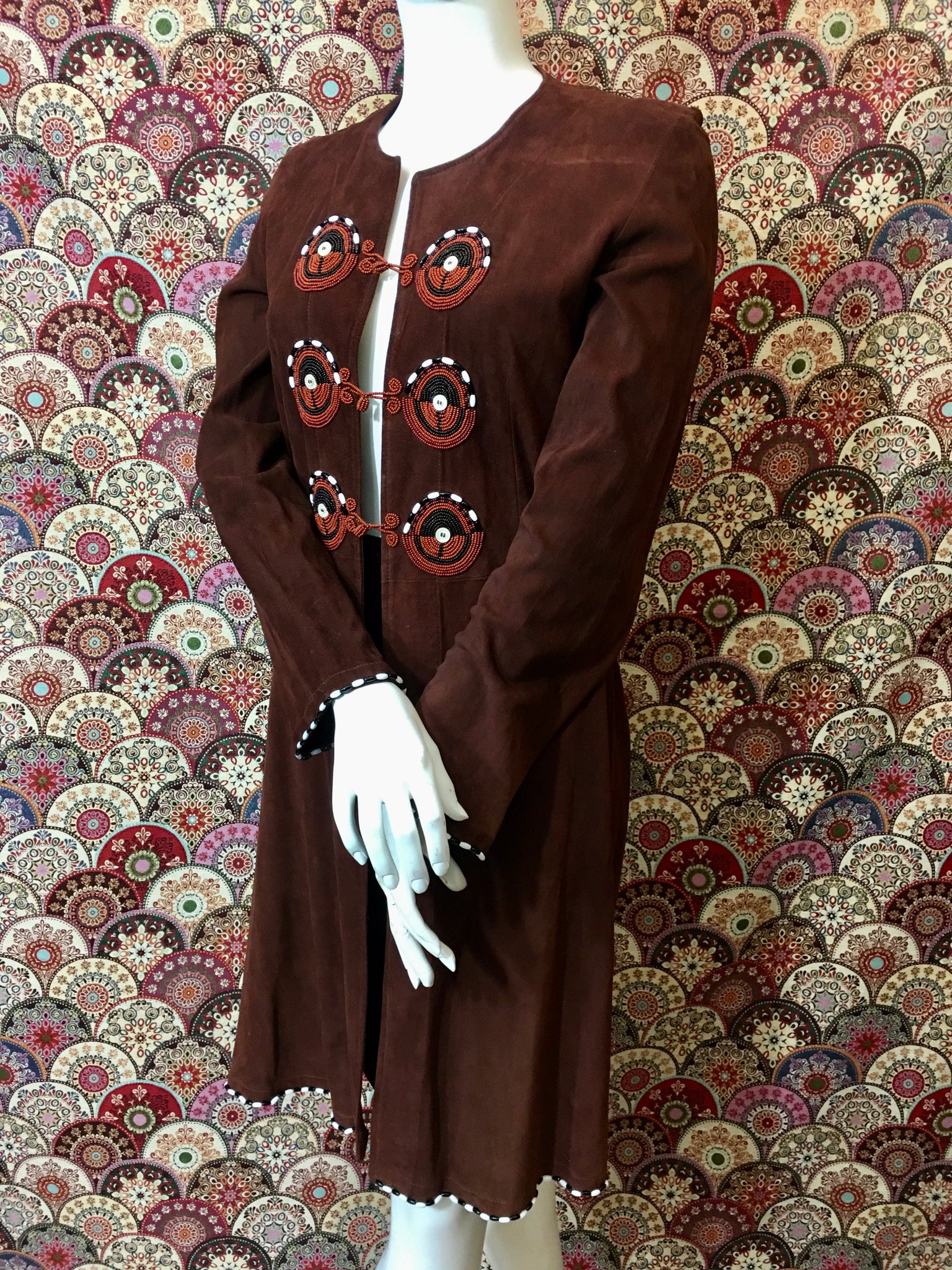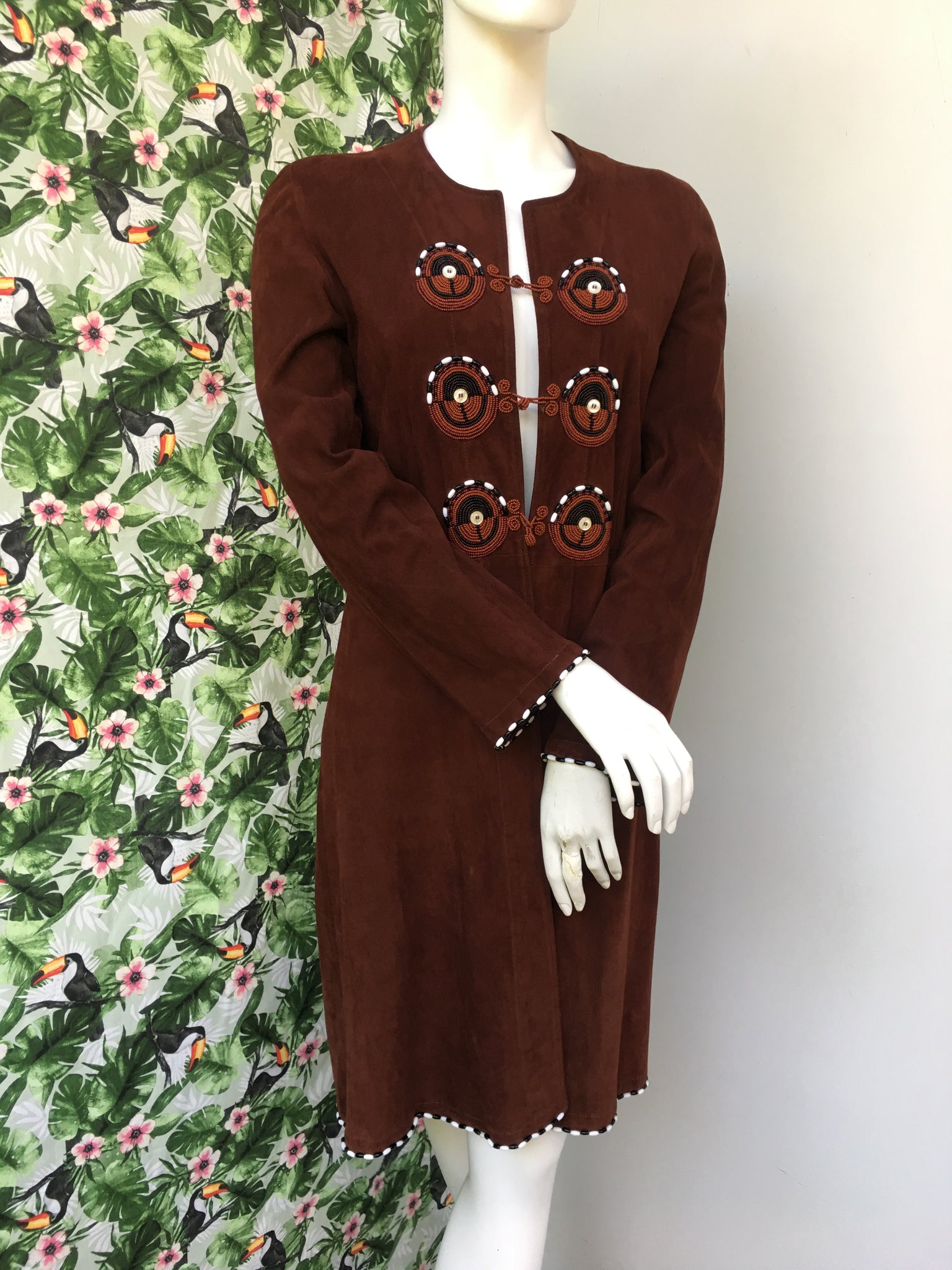Introuvable !! Manteau de la créatrice Allemande Anna Trzebinski. Installée en Afrique à Nairobi, elle a crée sa marque il y a 30 ans. Elle privilégie l’artisanat Africain faisant de ses vêtements des pièces d’exception. Après avoir vendu ses vêtements chez Barneys et Colette, elle refusera d’augmenter le volume de ses collections au détriment de la qualité. Désormais, elle ne vend plus ses vêtements que lors de ventes privées auprès d’une clientèle privilégiée en France et aux Etats-Unis. Le manteau est en daim et en très bon état. Il manque juste deux perles. Mesures à plat : largeur épaules 39 cms, largeur sous aisselles 48 cms, largeur taille 42 cms et longueur 97 cms.