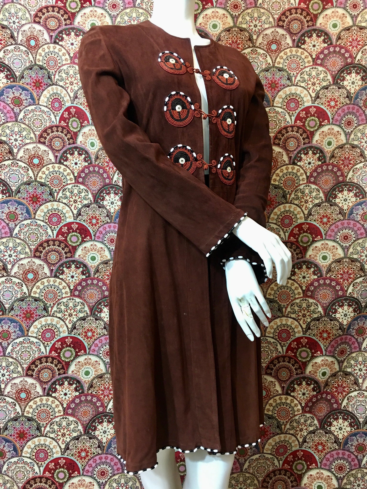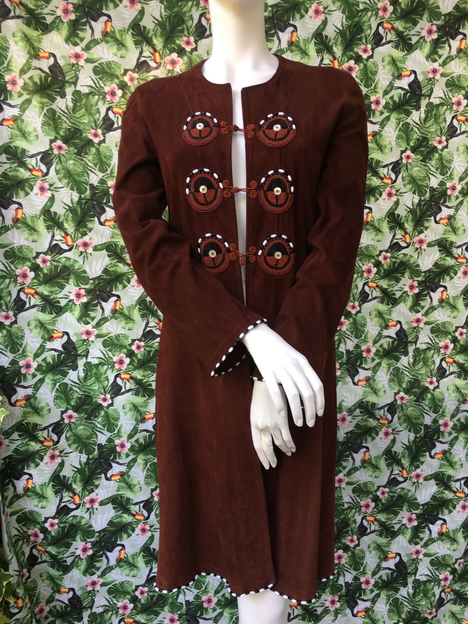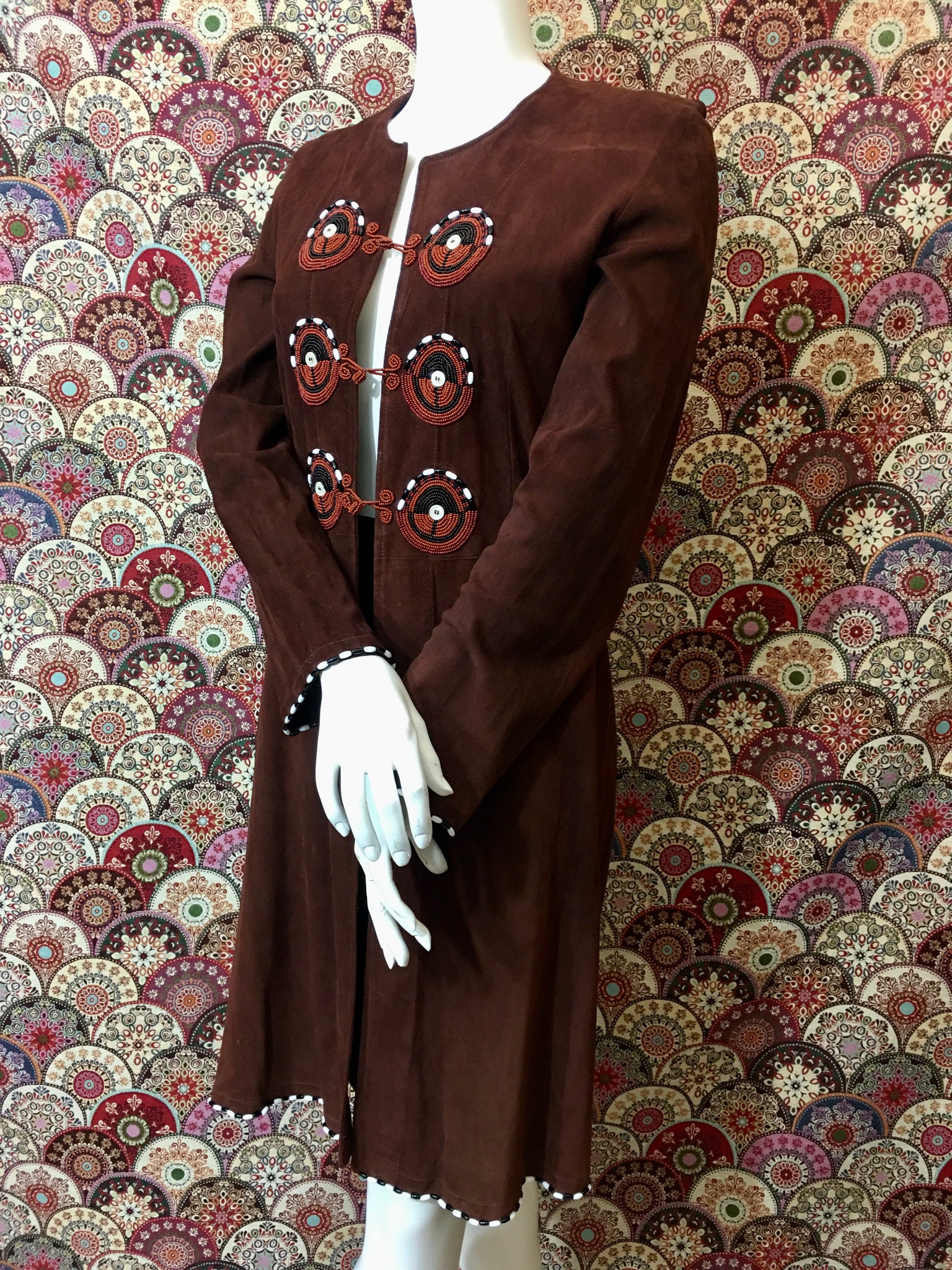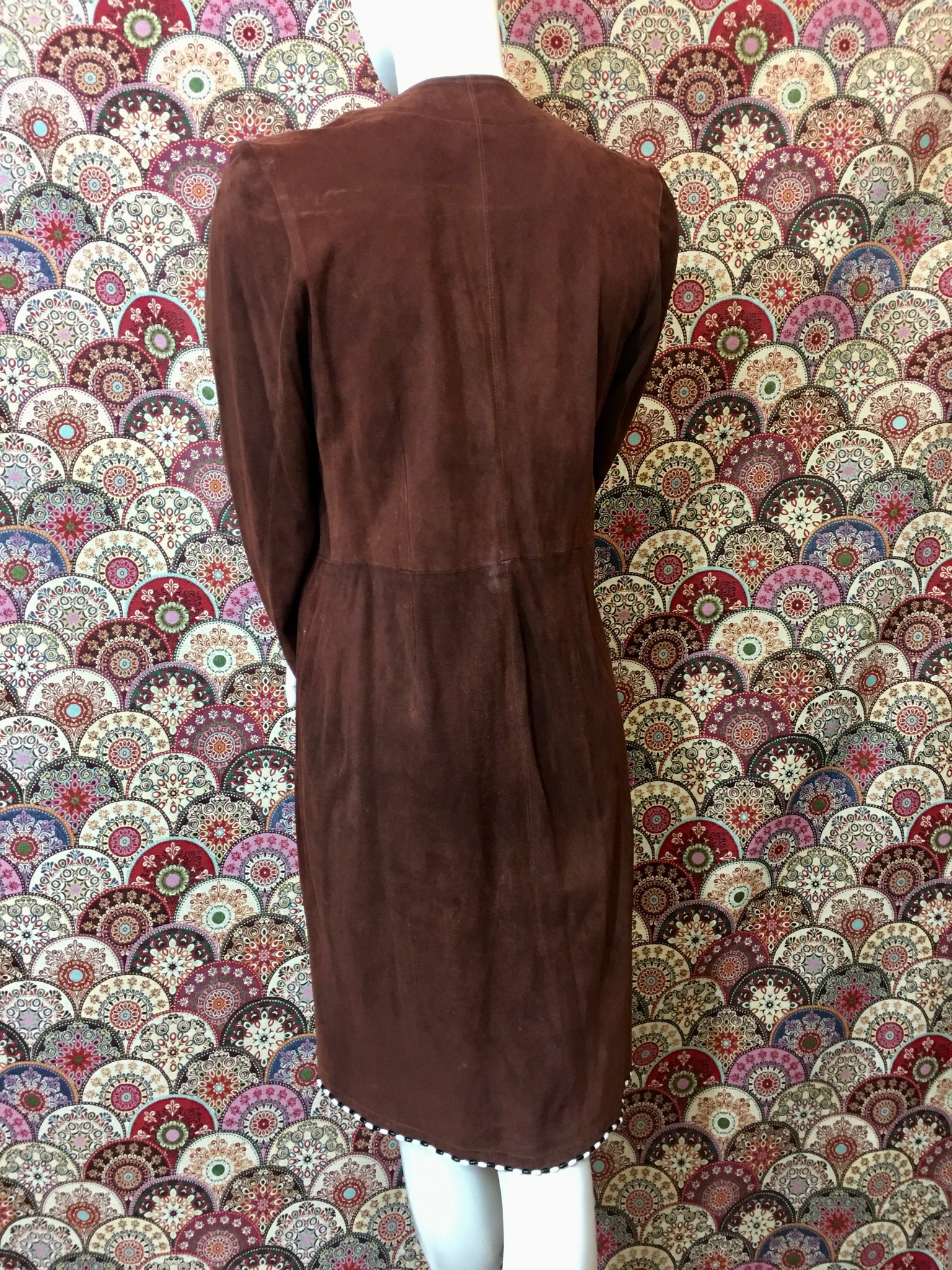 Introuvable !! Manteau de la créatrice Allemande Anna Trzebinski. Installée en Afrique à Nairobi, elle a crée sa marque il y a 30 ans. Elle privilégie l’artisanat Africain faisant de ses vêtements des pièces d’exception. Après avoir vendu ses vêtements chez Barneys et Colette, elle refusera d’augmenter le volume de ses collections au détriment de la qualité. Désormais, elle ne vend plus ses vêtements que lors de ventes privées auprès d’une clientèle privilégiée en France et aux Etats-Unis. Le manteau est en daim et en très bon état. Il manque juste deux perles. Mesures à plat : largeur épaules 39 cms, largeur sous aisselles 48 cms, largeur taille 42 cms et longueur 97 cms.