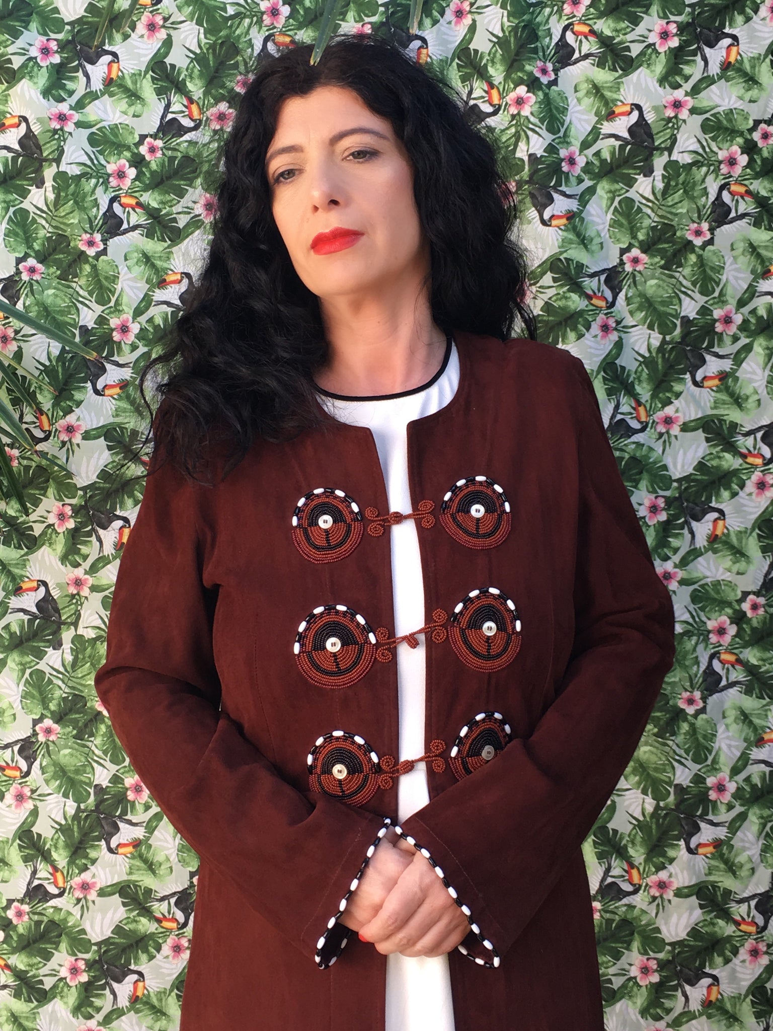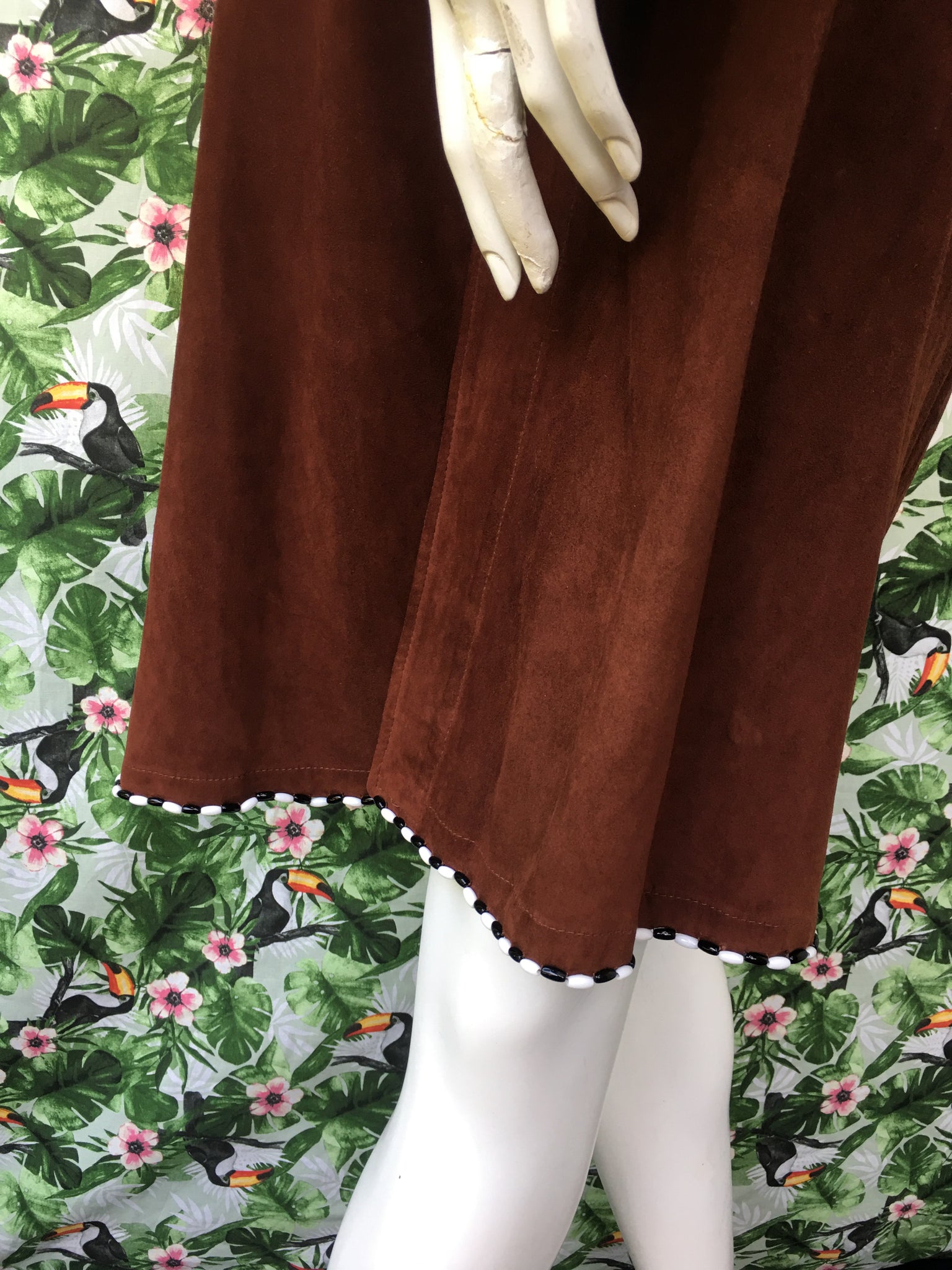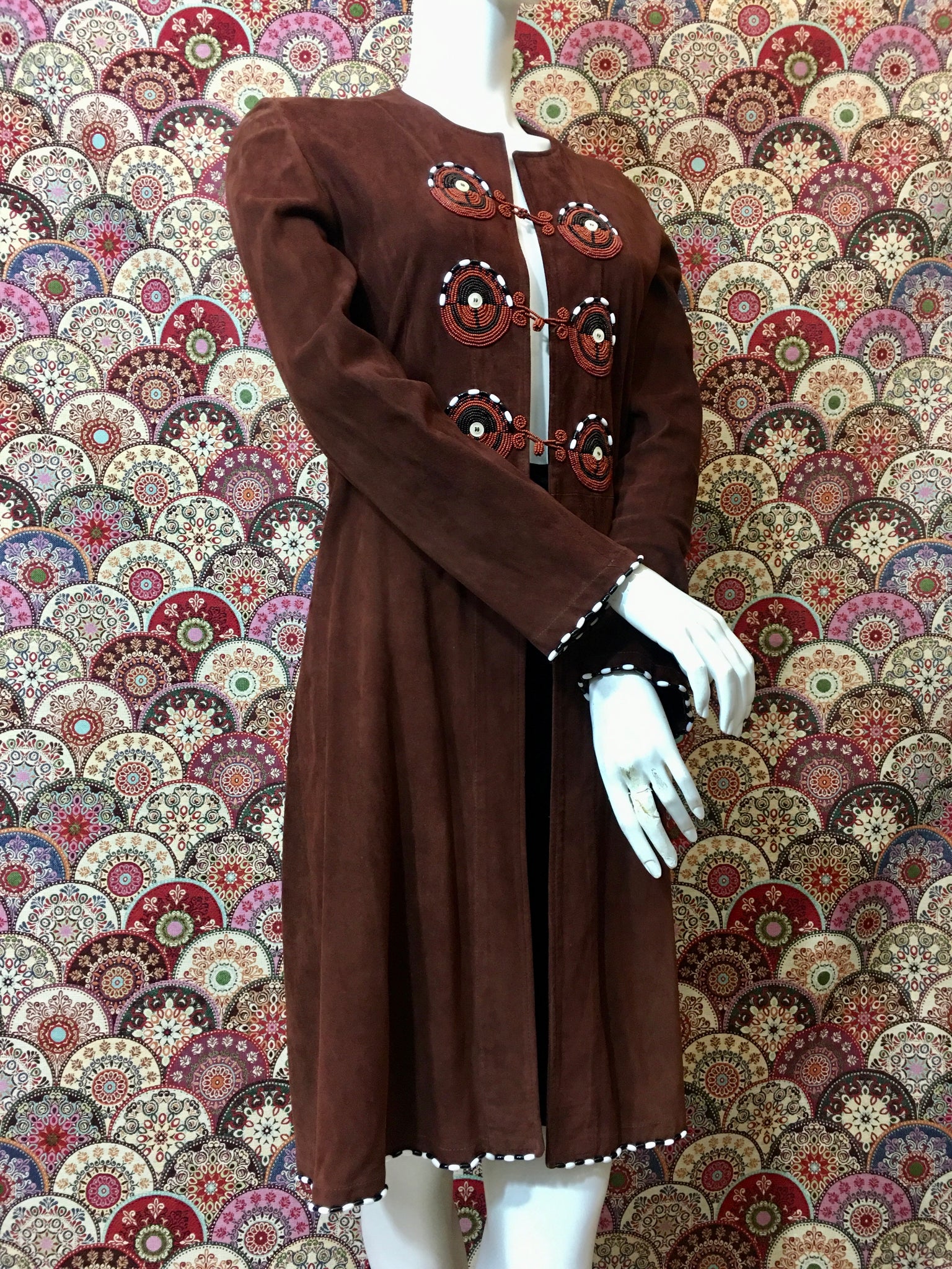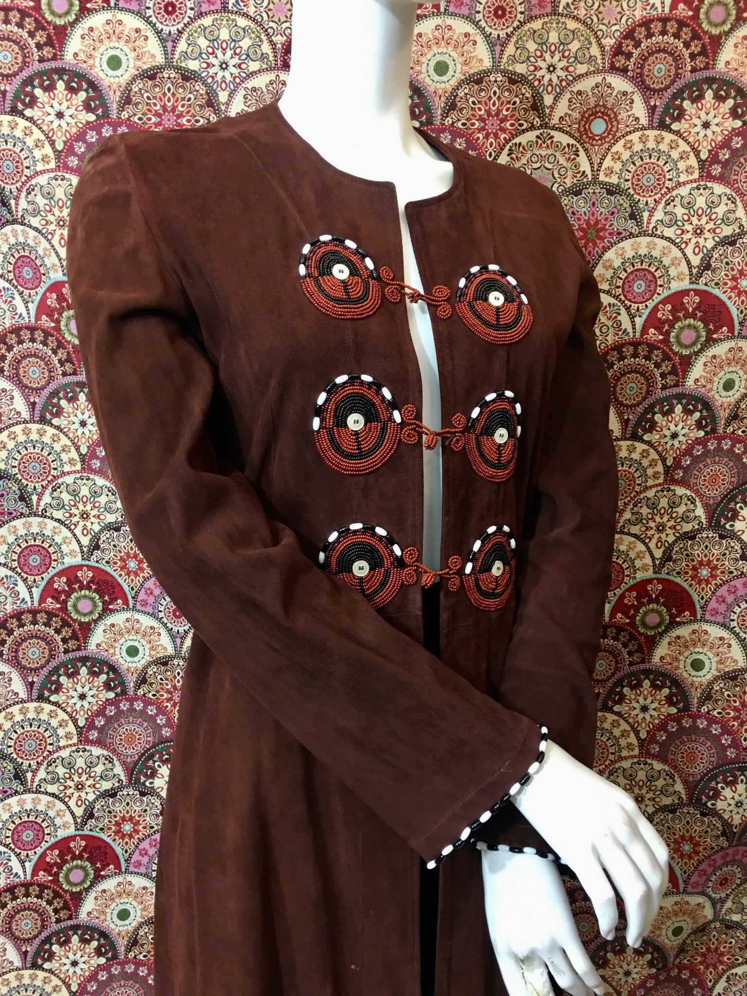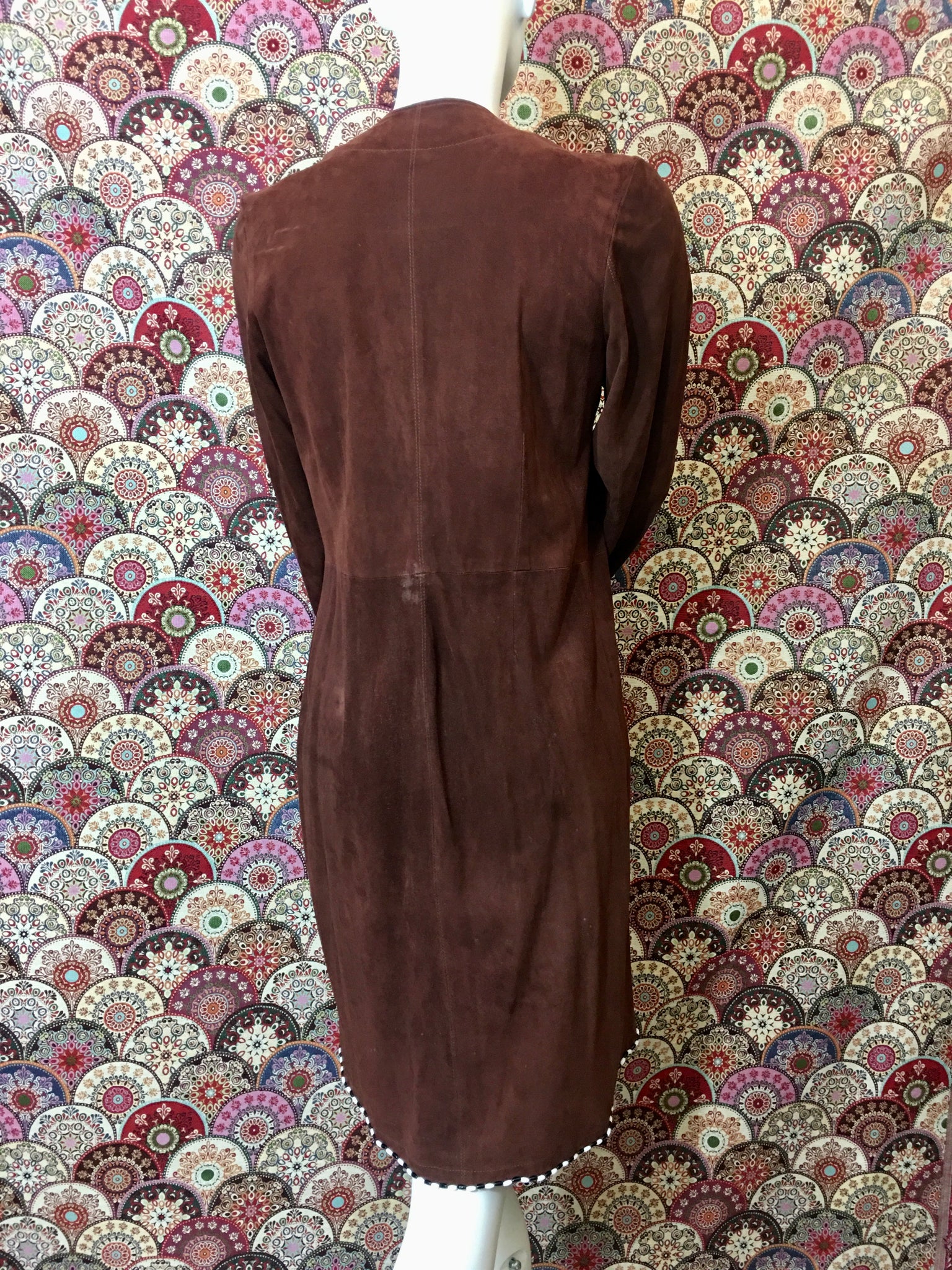 Introuvable !! Manteau de la créatrice Allemande Anna Trzebinski. Installée en Afrique à Nairobi, elle a crée sa marque il y a 30 ans. Elle privilégie l’artisanat Africain faisant de ses vêtements des pièces d’exception. Après avoir vendu ses vêtements chez Barneys et Colette, elle refusera d’augmenter le volume de ses collections au détriment de la qualité. Désormais, elle ne vend plus ses vêtements que lors de ventes privées auprès d’une clientèle privilégiée en France et aux Etats-Unis. Le manteau est en daim et en très bon état. Il manque juste deux perles. Mesures à plat : largeur épaules 39 cms, largeur sous aisselles 48 cms, largeur taille 42 cms et longueur 97 cms.