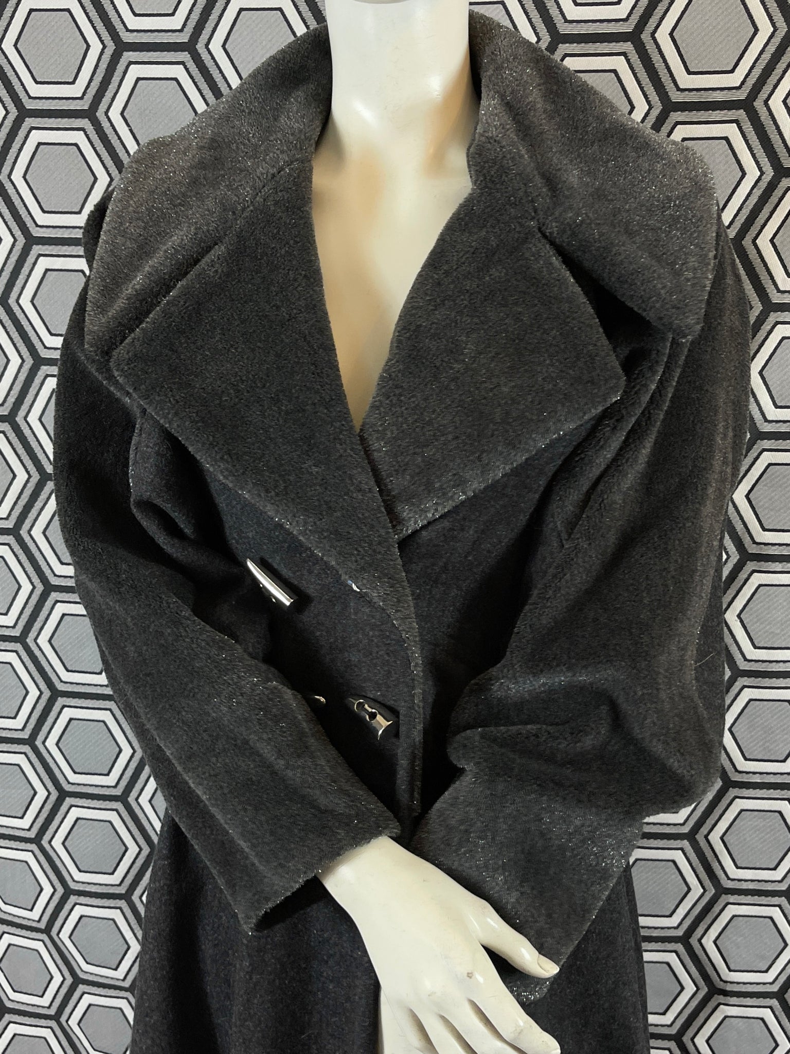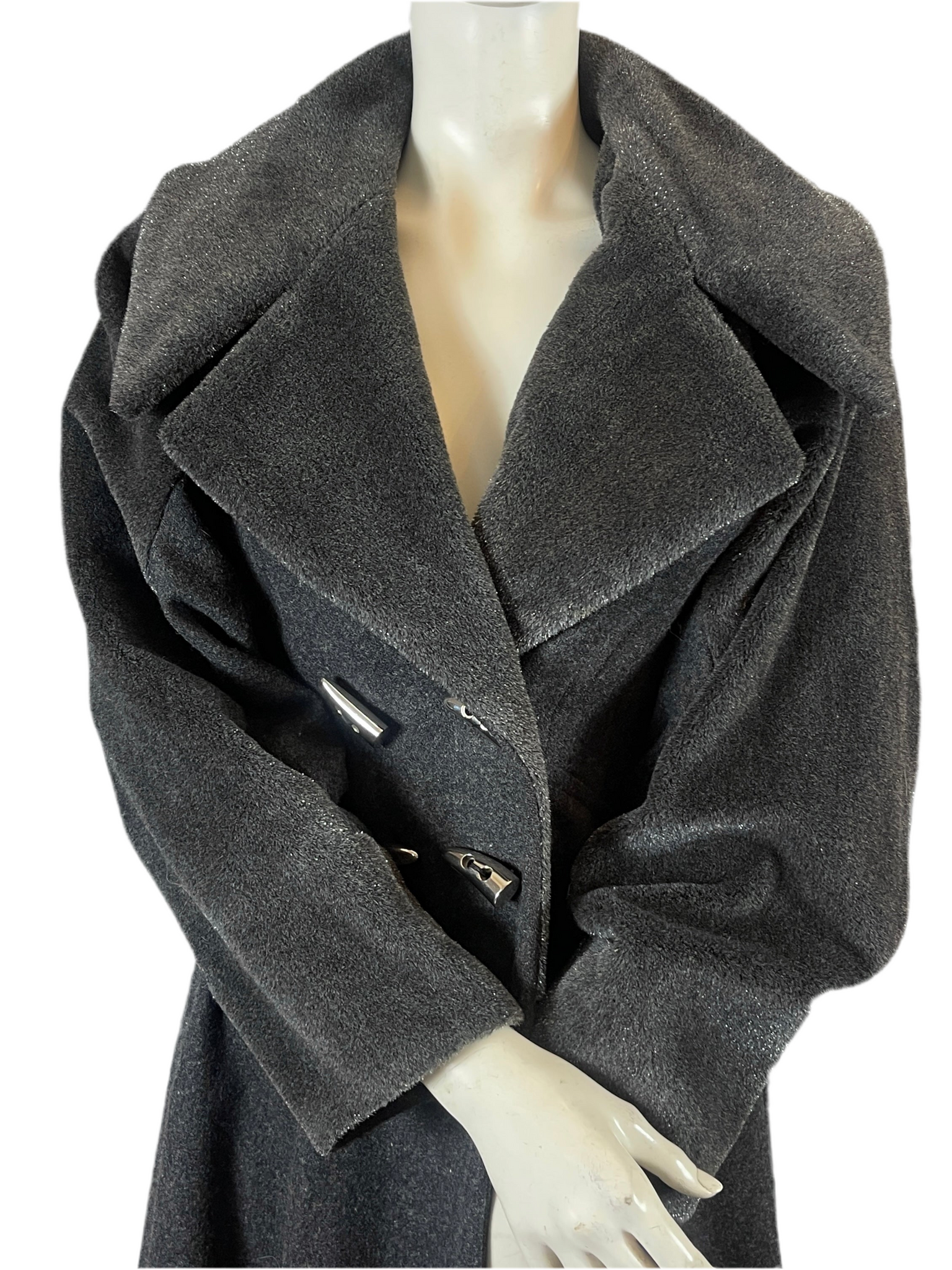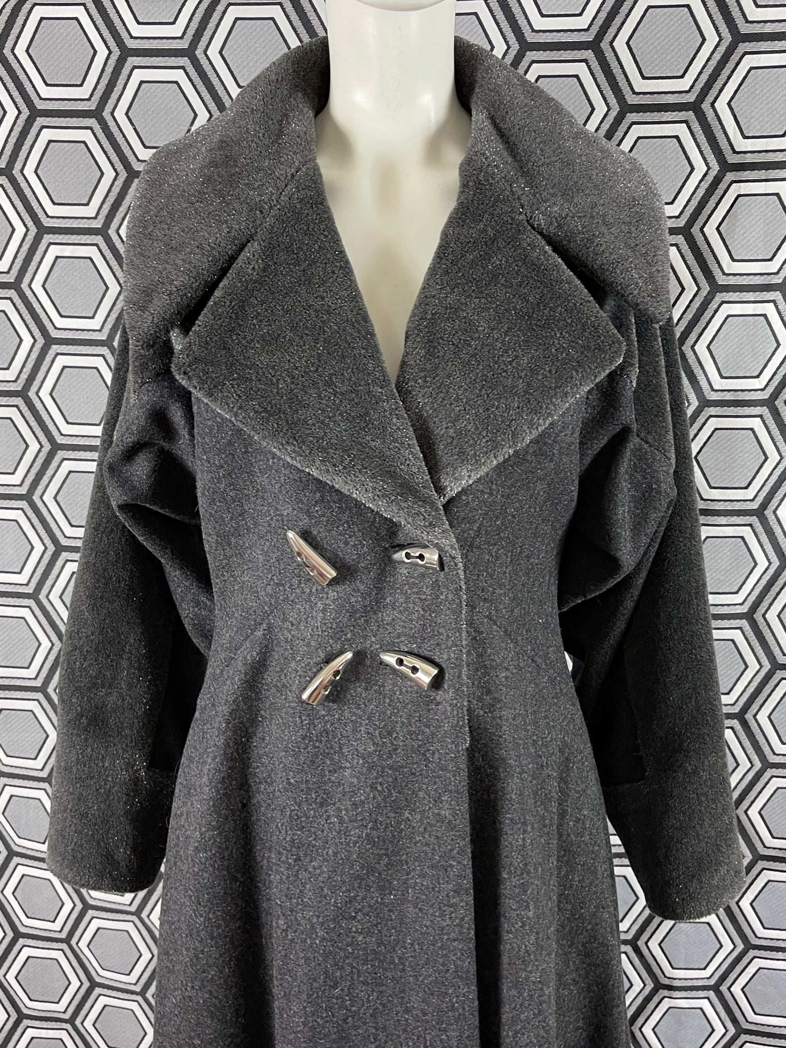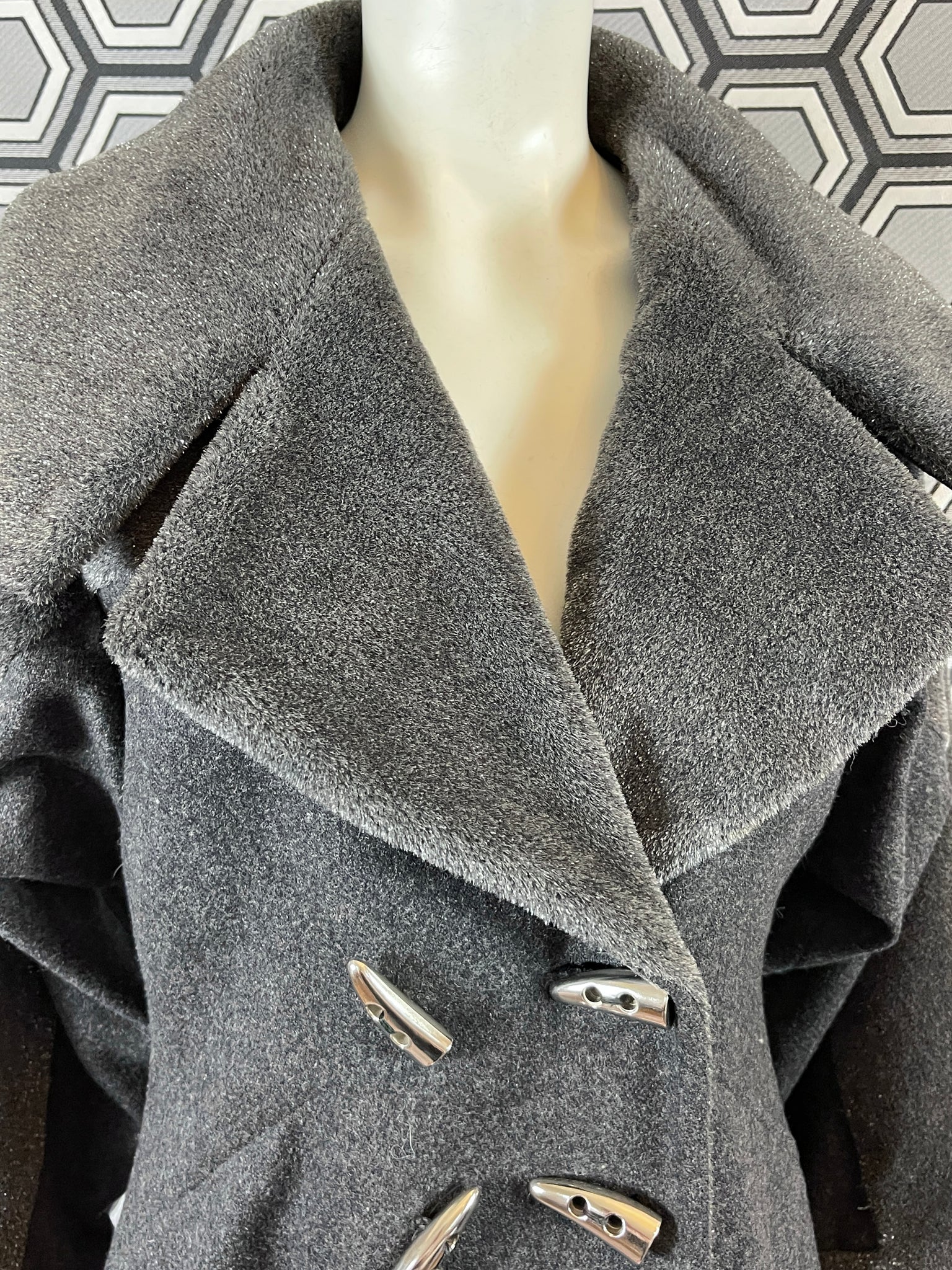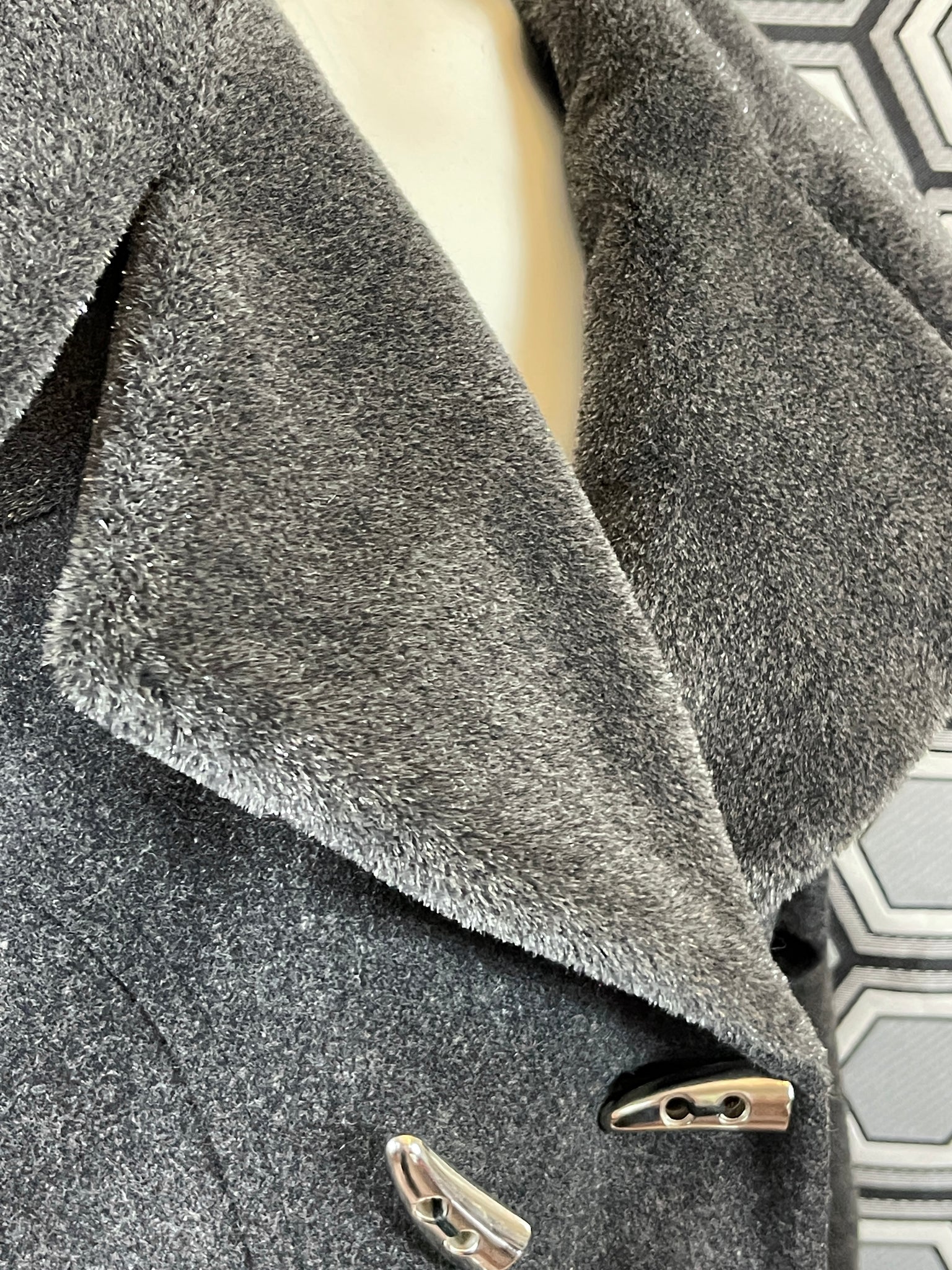 100% laine : certaines parties du manteau sont en laine sèche de couleur grise et mate, tandis que d’autres (le dessus des manches, le col, le haut du dos), sont en laine façon fourrure subtilement pailletée.