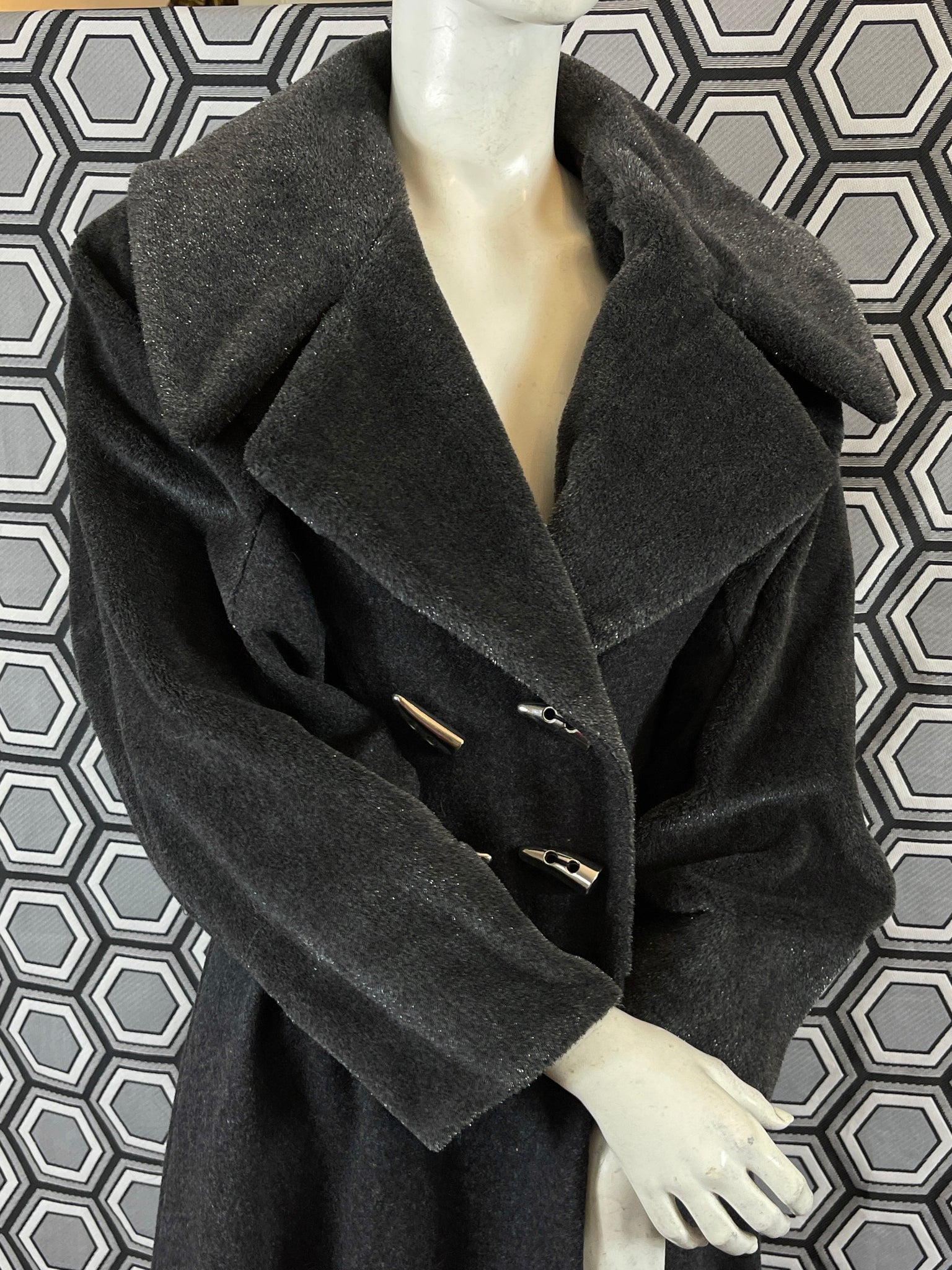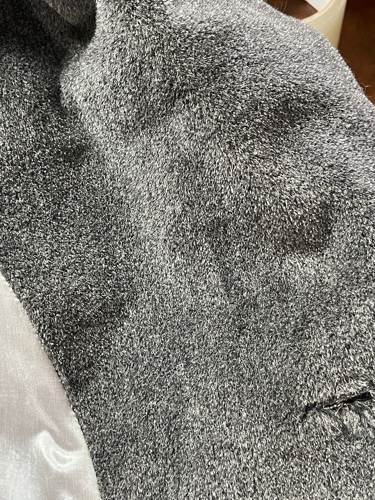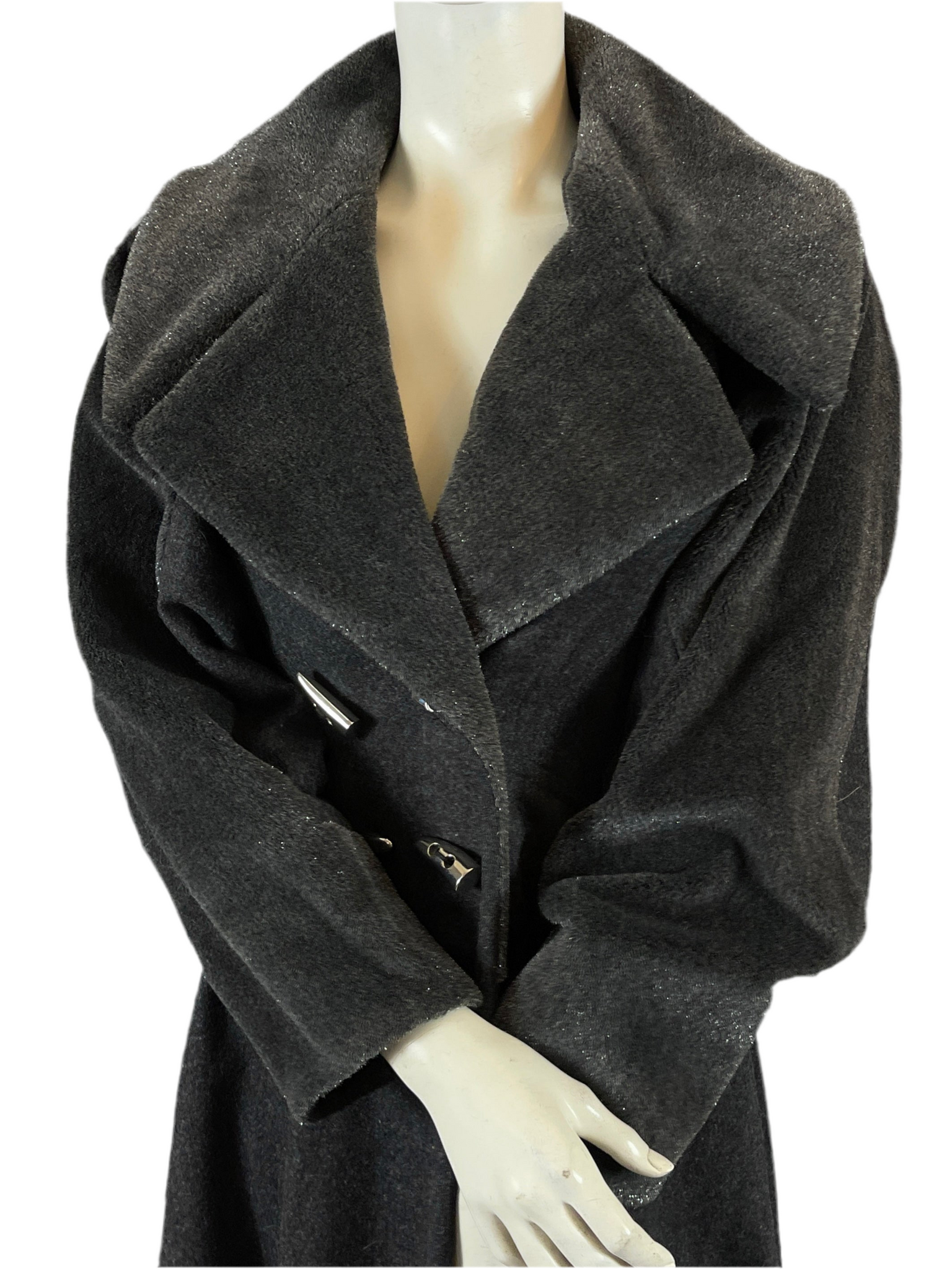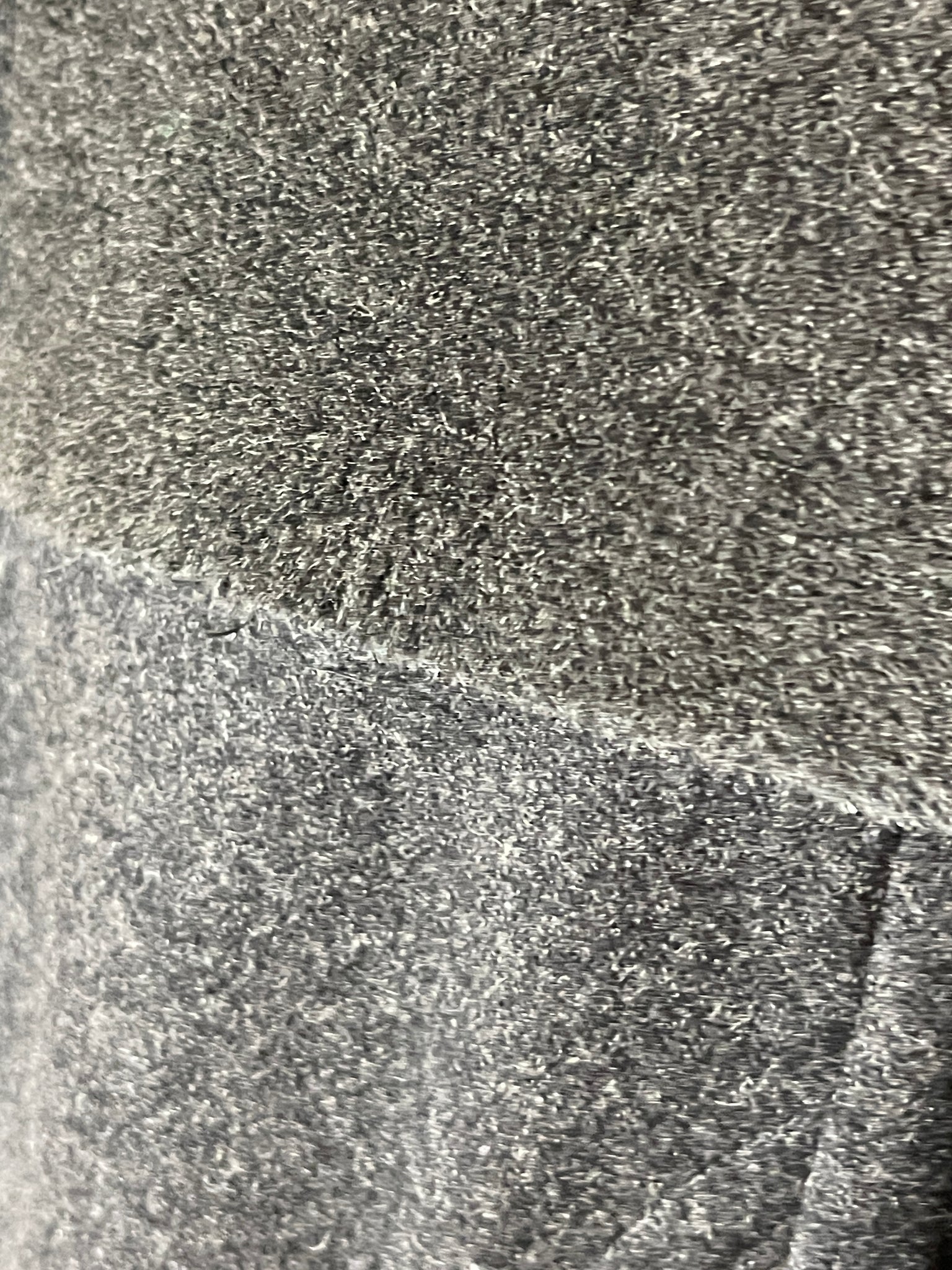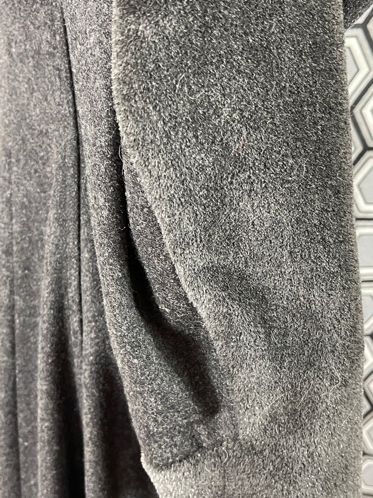 100% laine : certaines parties du manteau sont en laine sèche de couleur grise et mate, tandis que d’autres (le dessus des manches, le col, le haut du dos), sont en laine façon fourrure subtilement pailletée.