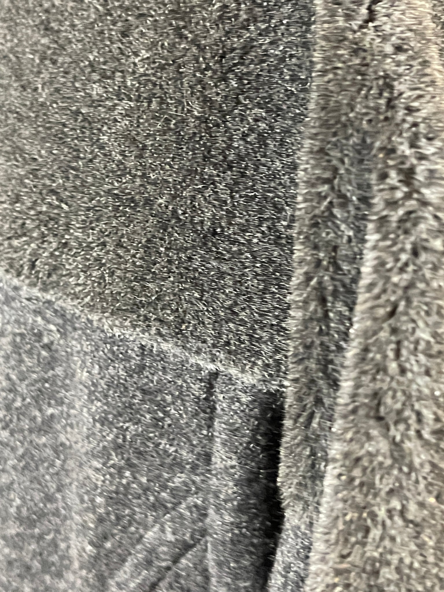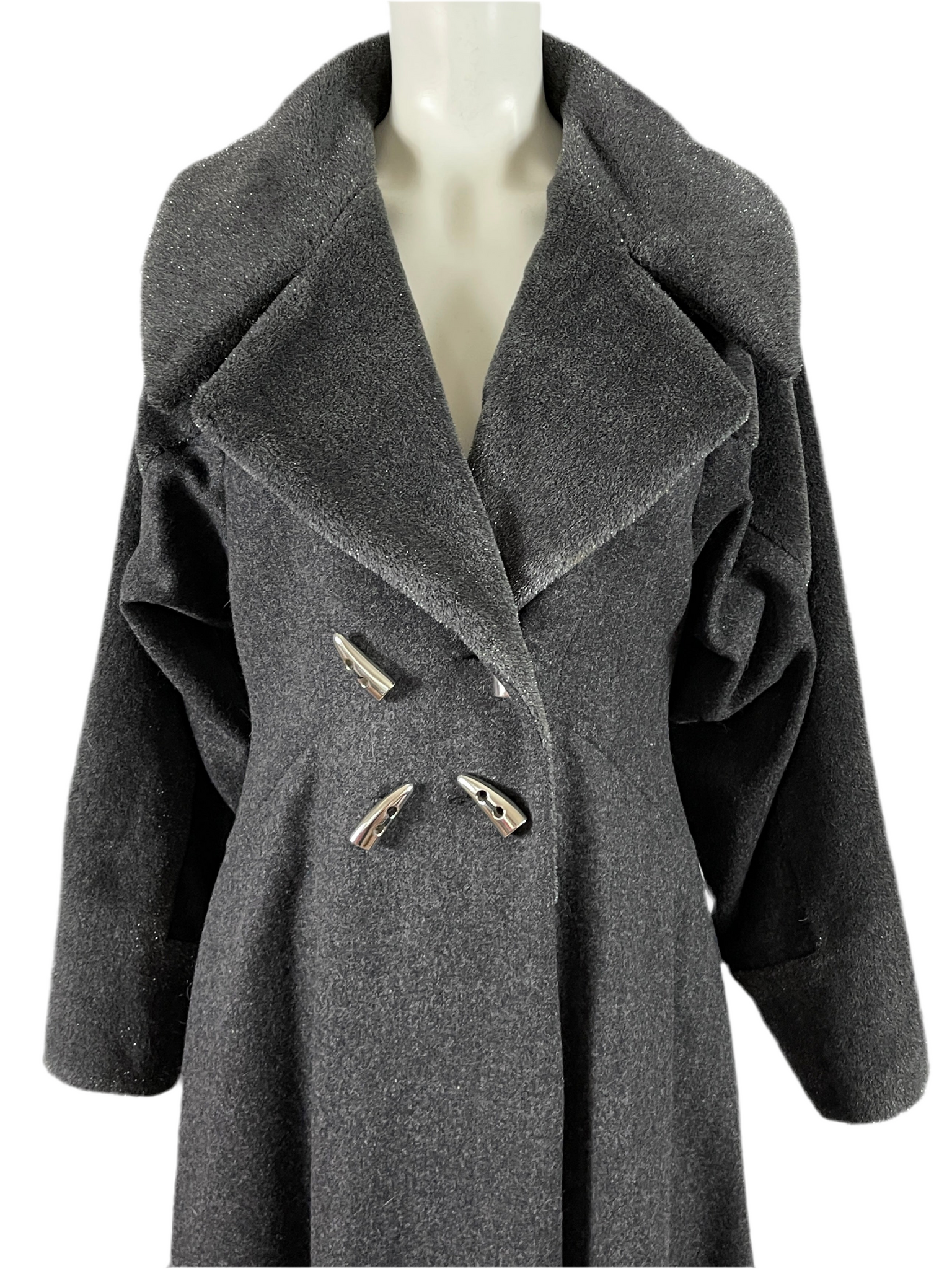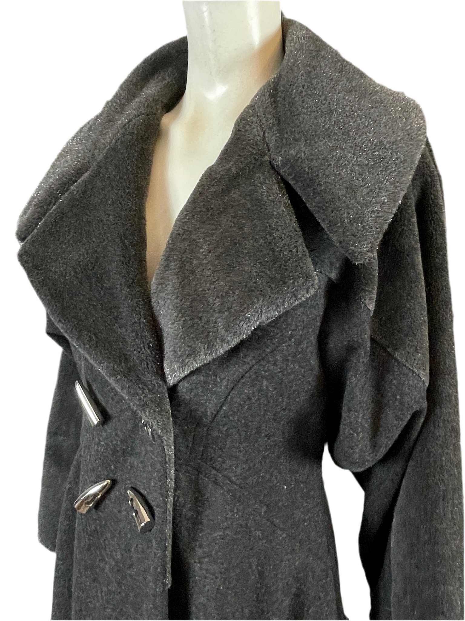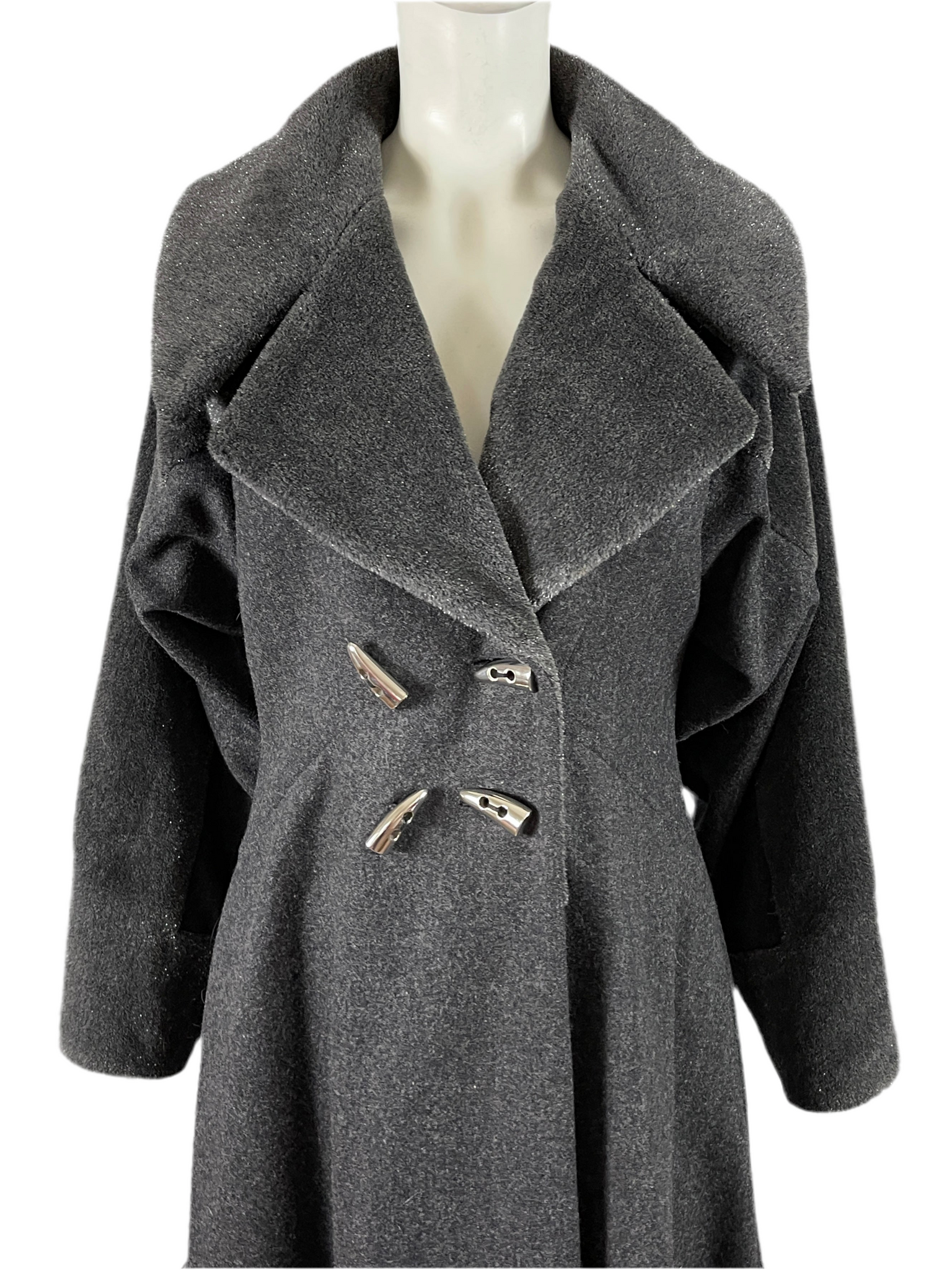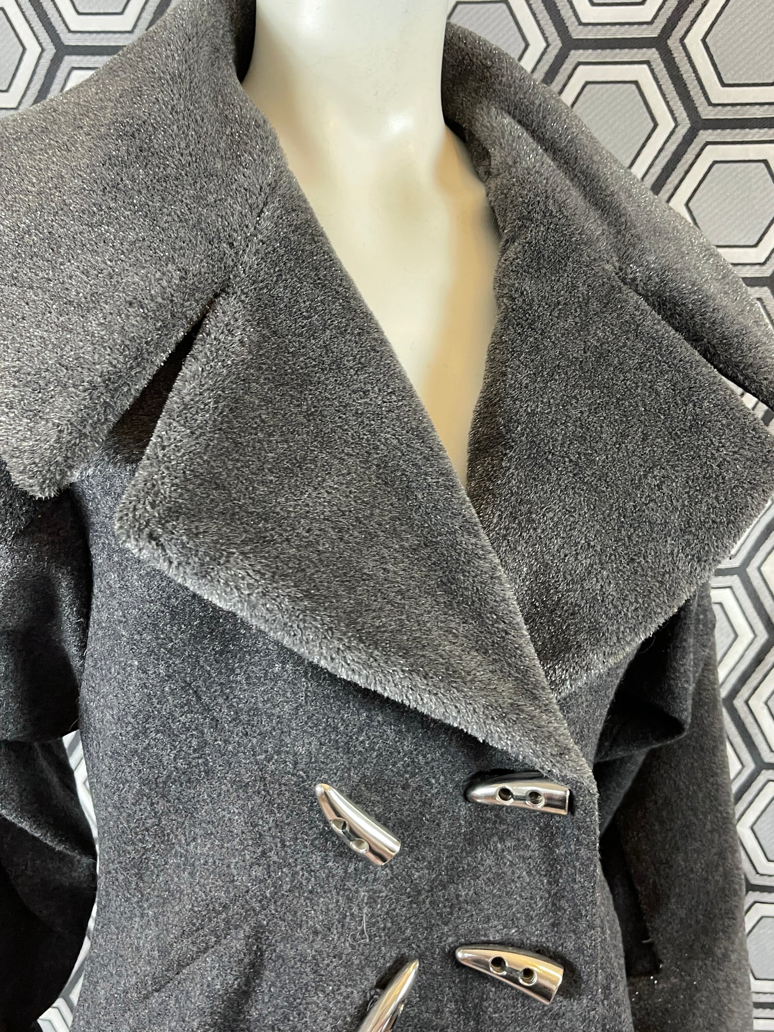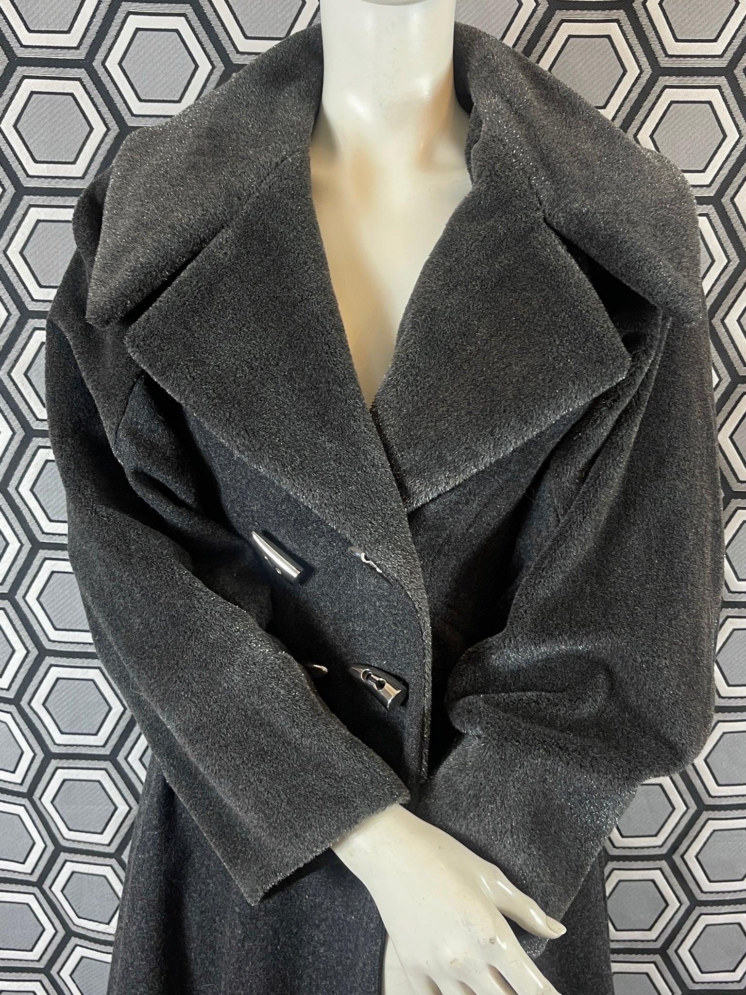 100% laine : certaines parties du manteau sont en laine sèche de couleur grise et mate, tandis que d’autres (le dessus des manches, le col, le haut du dos), sont en laine façon fourrure subtilement pailletée.