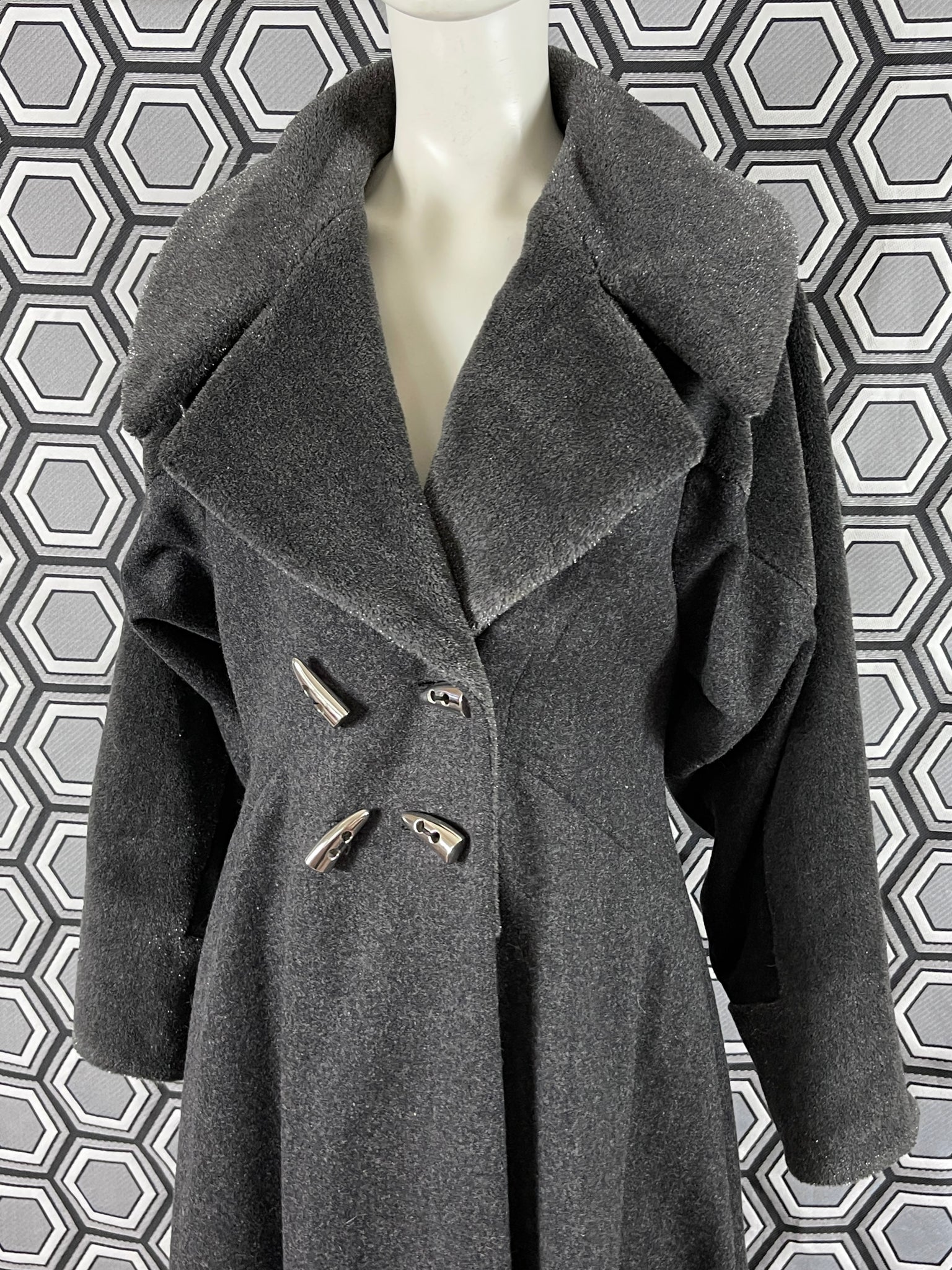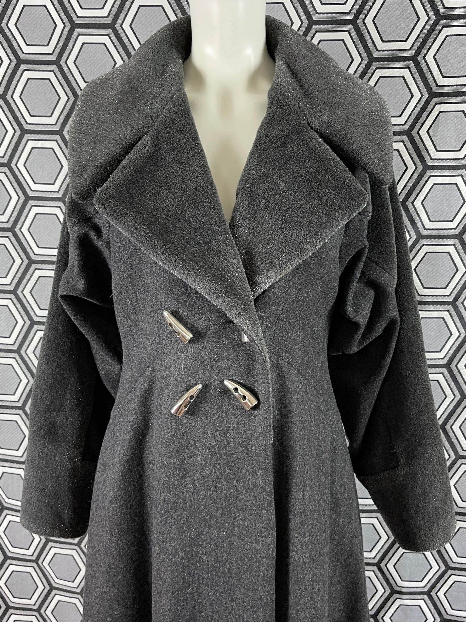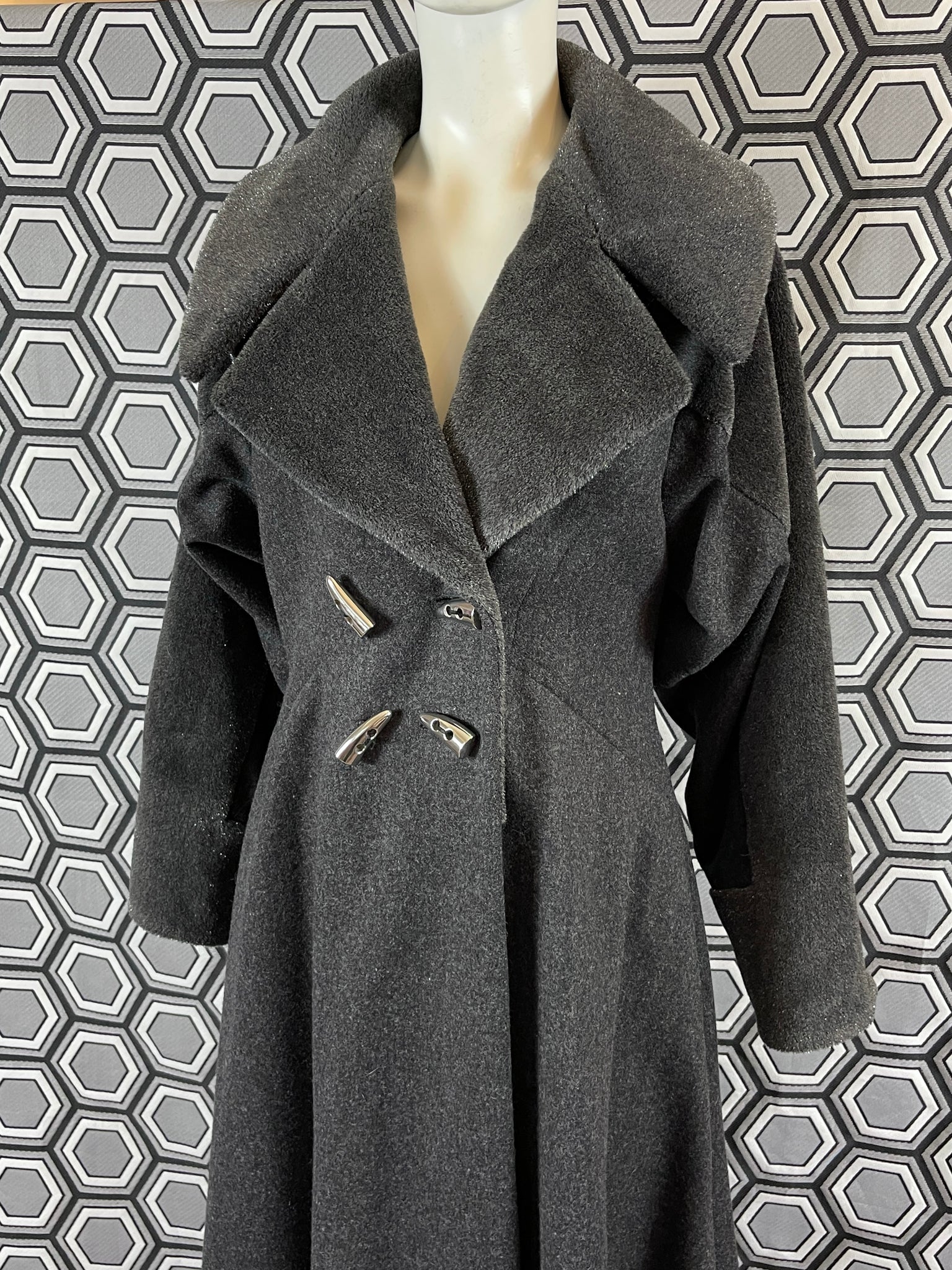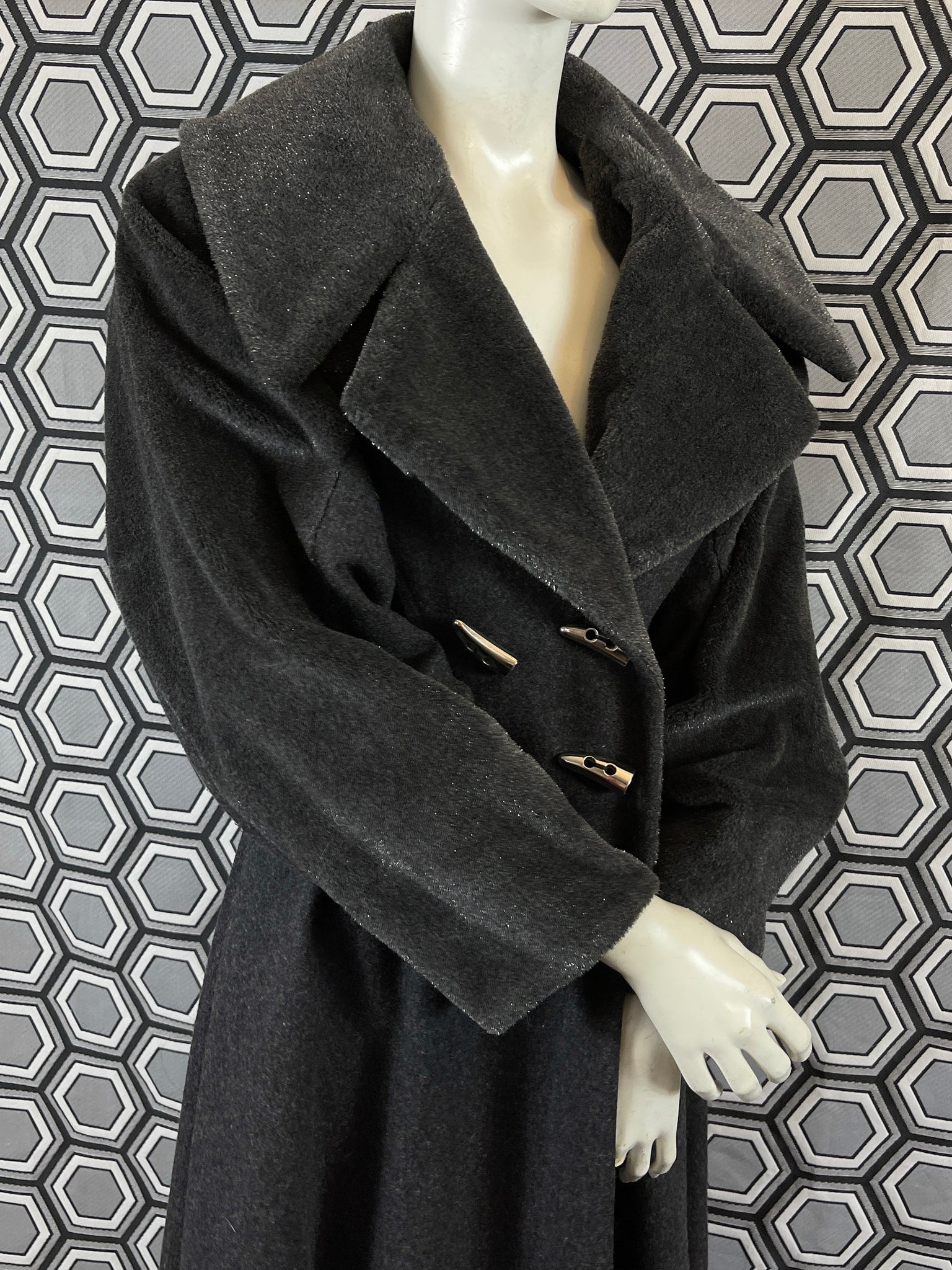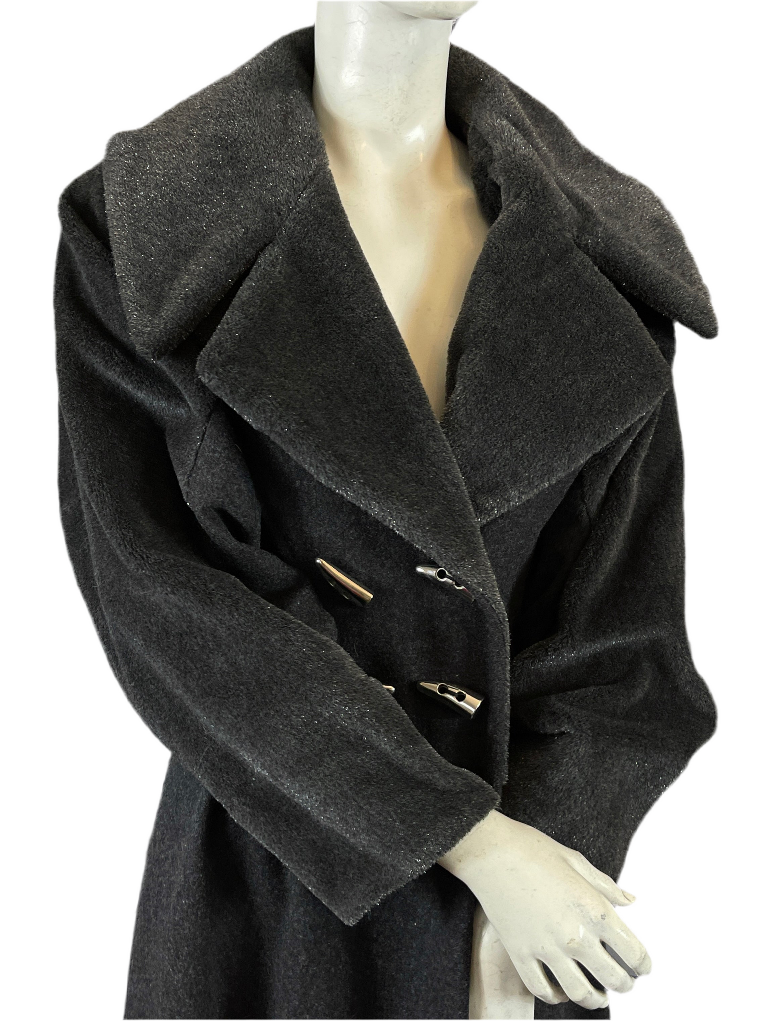 100% laine : certaines parties du manteau sont en laine sèche de couleur grise et mate, tandis que d’autres (le dessus des manches, le col, le haut du dos), sont en laine façon fourrure subtilement pailletée.