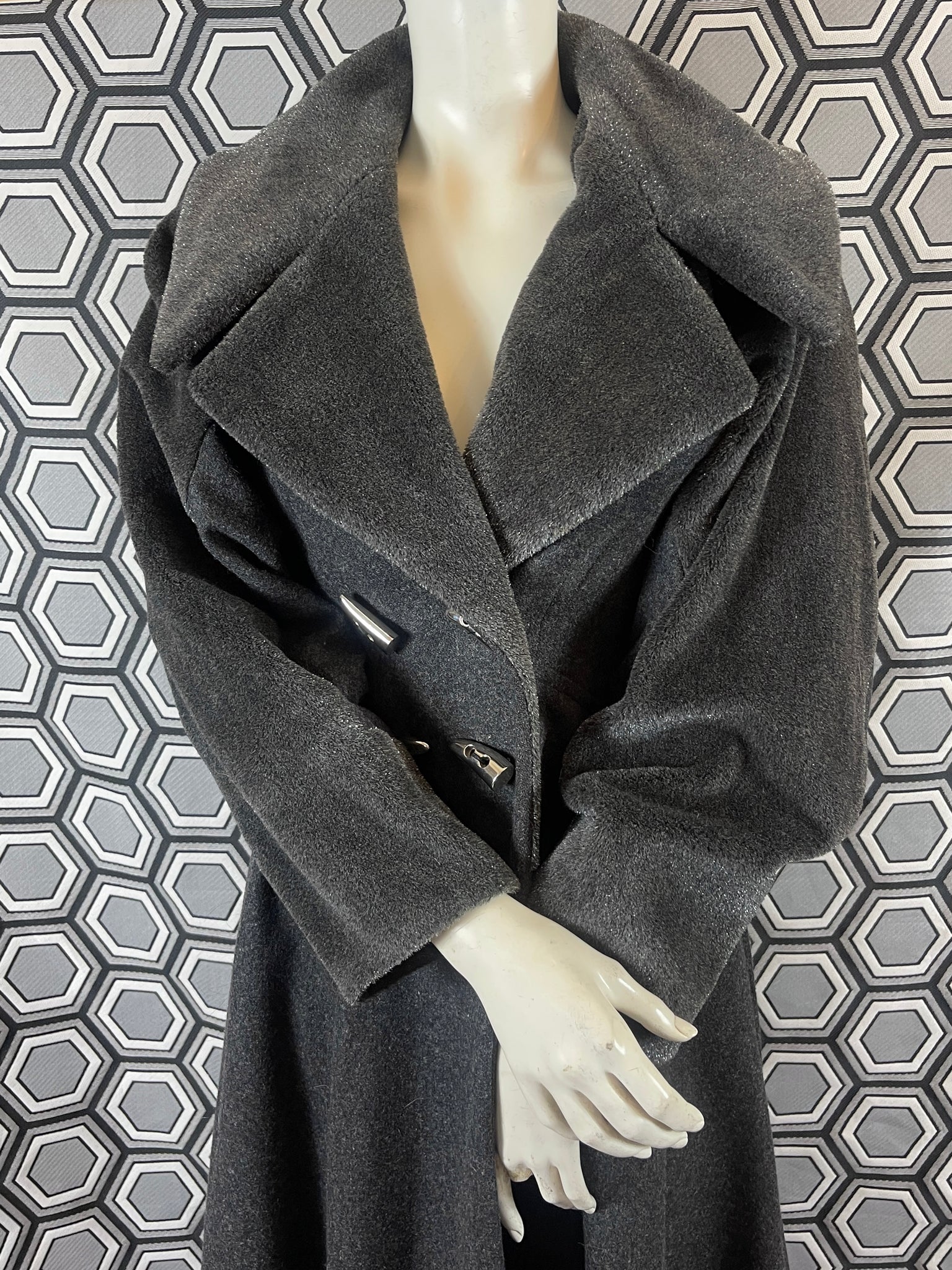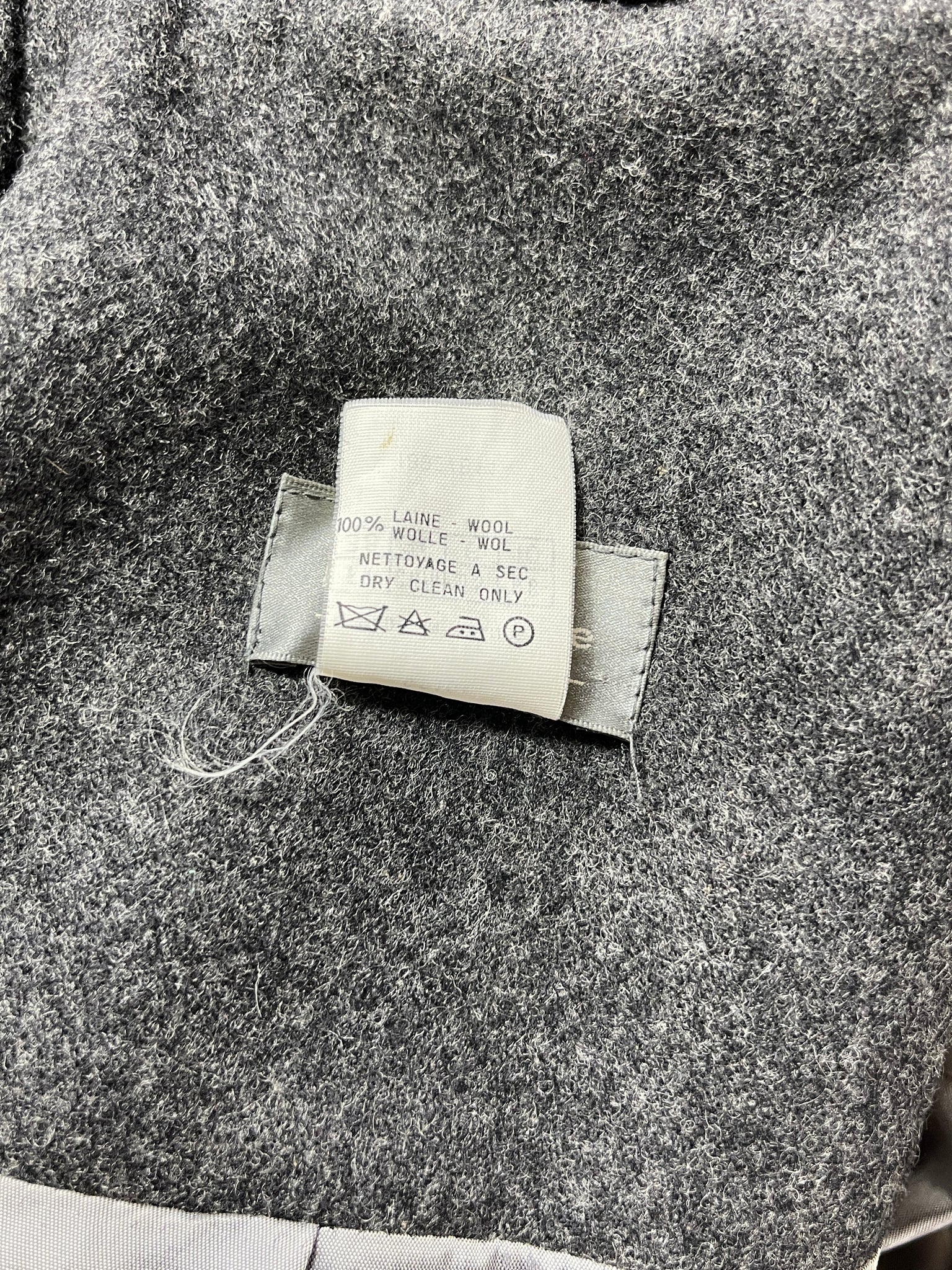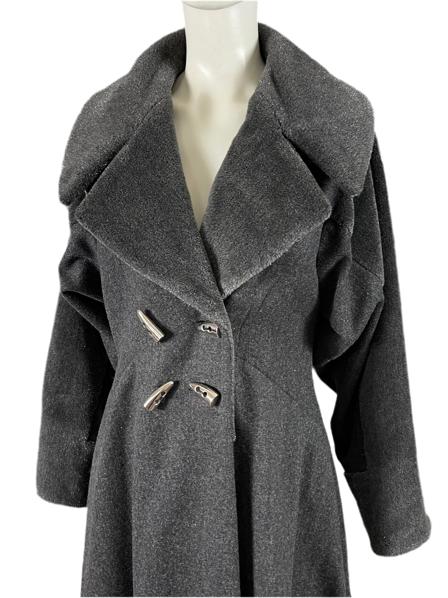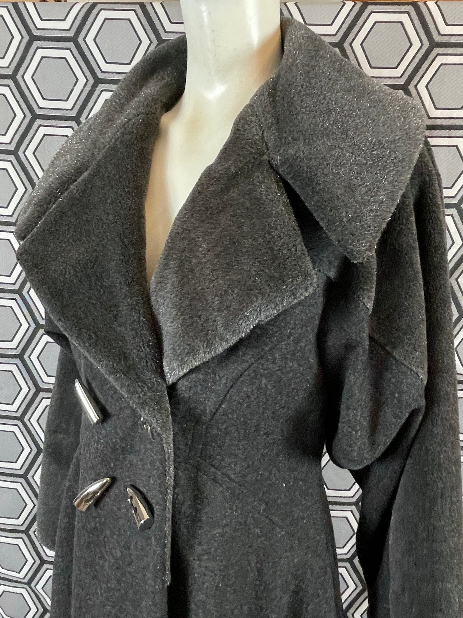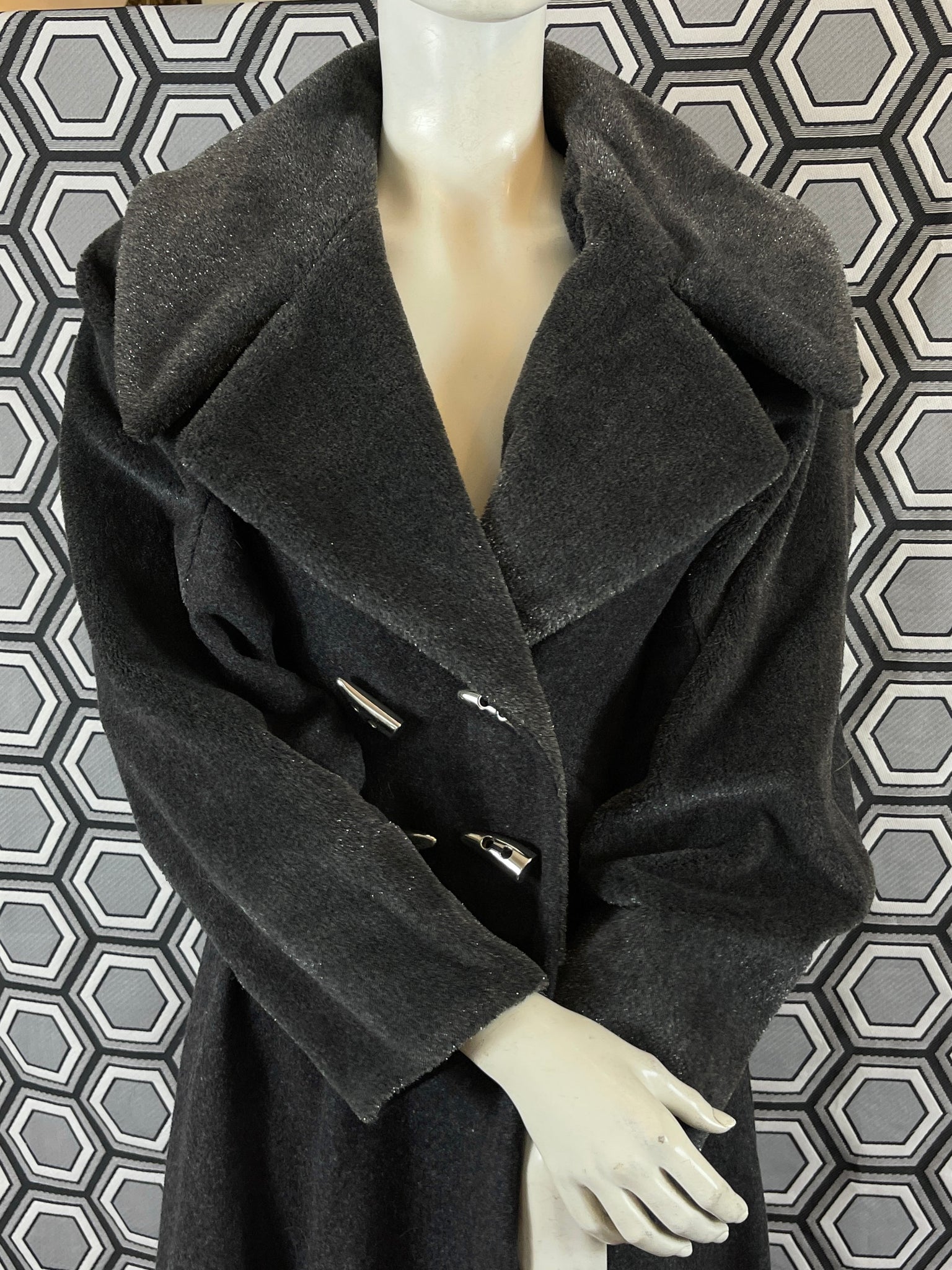 100% laine : certaines parties du manteau sont en laine sèche de couleur grise et mate, tandis que d’autres (le dessus des manches, le col, le haut du dos), sont en laine façon fourrure subtilement pailletée.