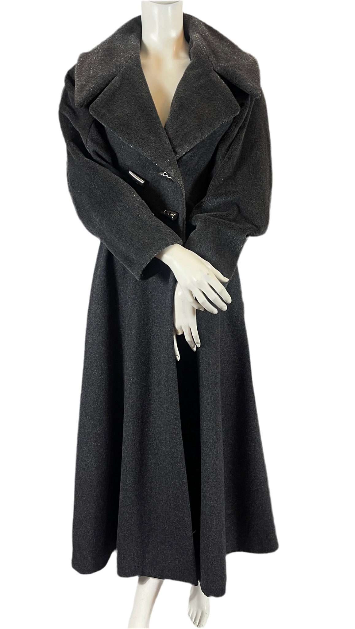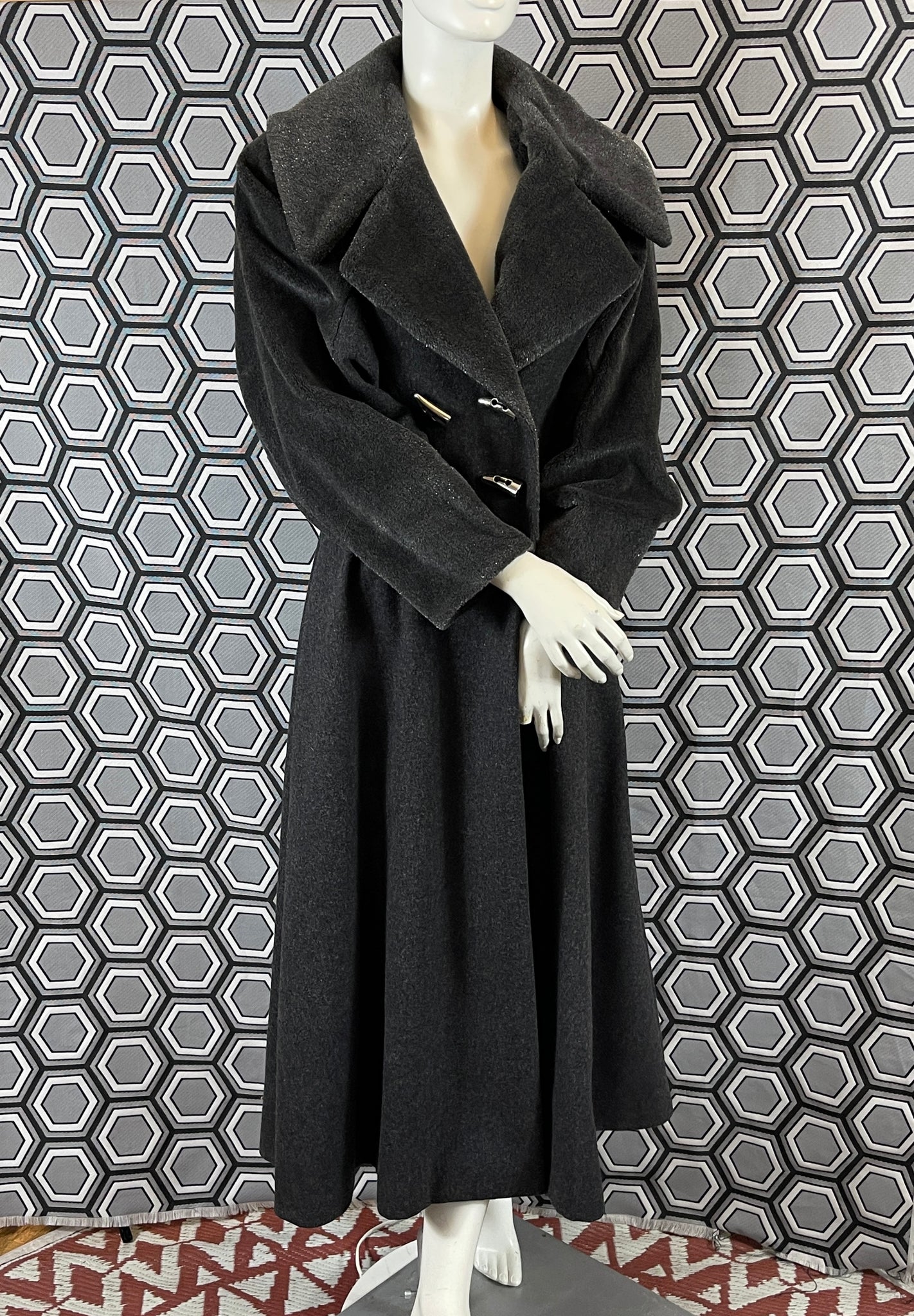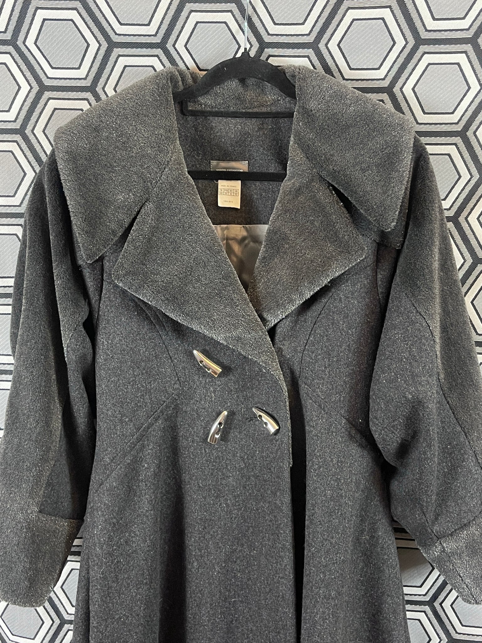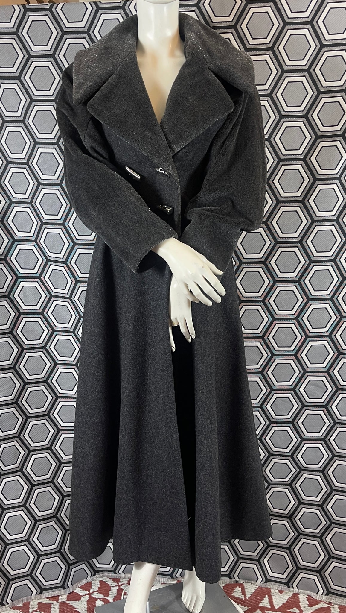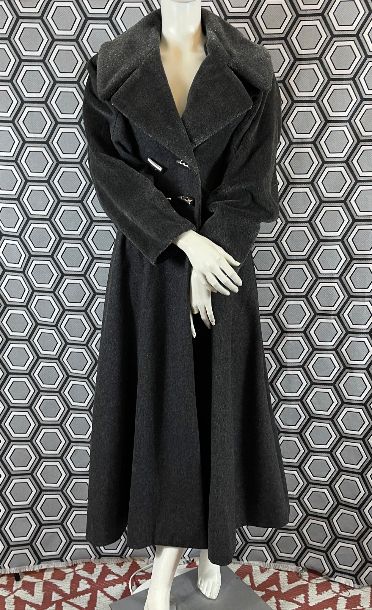 100% laine : certaines parties du manteau sont en laine sèche de couleur grise et mate, tandis que d’autres (le dessus des manches, le col, le haut du dos), sont en laine façon fourrure subtilement pailletée.