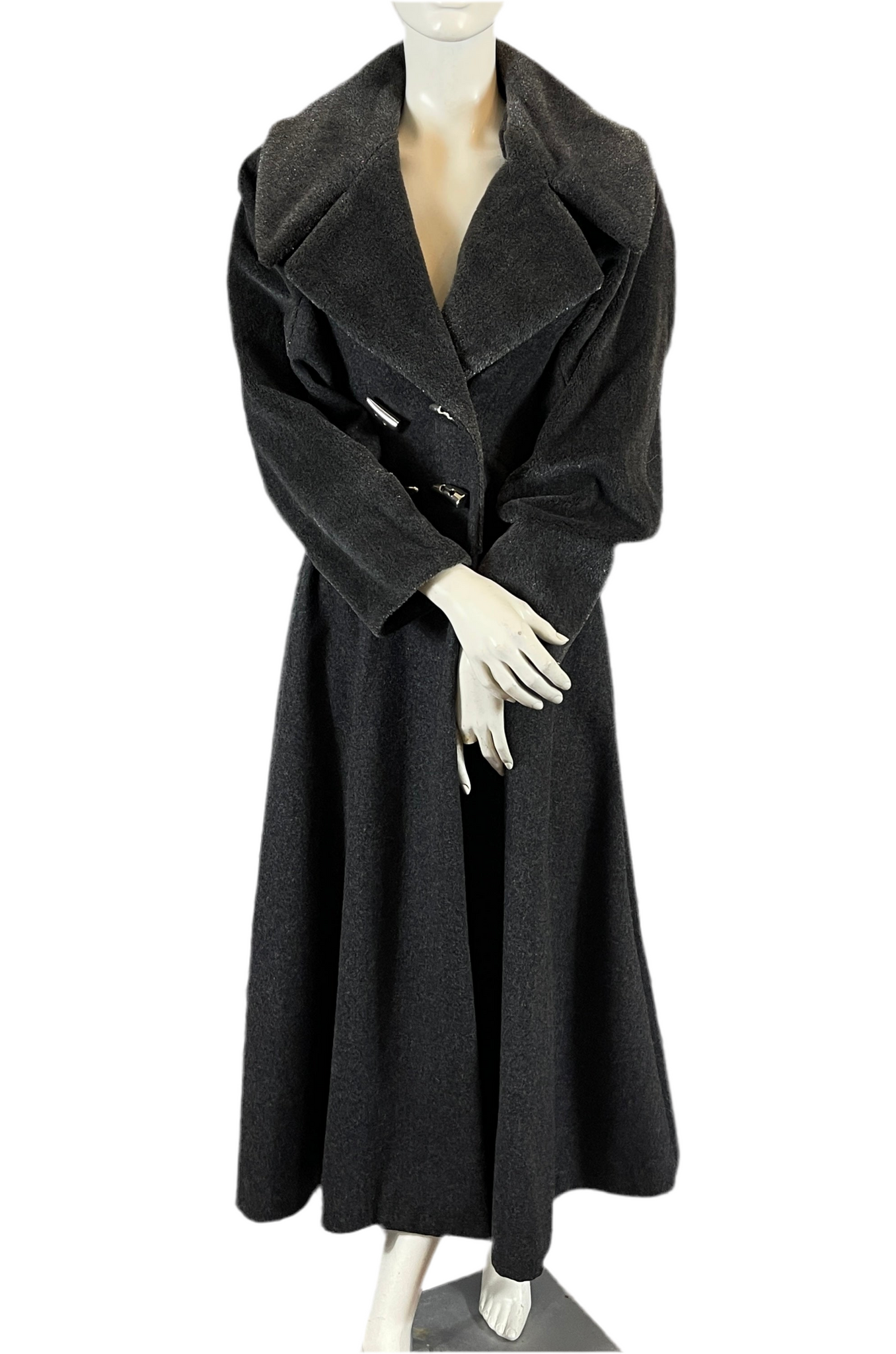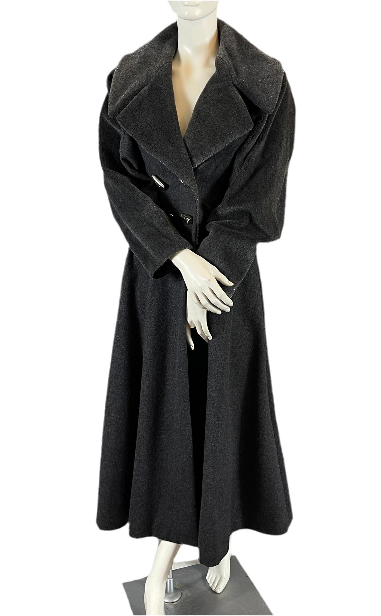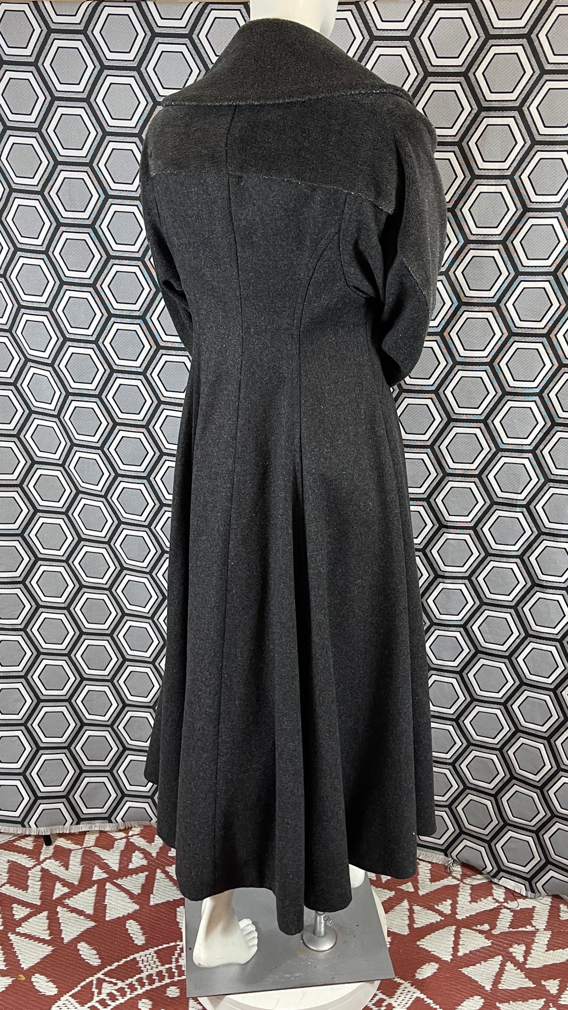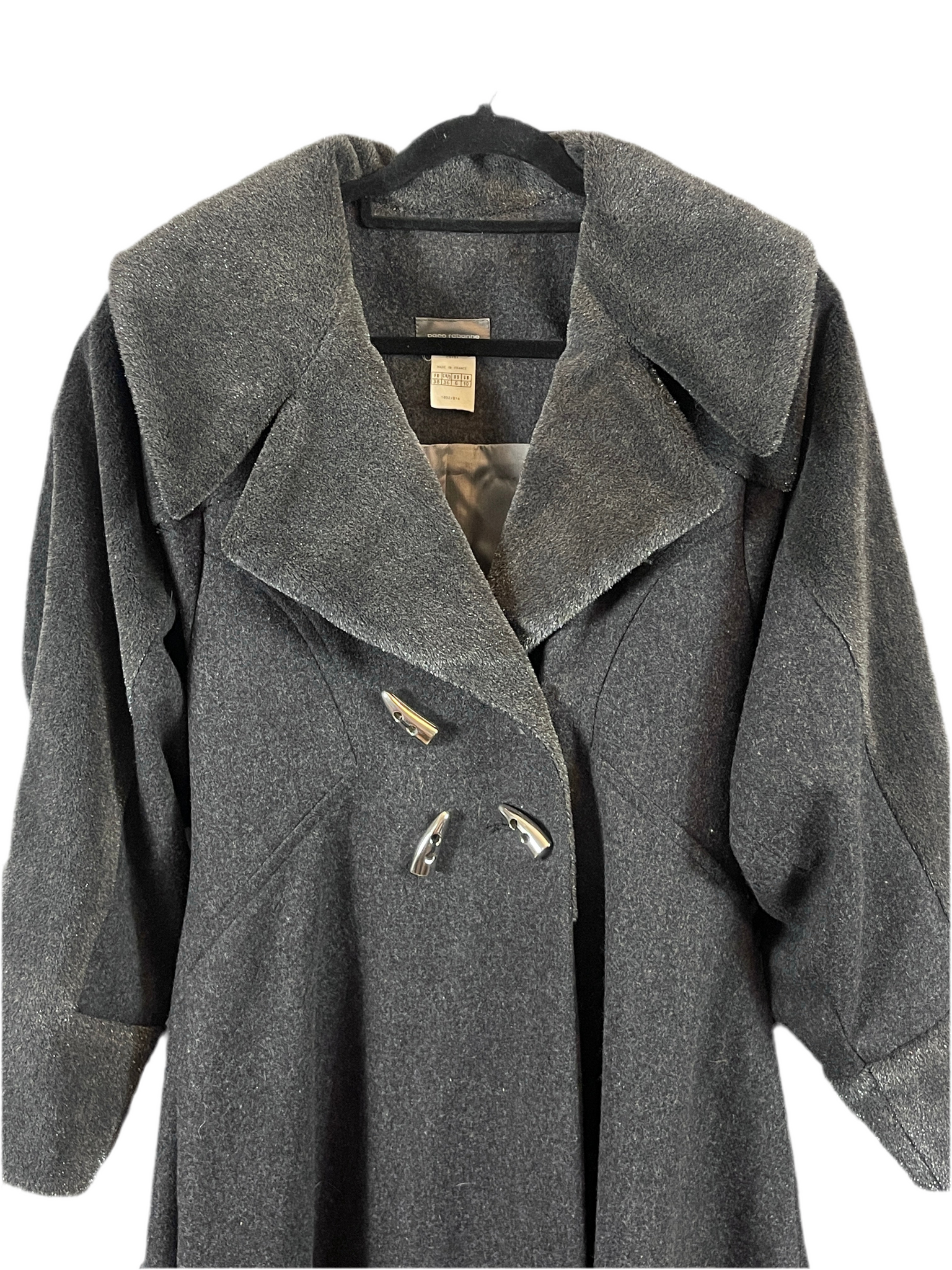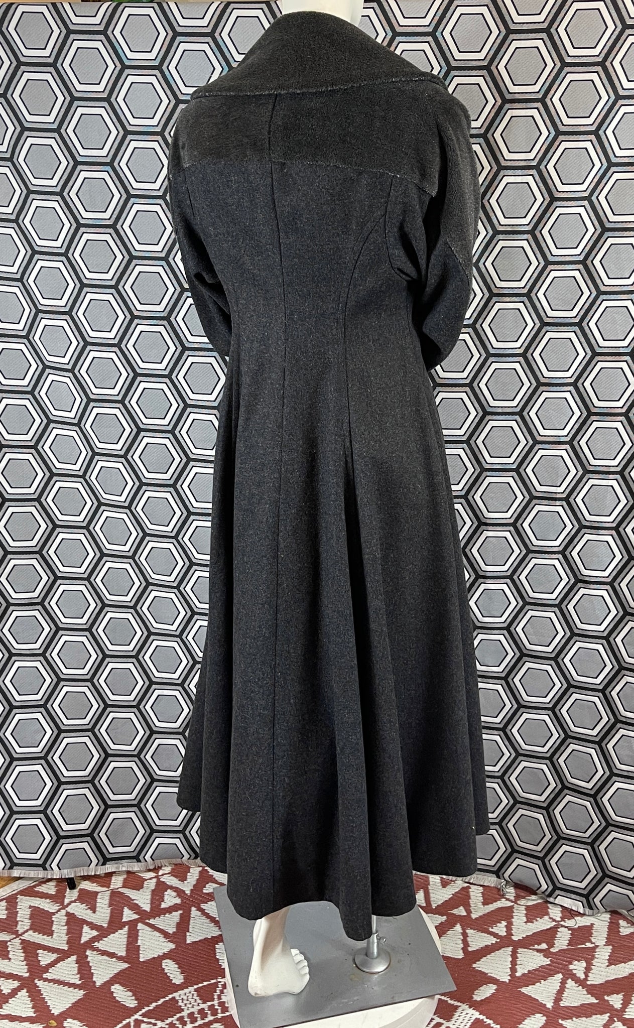 100% laine : certaines parties du manteau sont en laine sèche de couleur grise et mate, tandis que d’autres (le dessus des manches, le col, le haut du dos), sont en laine façon fourrure subtilement pailletée.