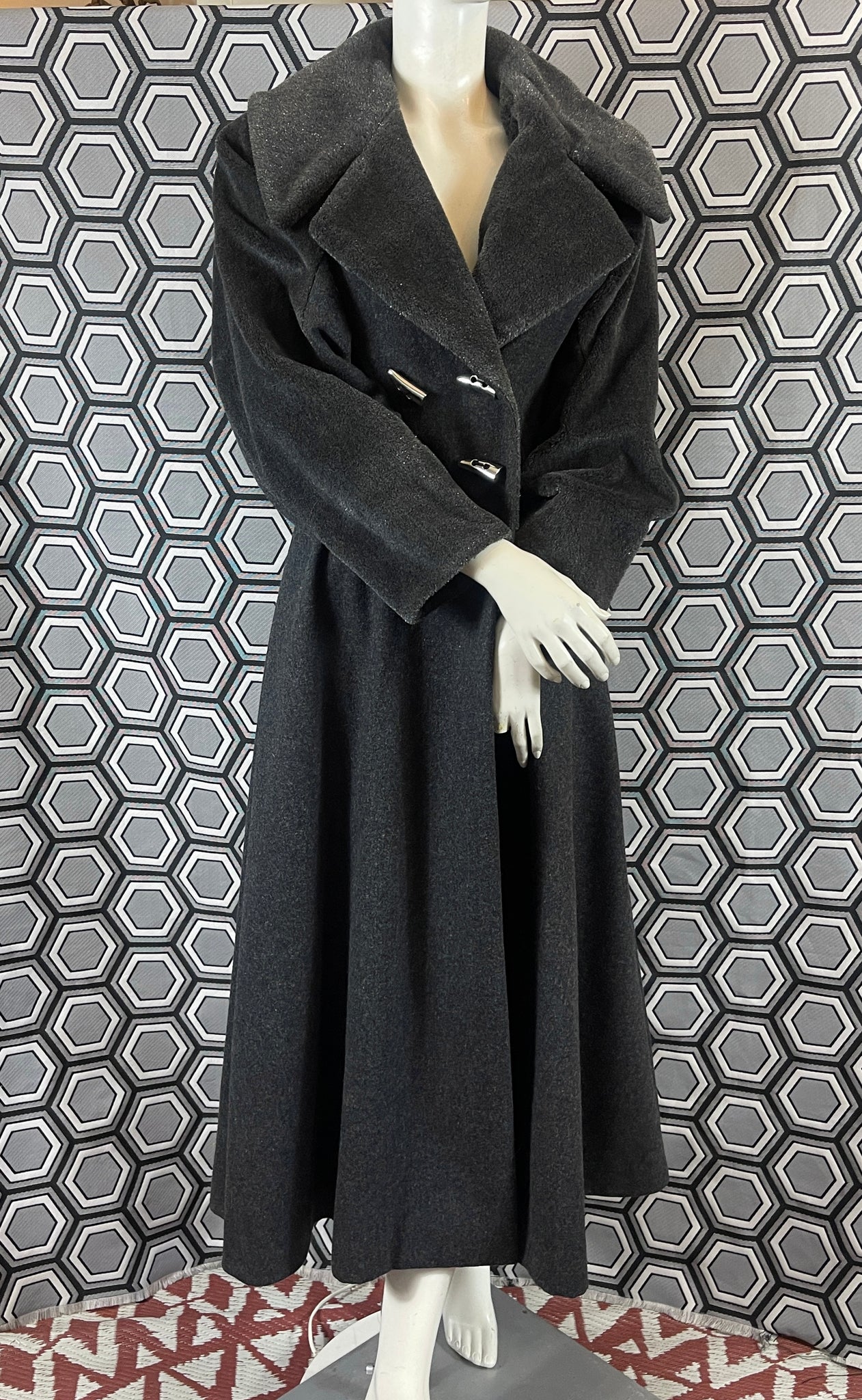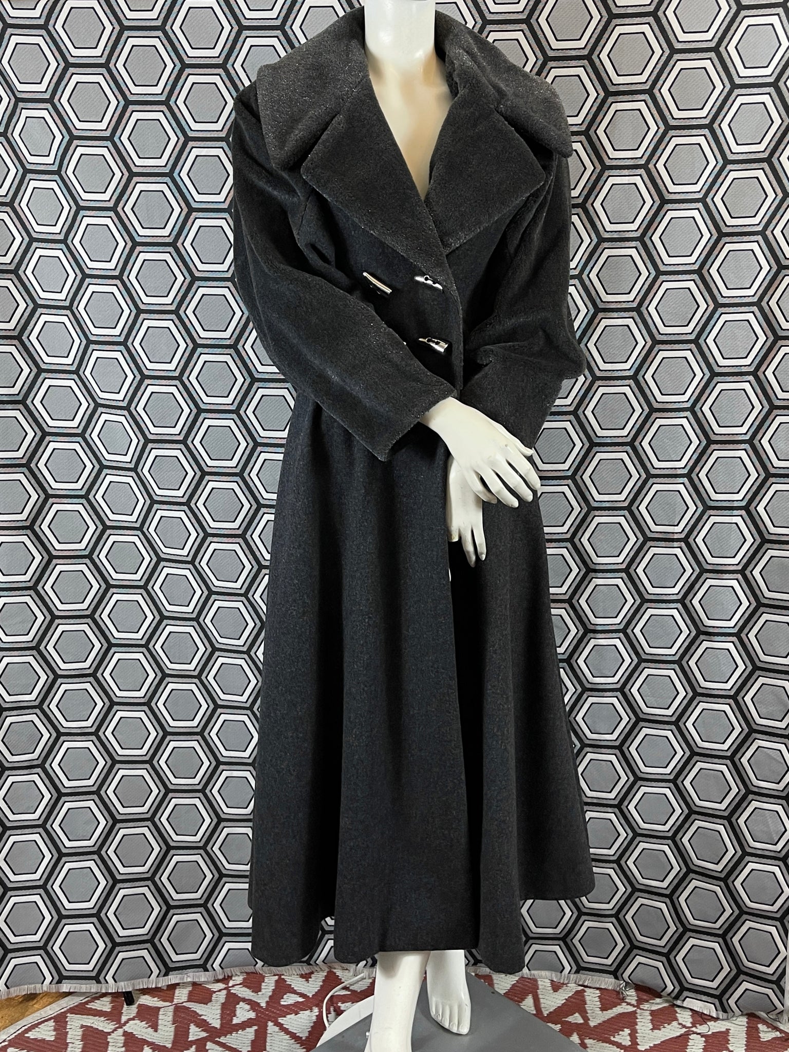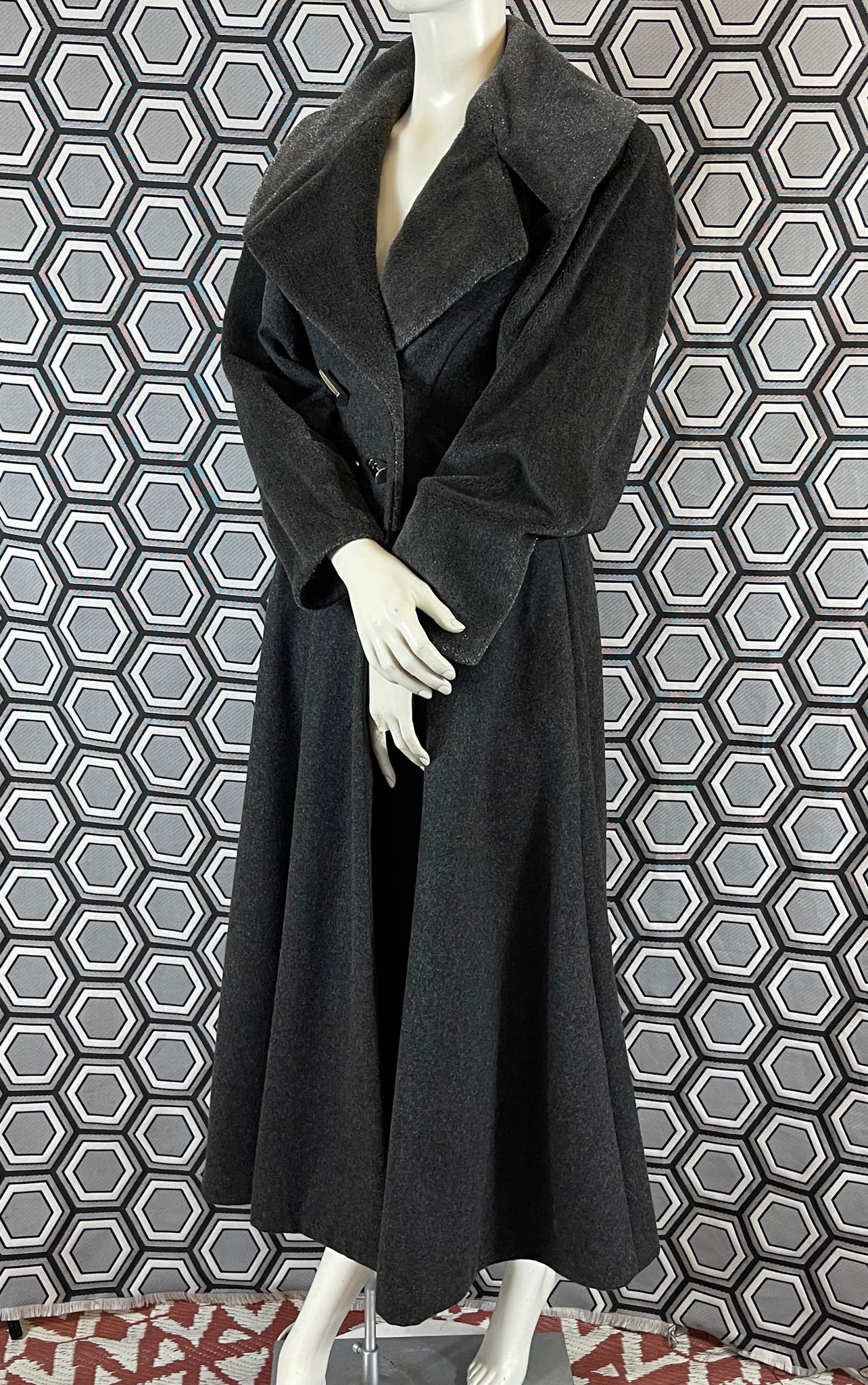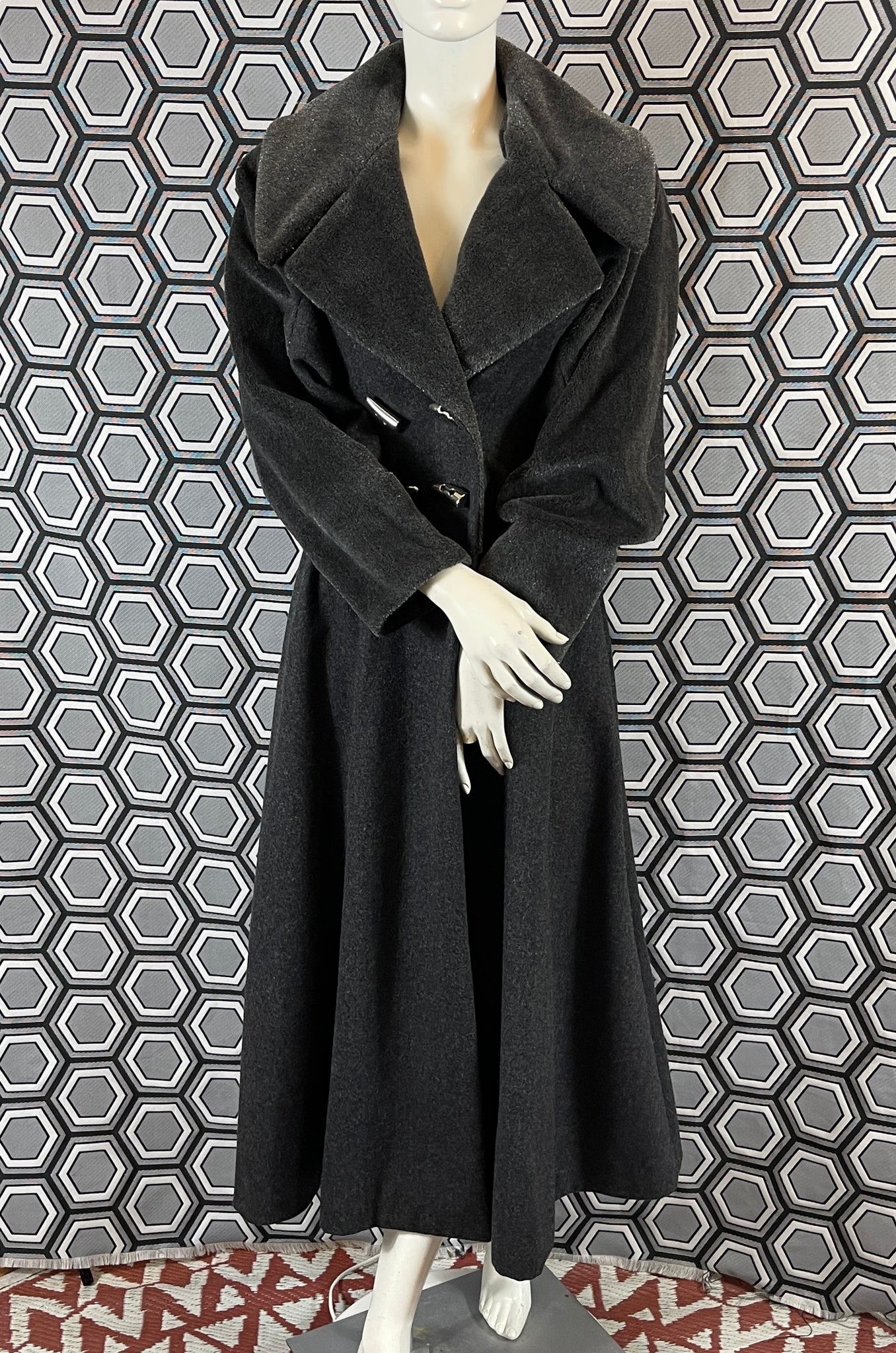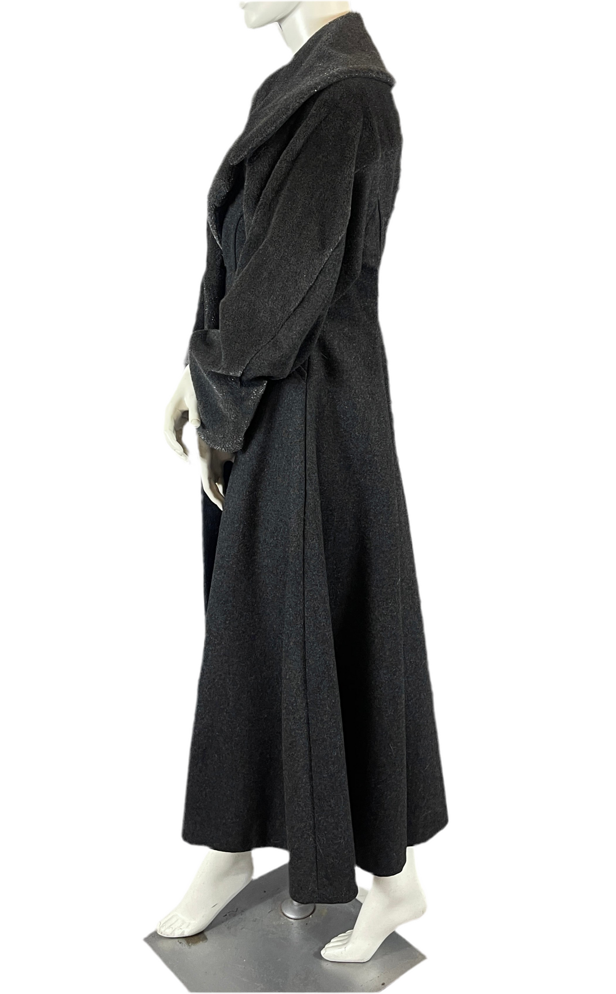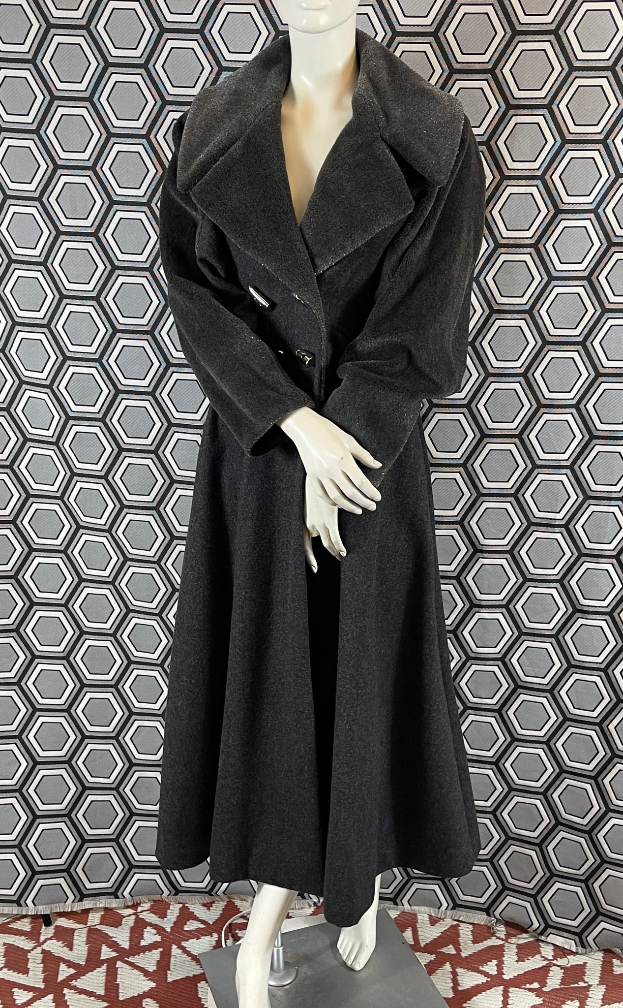 100% laine : certaines parties du manteau sont en laine sèche de couleur grise et mate, tandis que d’autres (le dessus des manches, le col, le haut du dos), sont en laine façon fourrure subtilement pailletée.
