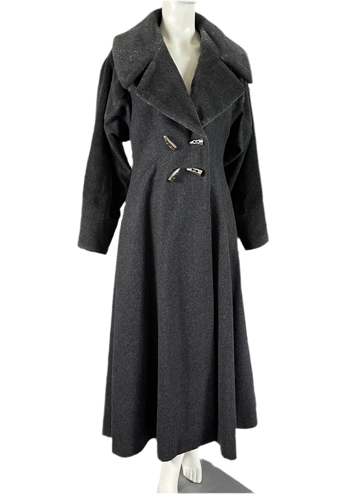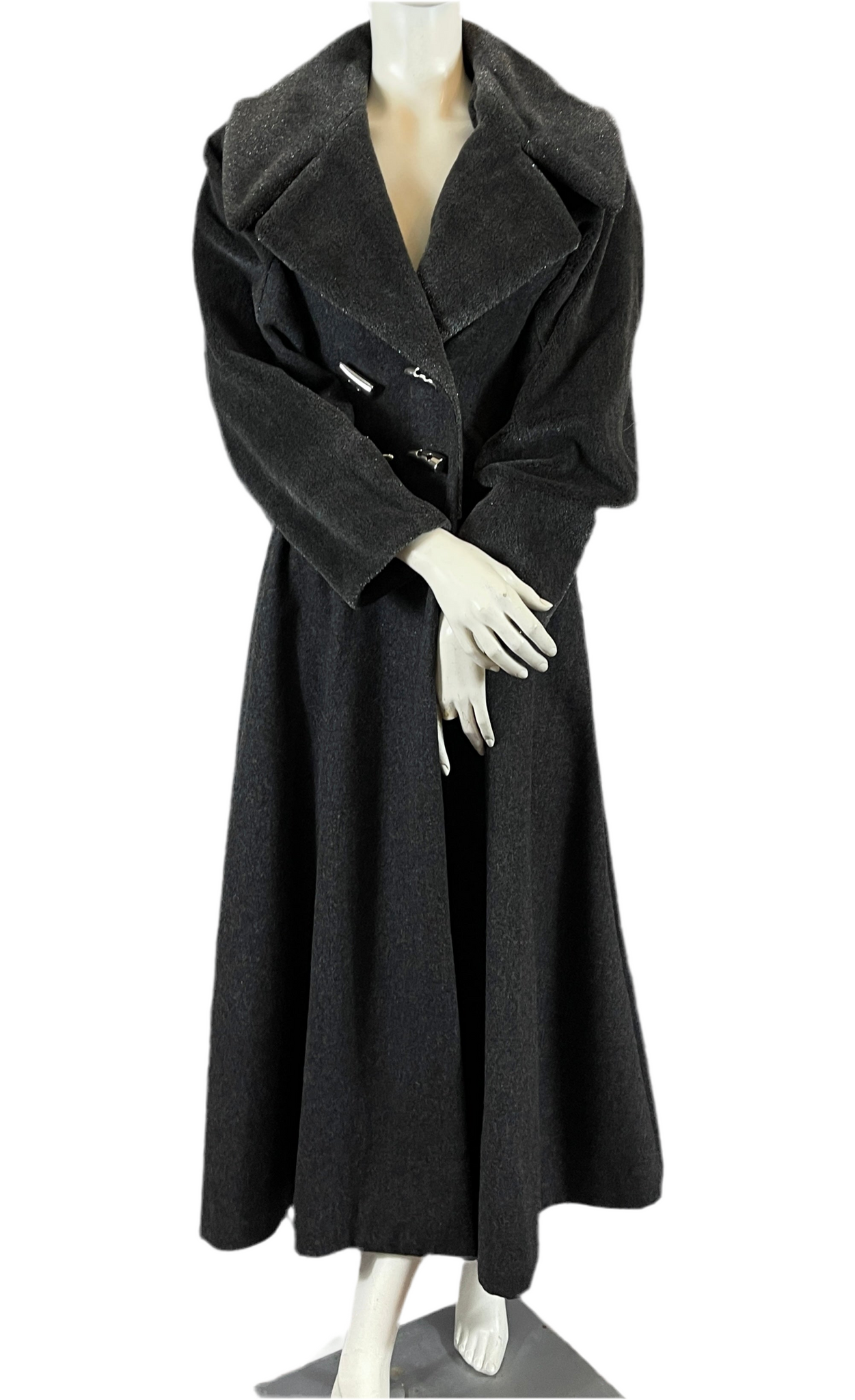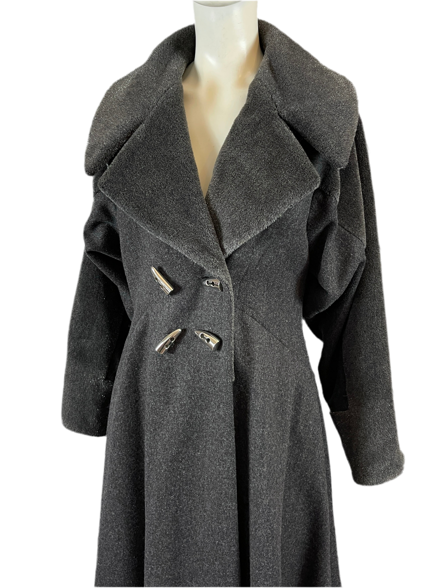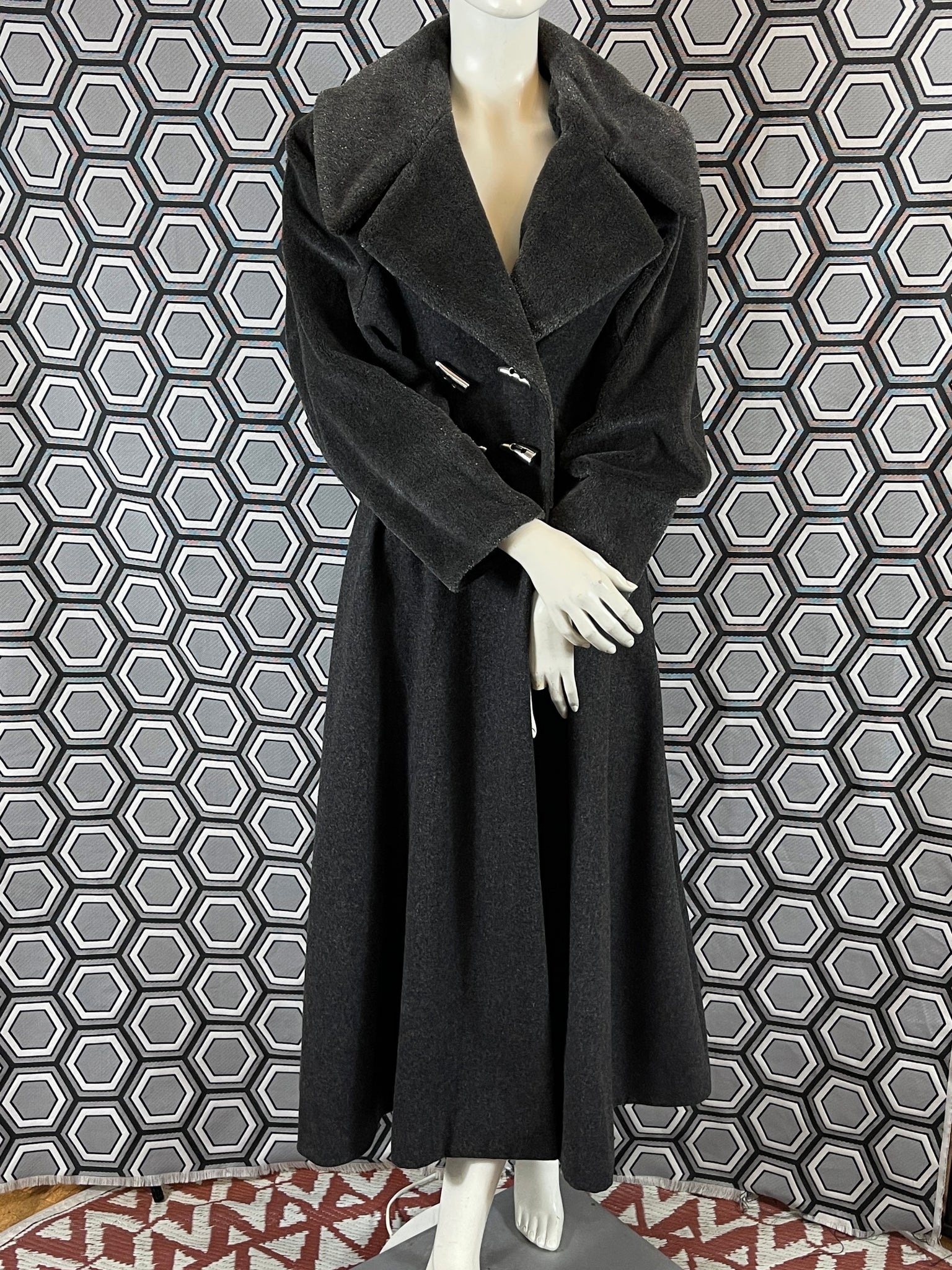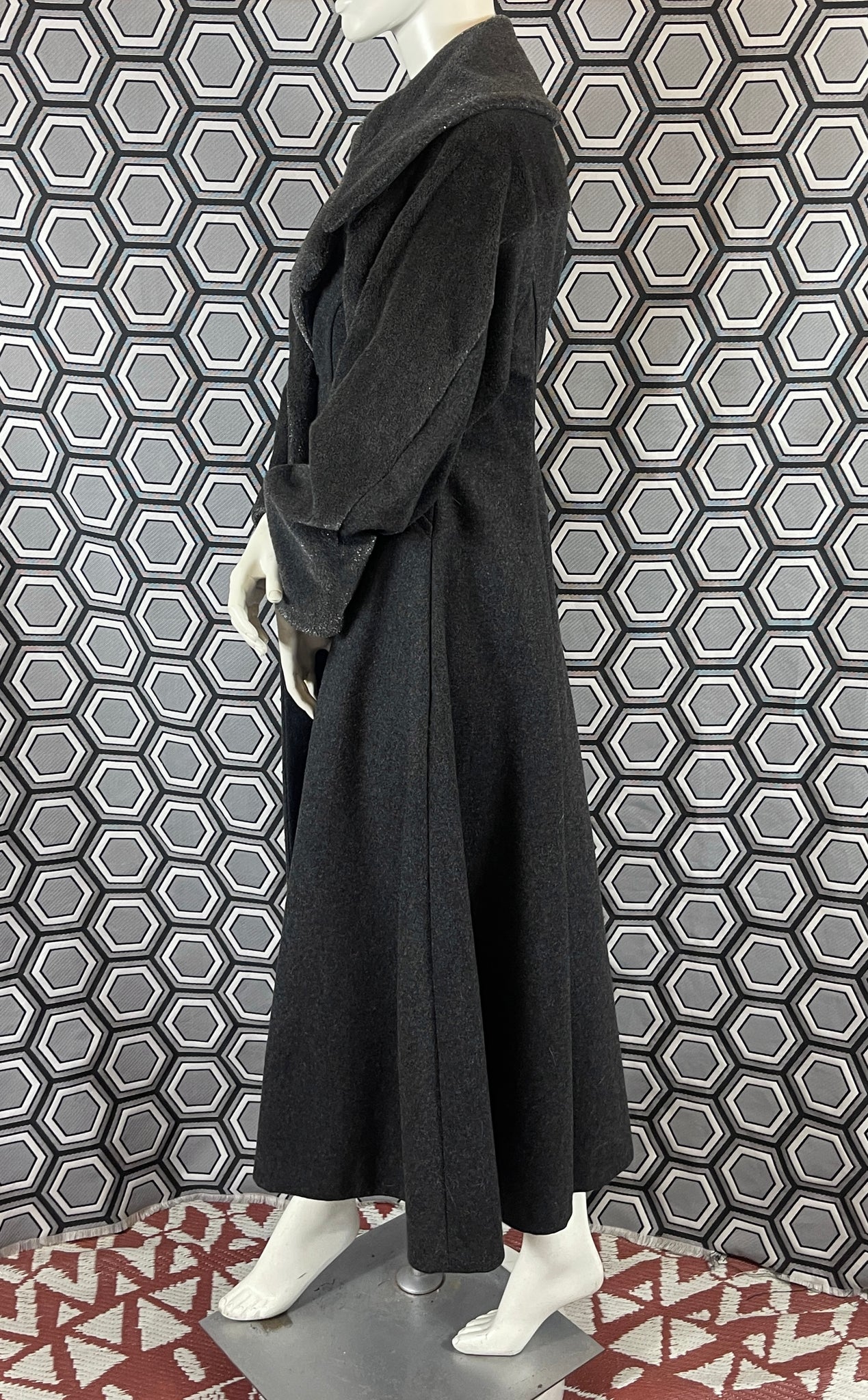 100% laine : certaines parties du manteau sont en laine sèche de couleur grise et mate, tandis que d’autres (le dessus des manches, le col, le haut du dos), sont en laine façon fourrure subtilement pailletée.
