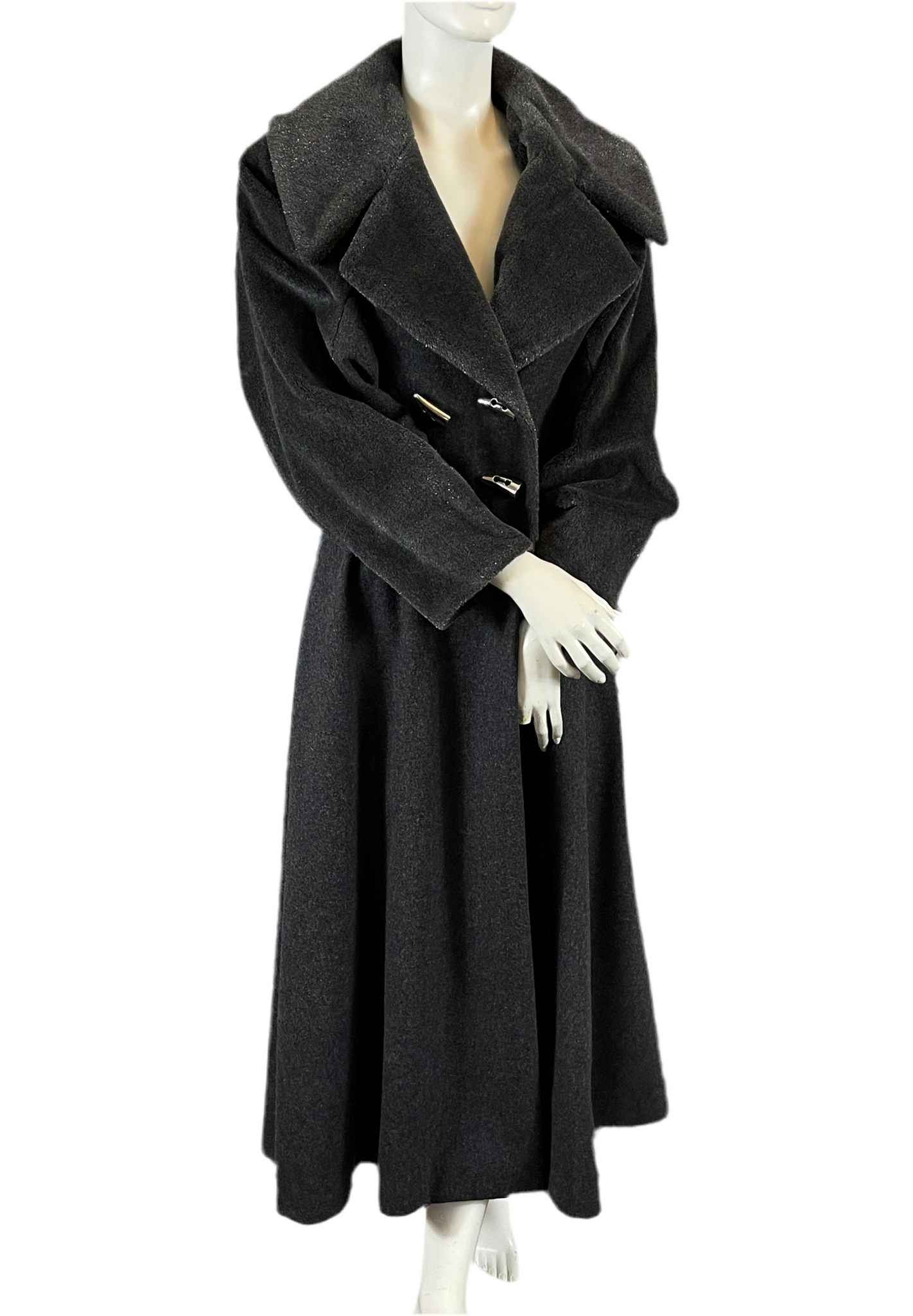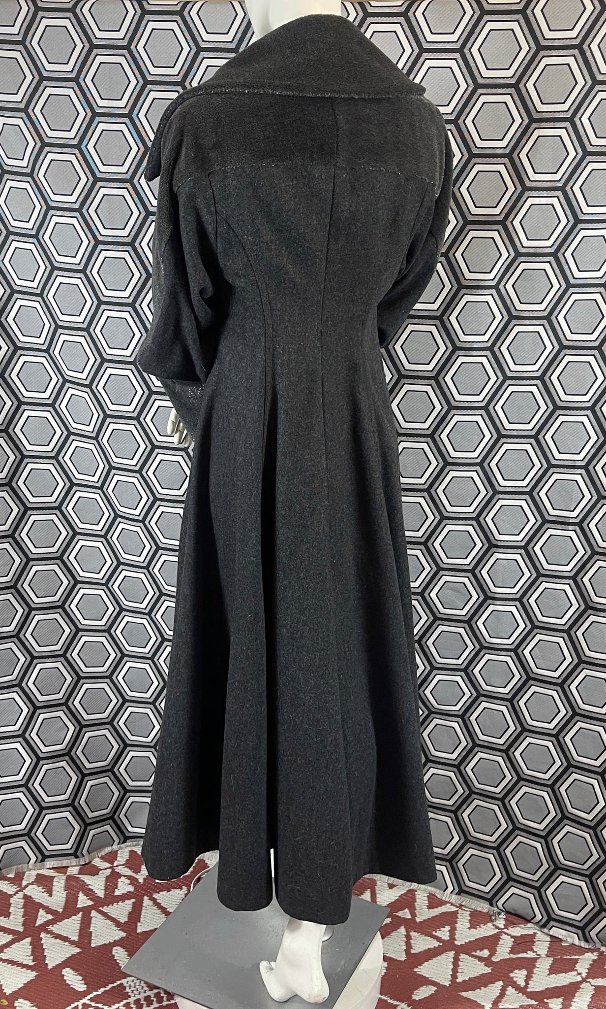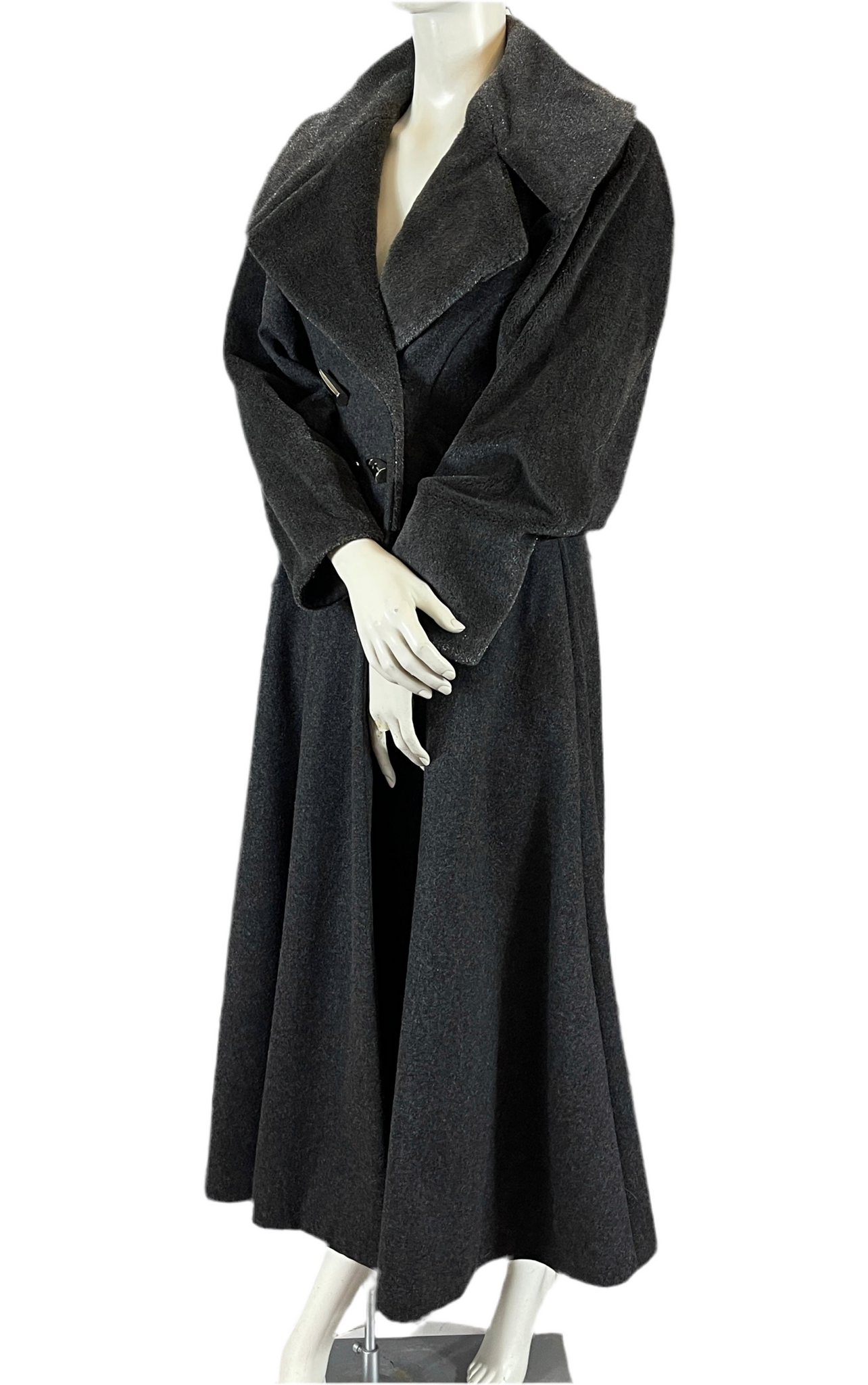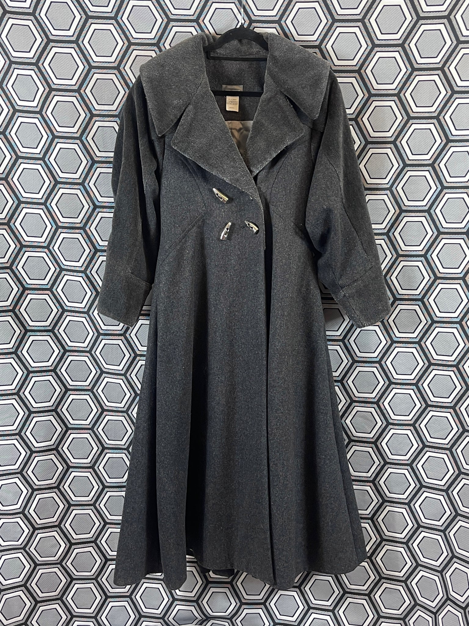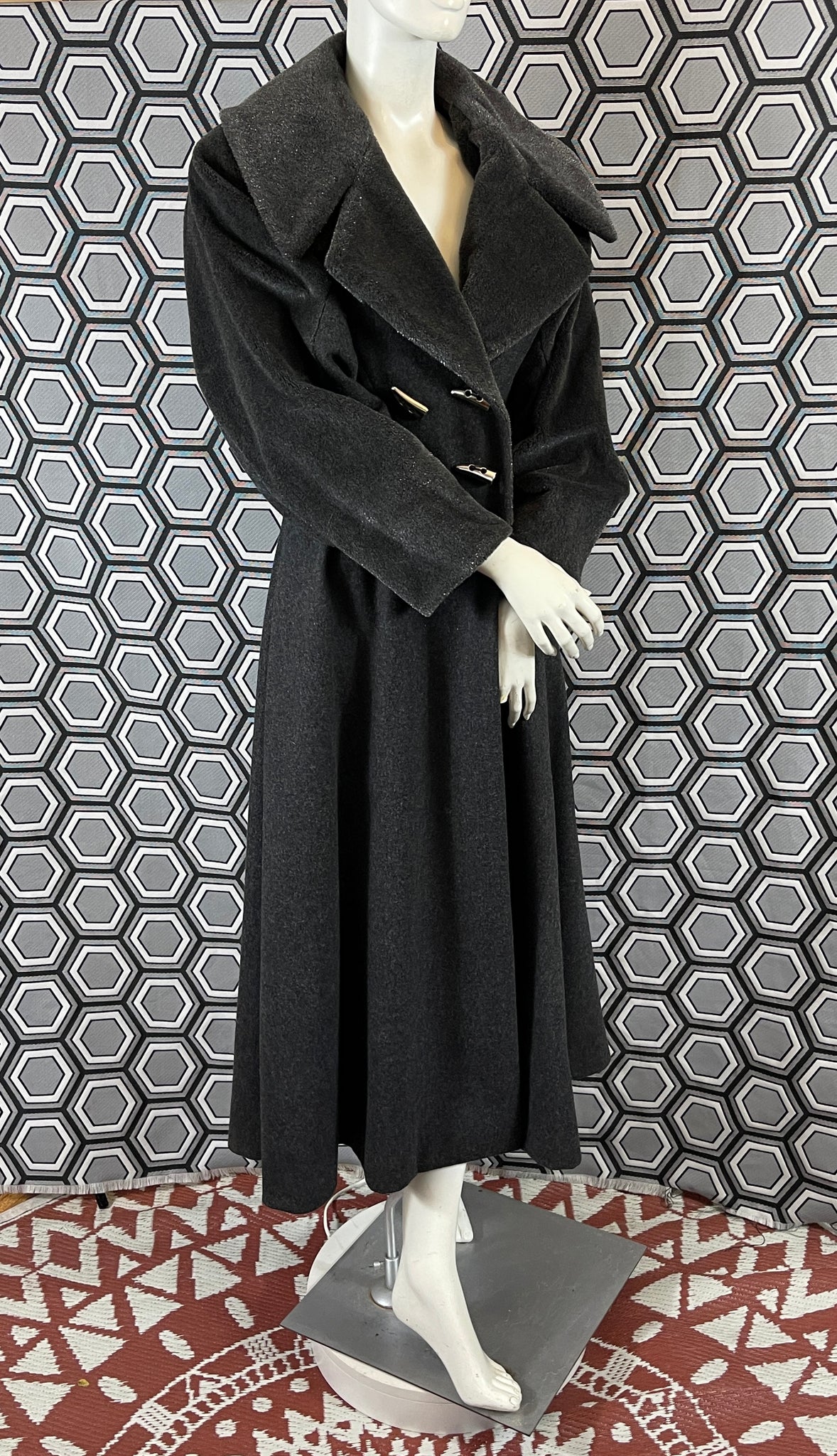 100% laine : certaines parties du manteau sont en laine sèche de couleur grise et mate, tandis que d’autres (le dessus des manches, le col, le haut du dos), sont en laine façon fourrure subtilement pailletée.