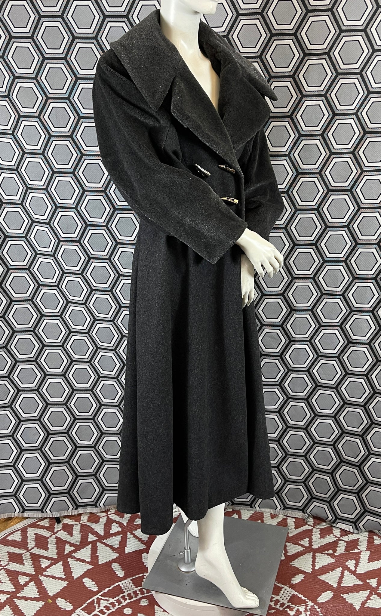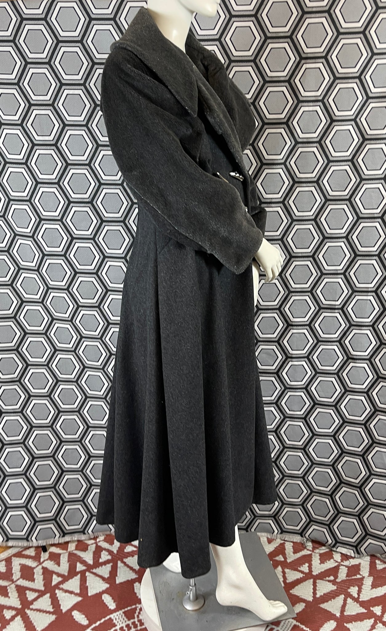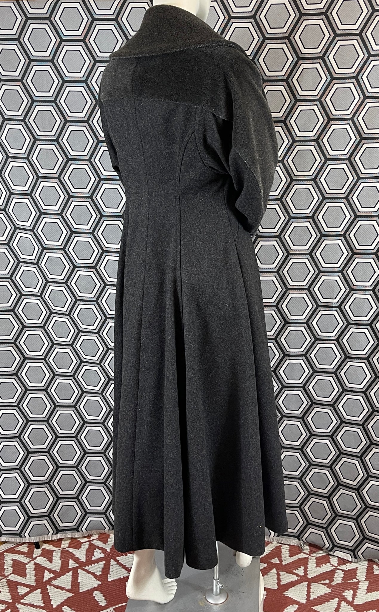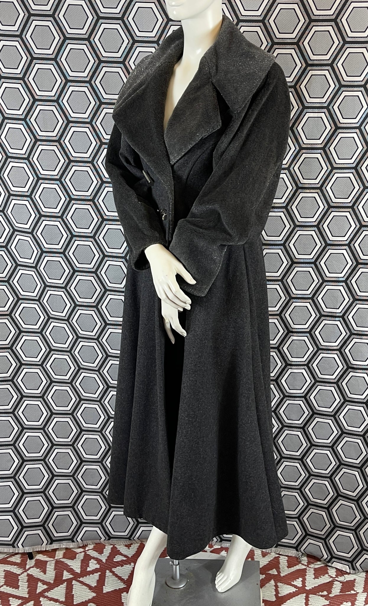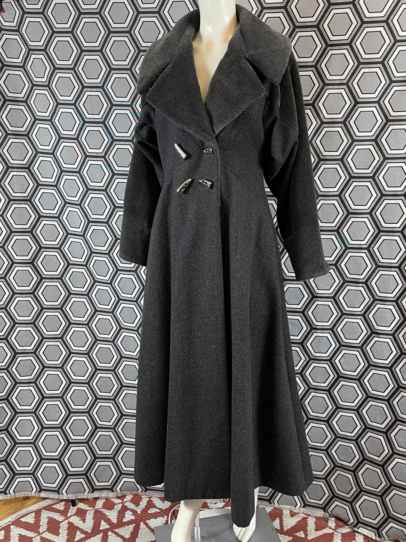 100% laine : certaines parties du manteau sont en laine sèche de couleur grise et mate, tandis que d’autres (le dessus des manches, le col, le haut du dos), sont en laine façon fourrure subtilement pailletée.