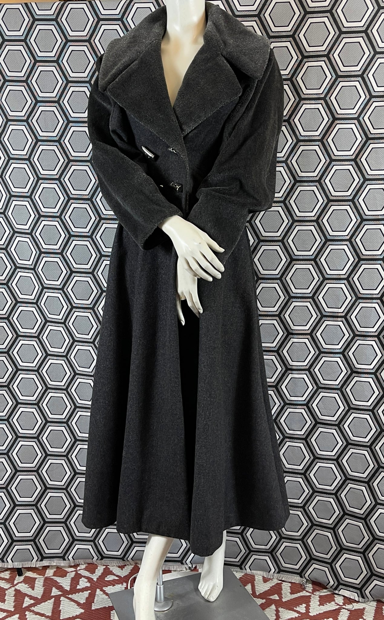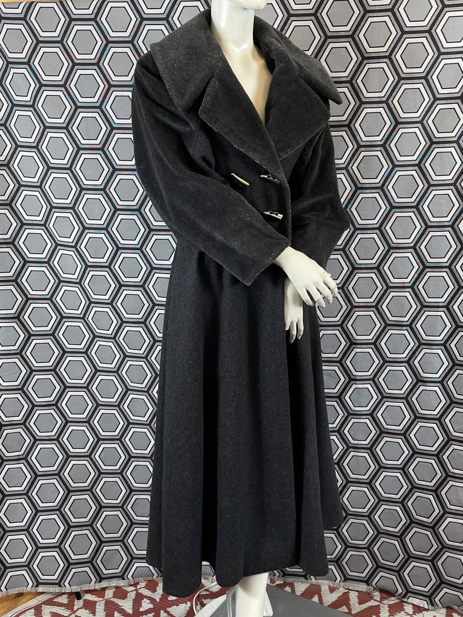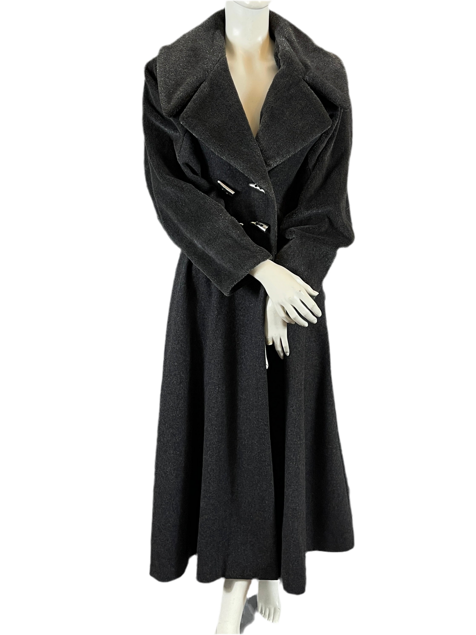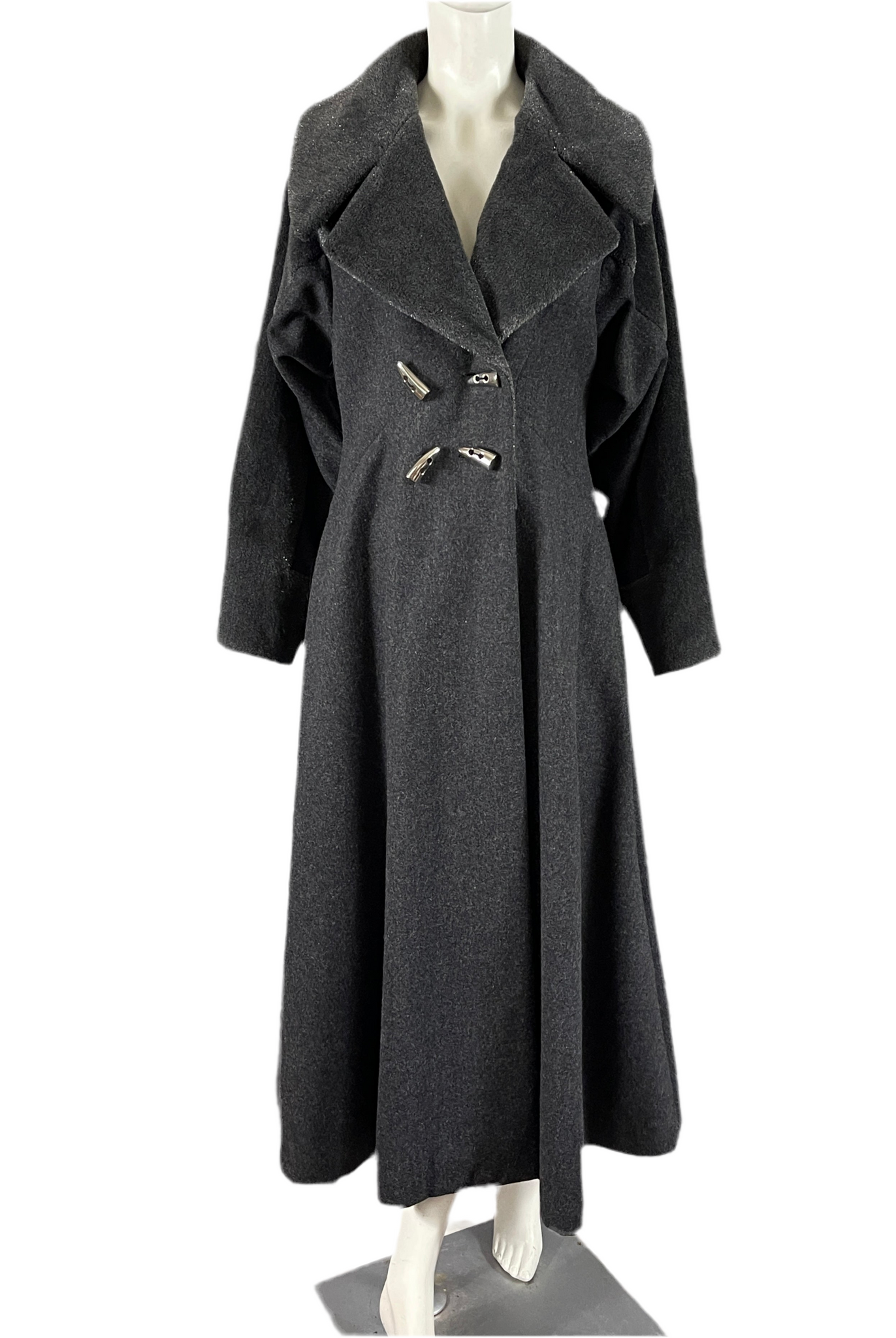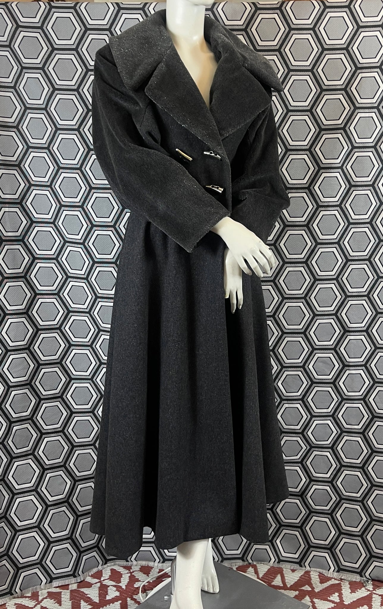 100% laine : certaines parties du manteau sont en laine sèche de couleur grise et mate, tandis que d’autres (le dessus des manches, le col, le haut du dos), sont en laine façon fourrure subtilement pailletée.