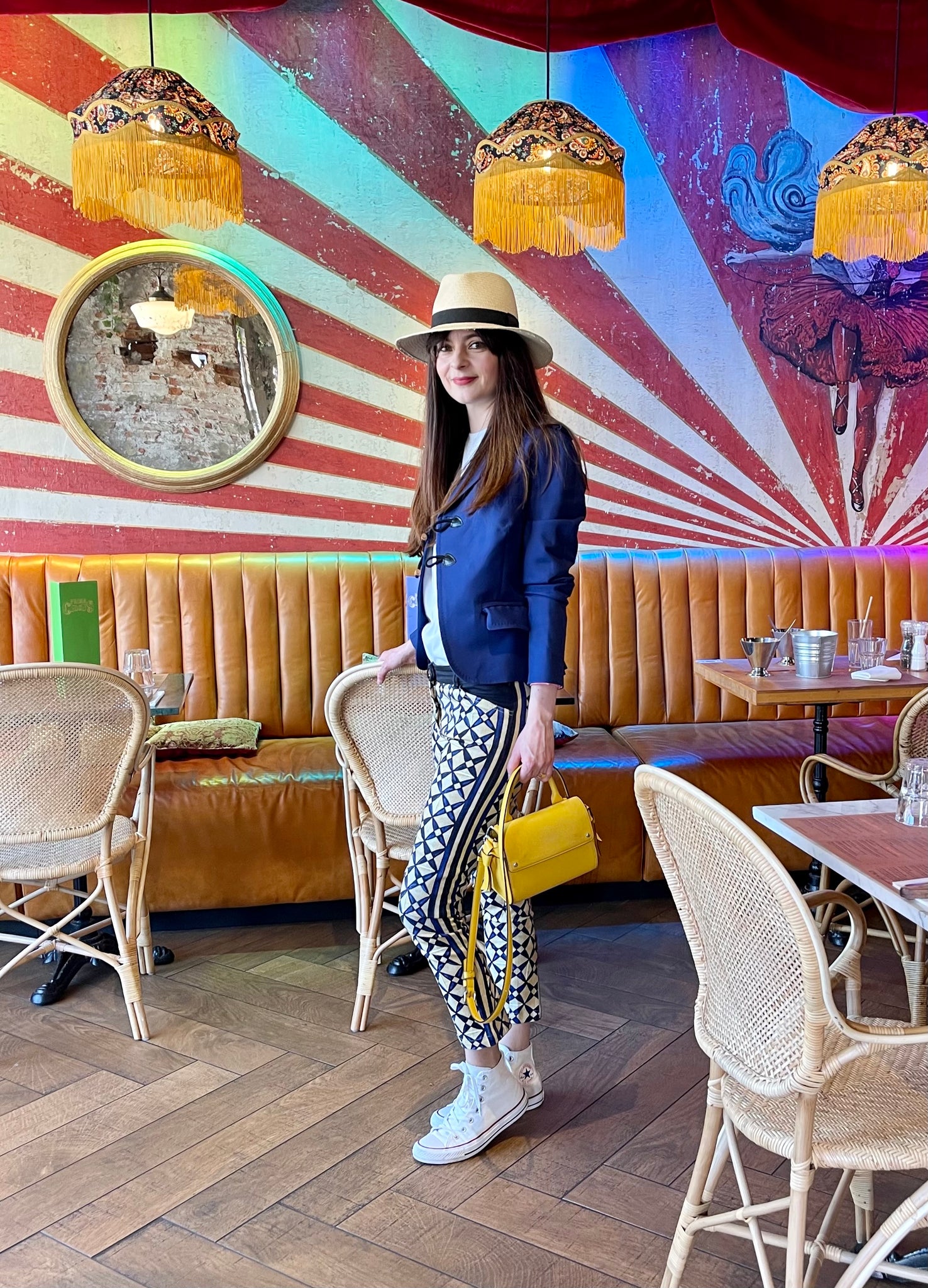 Très bel imprimé à motifs géométriques et rayures smocking sur les côtés.