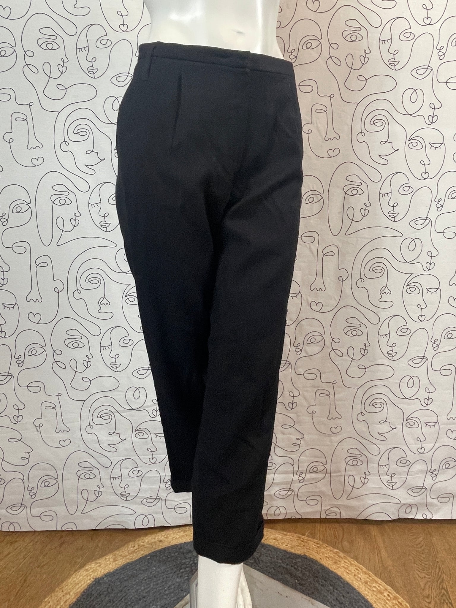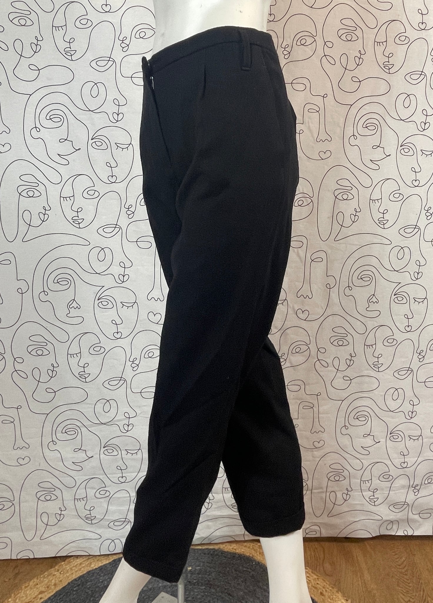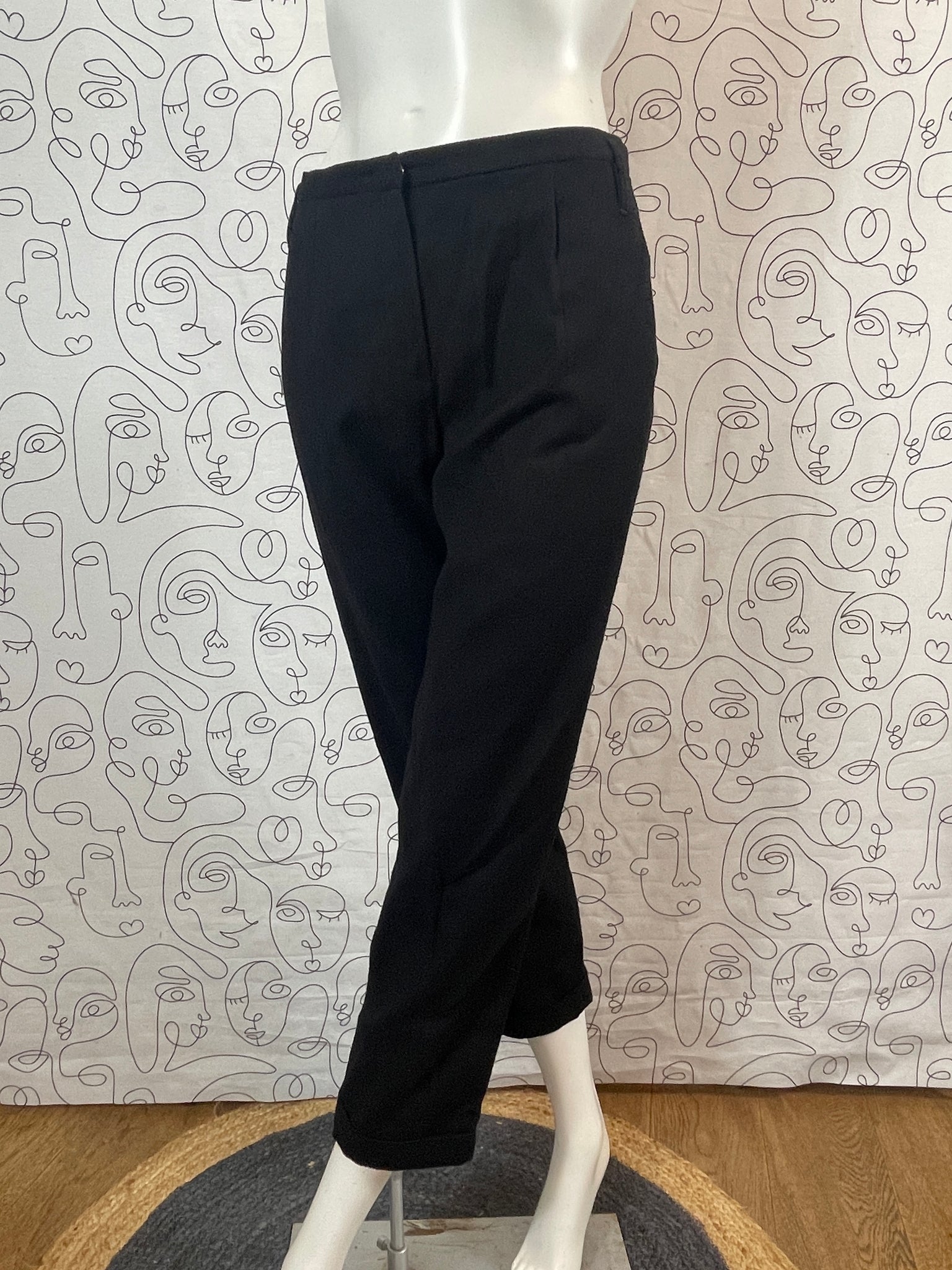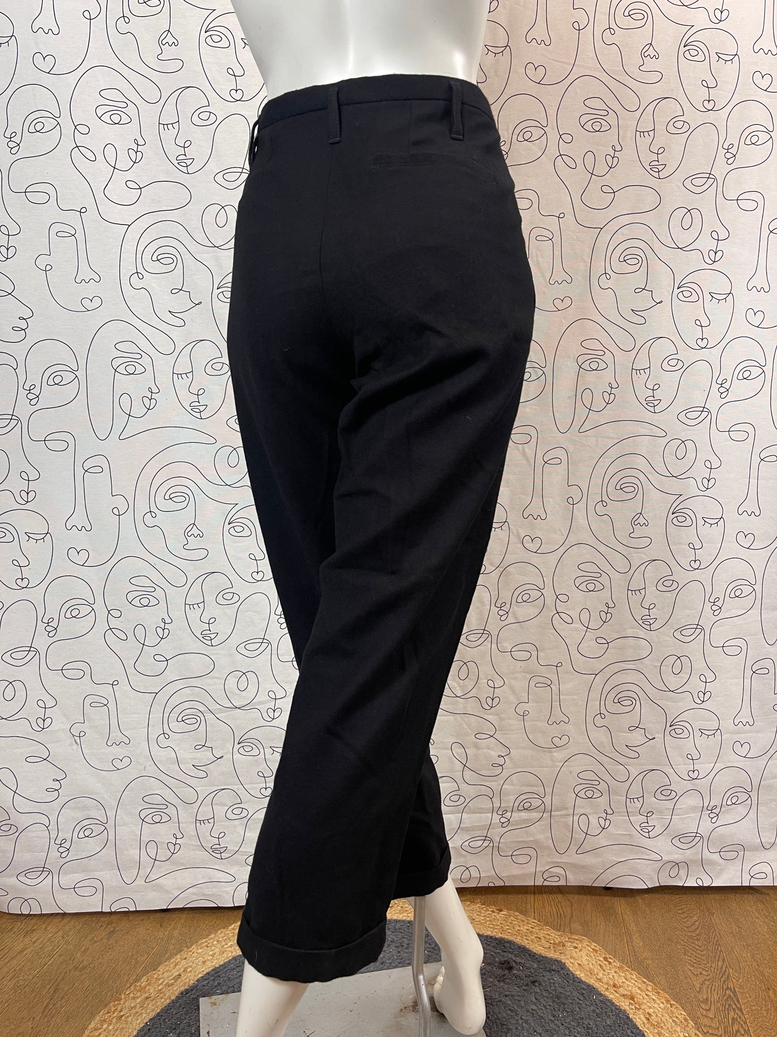 Mesures à plat : largeur taille 43 cms, largeur hanches 52 cms, hauteur fourche (de l’entrejambe à la taille à l’avant) 28 cms, longueur 87 cms et largeur bas de jambes 20 cms.