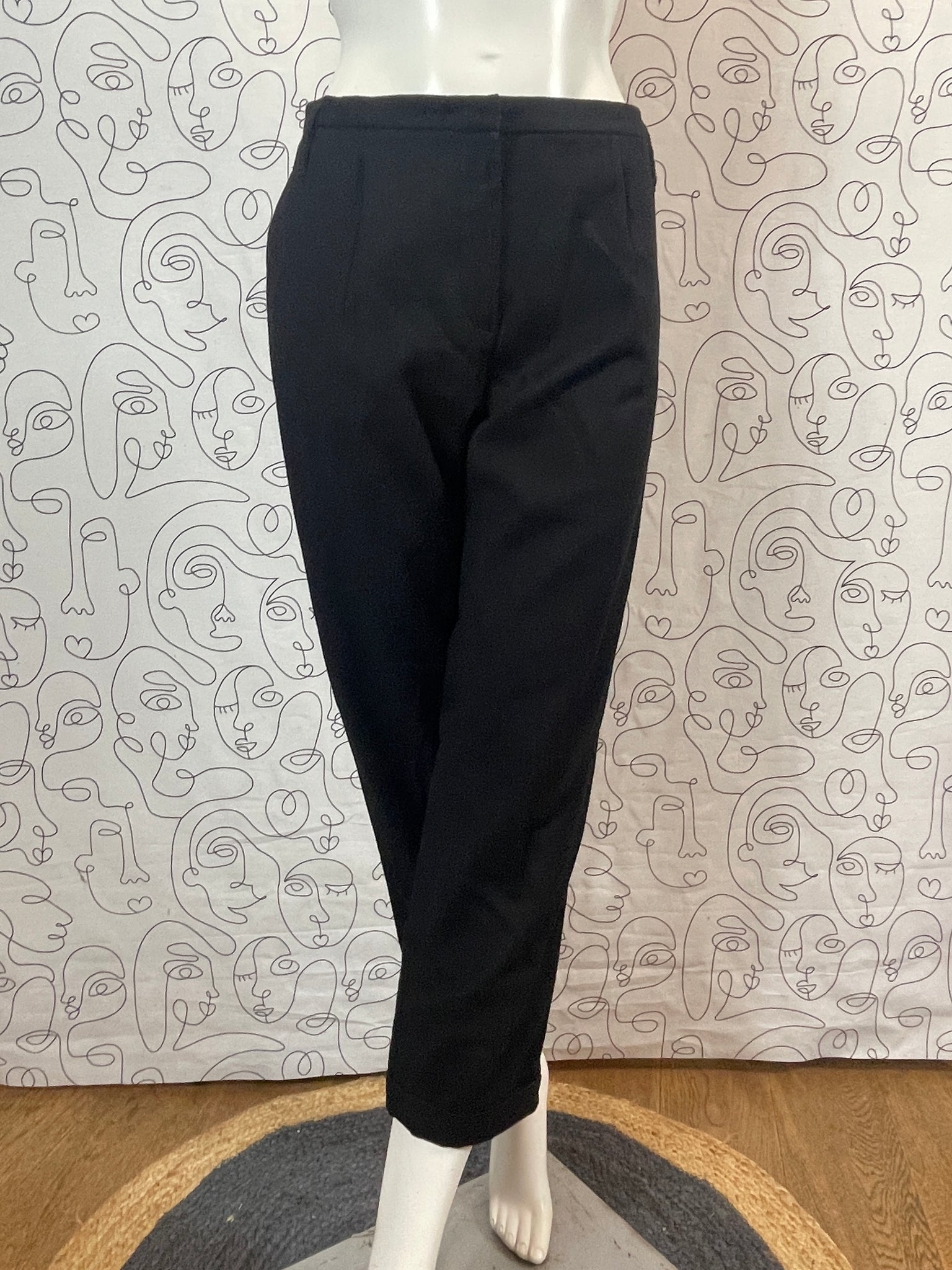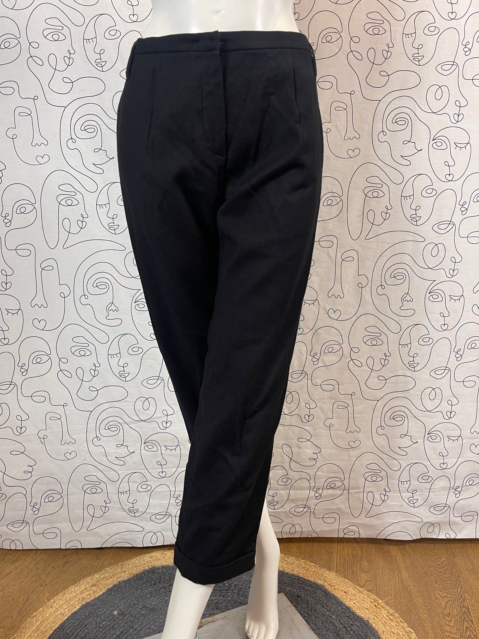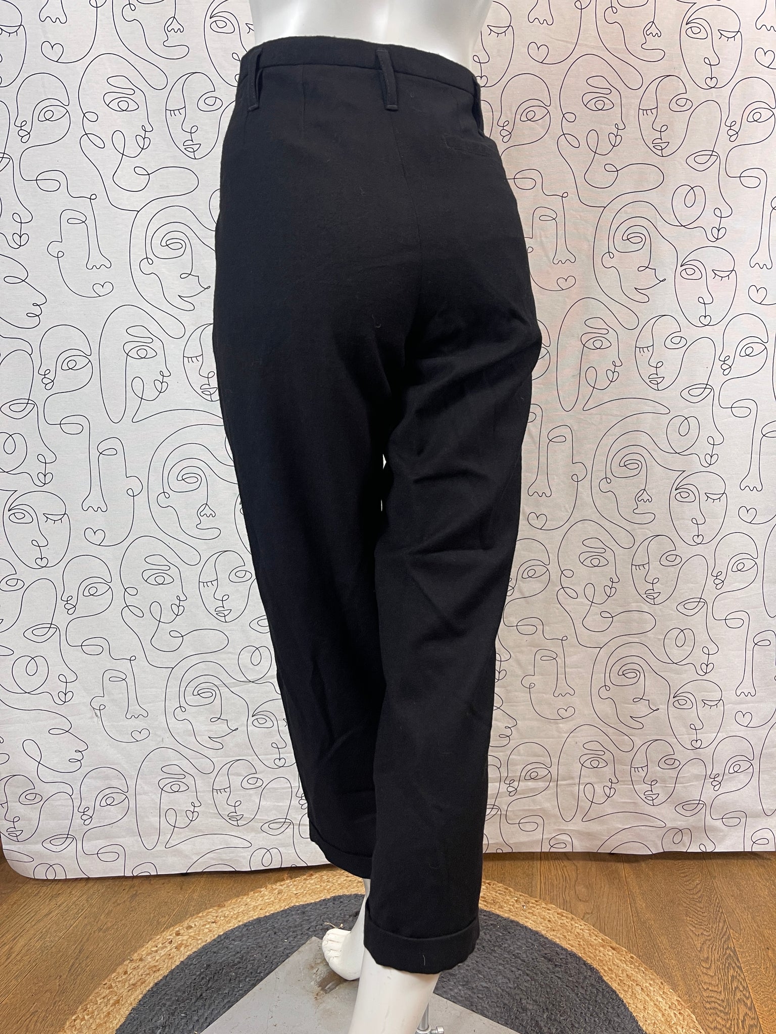 Mesures à plat : largeur taille 43 cms, largeur hanches 52 cms, hauteur fourche (de l’entrejambe à la taille à l’avant) 28 cms, longueur 87 cms et largeur bas de jambes 20 cms.
