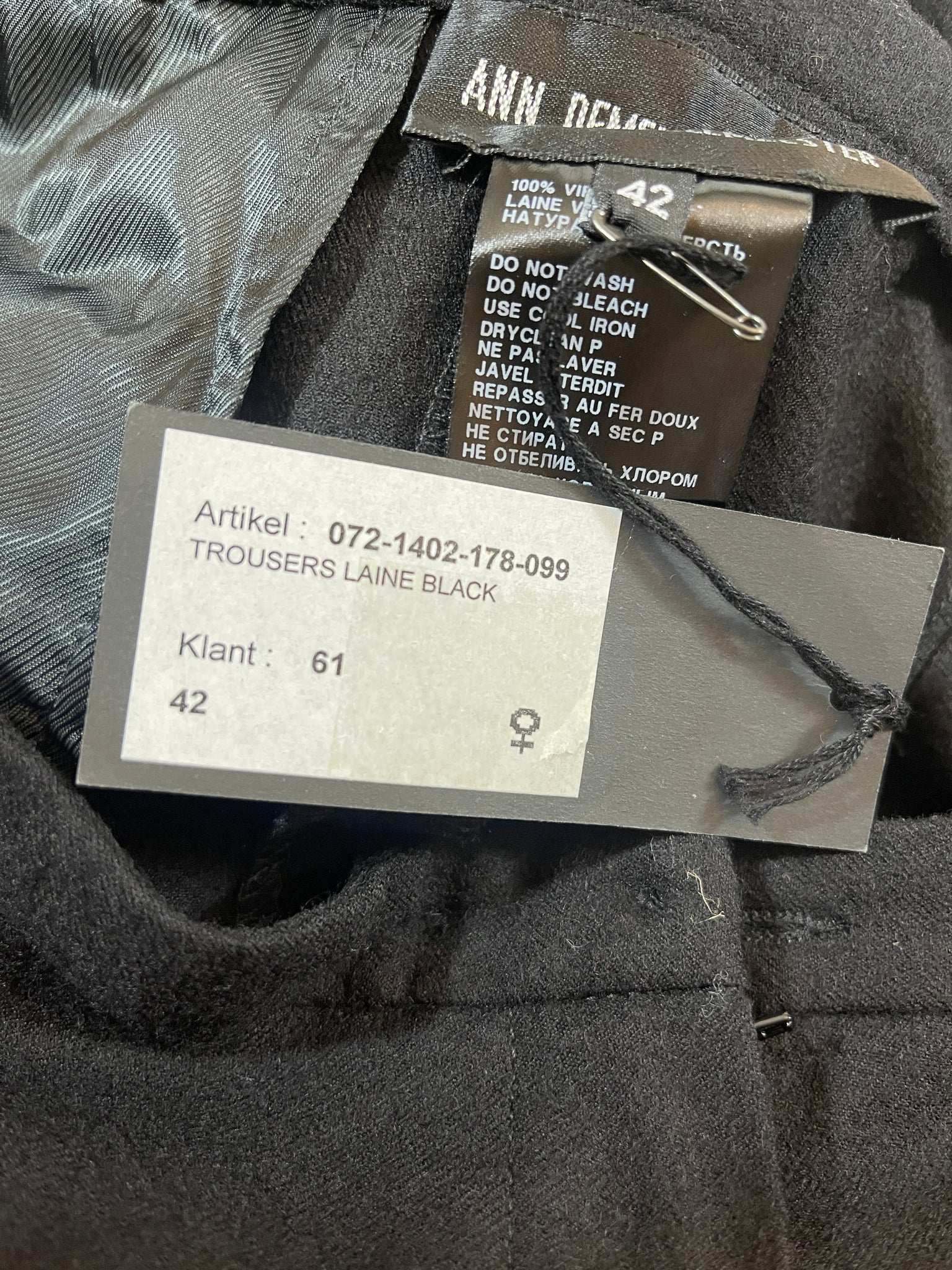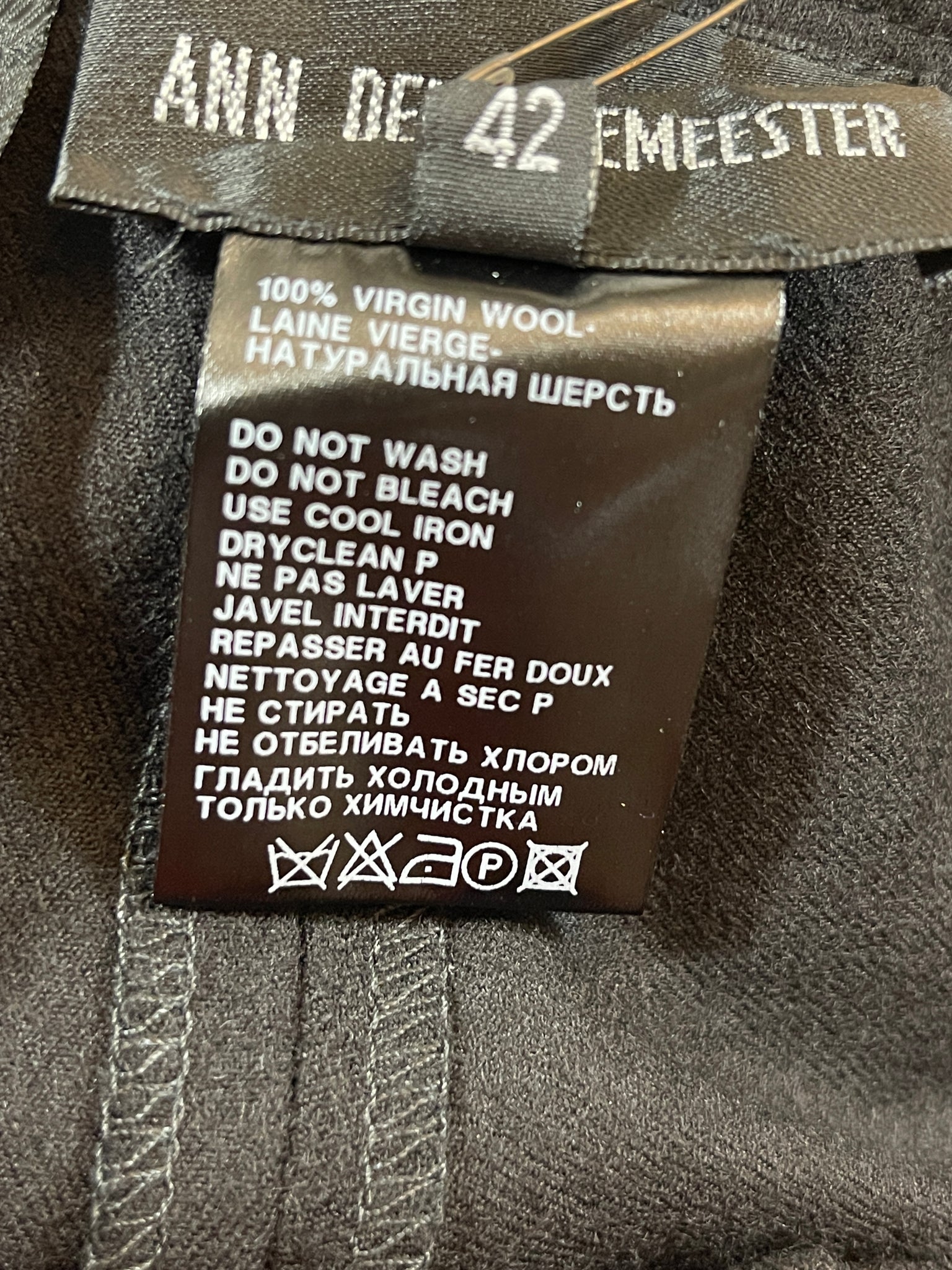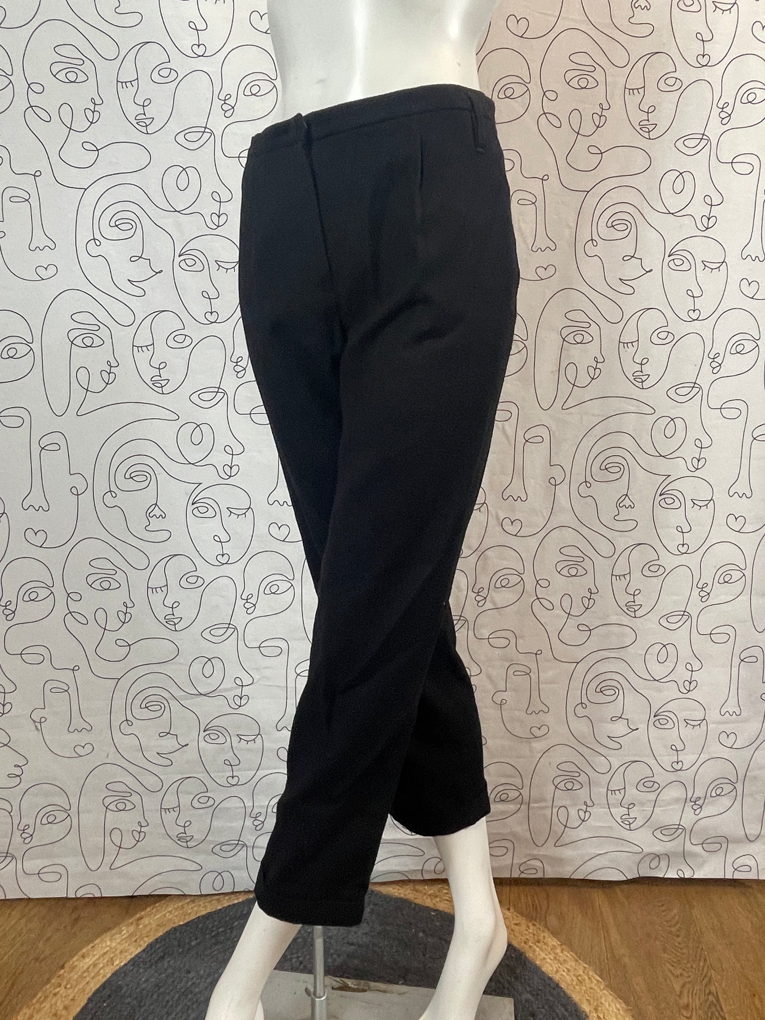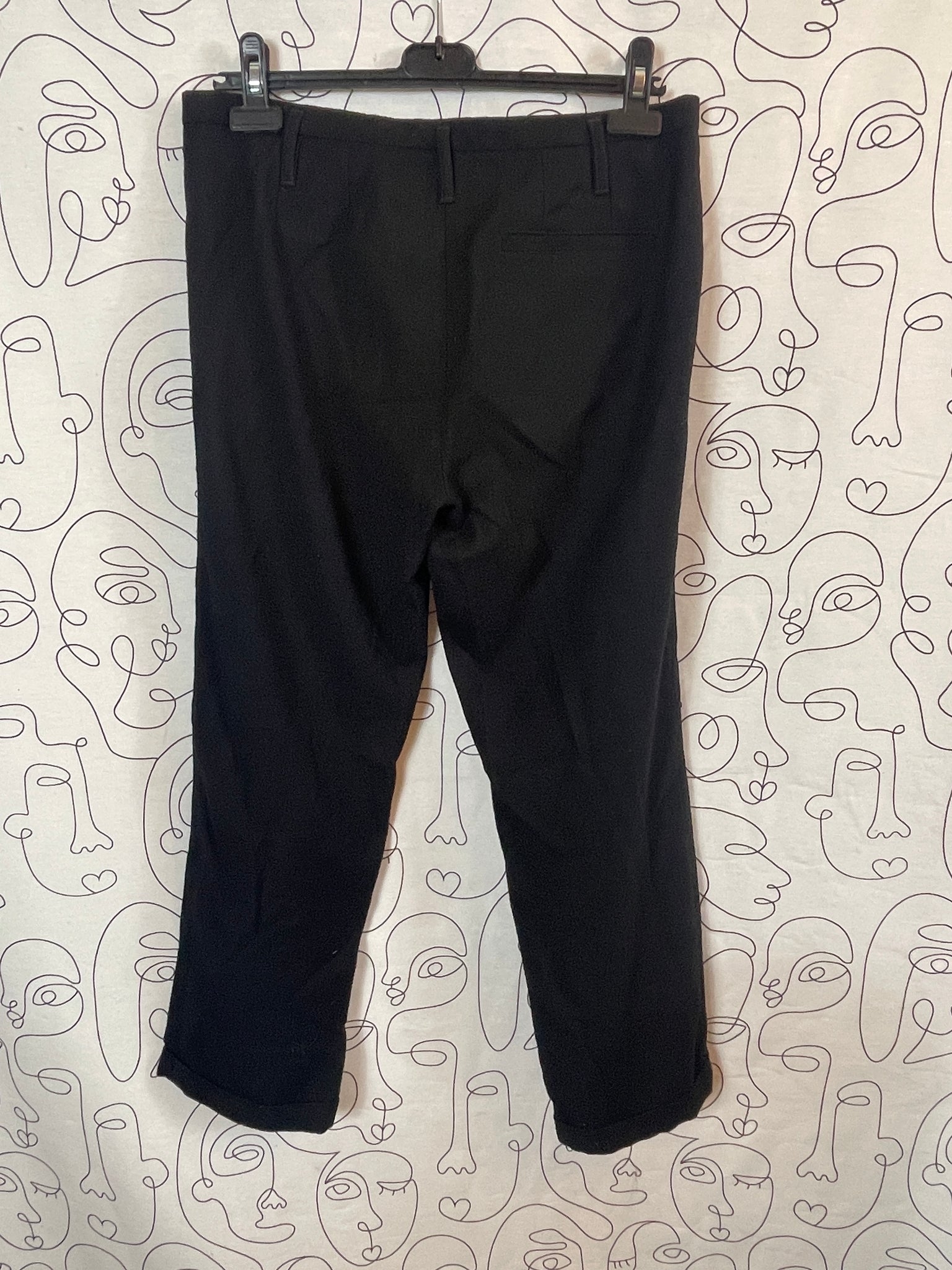 Mesures à plat : largeur taille 43 cms, largeur hanches 52 cms, hauteur fourche (de l’entrejambe à la taille à l’avant) 28 cms, longueur 87 cms et largeur bas de jambes 20 cms.