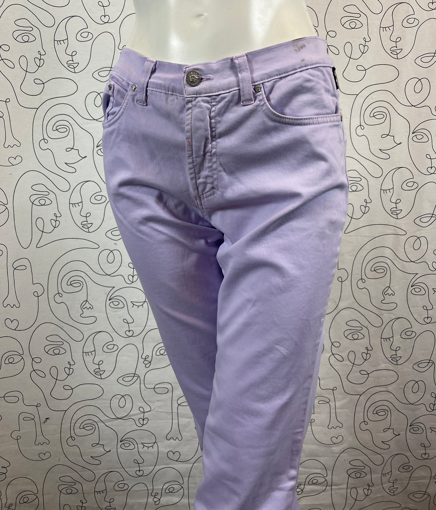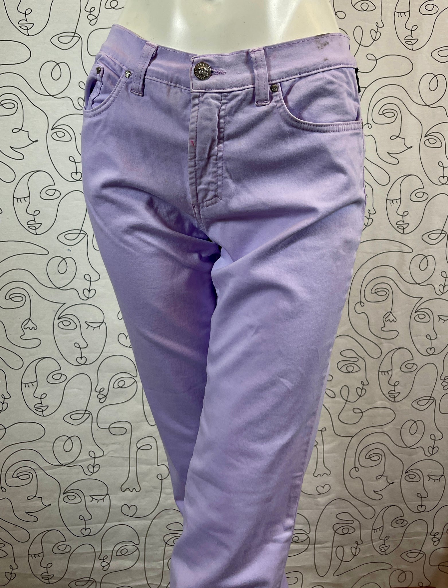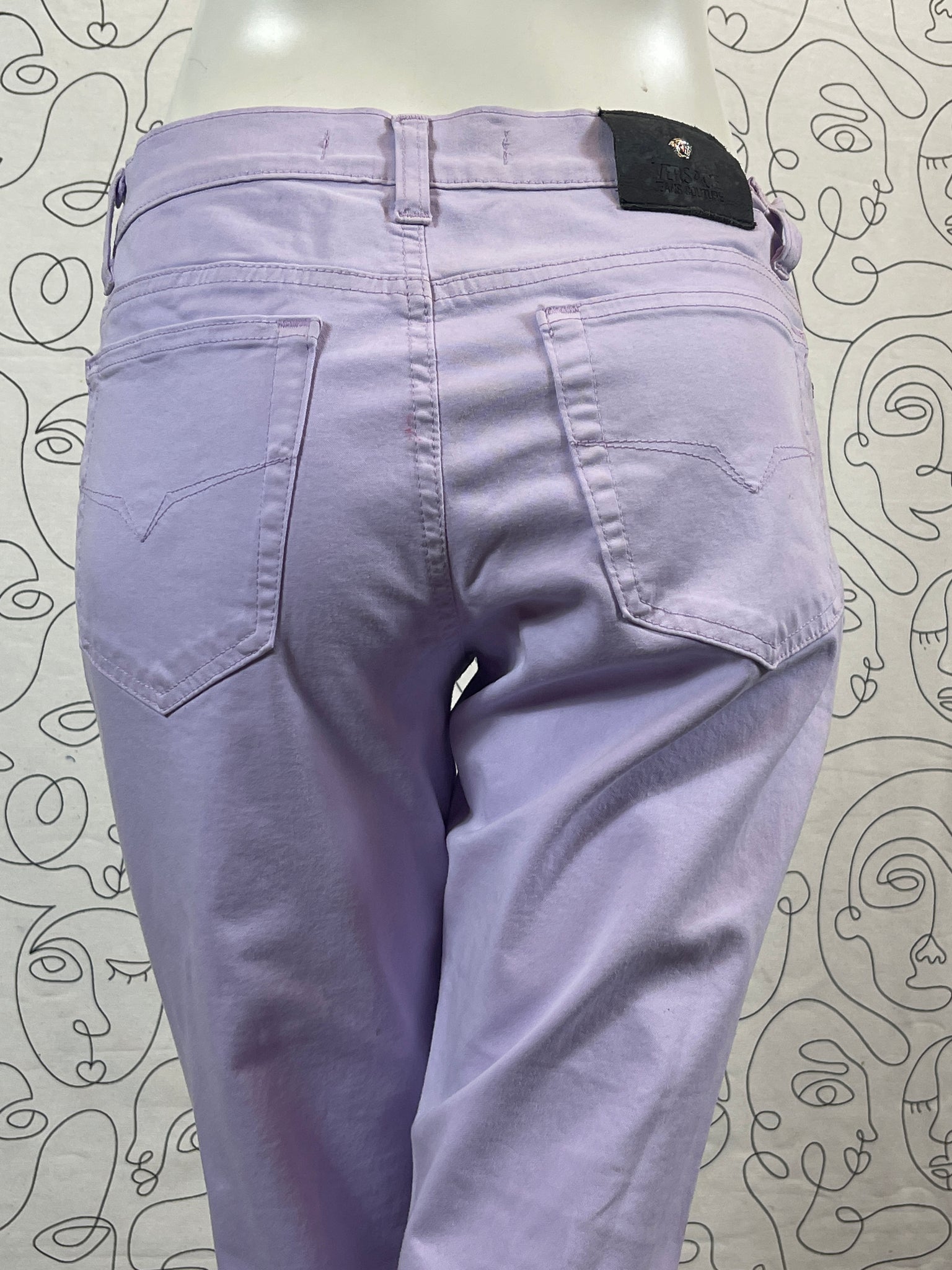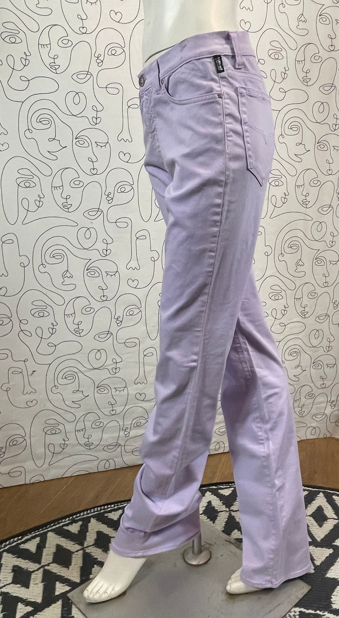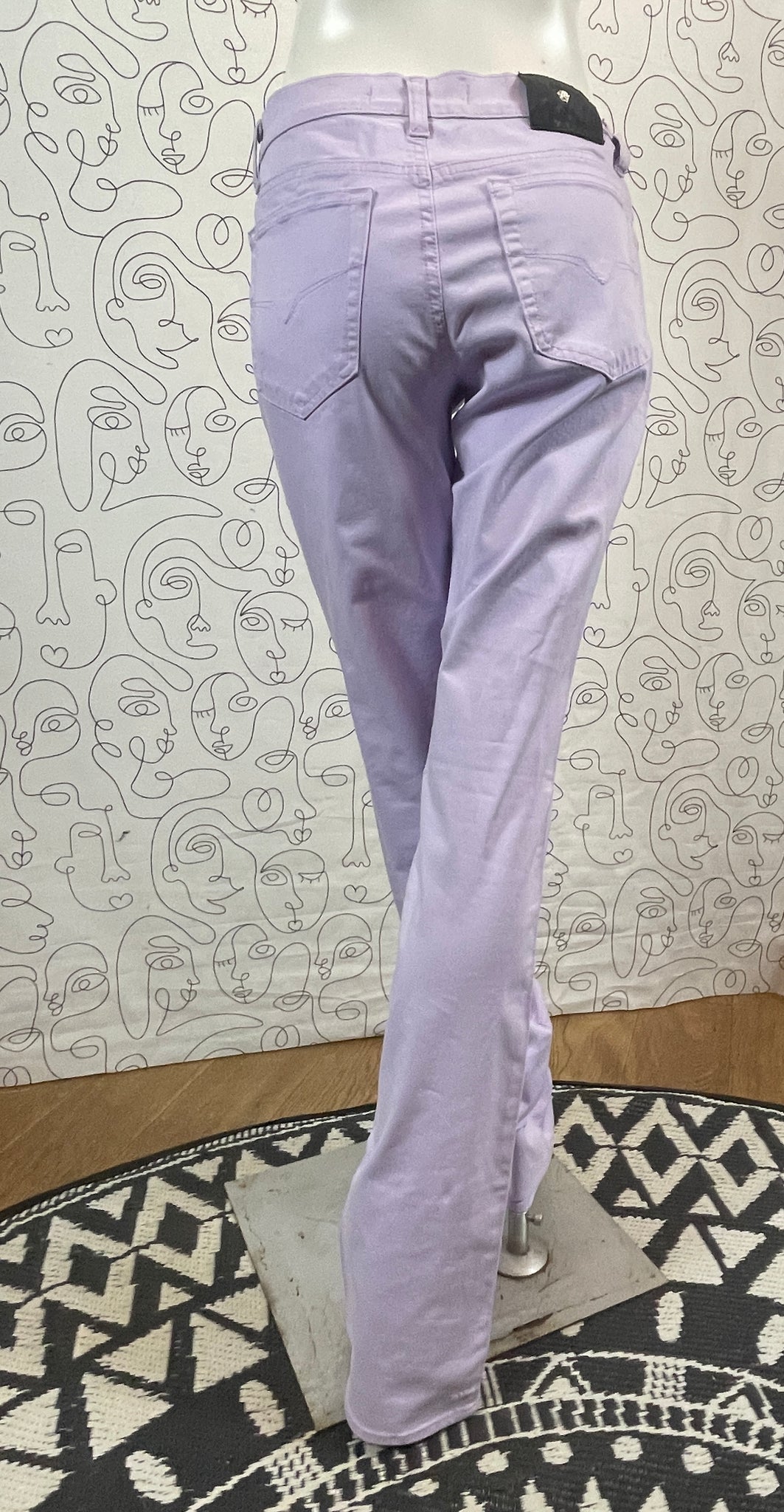 Mesures à plat : largeur taille 38 cms, largeur hanches 49 cms, fourche (à l’avant, de la couture entrejambe à la taille) 25 cms, largeur bas de jambe 23 cms et longueur 113 cms.