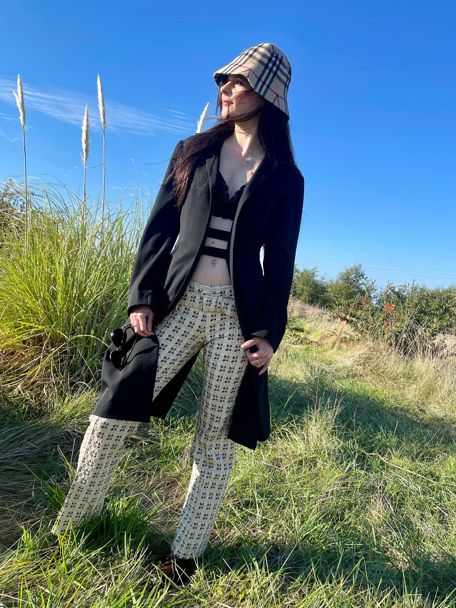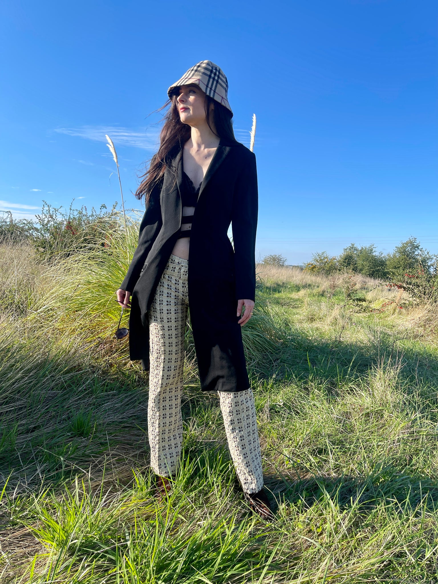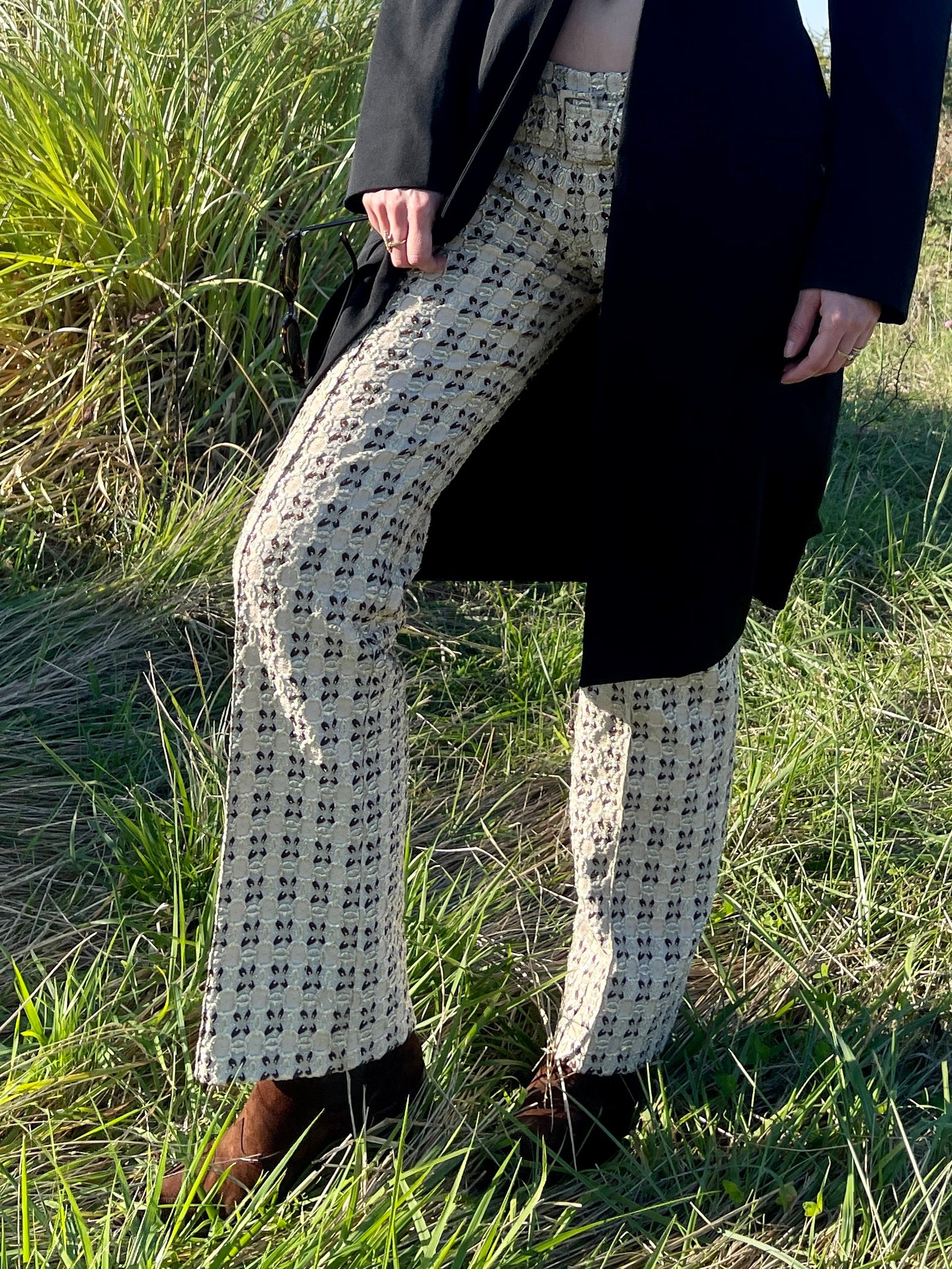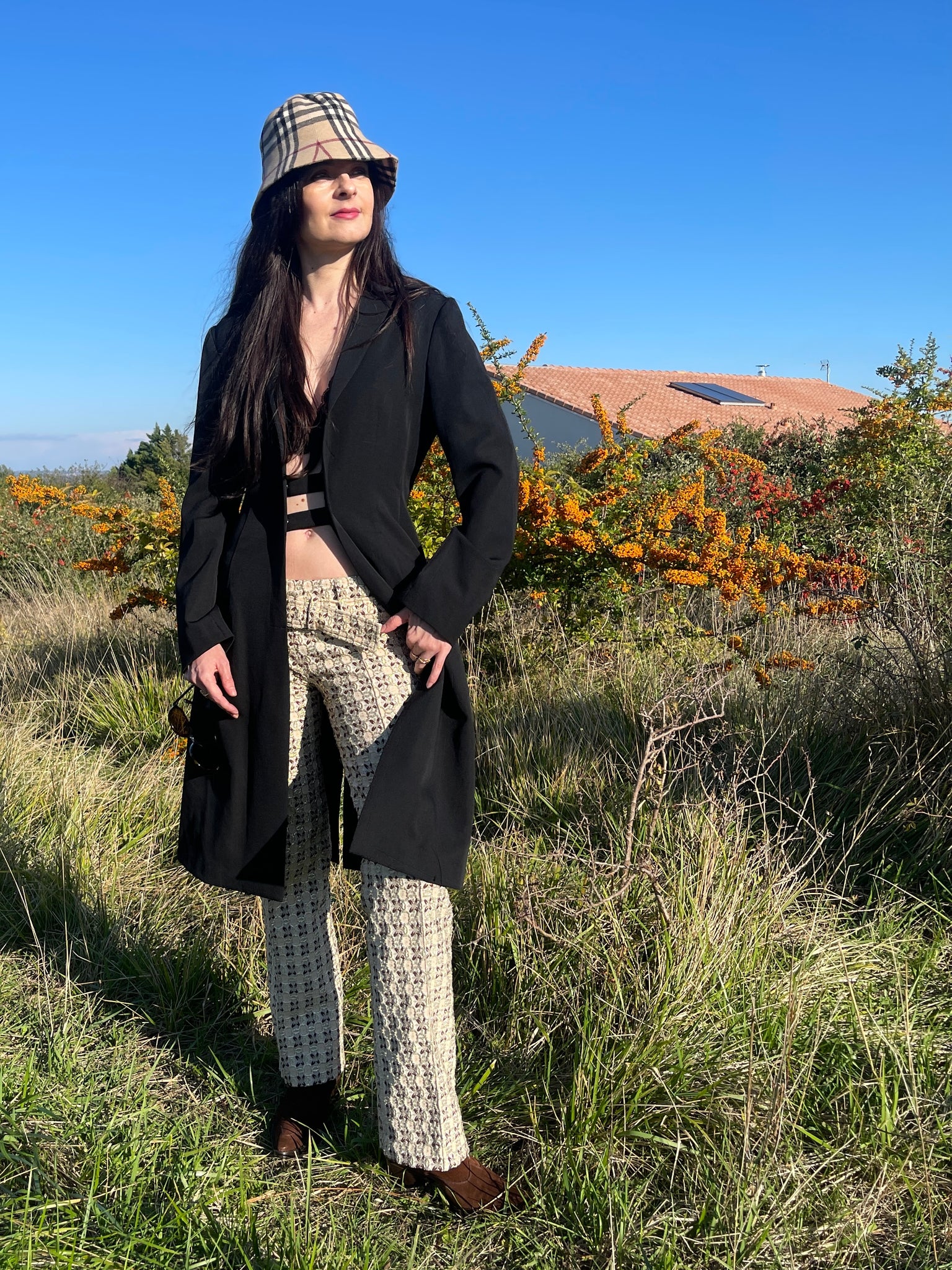 Mesures à plat : largeur taille 45 cms, largeur hanches 45 cms, longueur 96 cms, hauteur fourche (de l’entrejambe à la taille à l’avant) 24 cms et bas de jambes 22 cms.