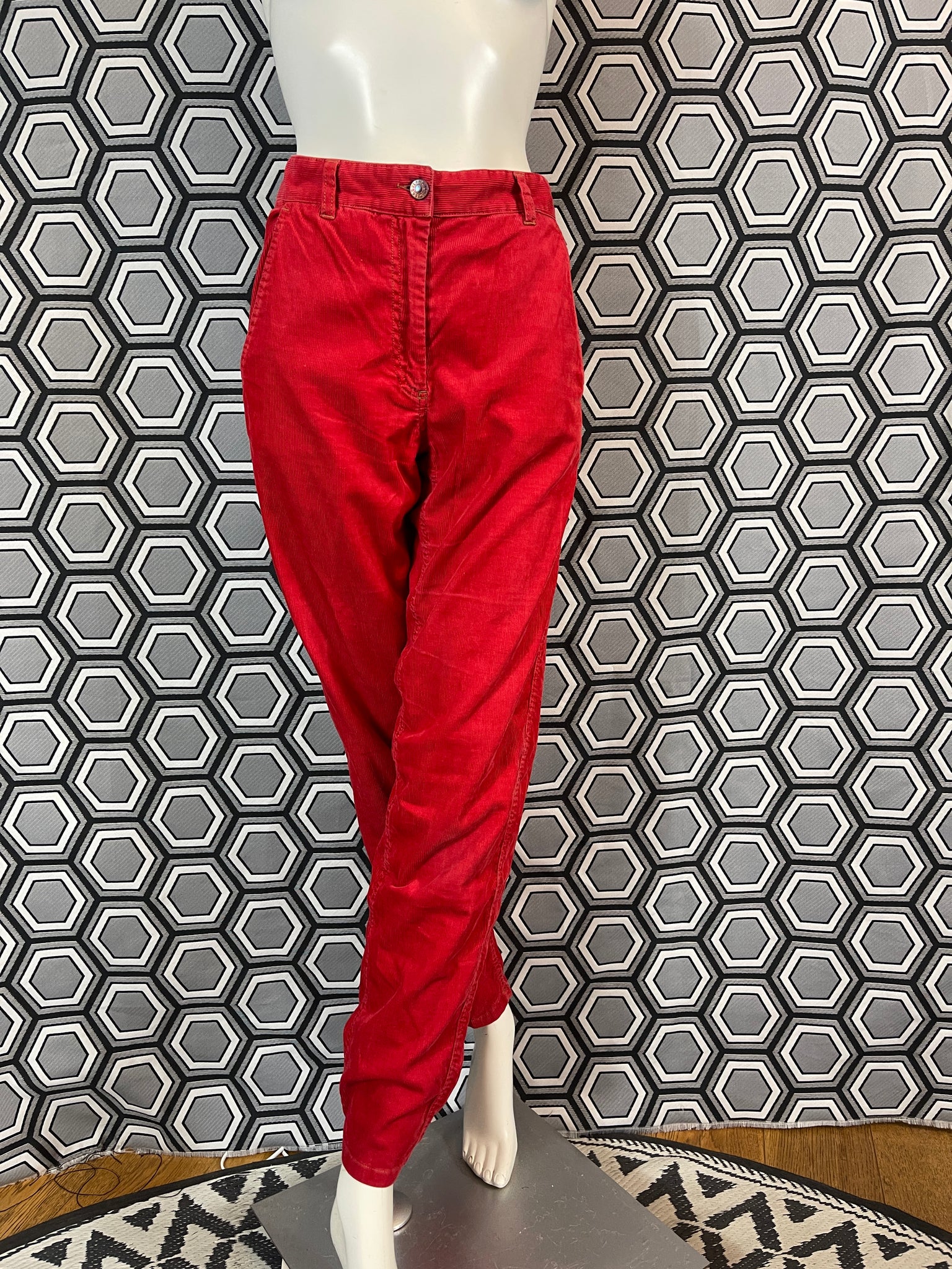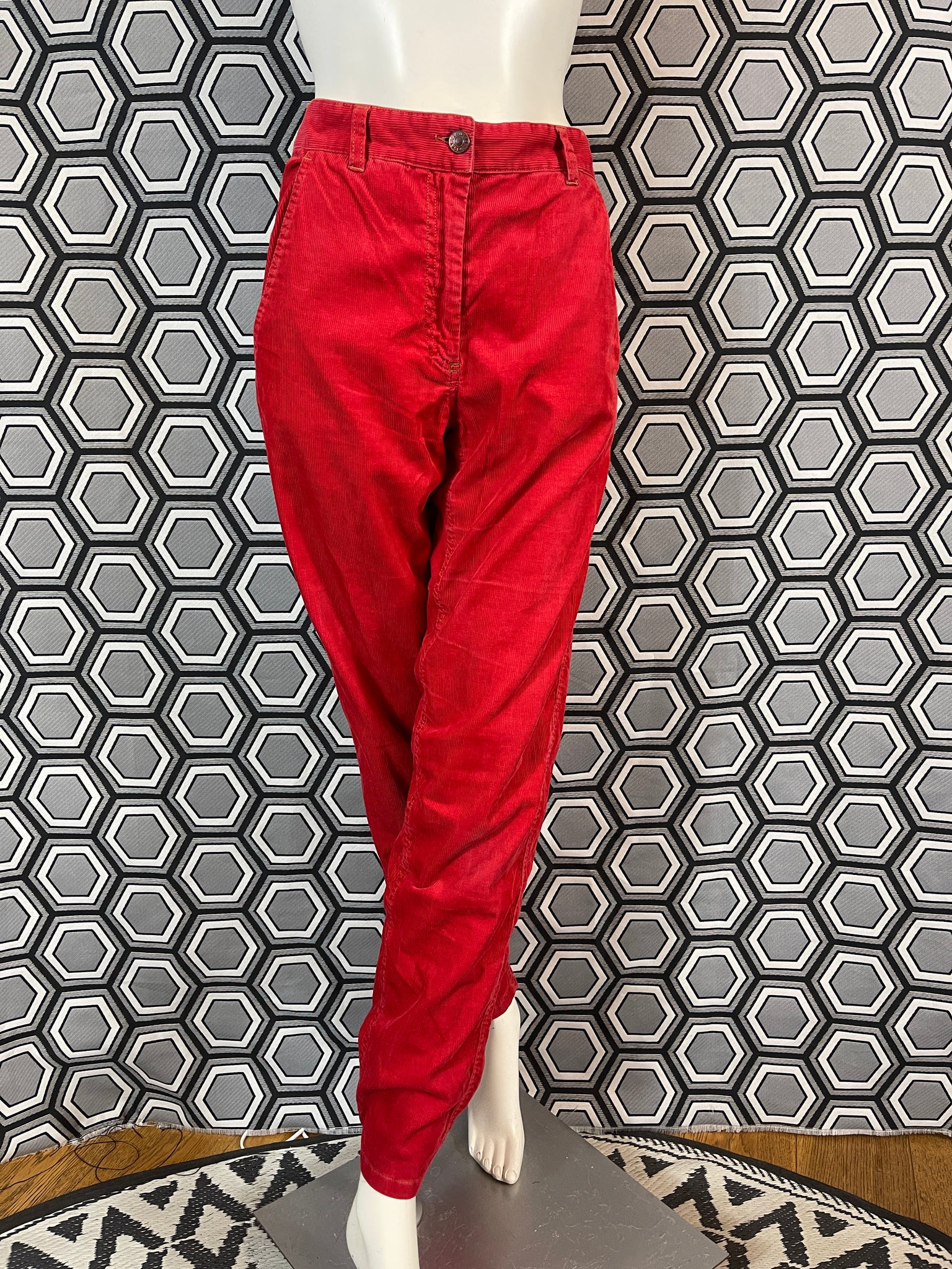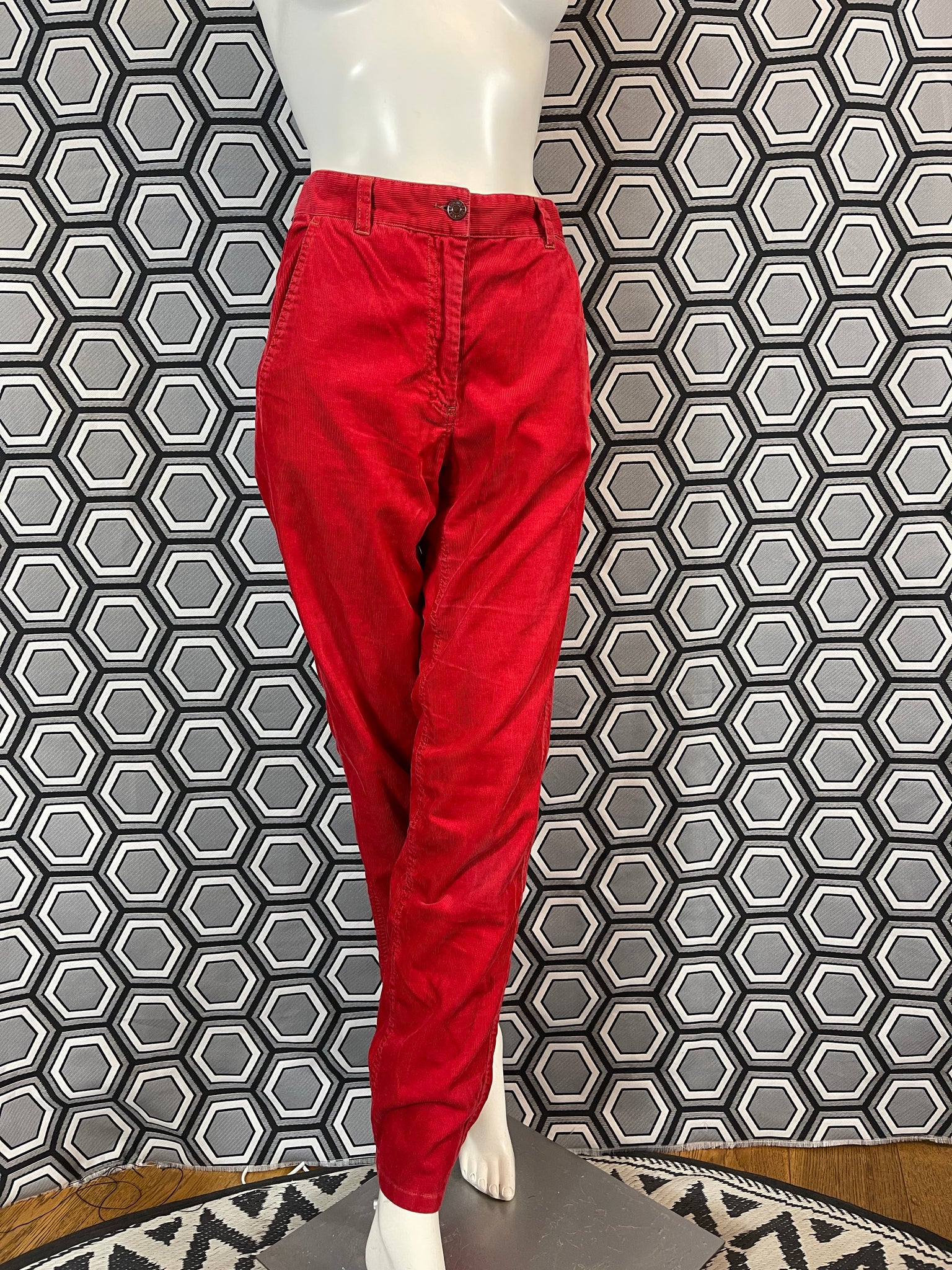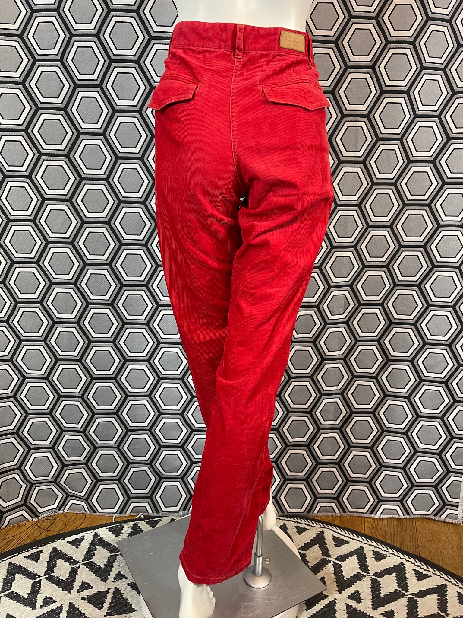 Mesures à plat : largeur taille 41 cms, largeur hanches 53 cms, longueur 103 cms, hauteur fourche (de l’entrejambe à la taille à l’avant) 31 cms, largeur bas de jambe 18 cms.