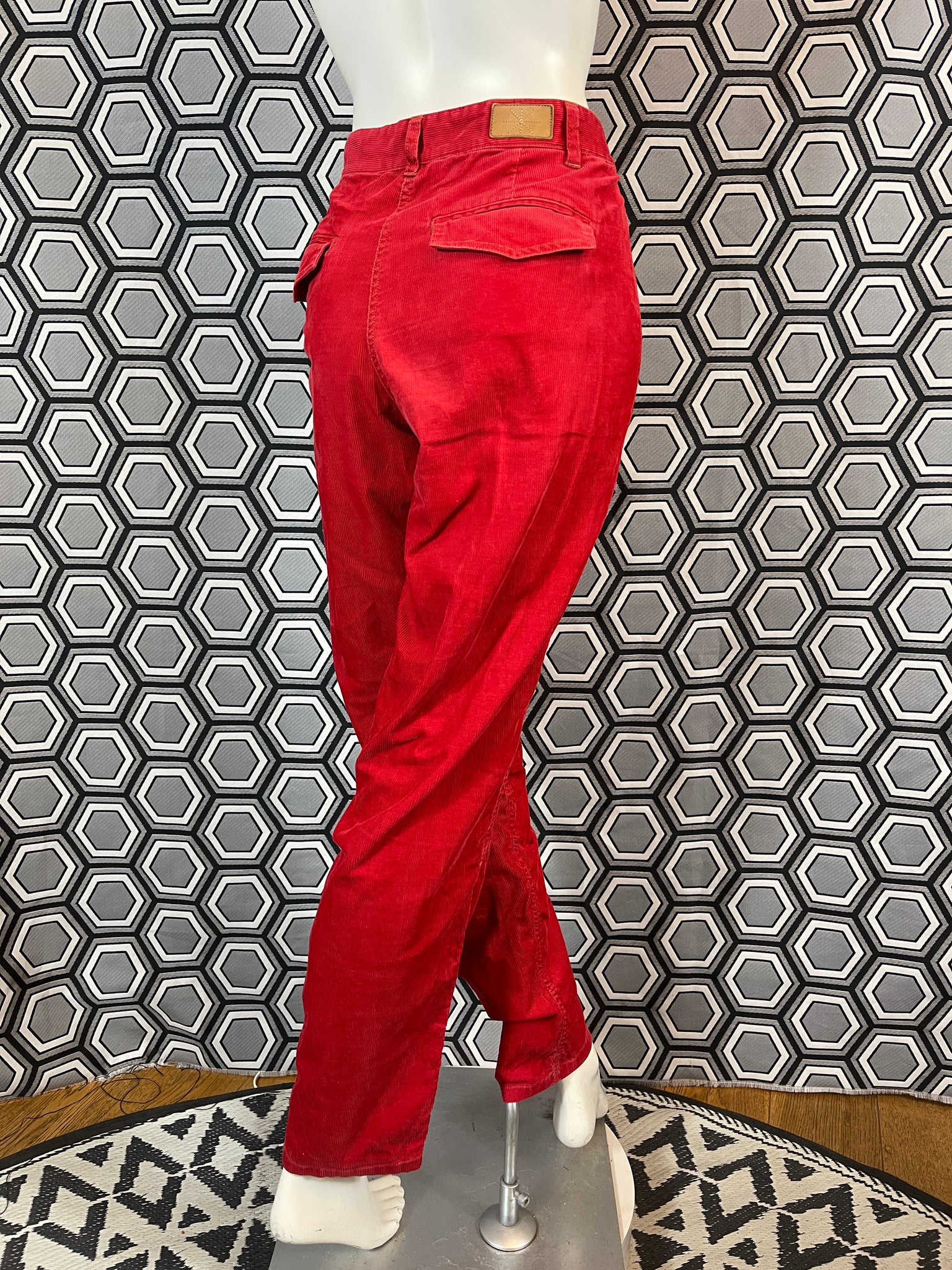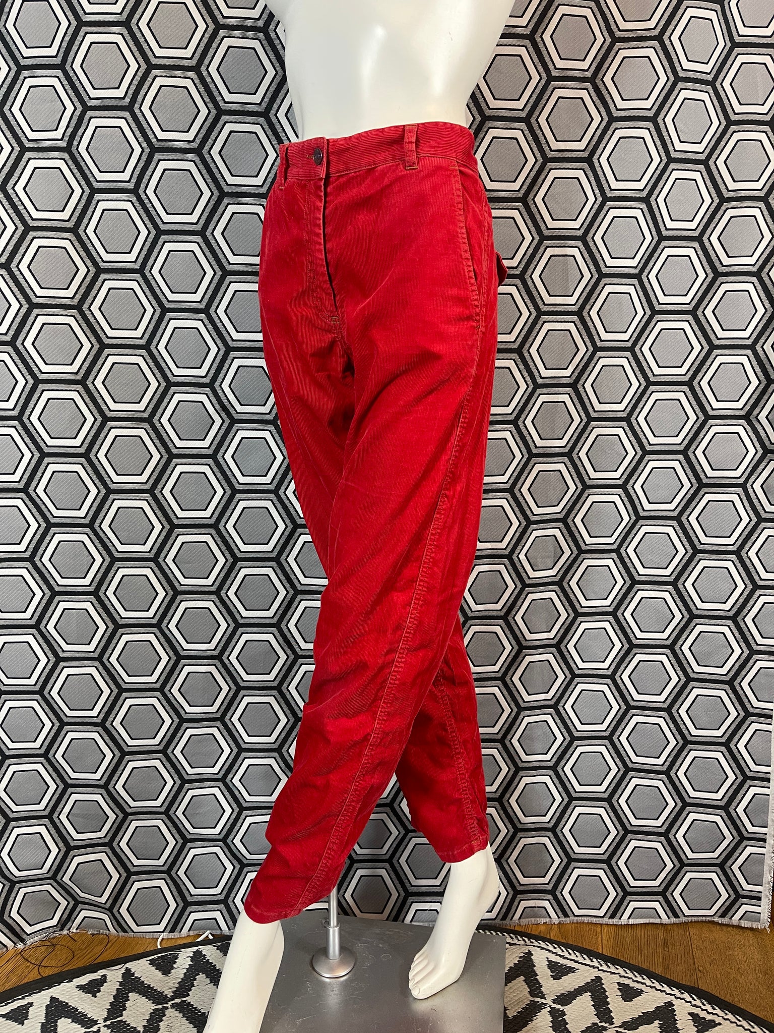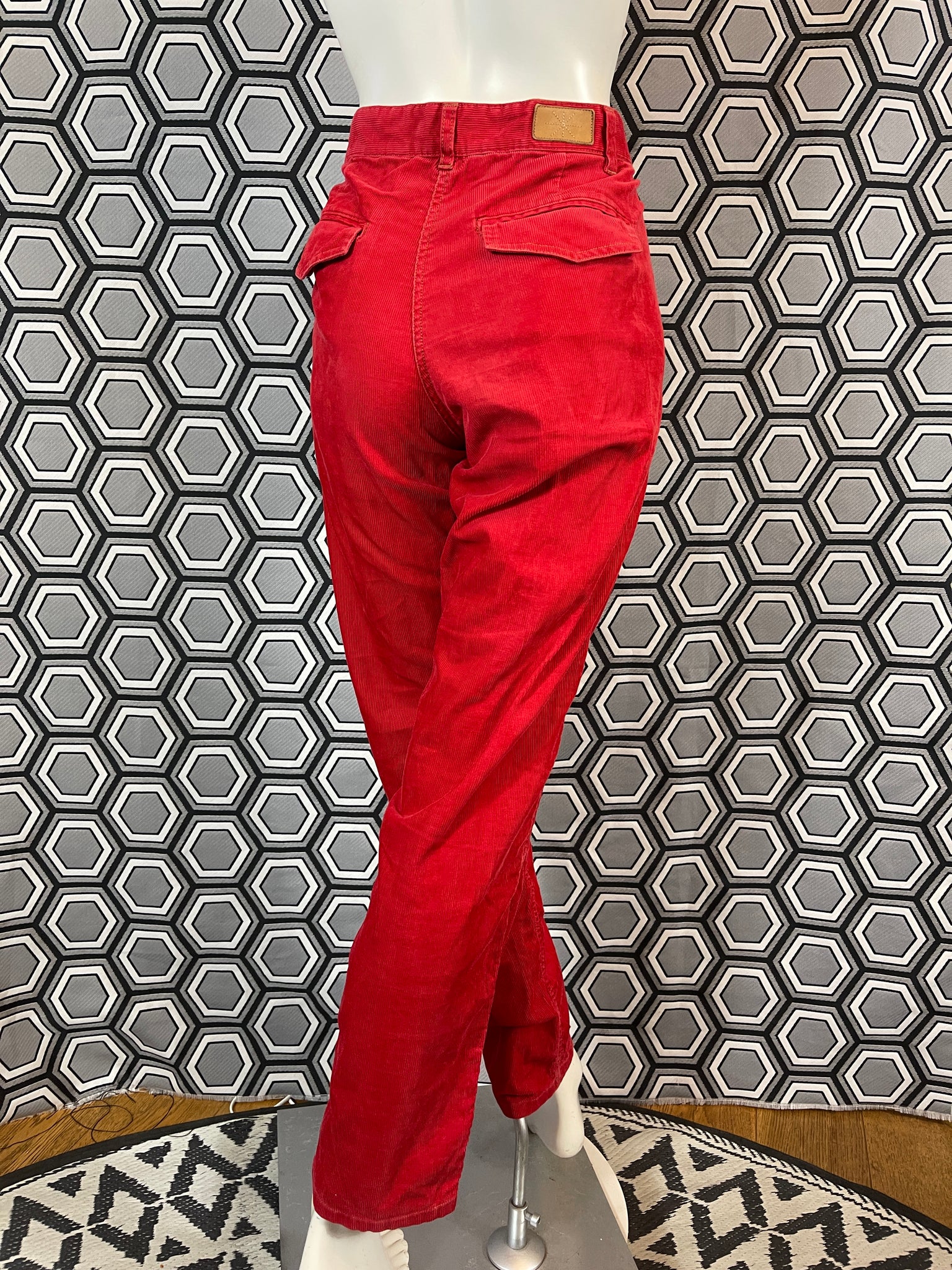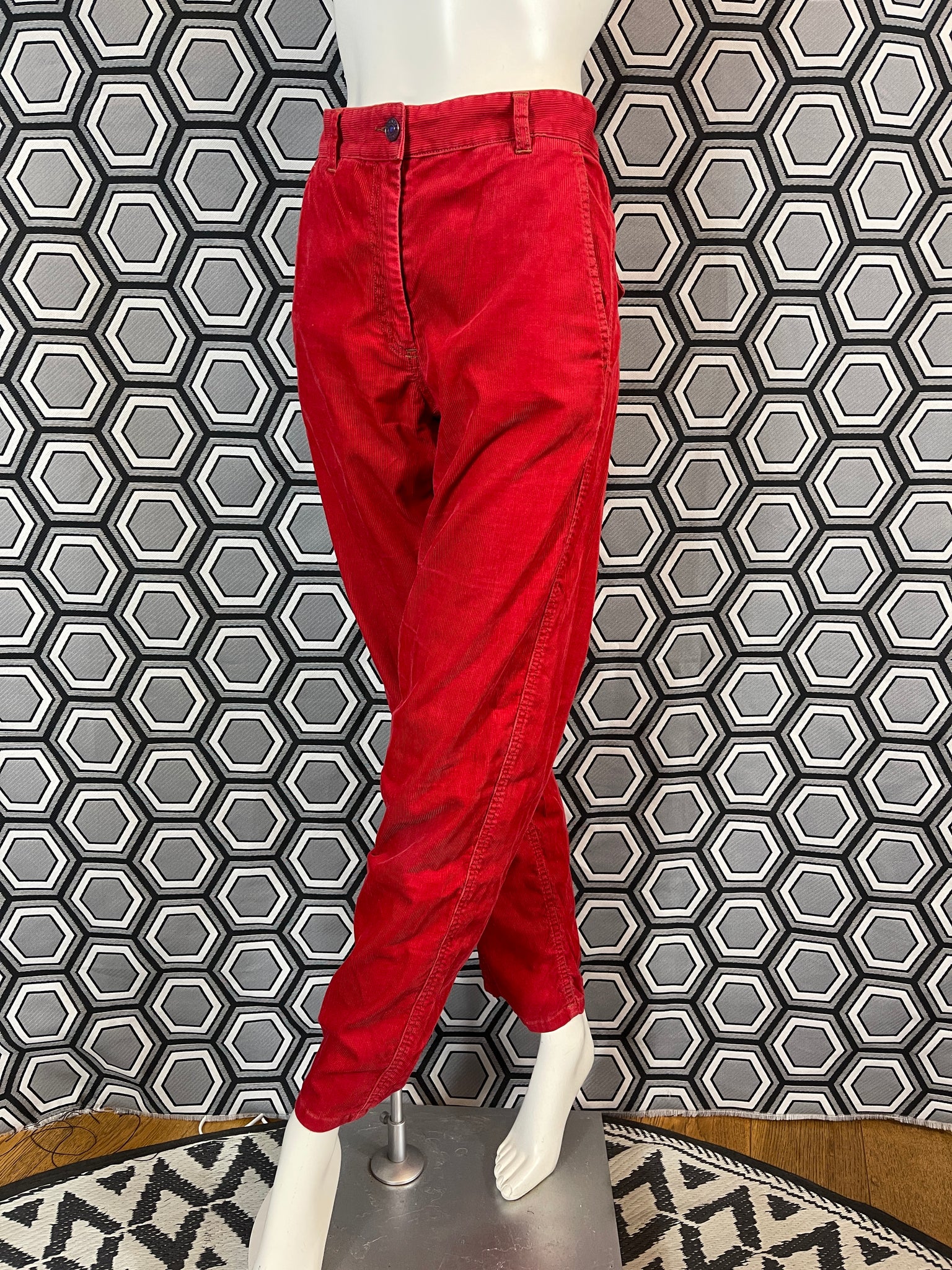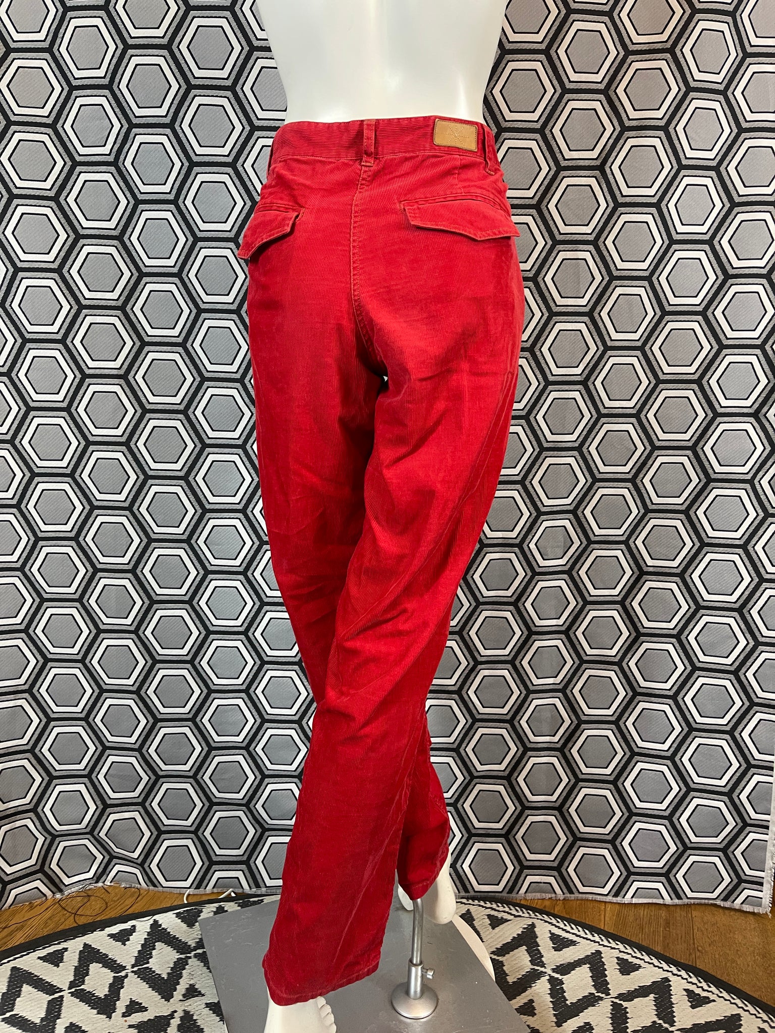 Mesures à plat : largeur taille 41 cms, largeur hanches 53 cms, longueur 103 cms, hauteur fourche (de l’entrejambe à la taille à l’avant) 31 cms, largeur bas de jambe 18 cms.