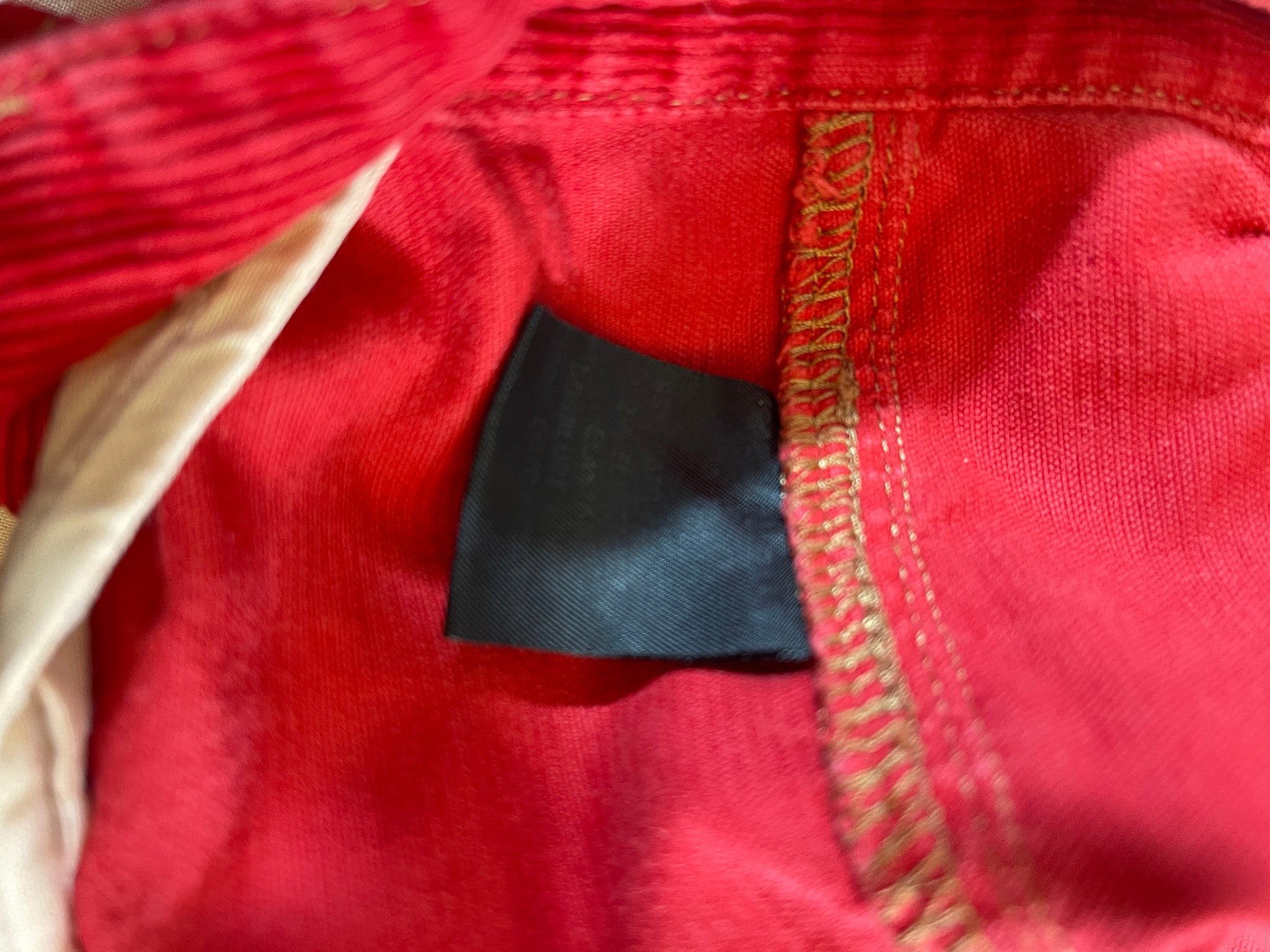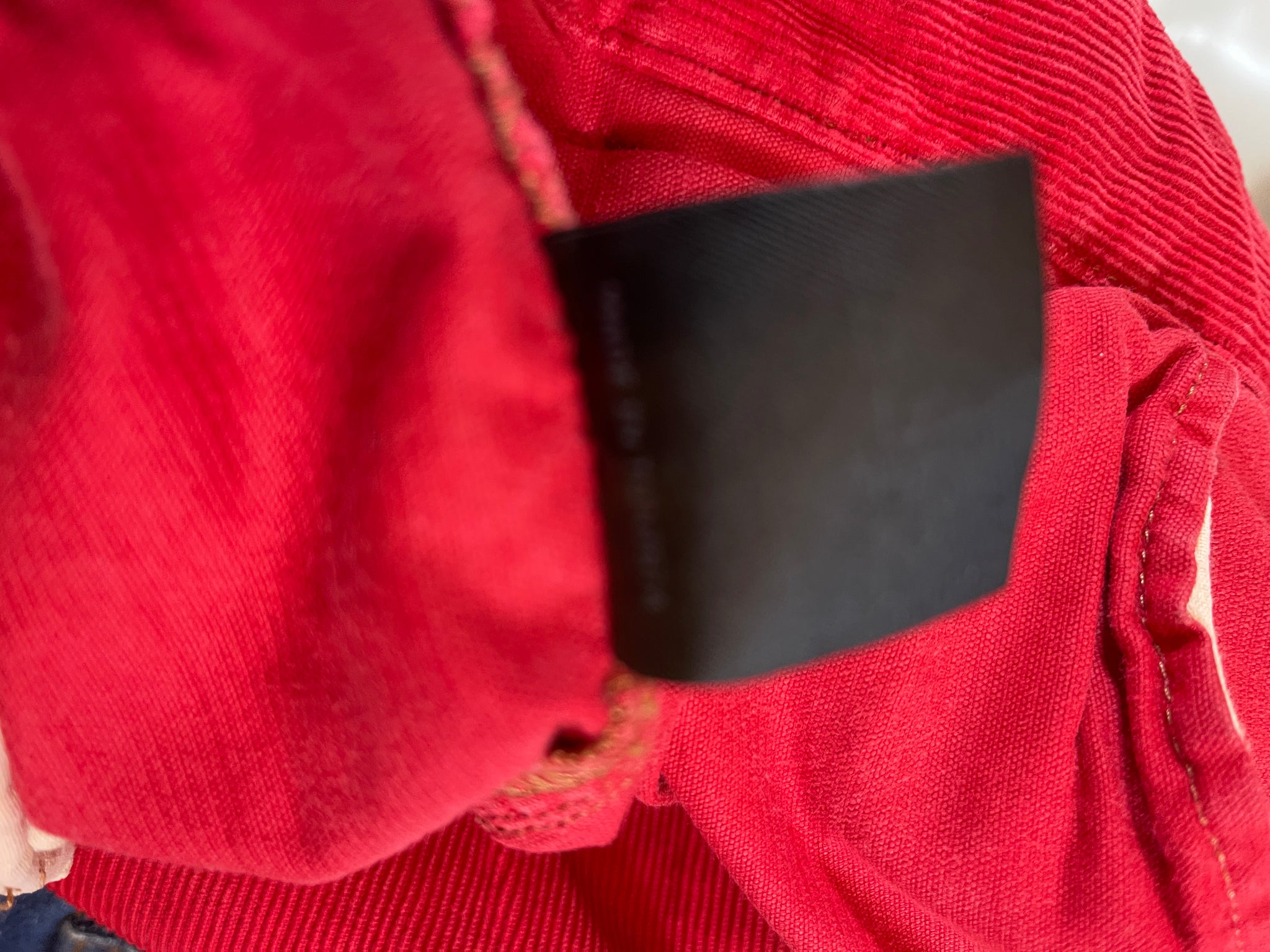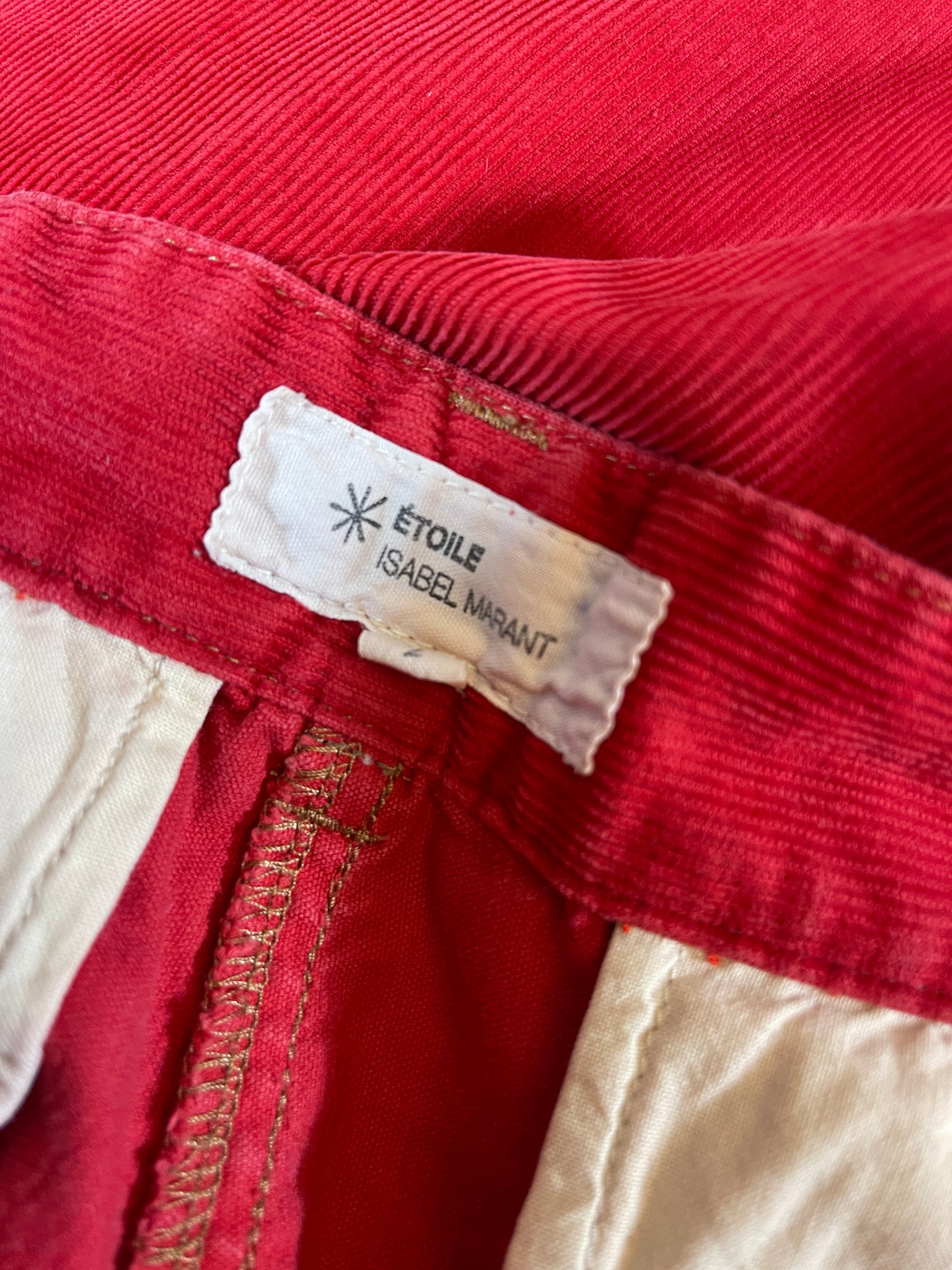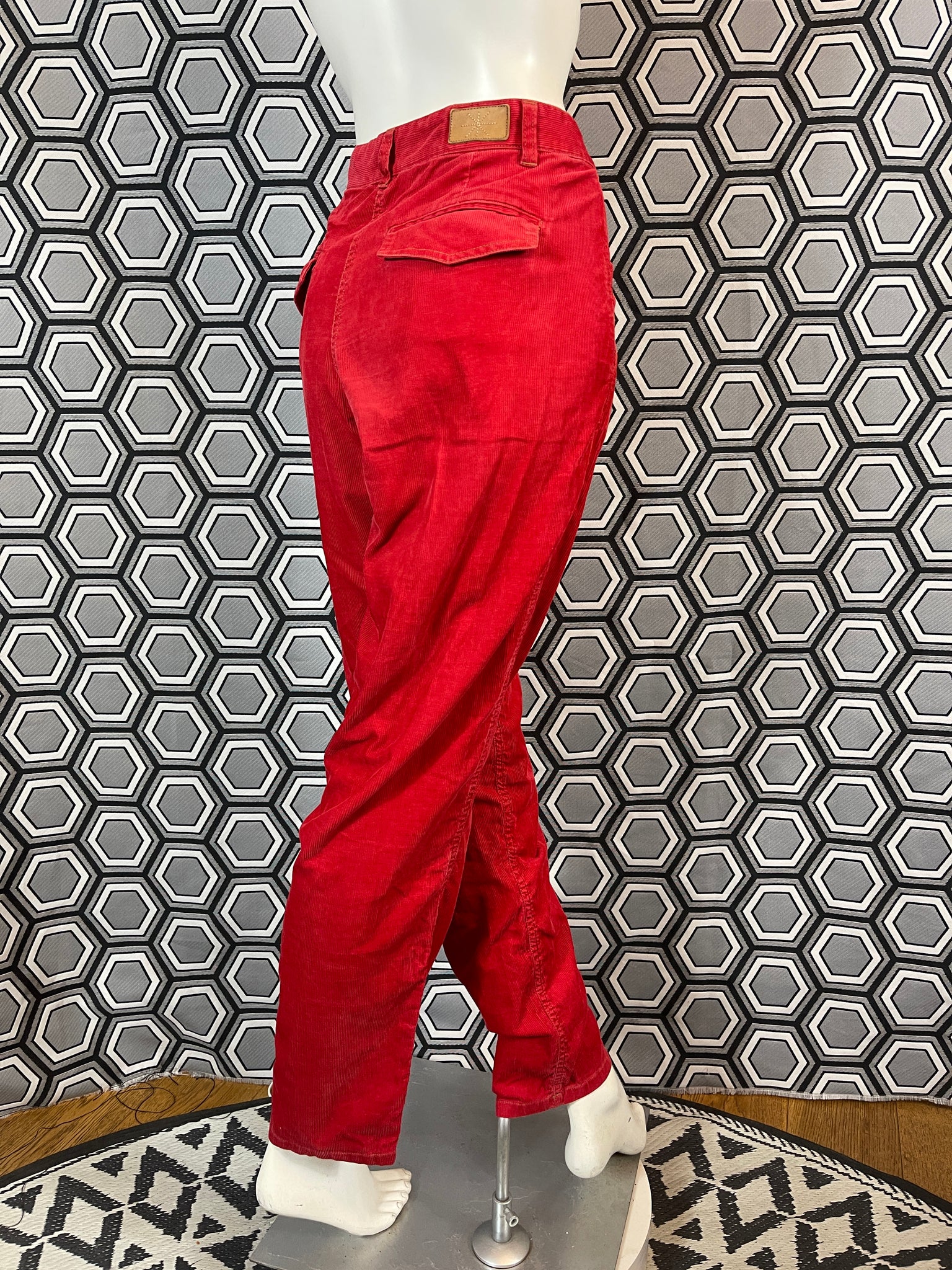 Mesures à plat : largeur taille 41 cms, largeur hanches 53 cms, longueur 103 cms, hauteur fourche (de l’entrejambe à la taille à l’avant) 31 cms, largeur bas de jambe 18 cms.