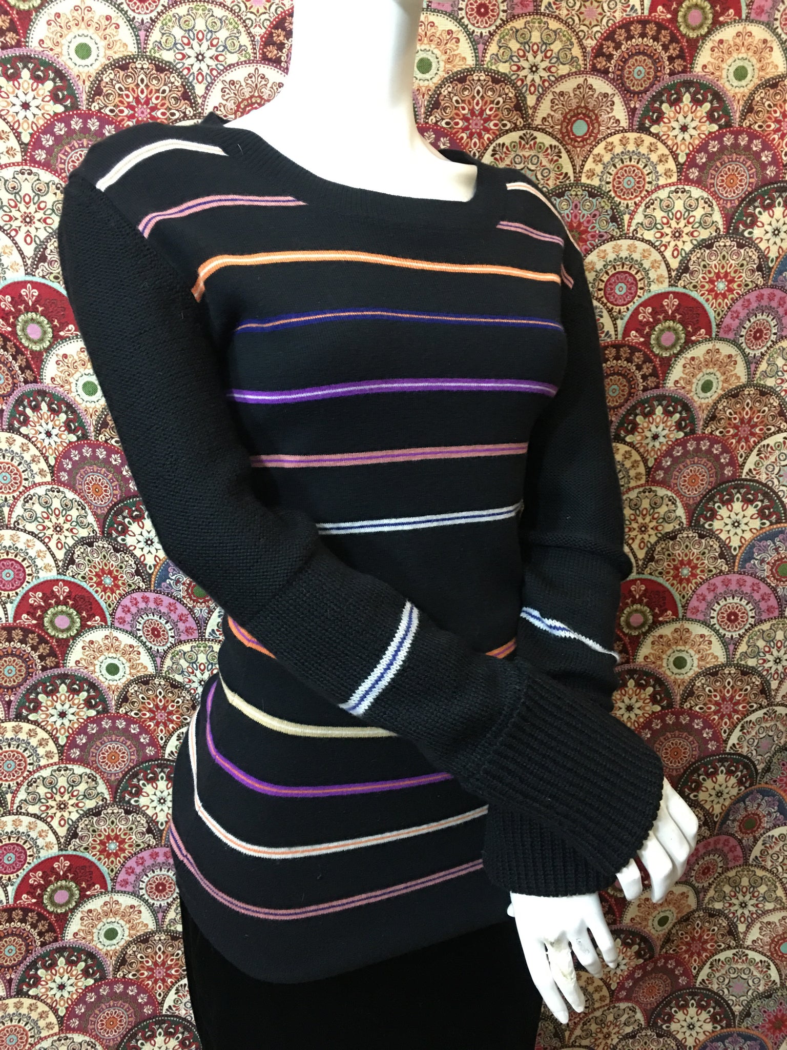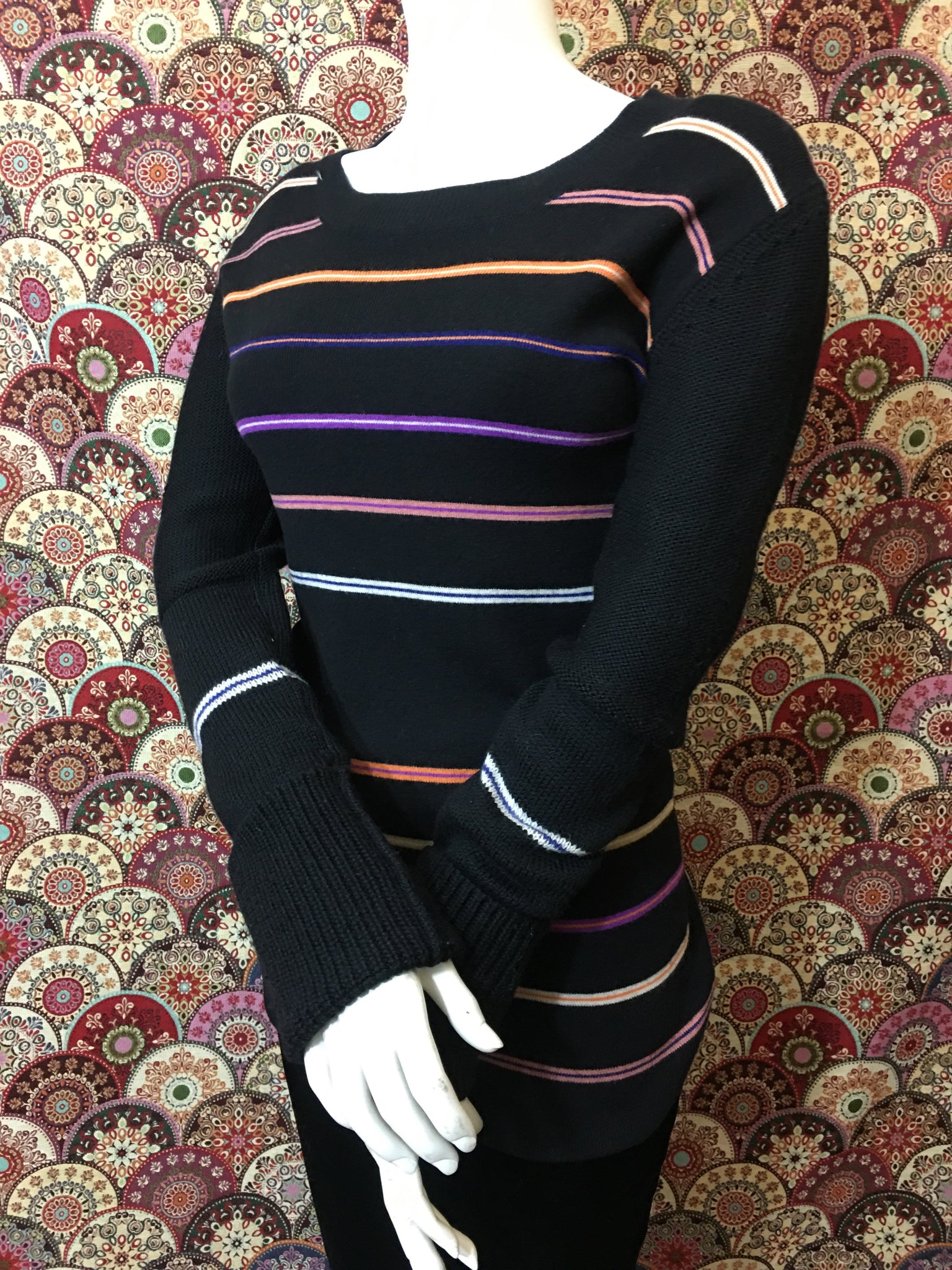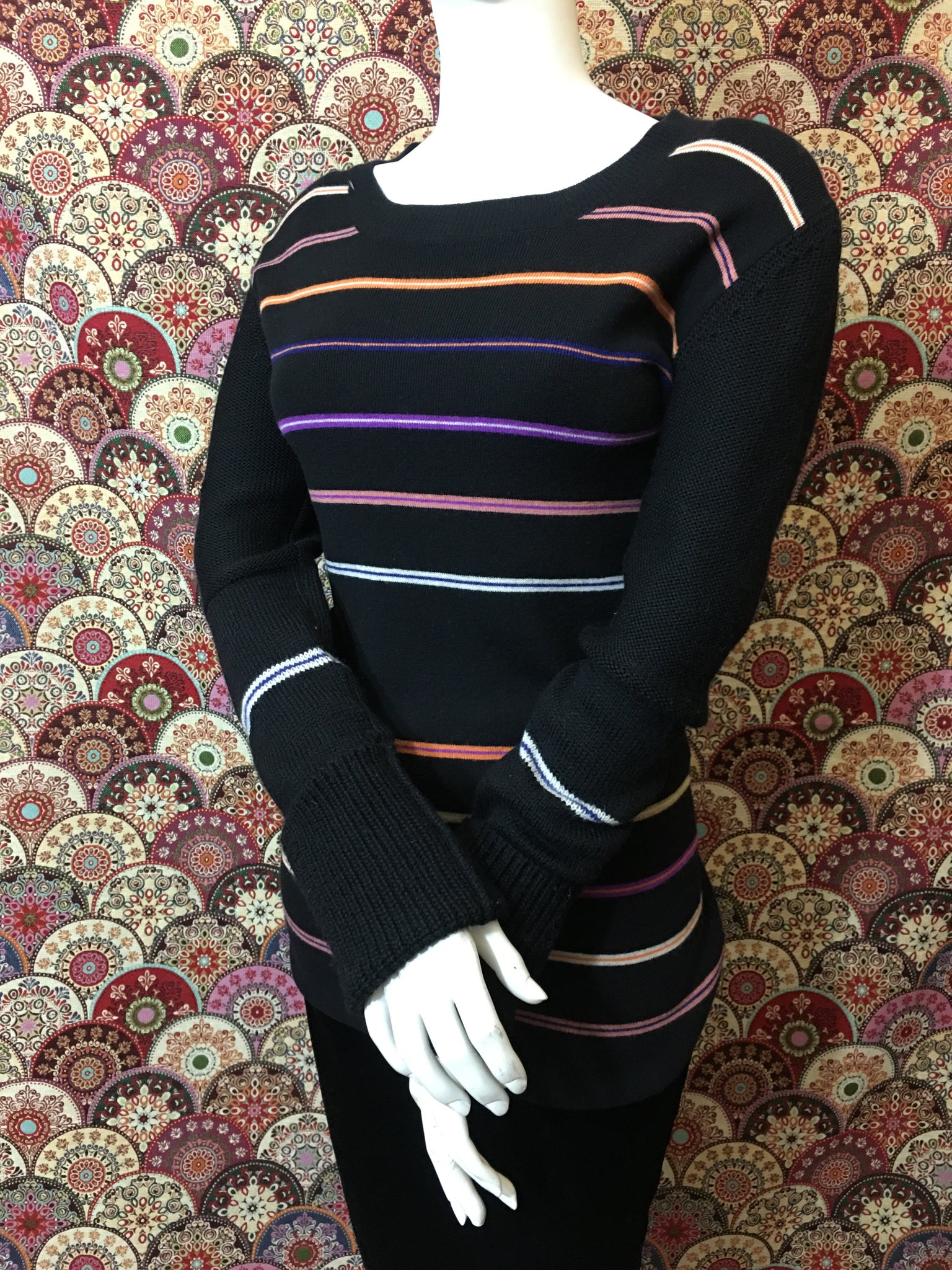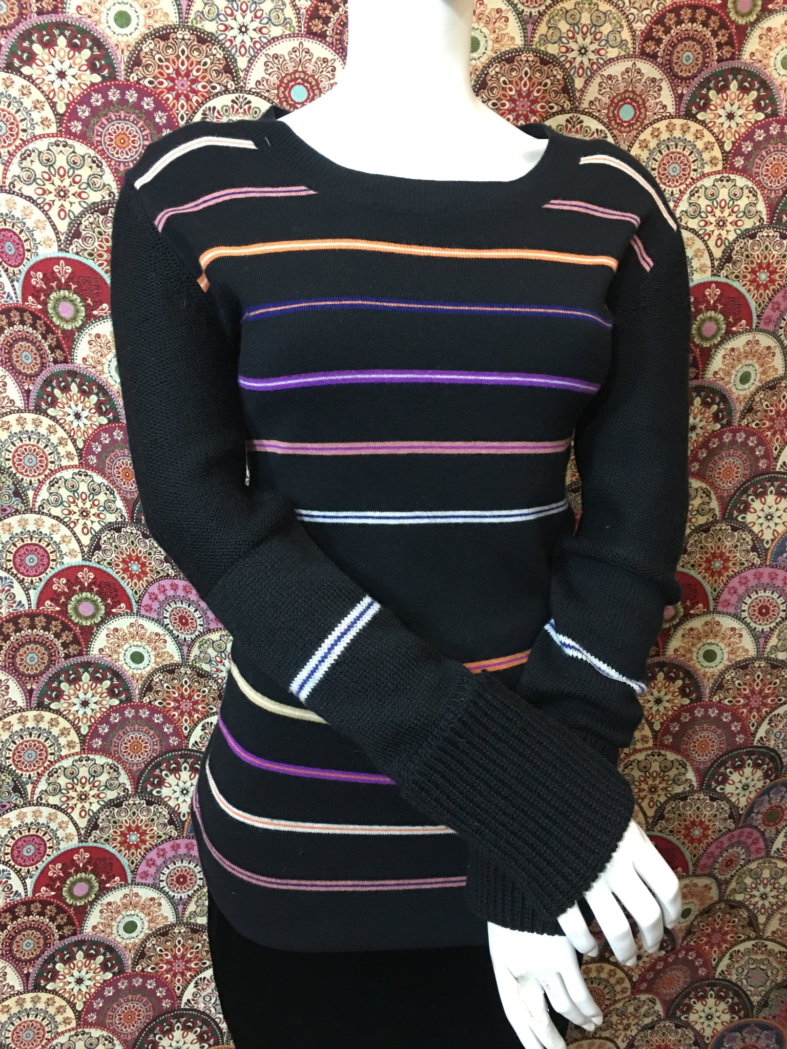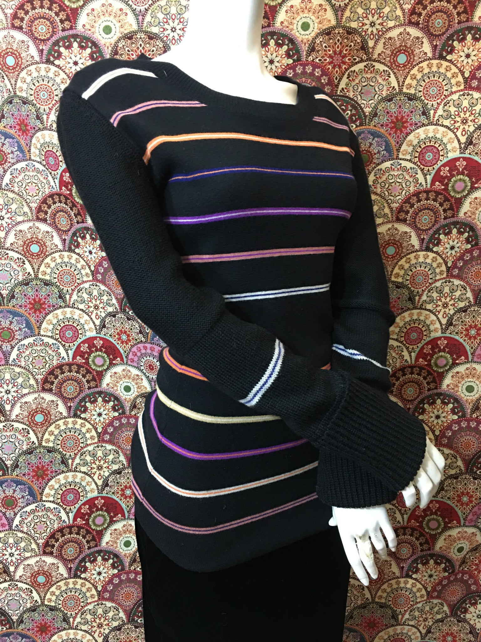 Pull long Sonia Rykiel, pas d’étiquette de composition (en laine), ni de taille (correspond à une taille 38). Mesures à plat : largeur épaules 44 cms, largeur sous aisselles 46 cms, largeur taille 35 cms et longueur 74 cms. Très bon état.