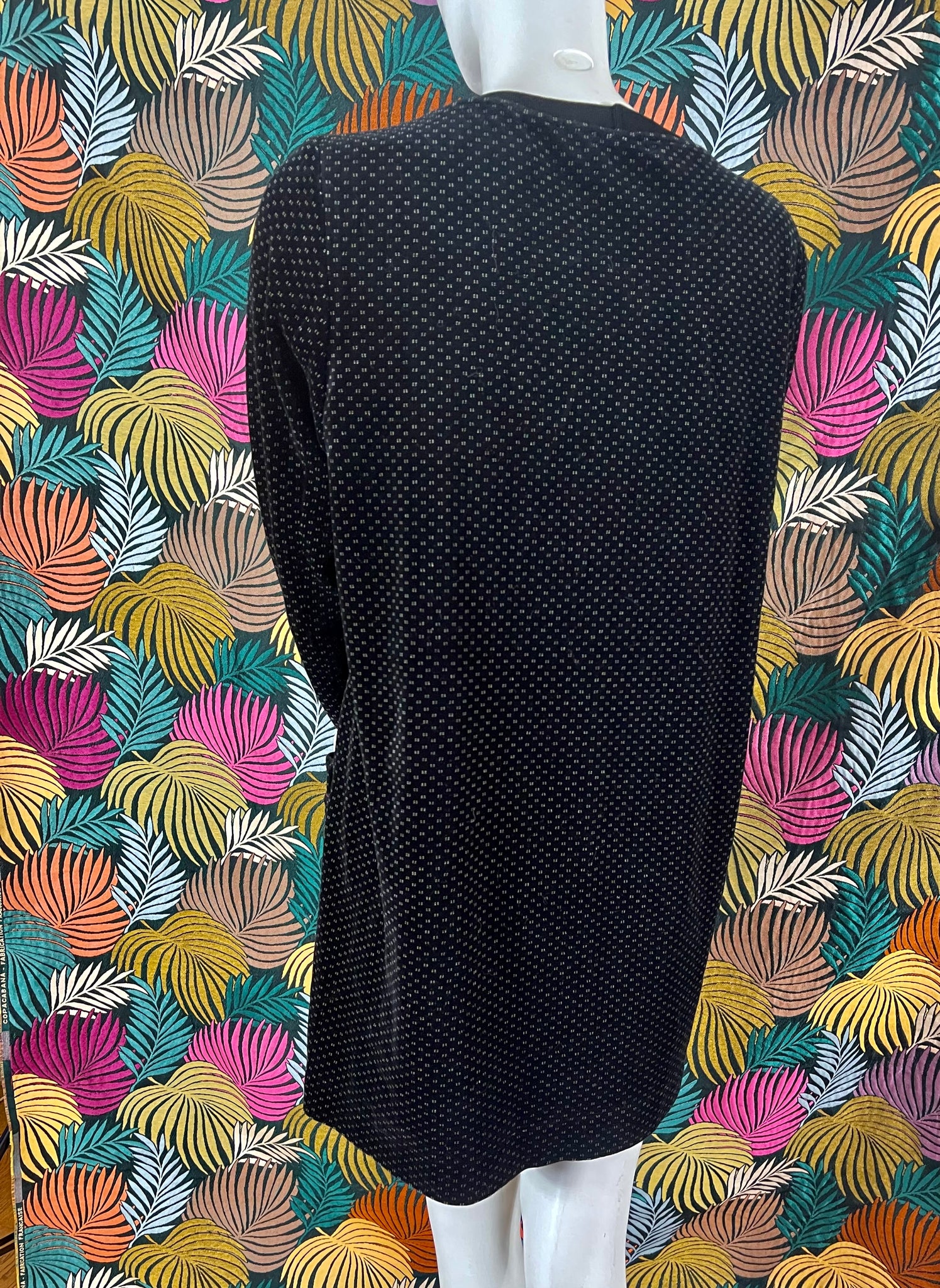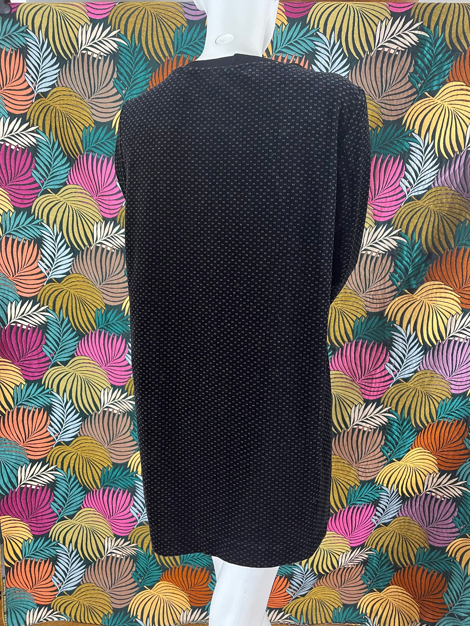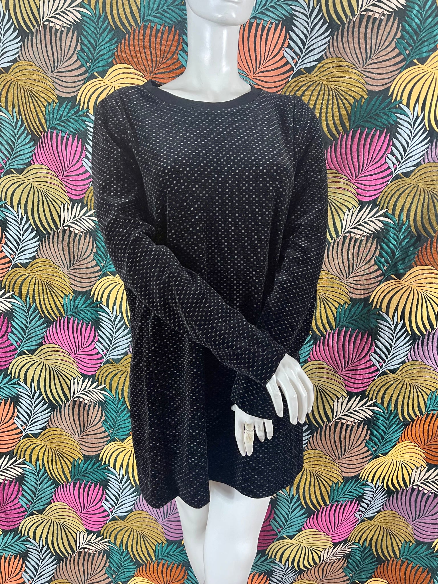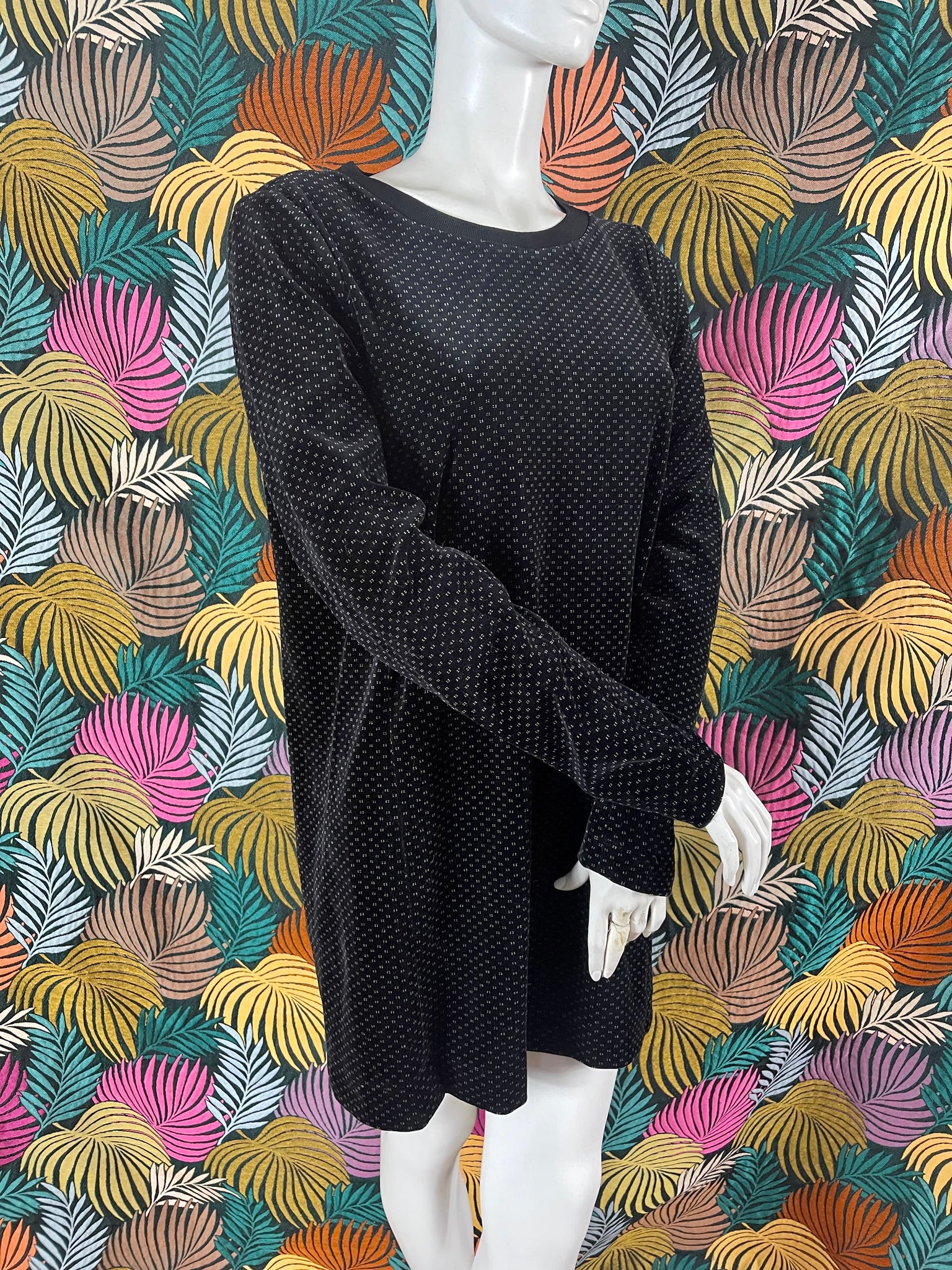 Mesures à plat : largeur épaules 41 cms, largeur sous aisselles 54 cms, largeur taille 55 cms, largeur hanches 56 cms et longueur 82 cms.