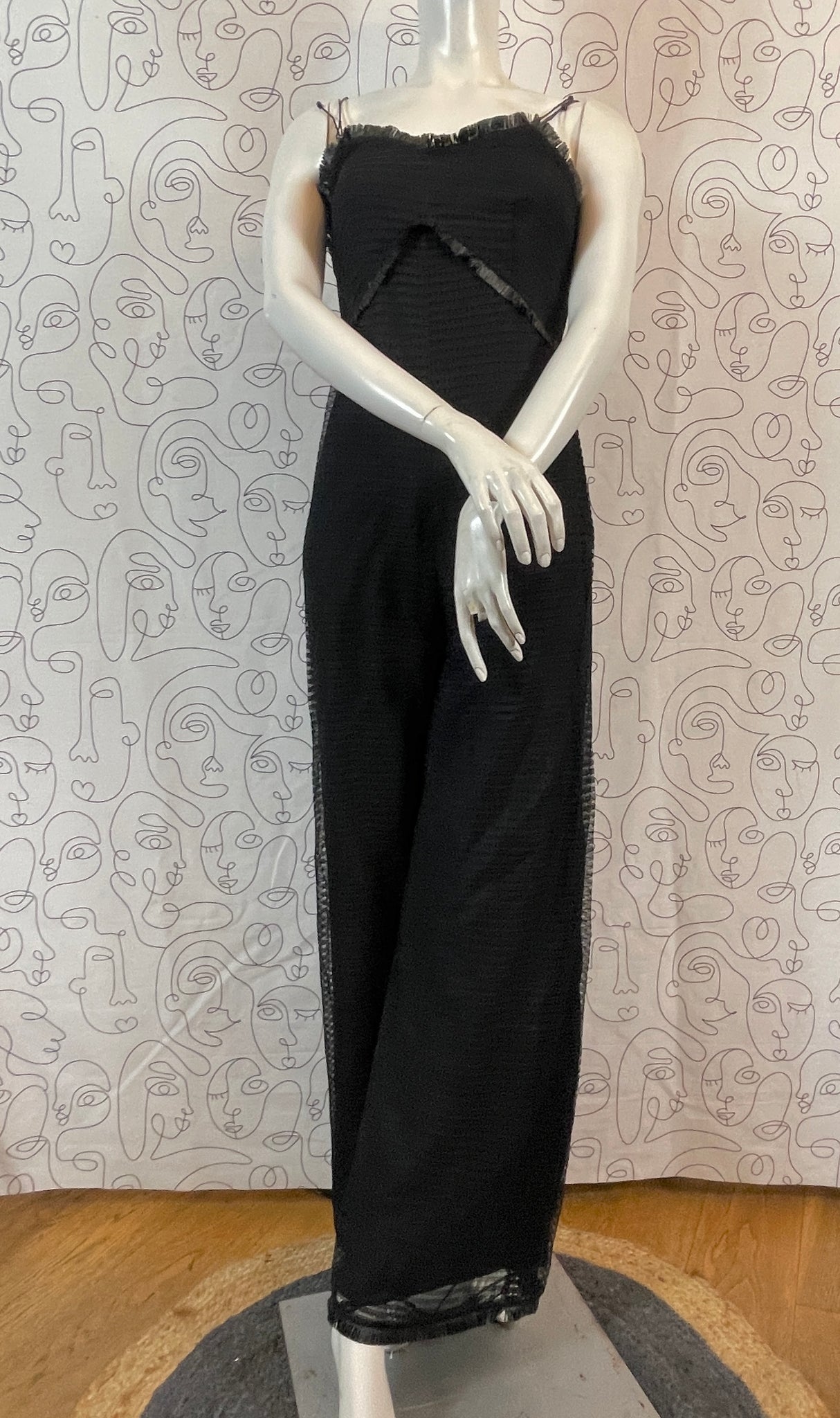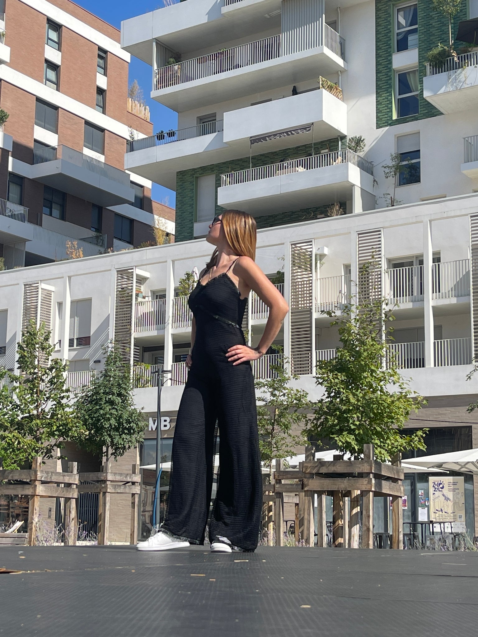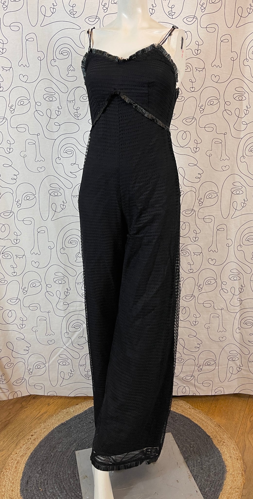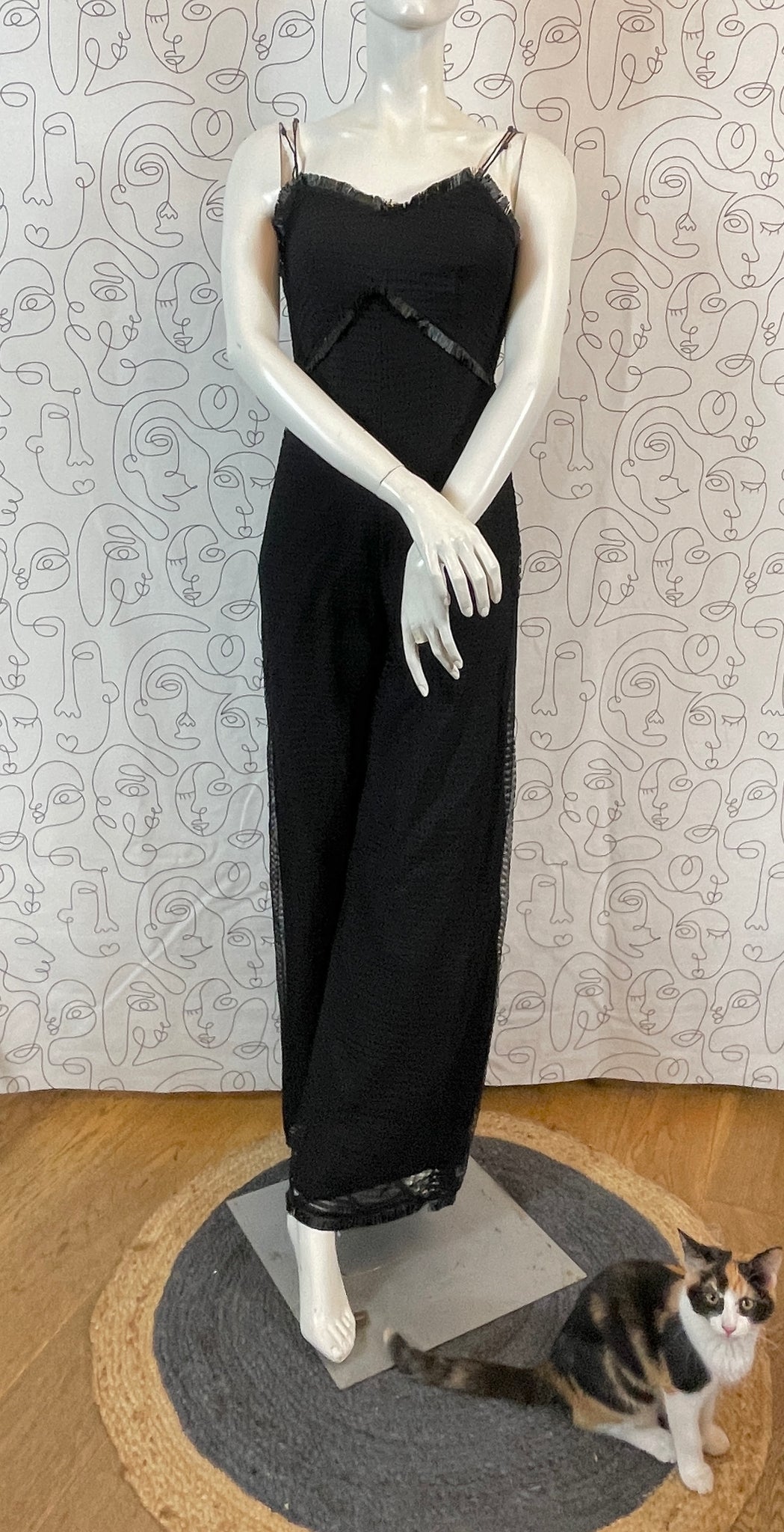 Entièrement en tissu style dentelle très fin et tout en transparence (la combinaison est doublée).