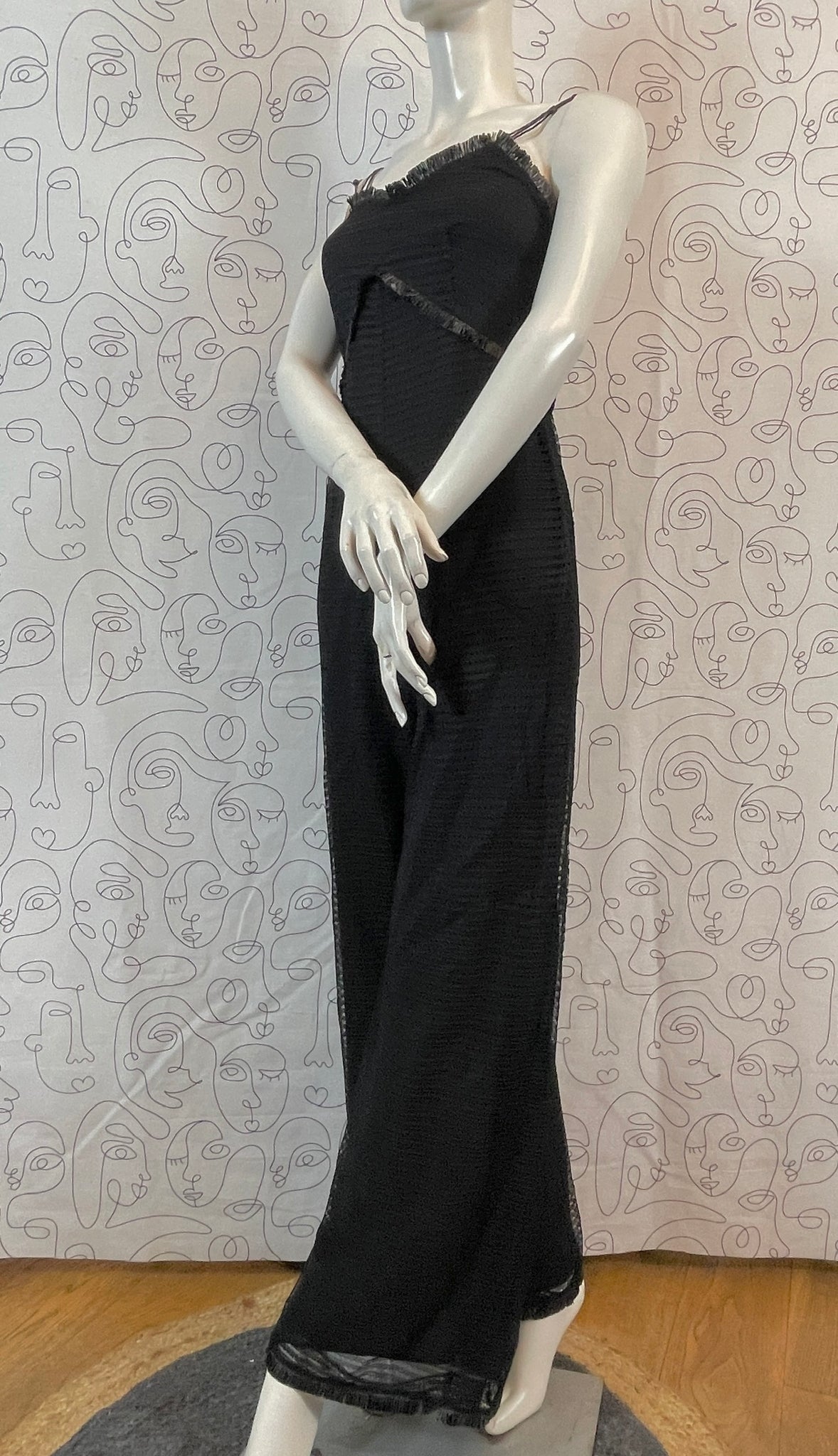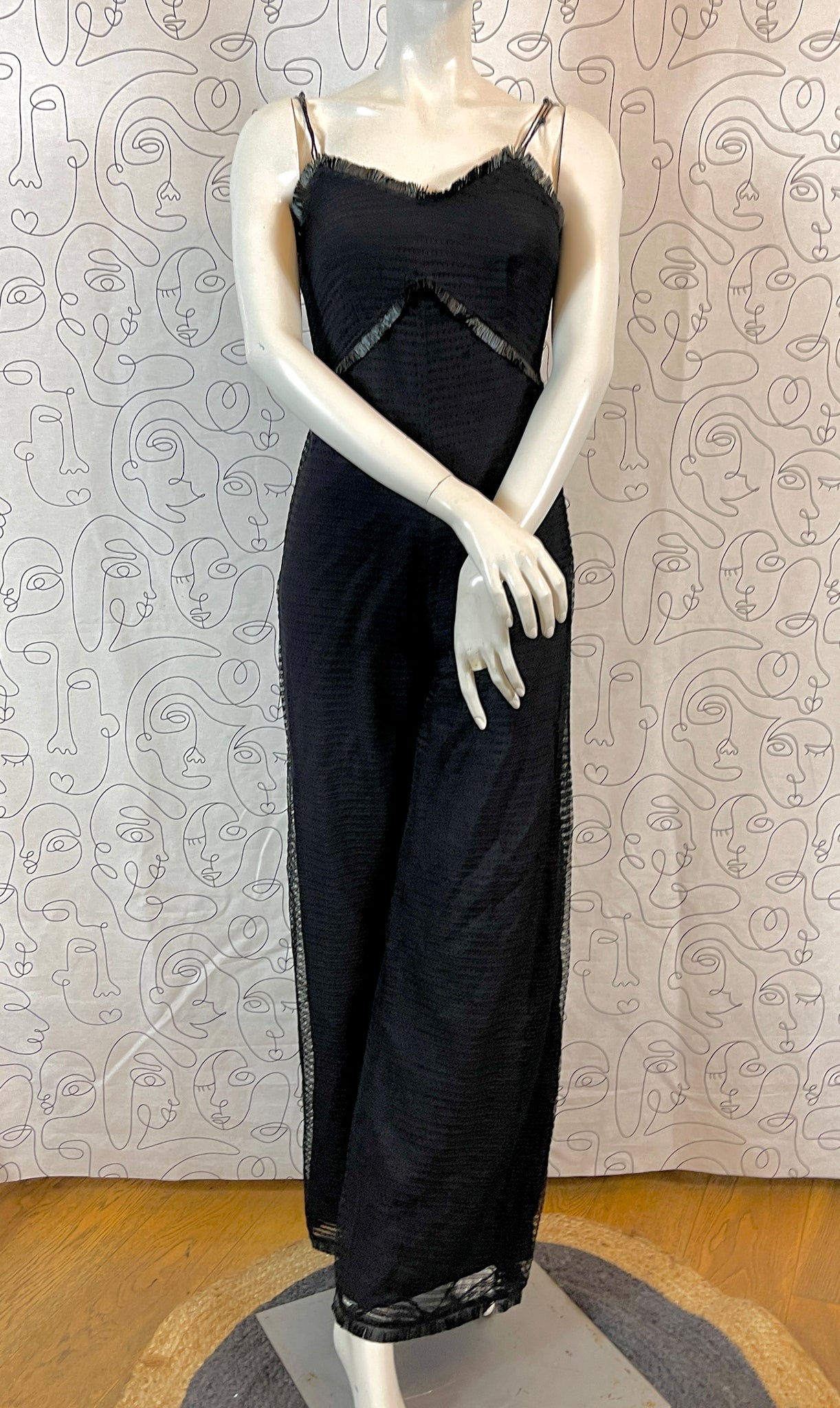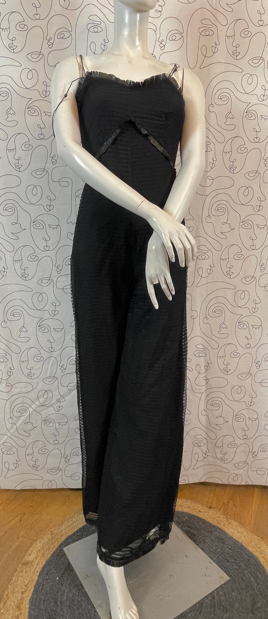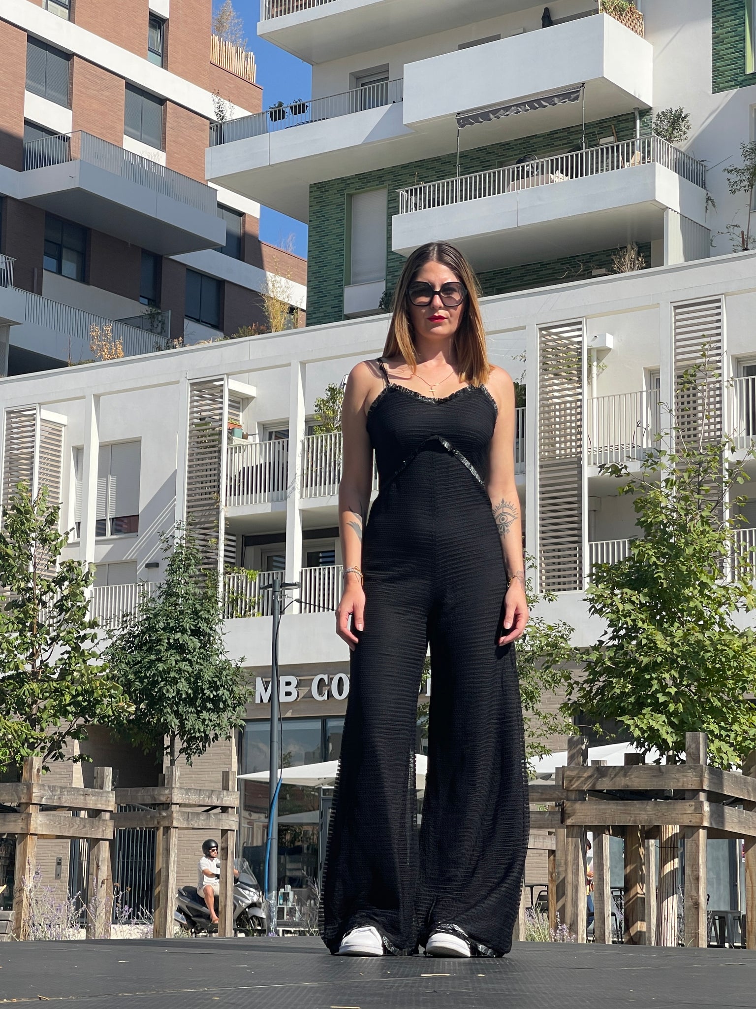 Entièrement en tissu style dentelle très fin et tout en transparence (la combinaison est doublée).